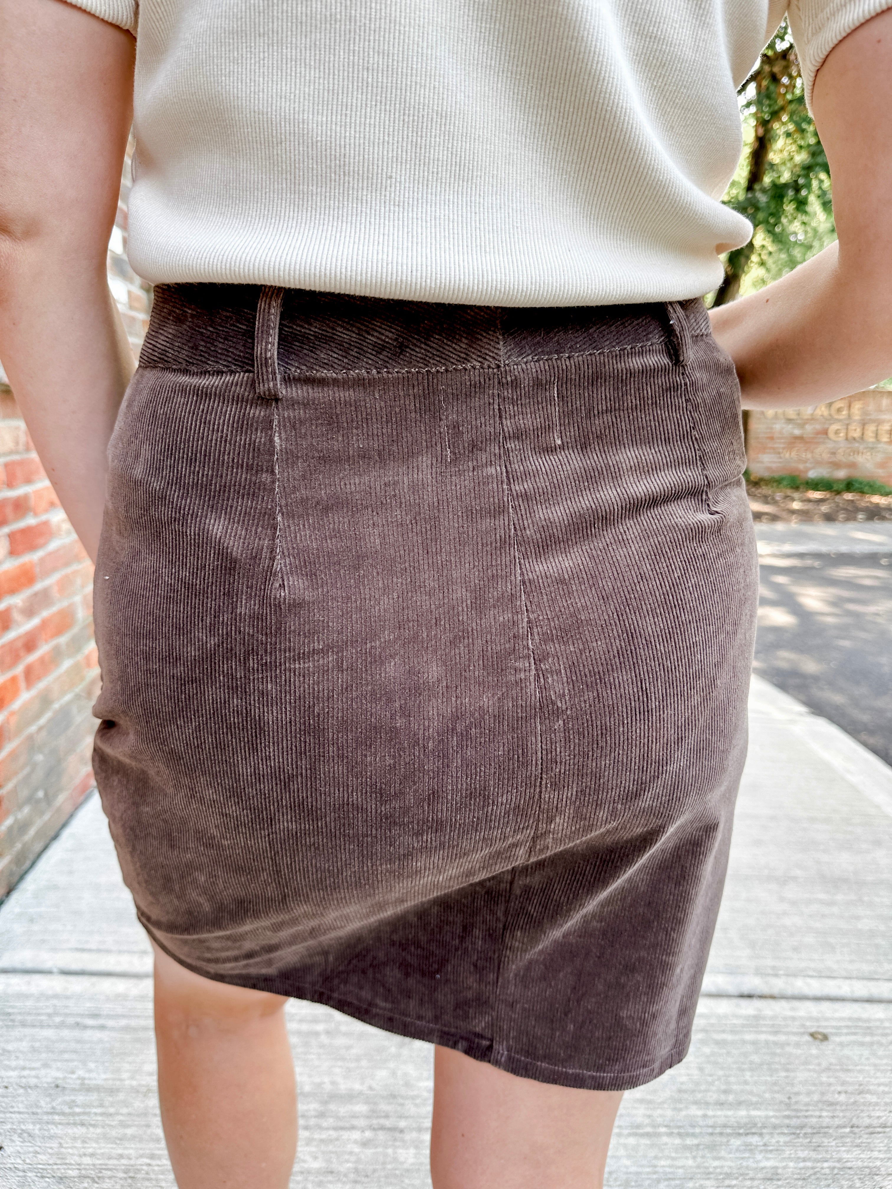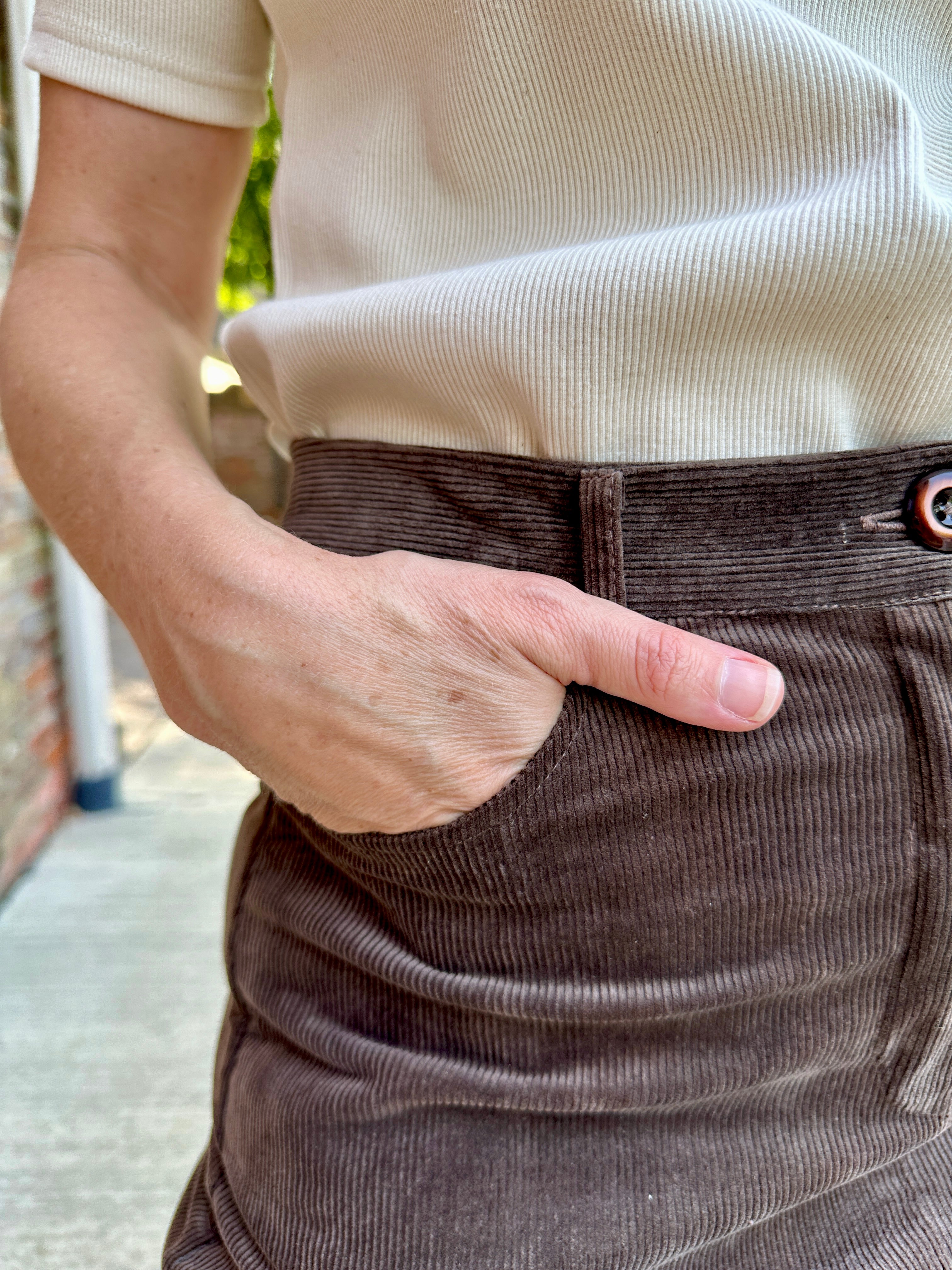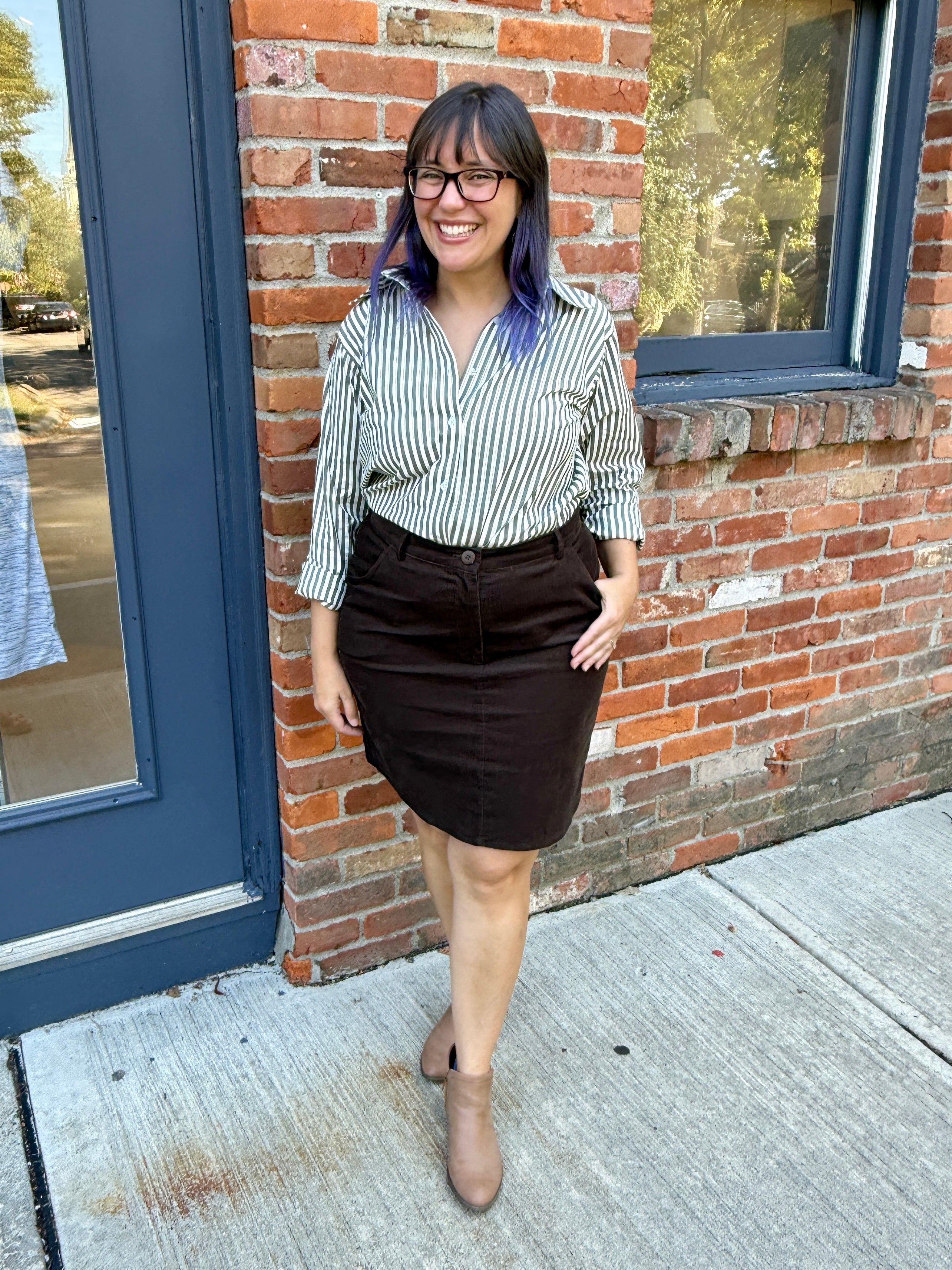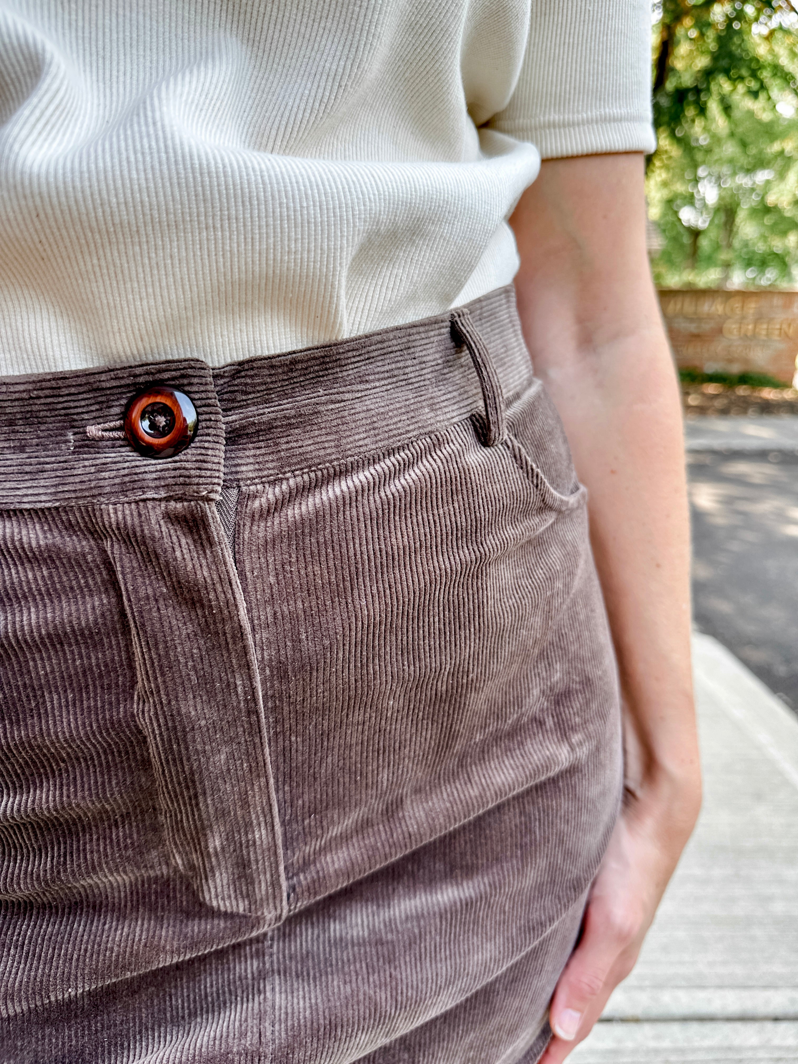 The Corduroy Mini Skirt, crafted from leftover woven cotton for eco-conscious style, features functional side pockets, belt loops, and a flattering mid-high waist fit and transitions seamlessly through three seasons. The no-stretch corduroy offers structured sophistication, while the timeless silhouette complements everything from cardigans to fitted tees.