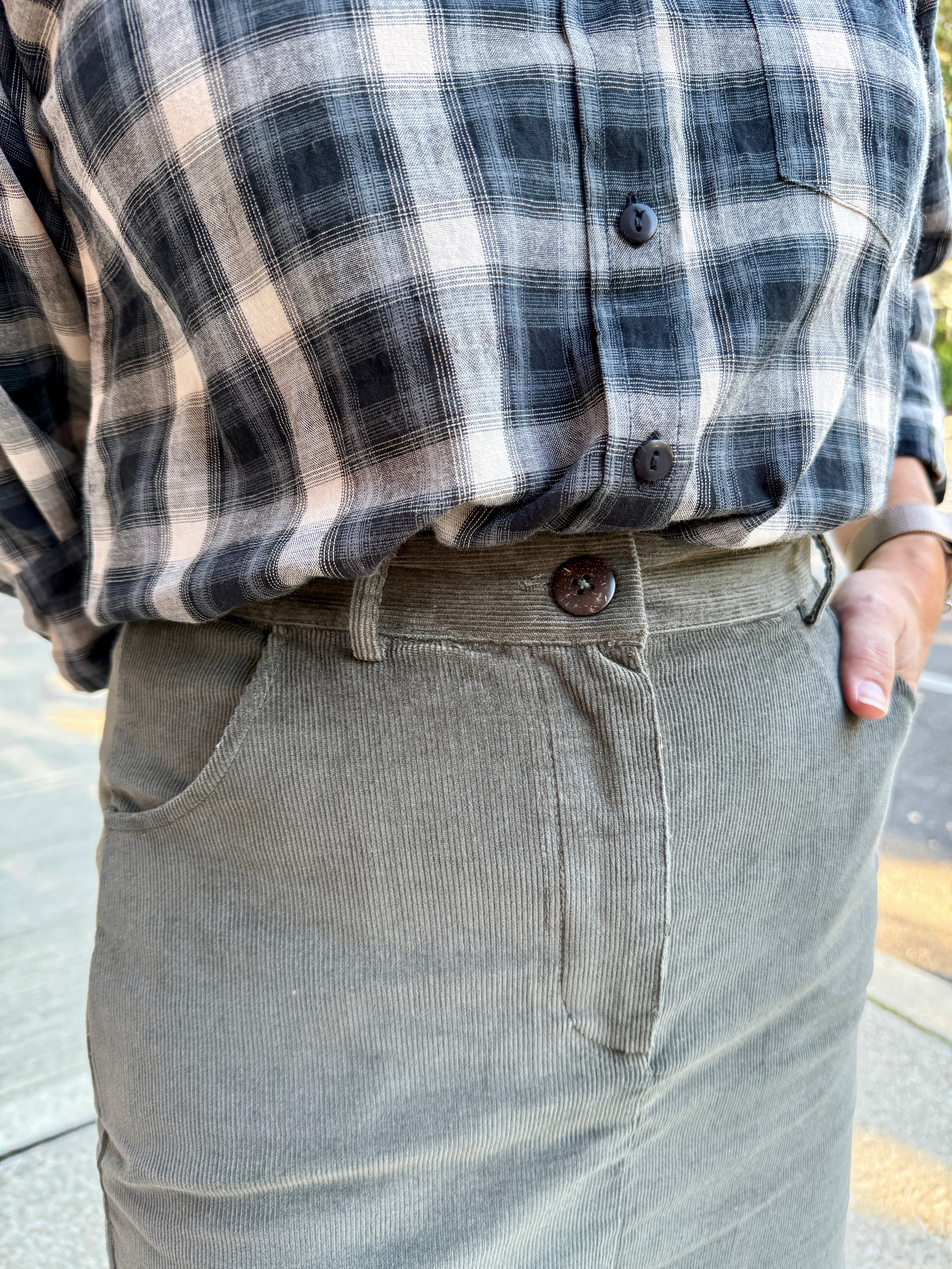 The Corduroy Mini Skirt, crafted from leftover woven cotton for eco-conscious style, features functional side pockets, belt loops, and a flattering mid-high waist fit and transitions seamlessly through three seasons. The no-stretch corduroy offers structured sophistication, while the timeless silhouette complements everything from cardigans to fitted tees.