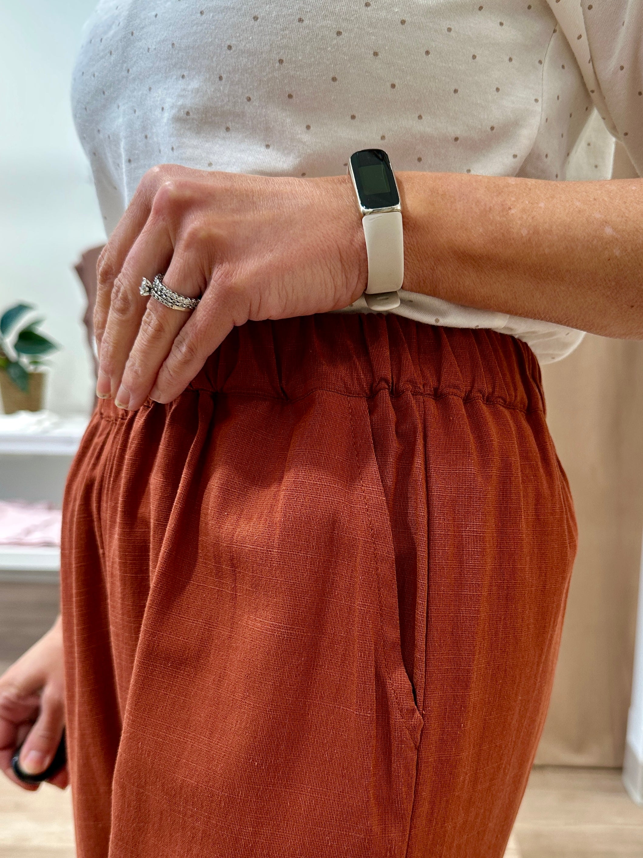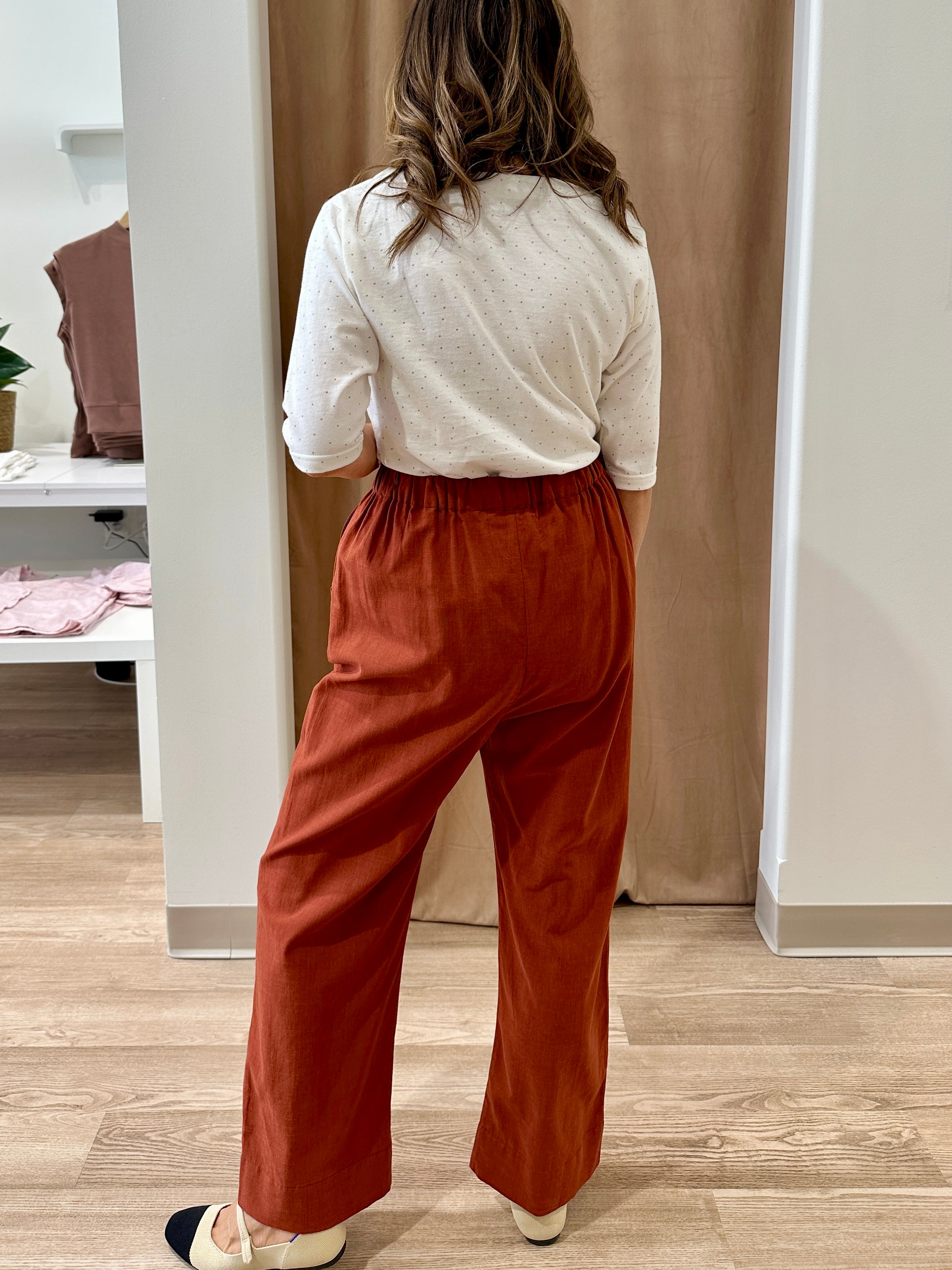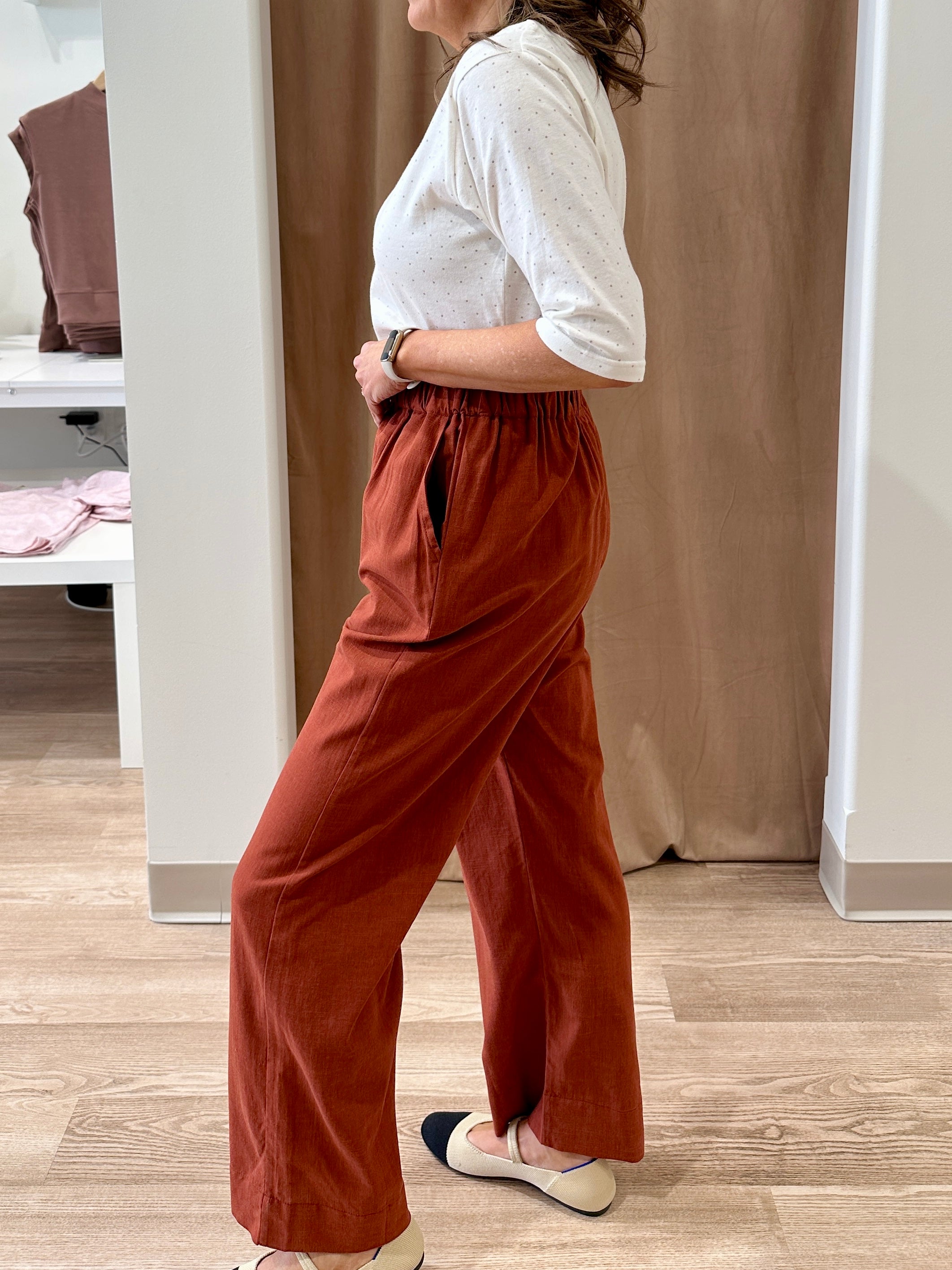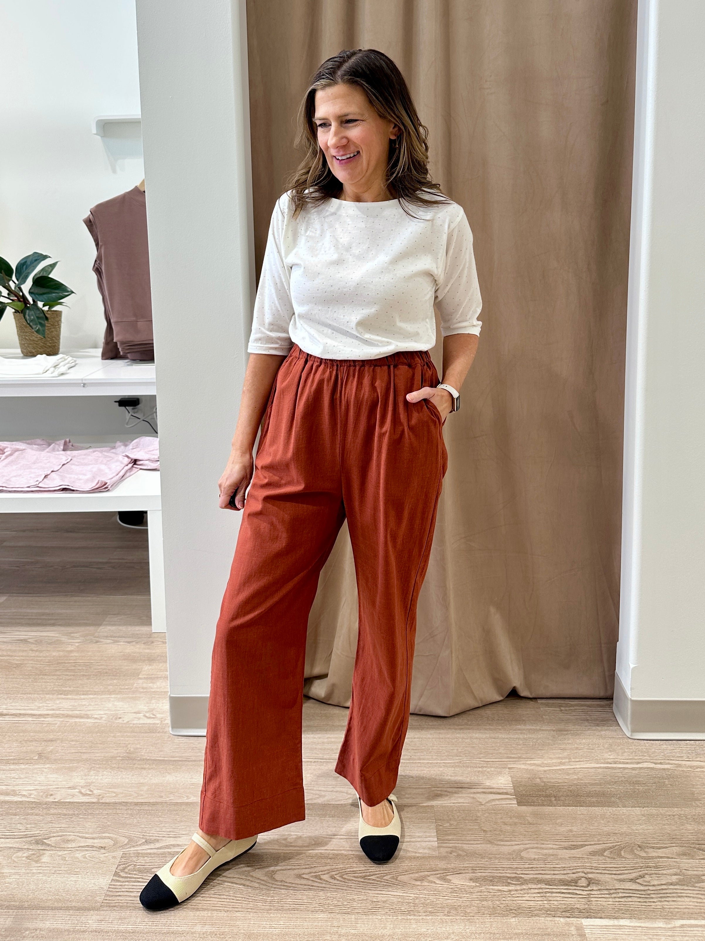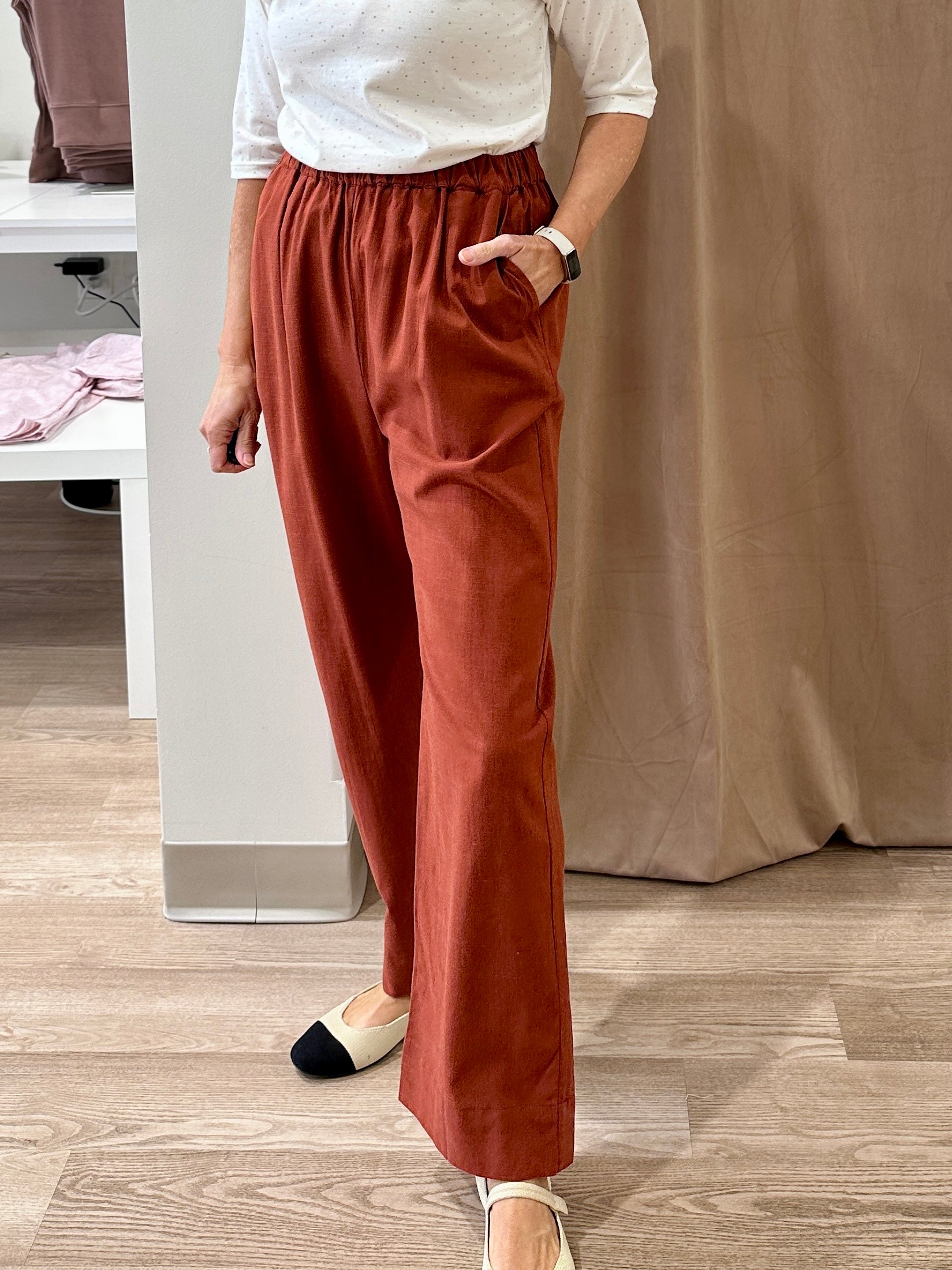 Effortlessly versatile, these pull-on linen pants transition seamlessly from casual weekends to polished workdays. Crafted from linen-cotton blend fabric, they feature a comfortable elastic waistband, relaxed straight-leg fit, and practical side pockets. The lightweight, breathable material keeps you cool while finished French seams ensure lasting quality. Perfect for the eco-conscious woman who values both style and comfort in her everyday wardrobe.