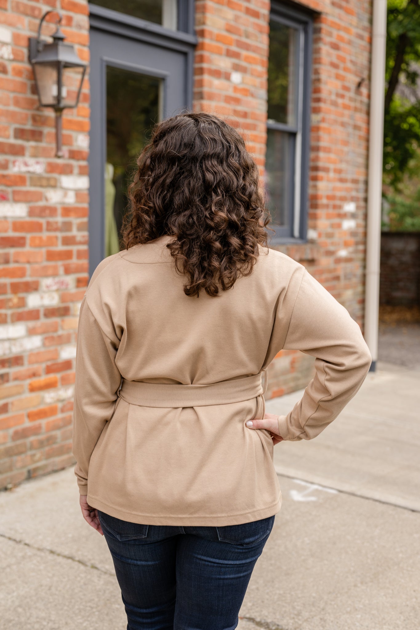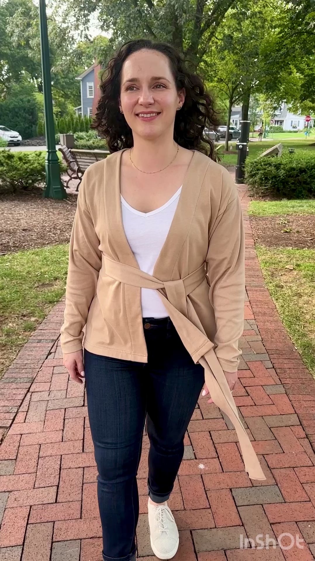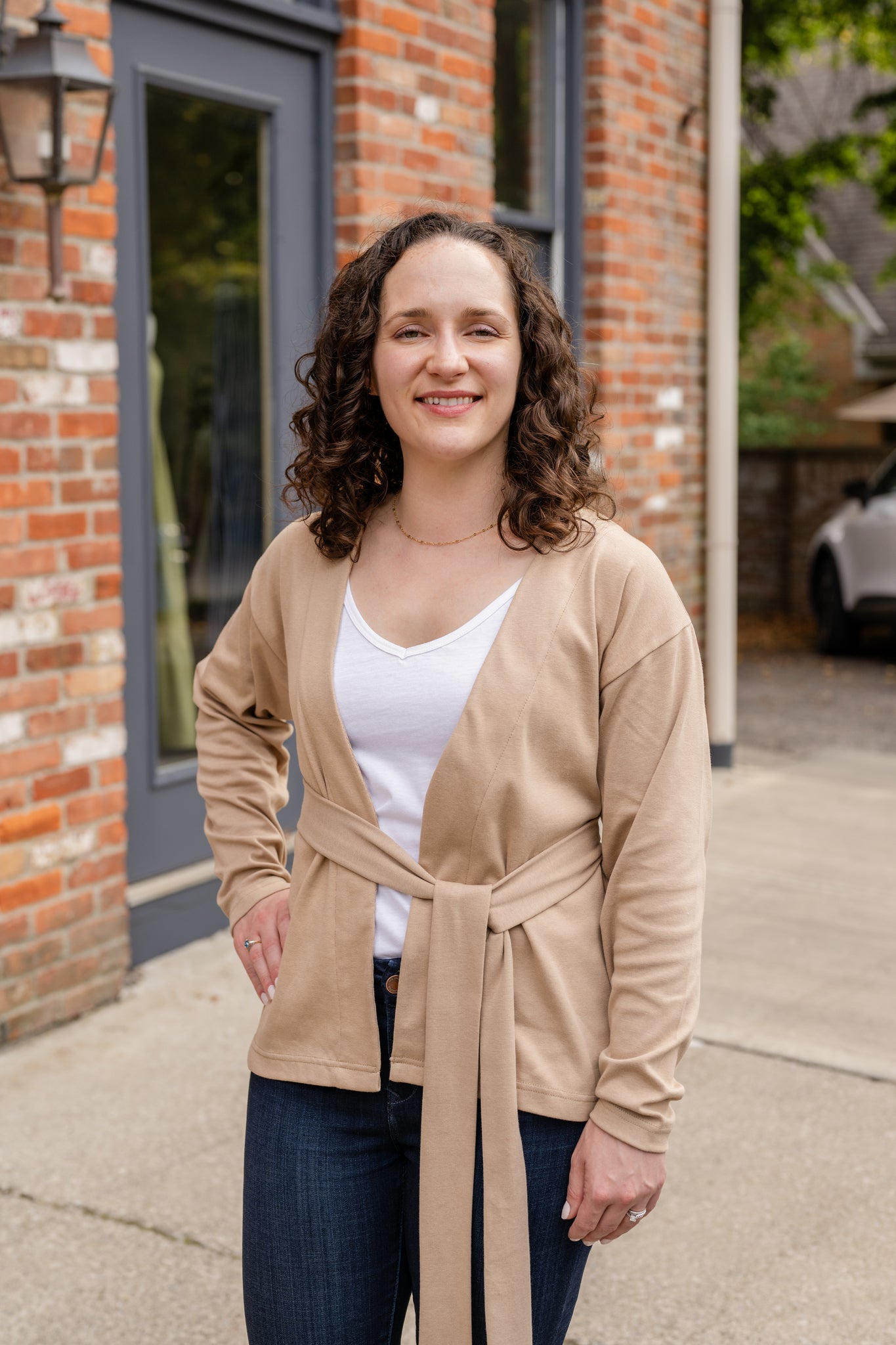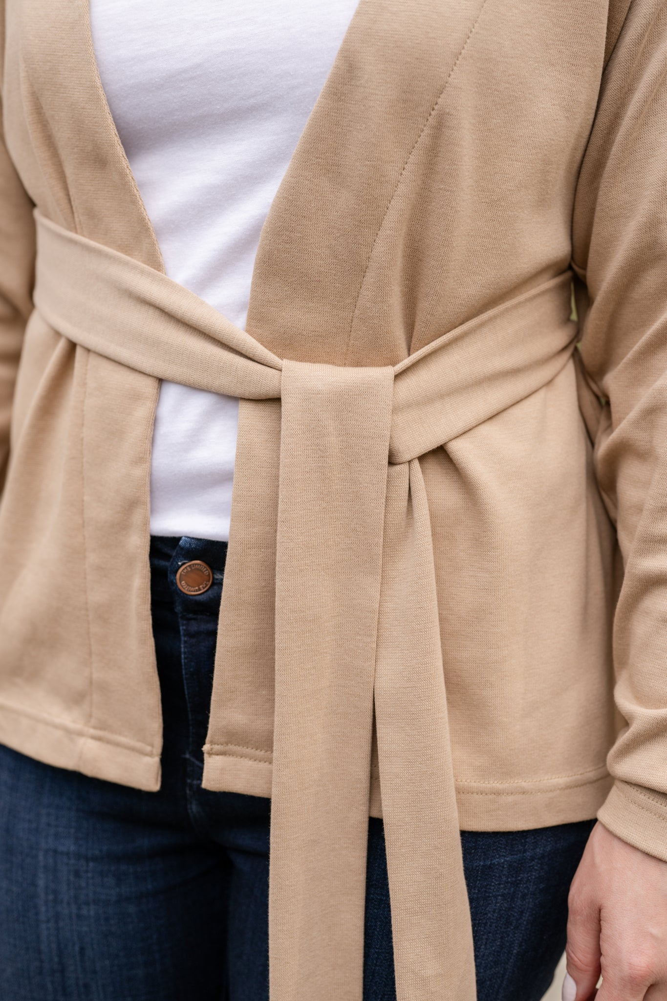 Versatile belted jacket cardigan crafted from sustainable surplus fabric. Features a flattering tie belt and structured design that transitions seamlessly from casual to polished looks.