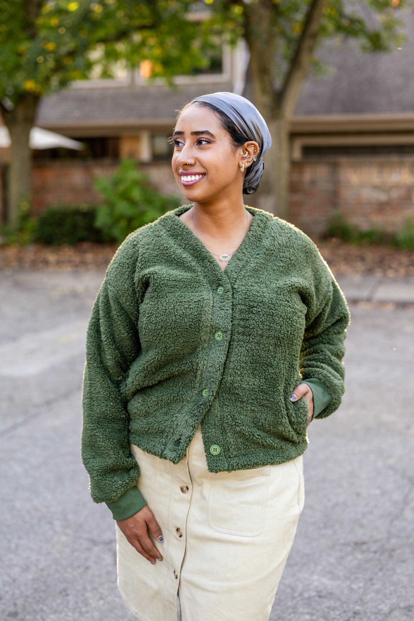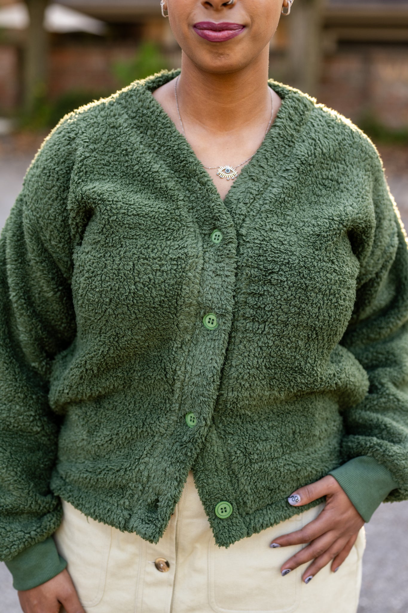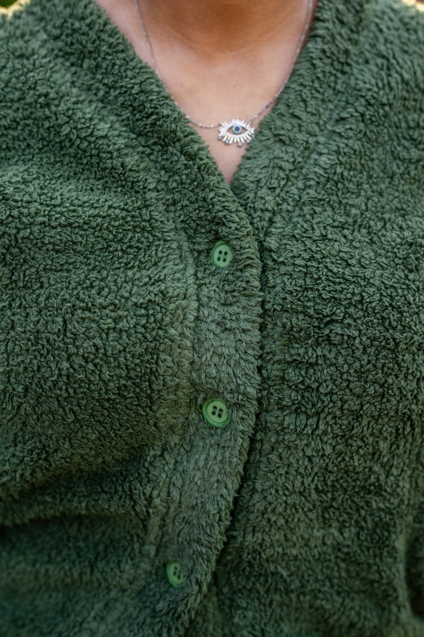 Cozy sherpa button-front cardigan that combines warmth with style. This plush, textured piece features a relaxed fit perfect for layering during cooler months.
