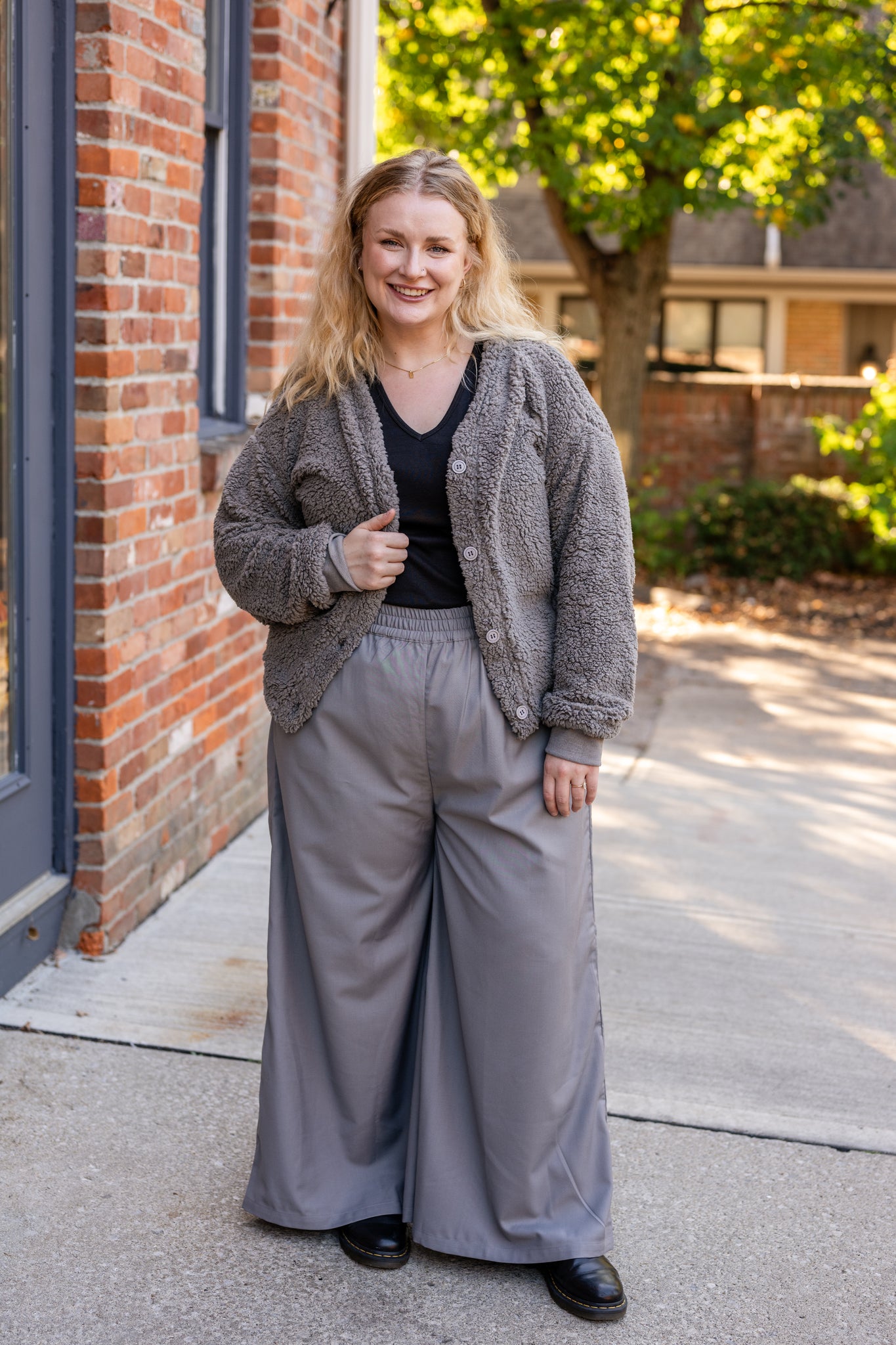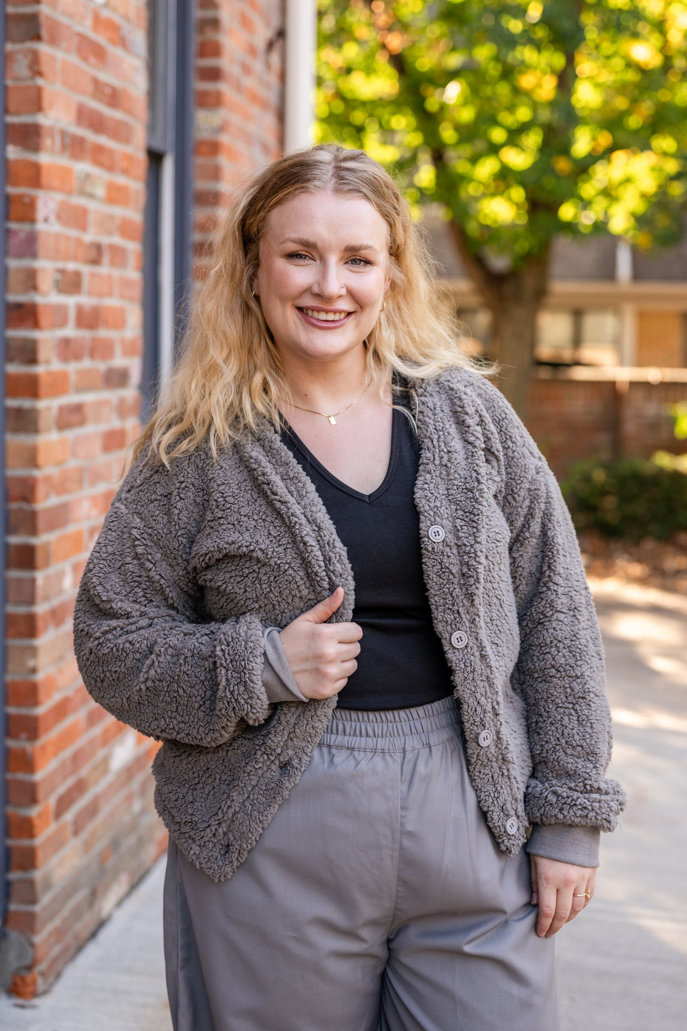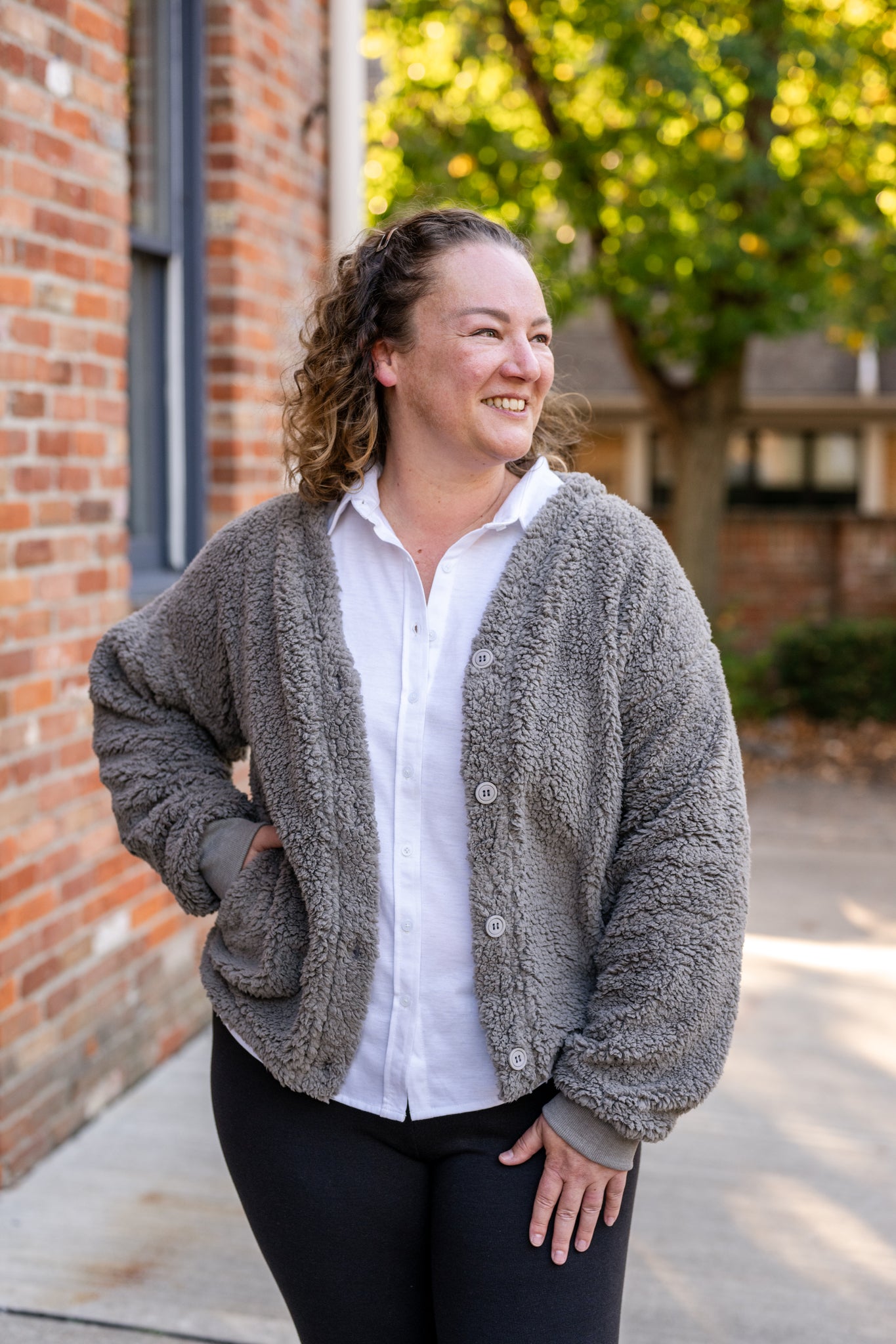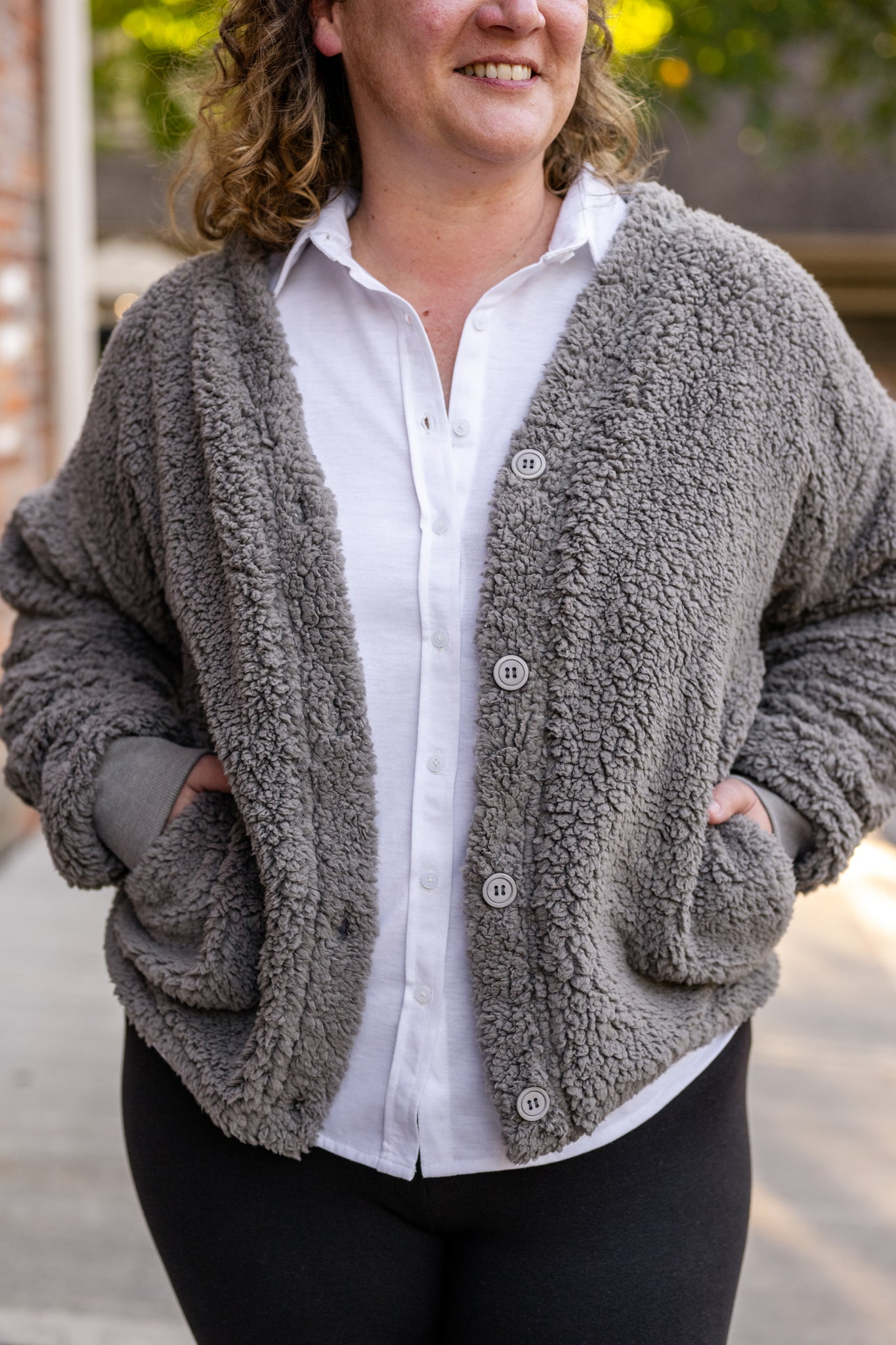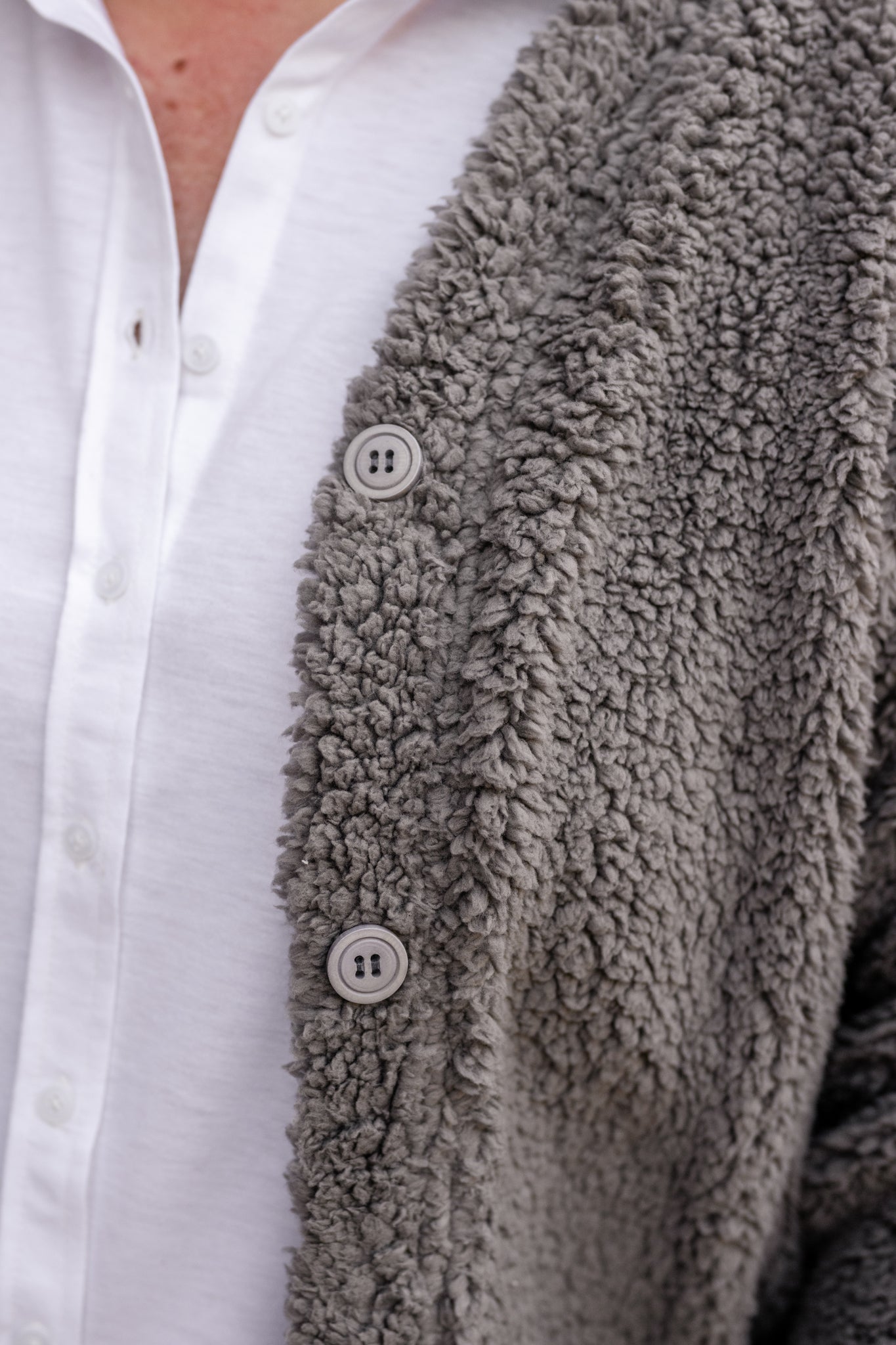 Cozy sherpa button-front cardigan with a relaxed fit. Perfect layering piece for chilly days.