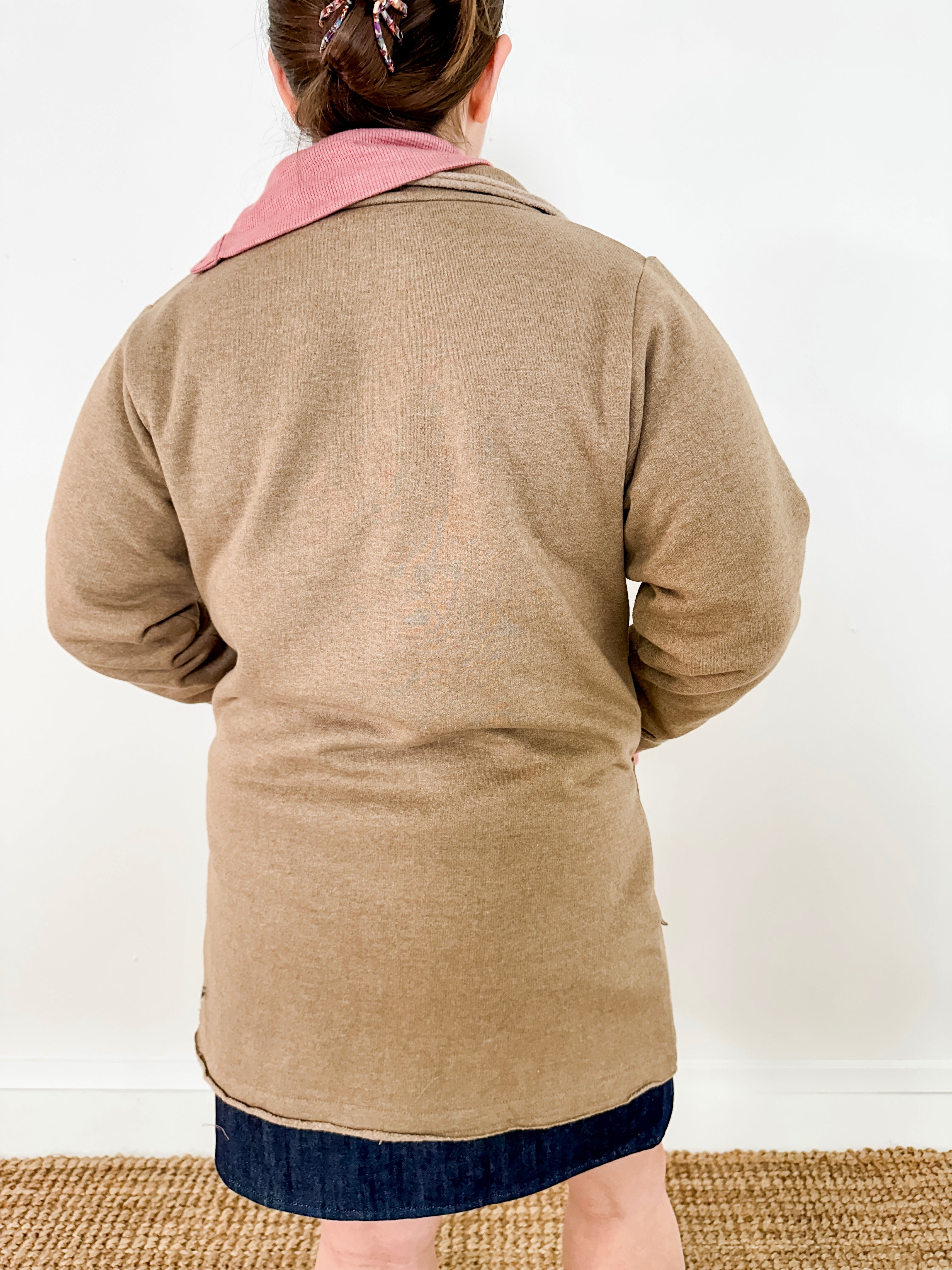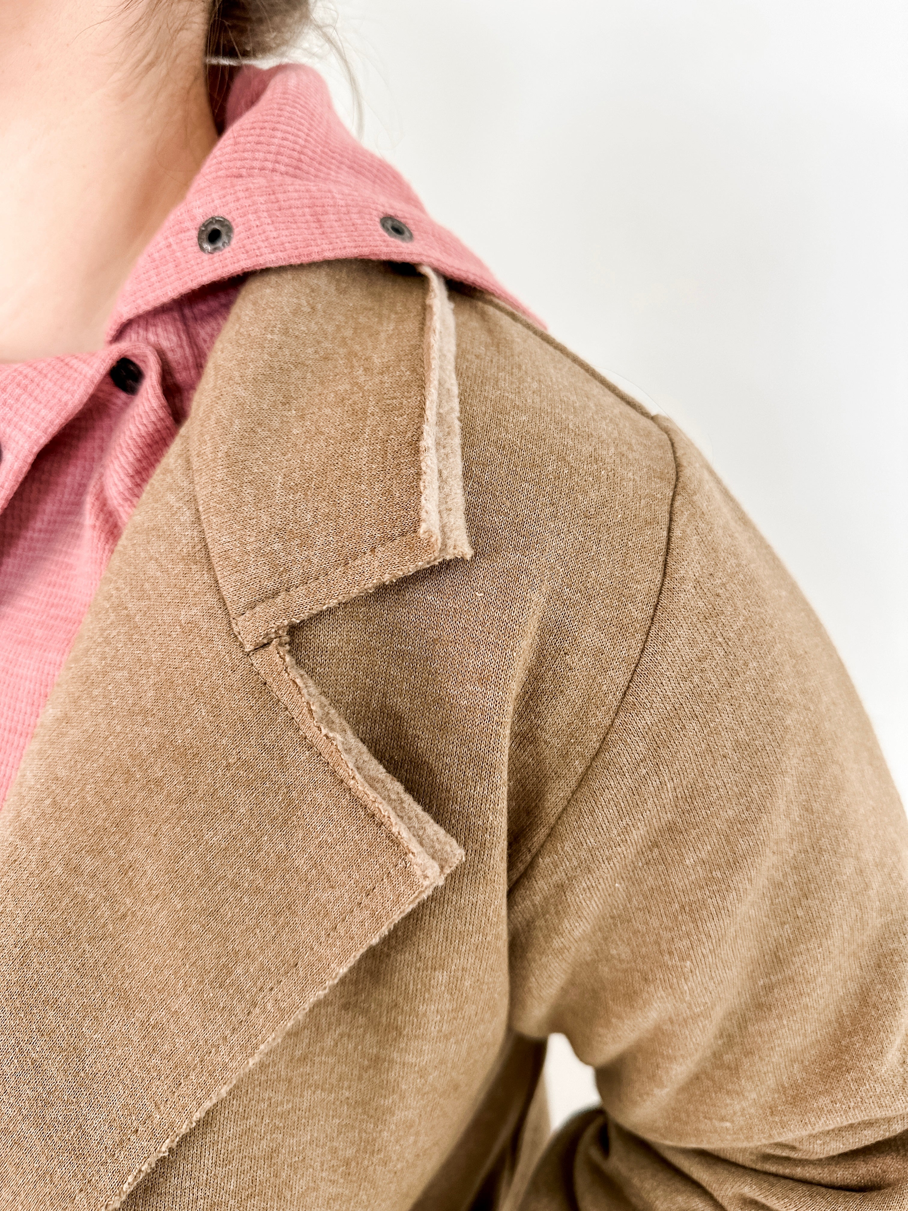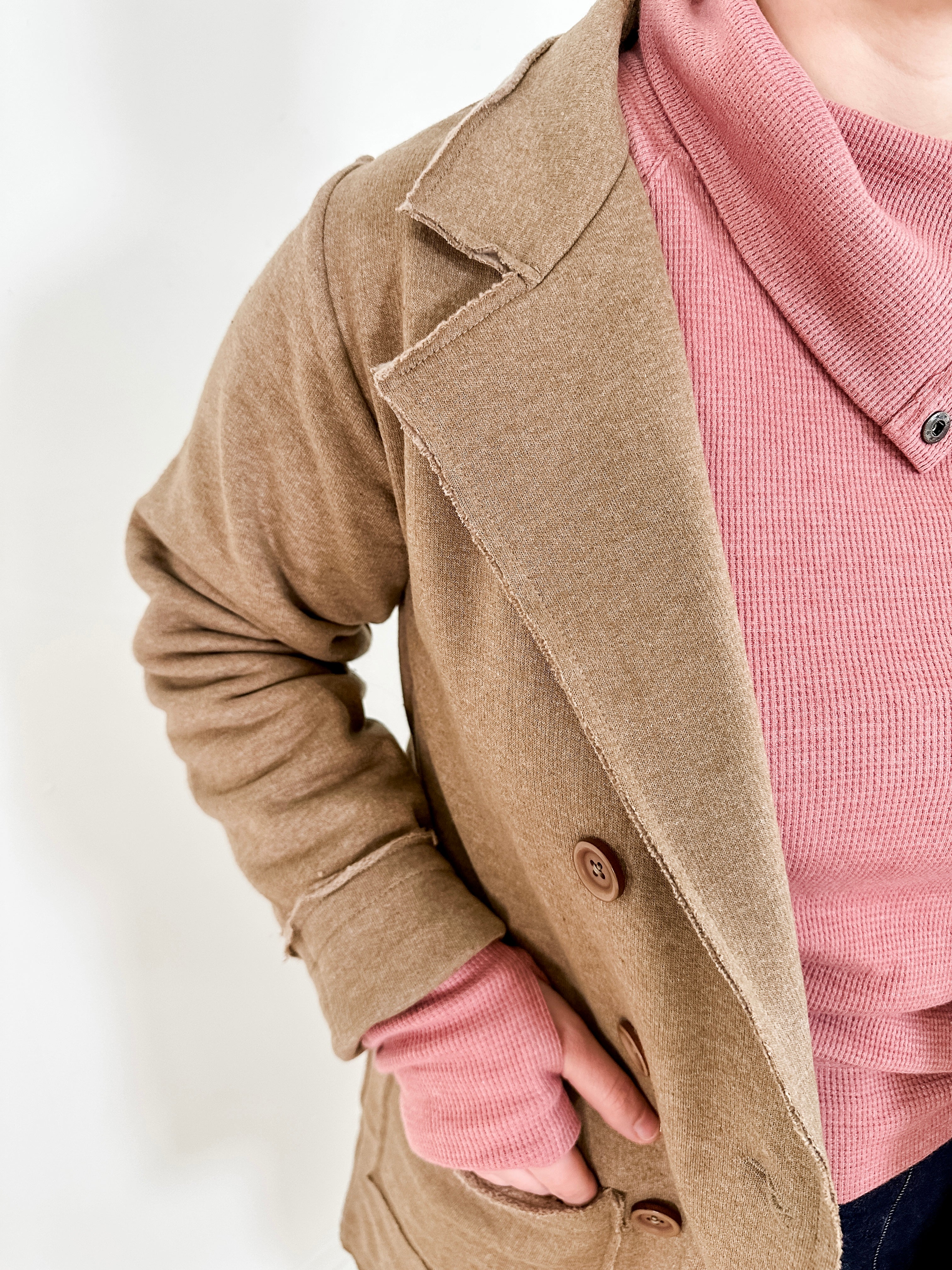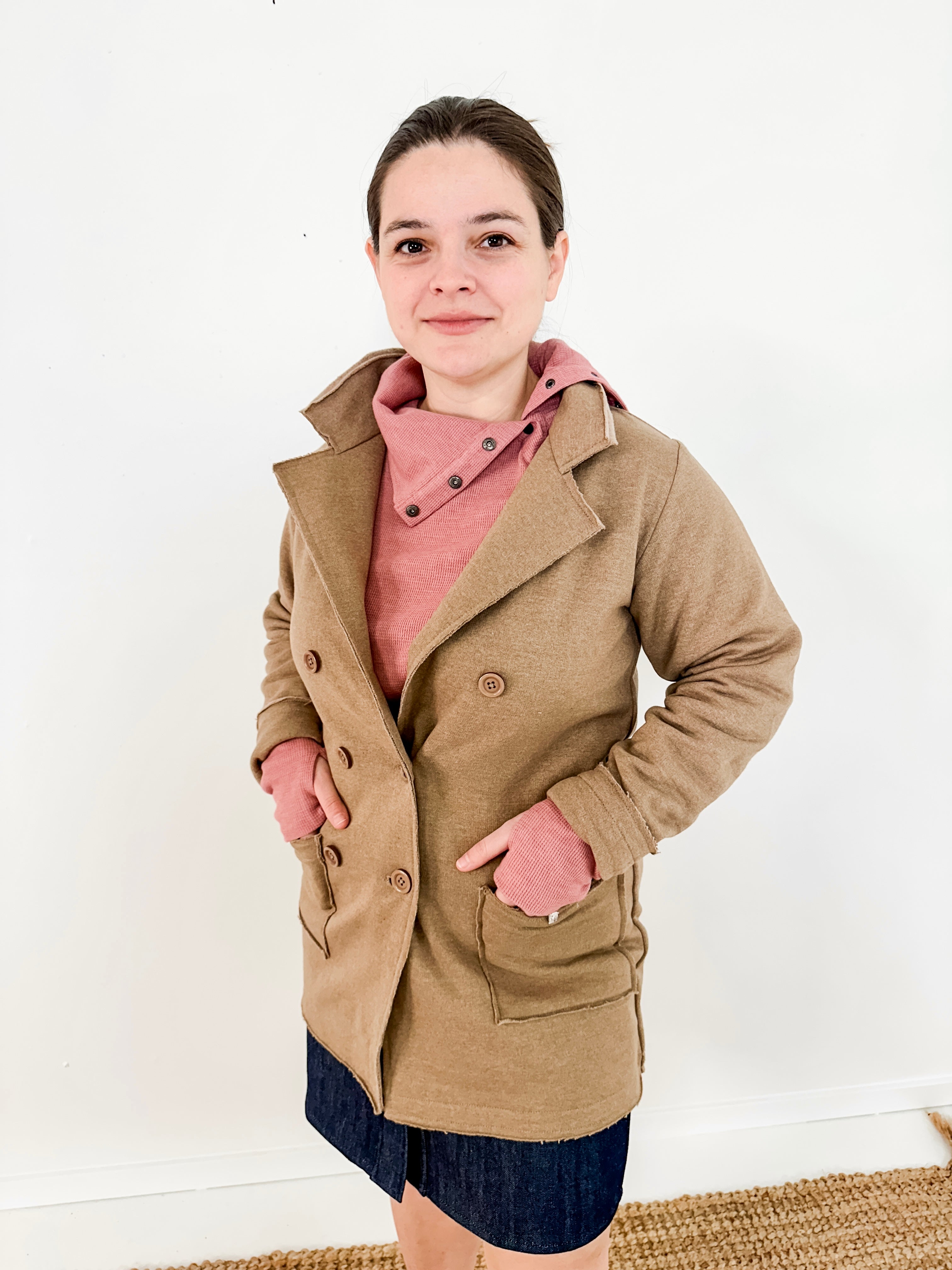 Classic reefer jacket crafted from sustainable surplus fabric. Features a timeless nautical-inspired design with double-breasted styling for versatile layering.
