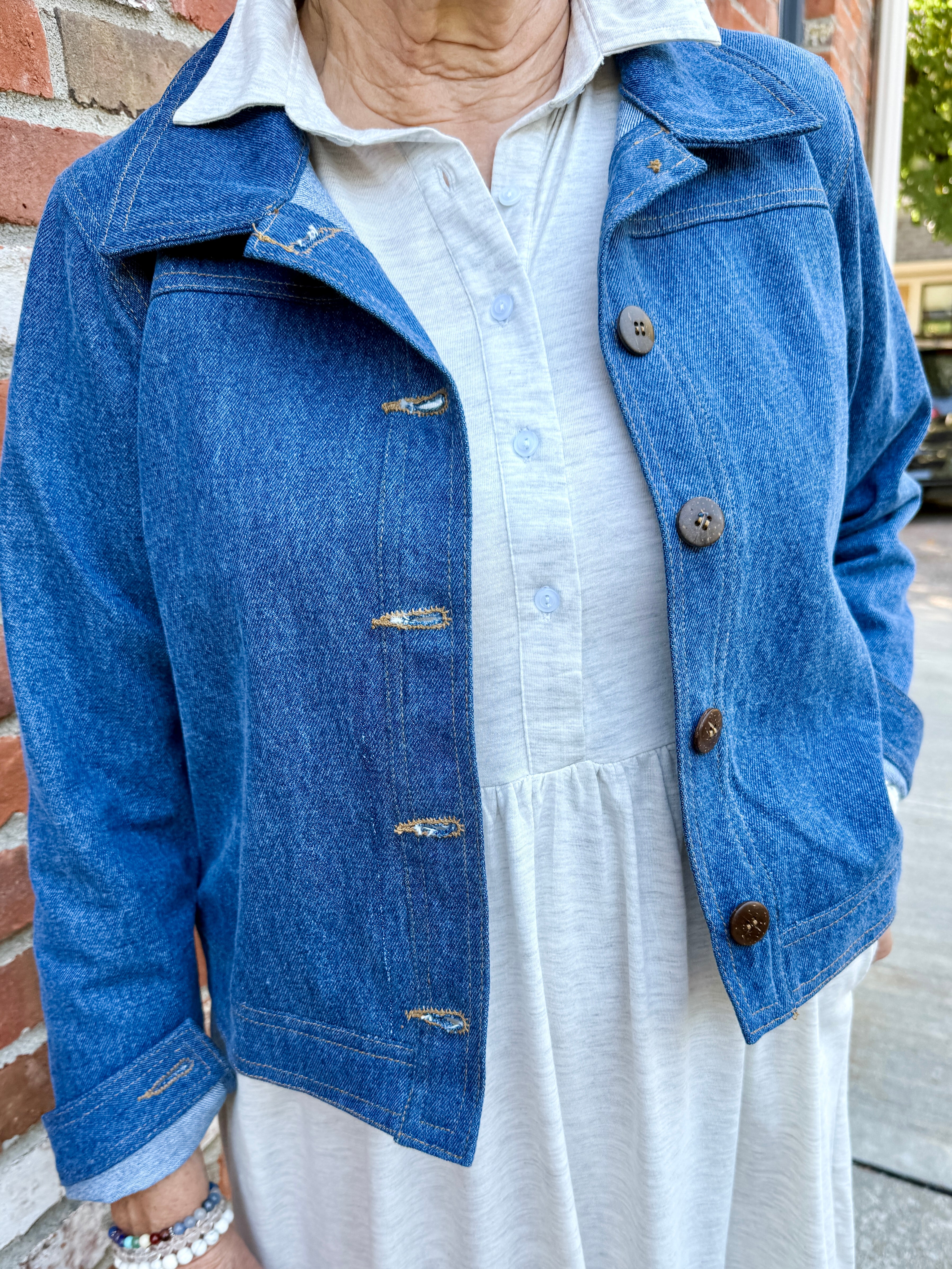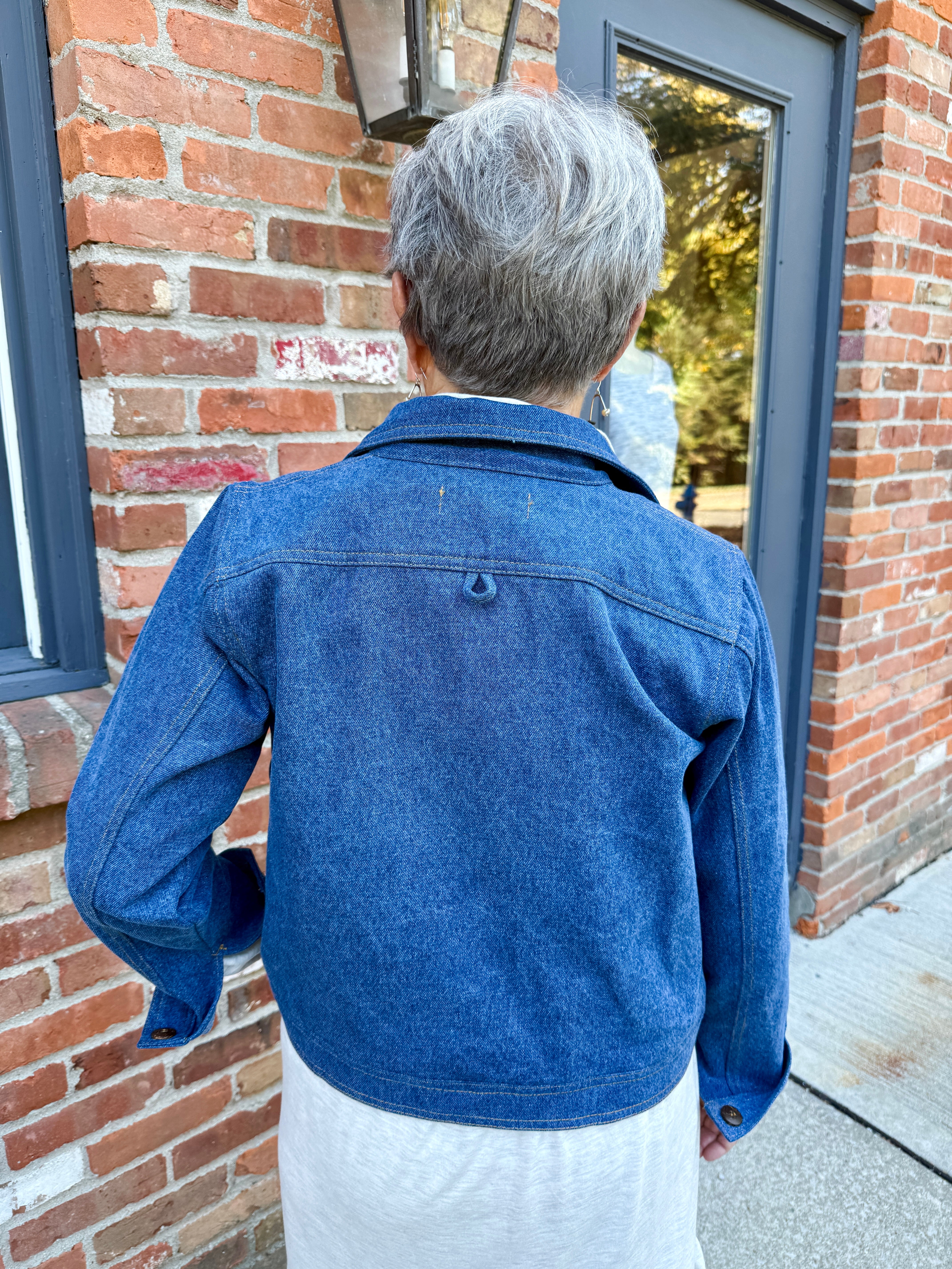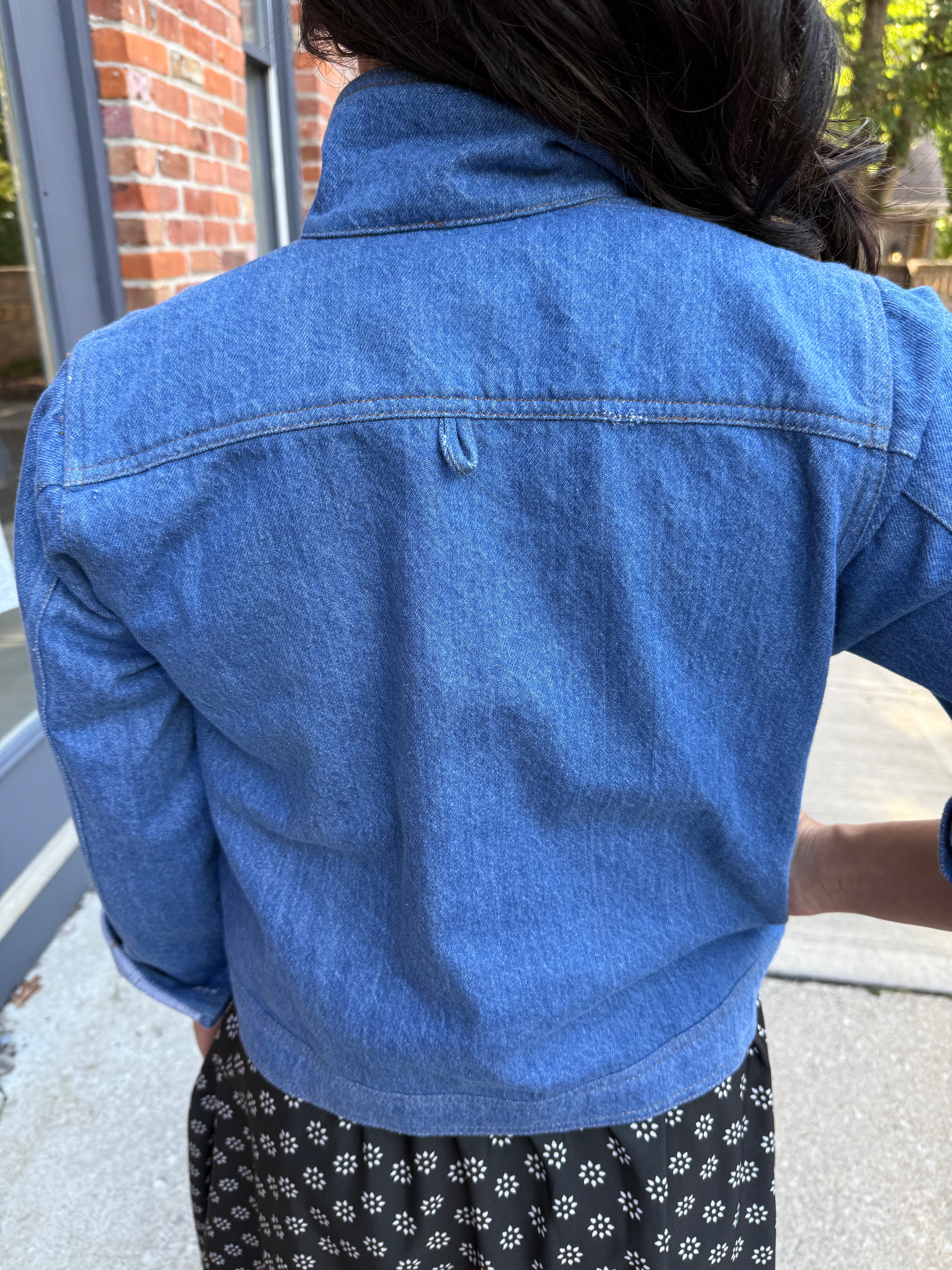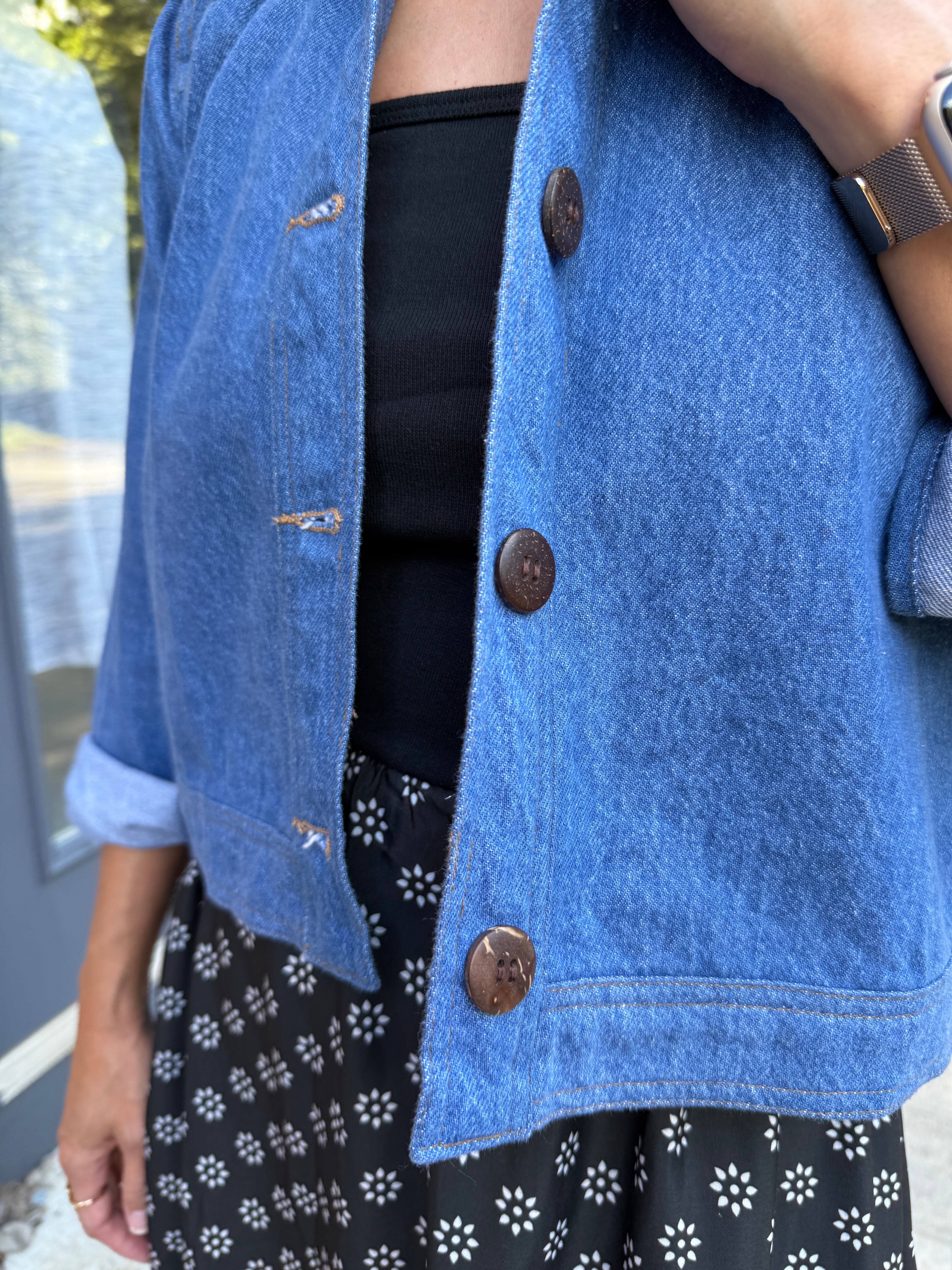 A classic short denim jacket perfect for spring and fall layering. Features retro wood buttons and timeless styling crafted from sustainable surplus denim fabric.