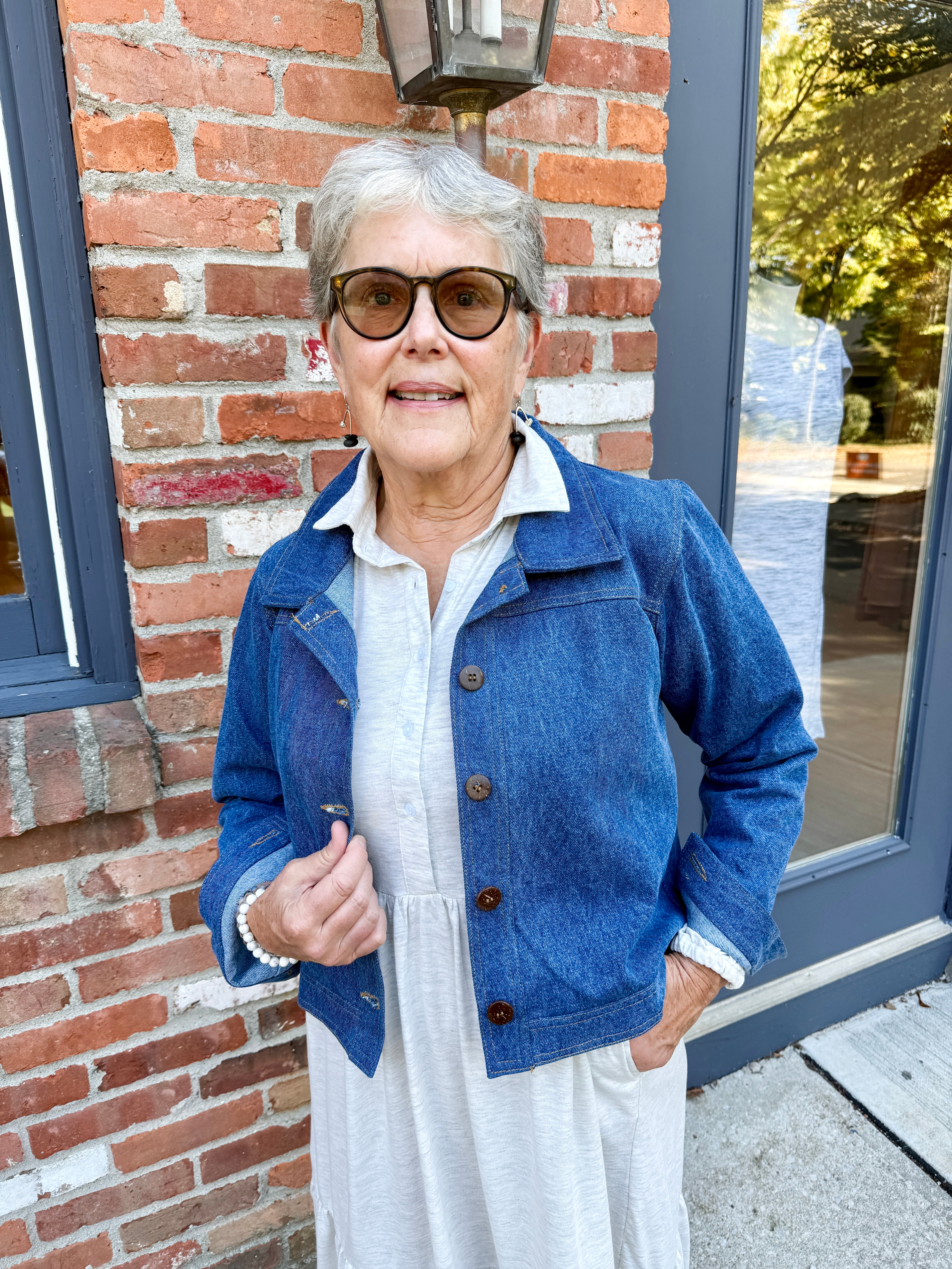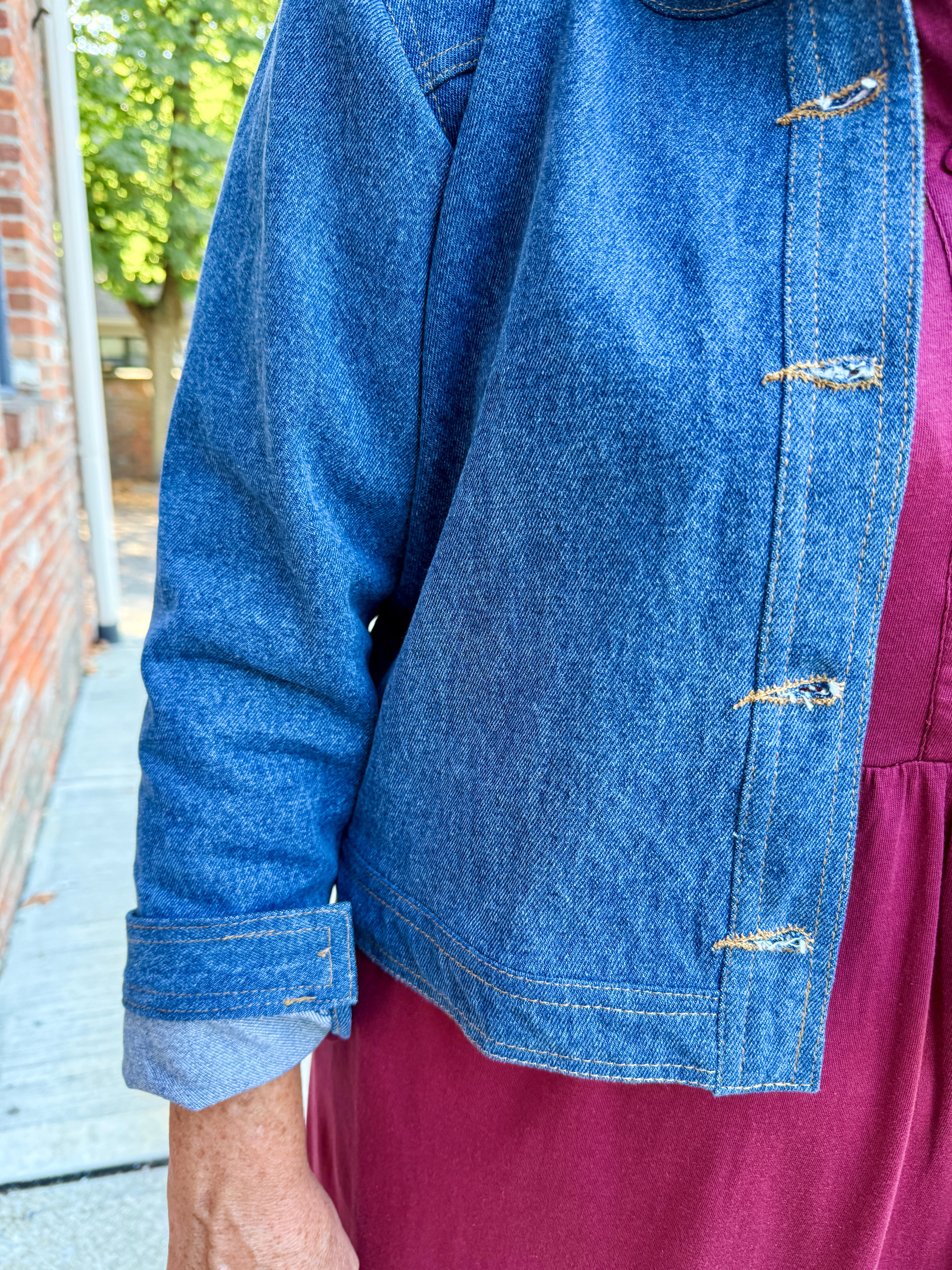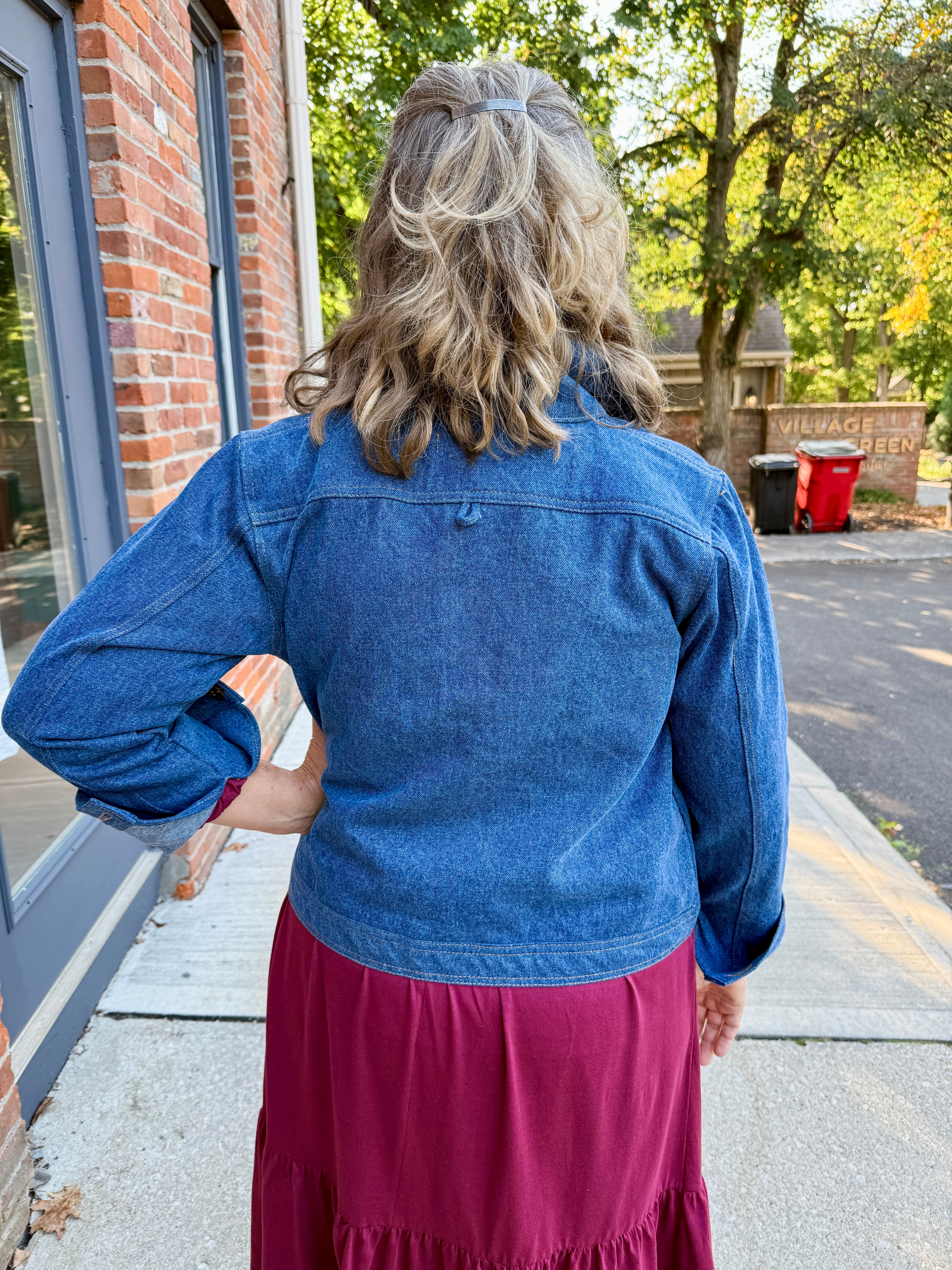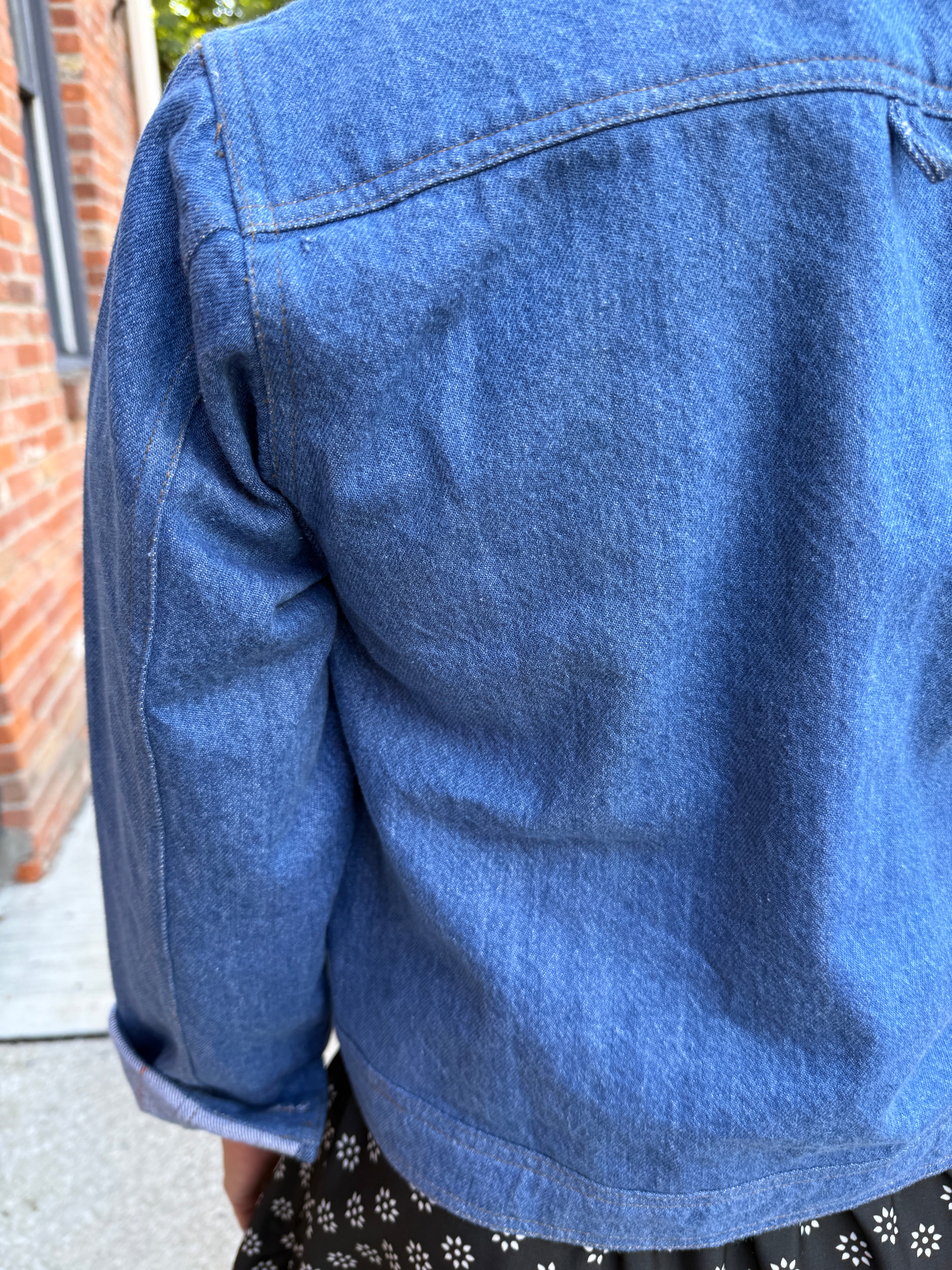 A classic short denim jacket perfect for spring and fall layering. Features retro wood buttons and timeless styling crafted from sustainable surplus denim fabric.