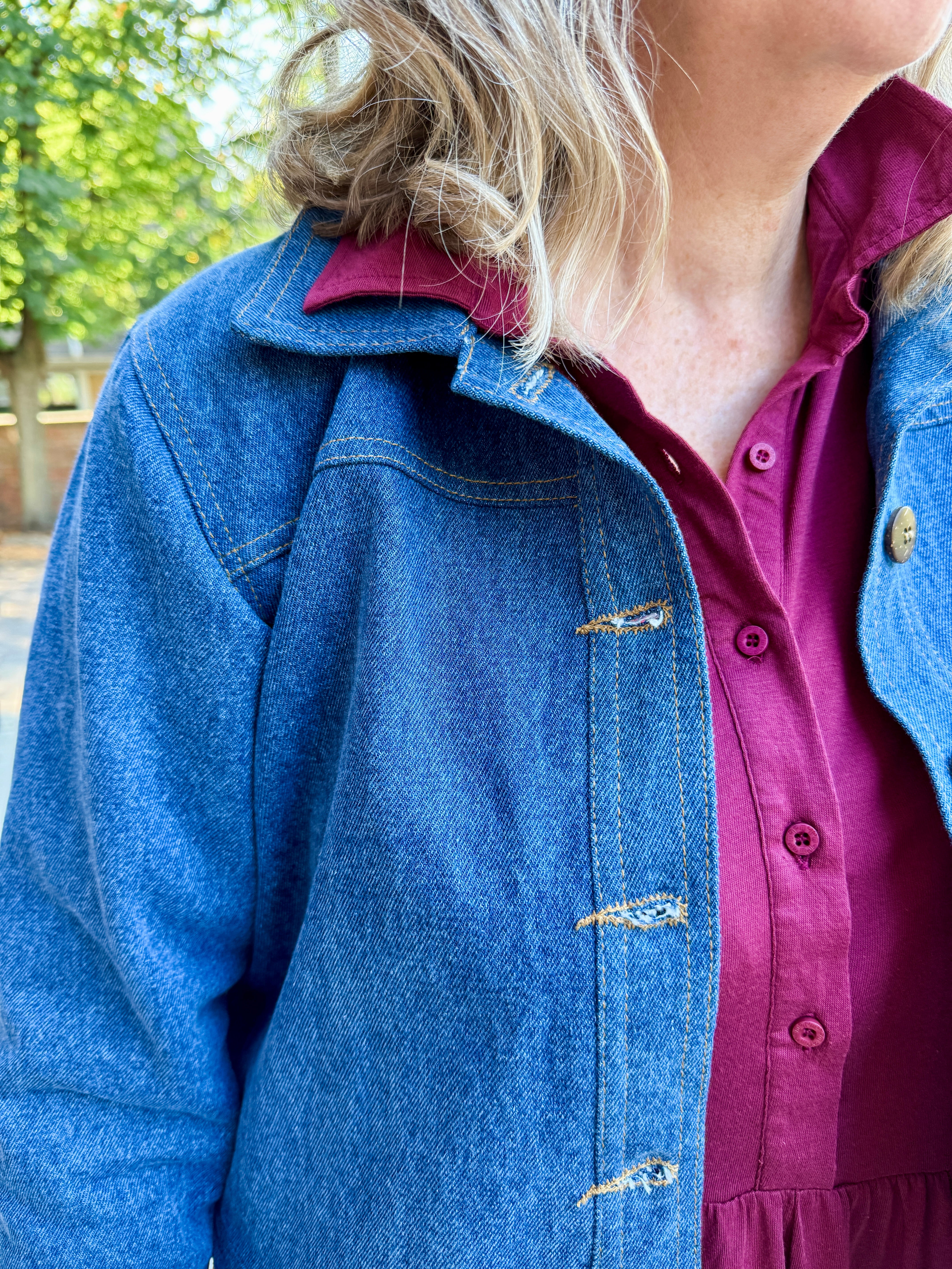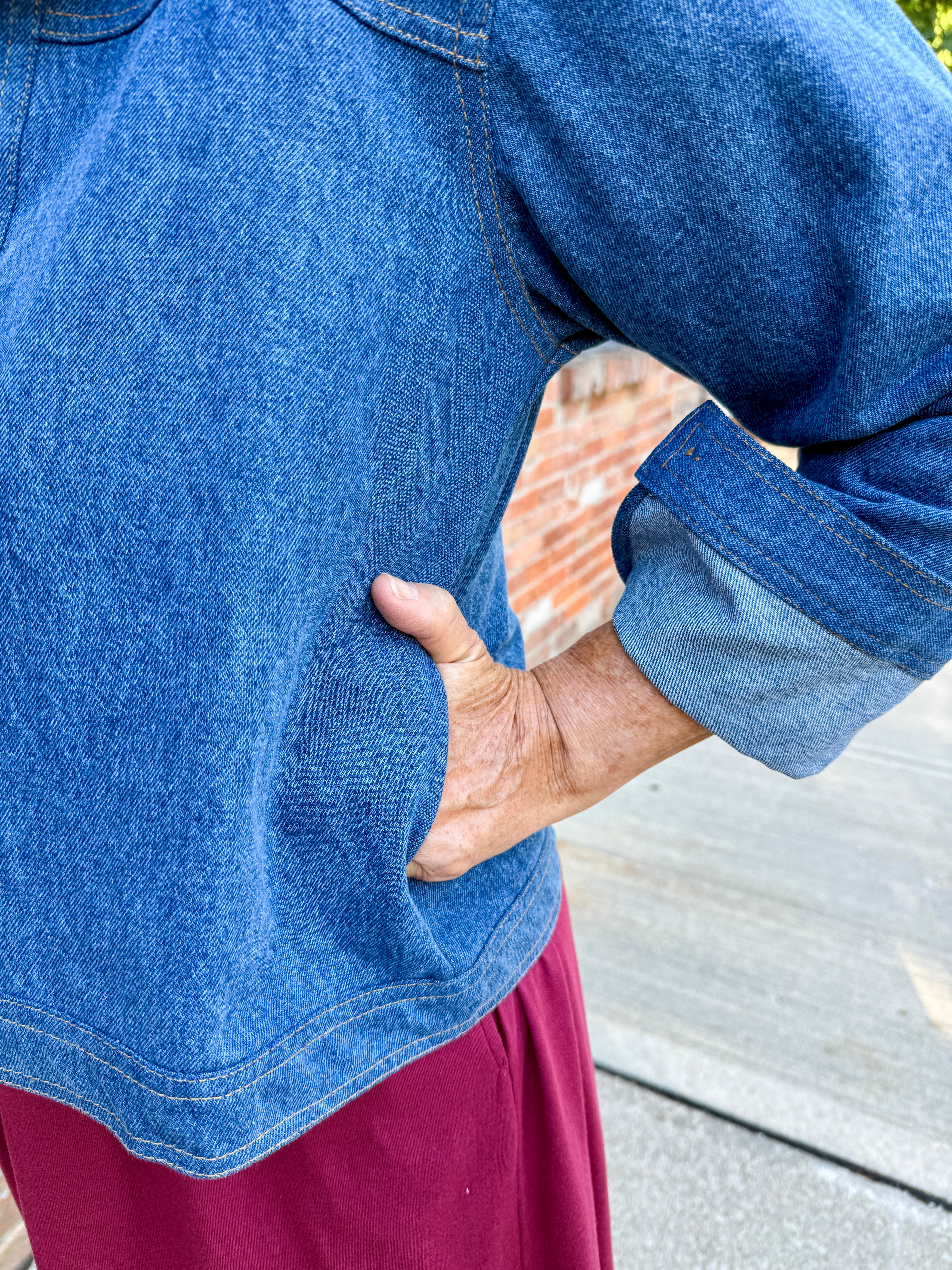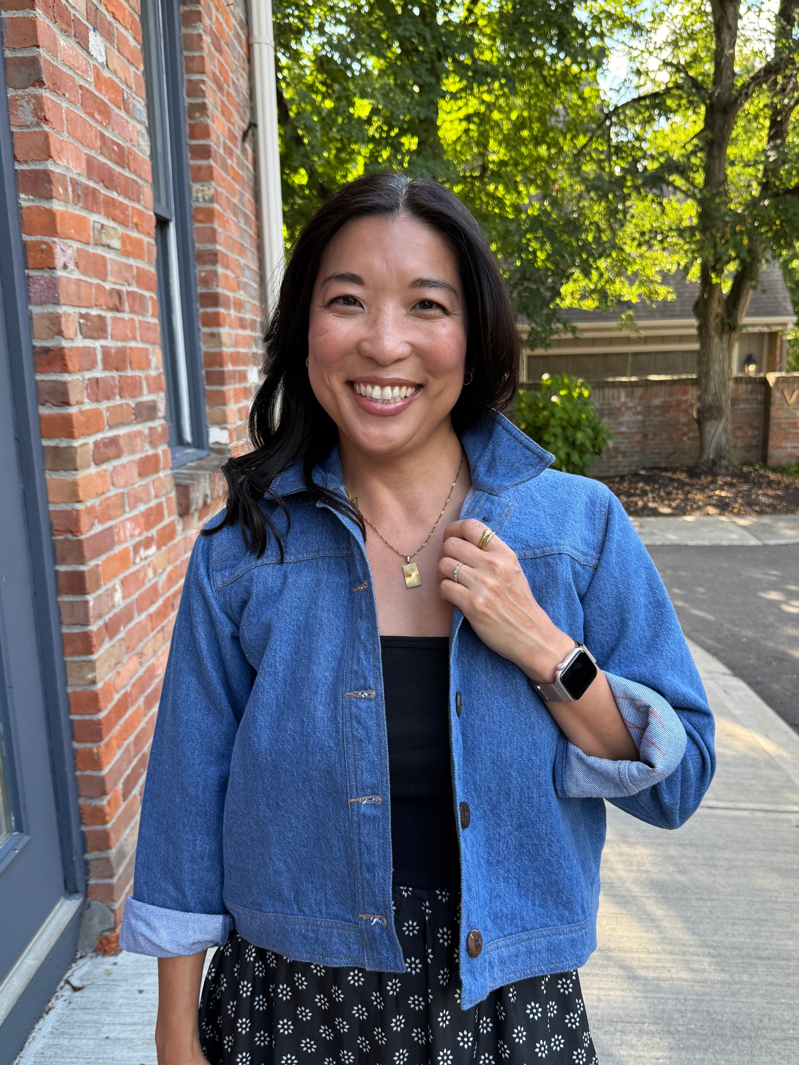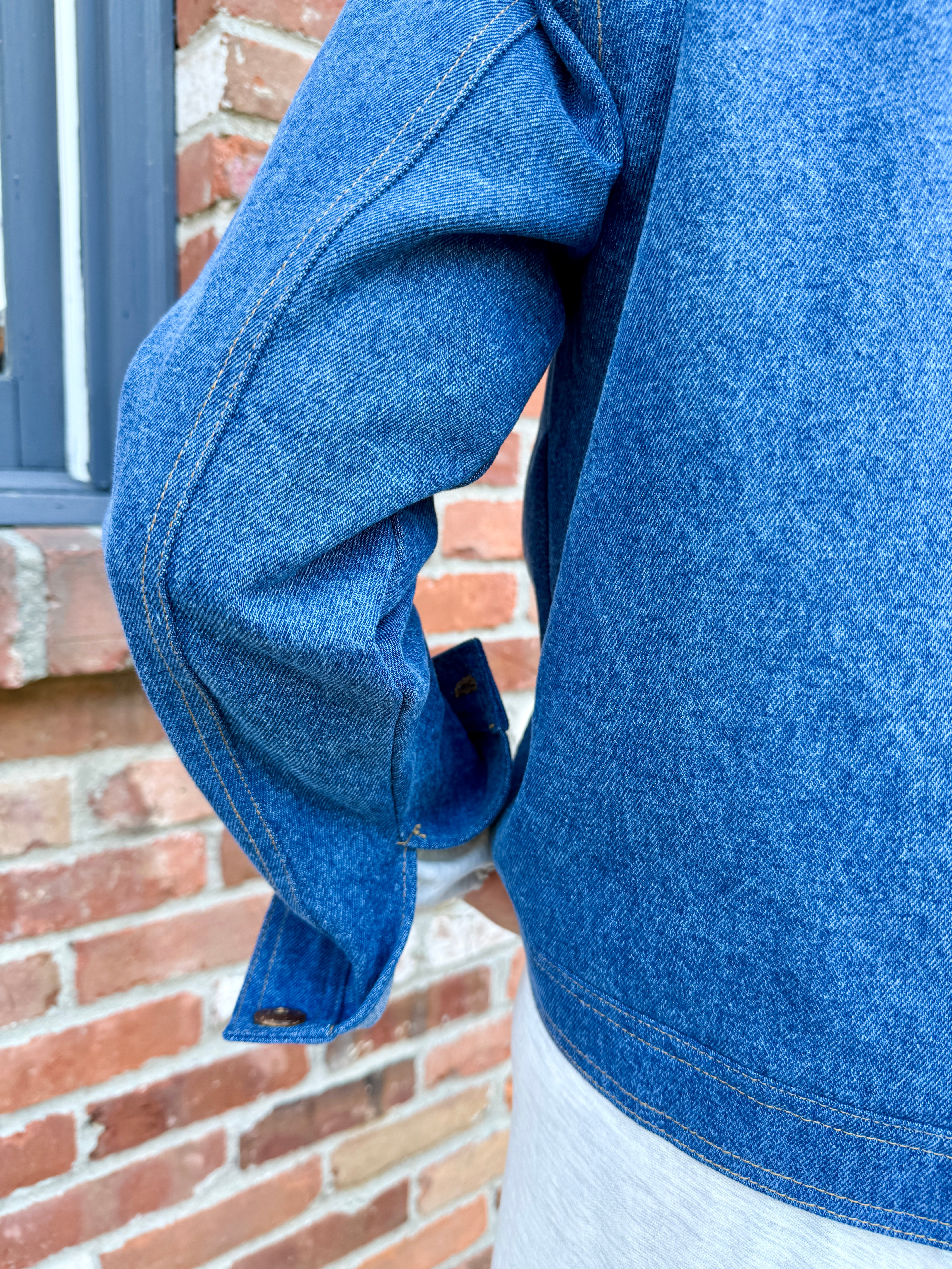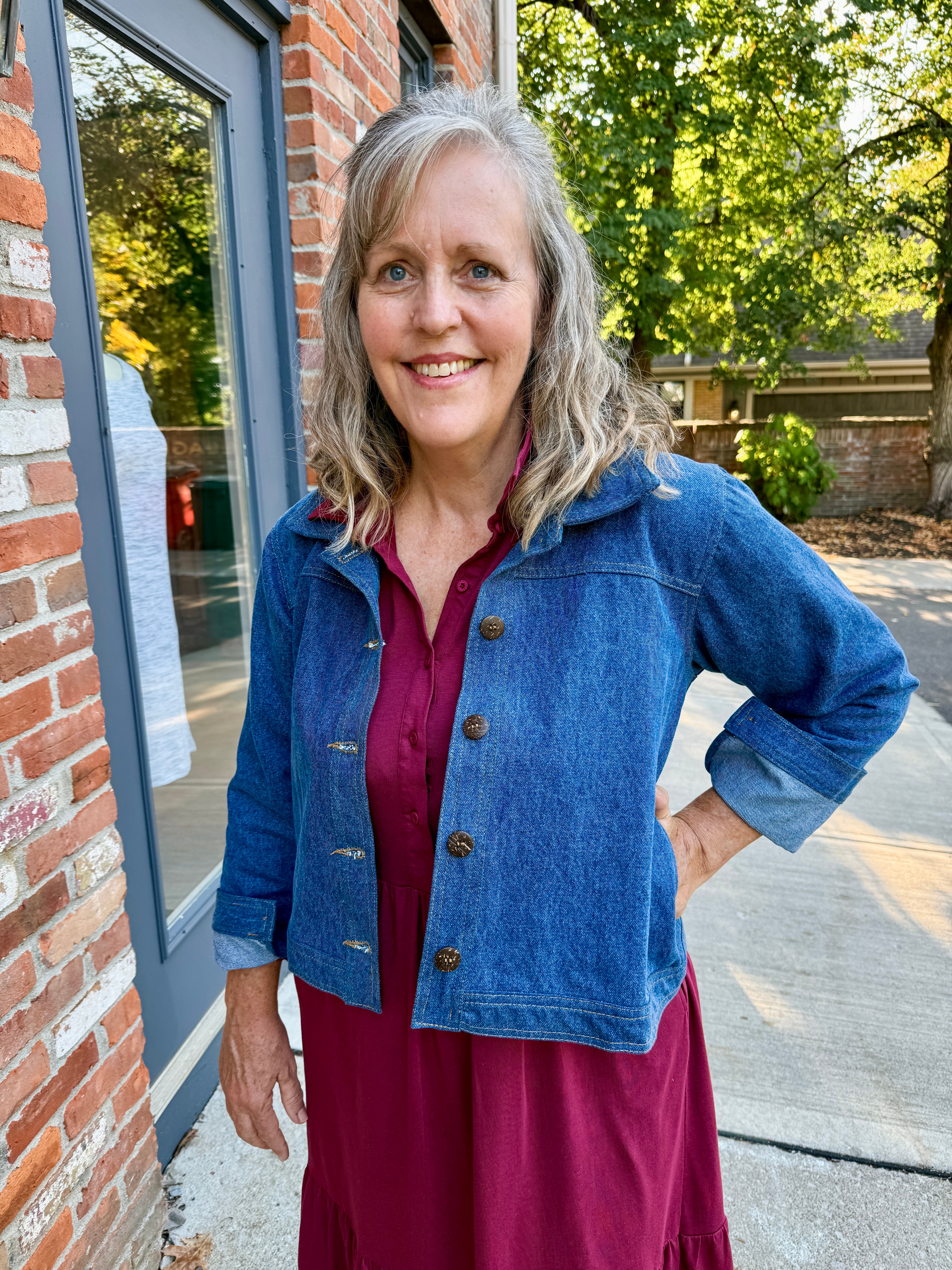 A classic short denim jacket perfect for spring and fall layering. Features retro wood buttons and timeless styling crafted from sustainable surplus denim fabric.