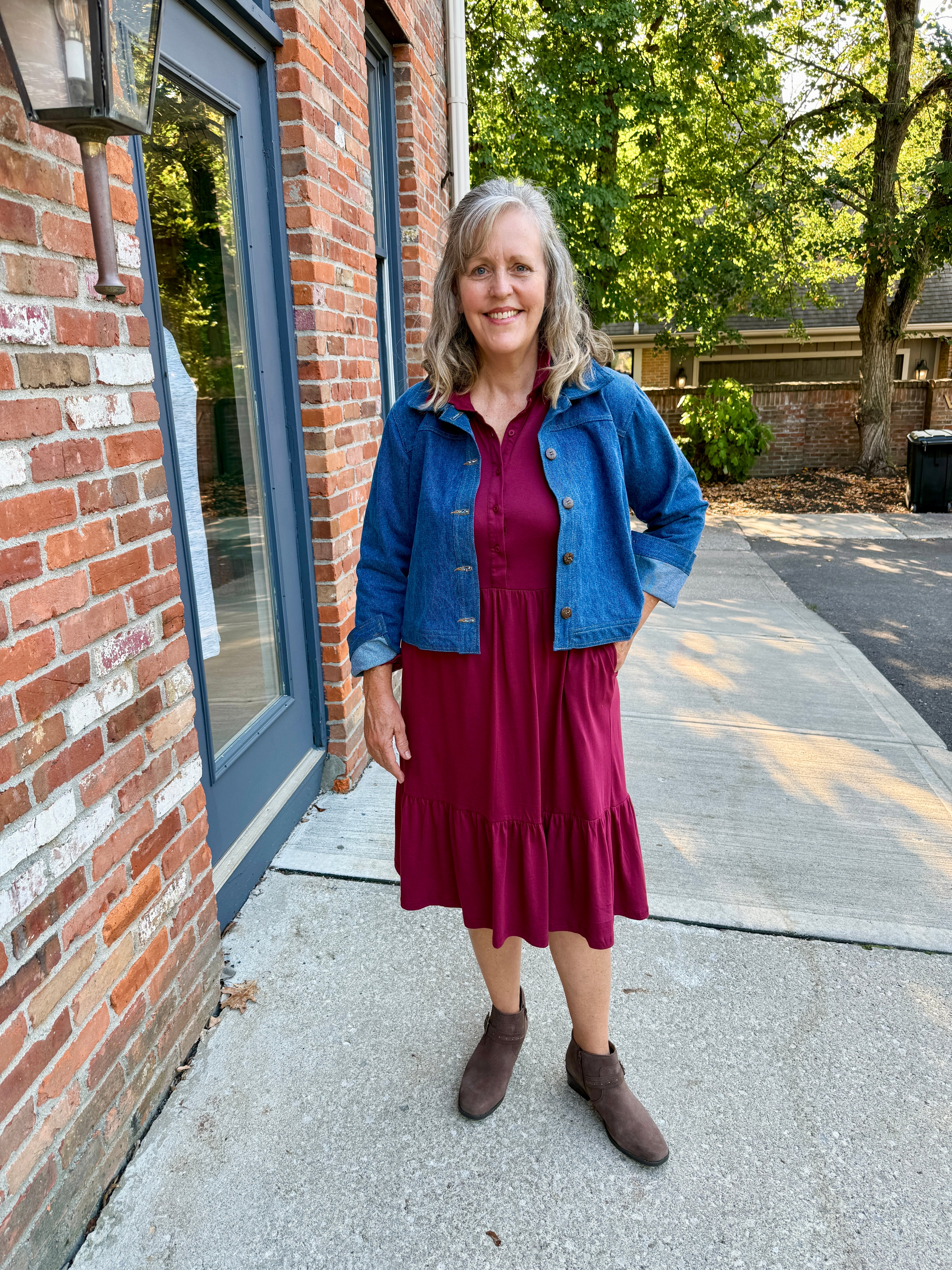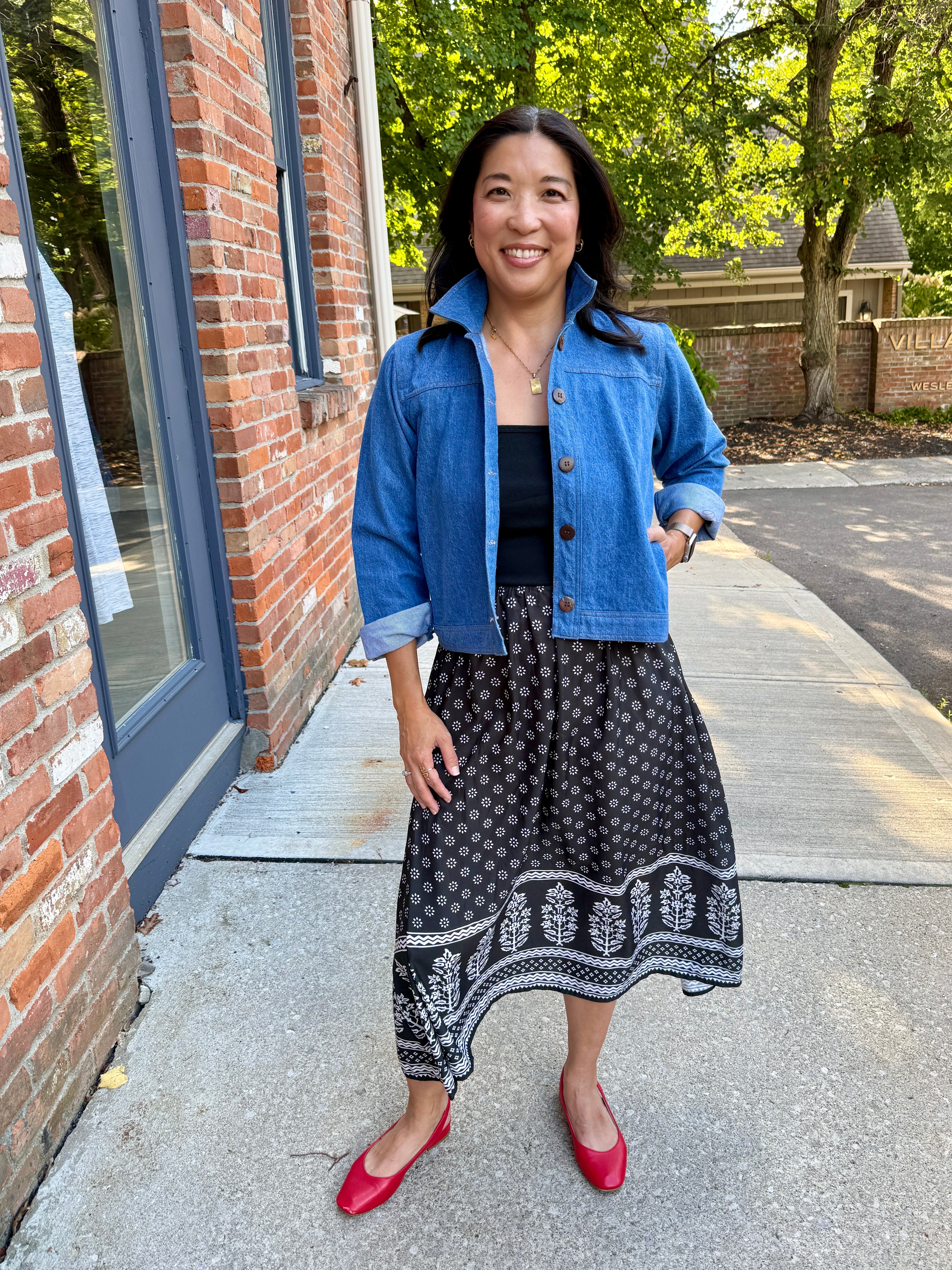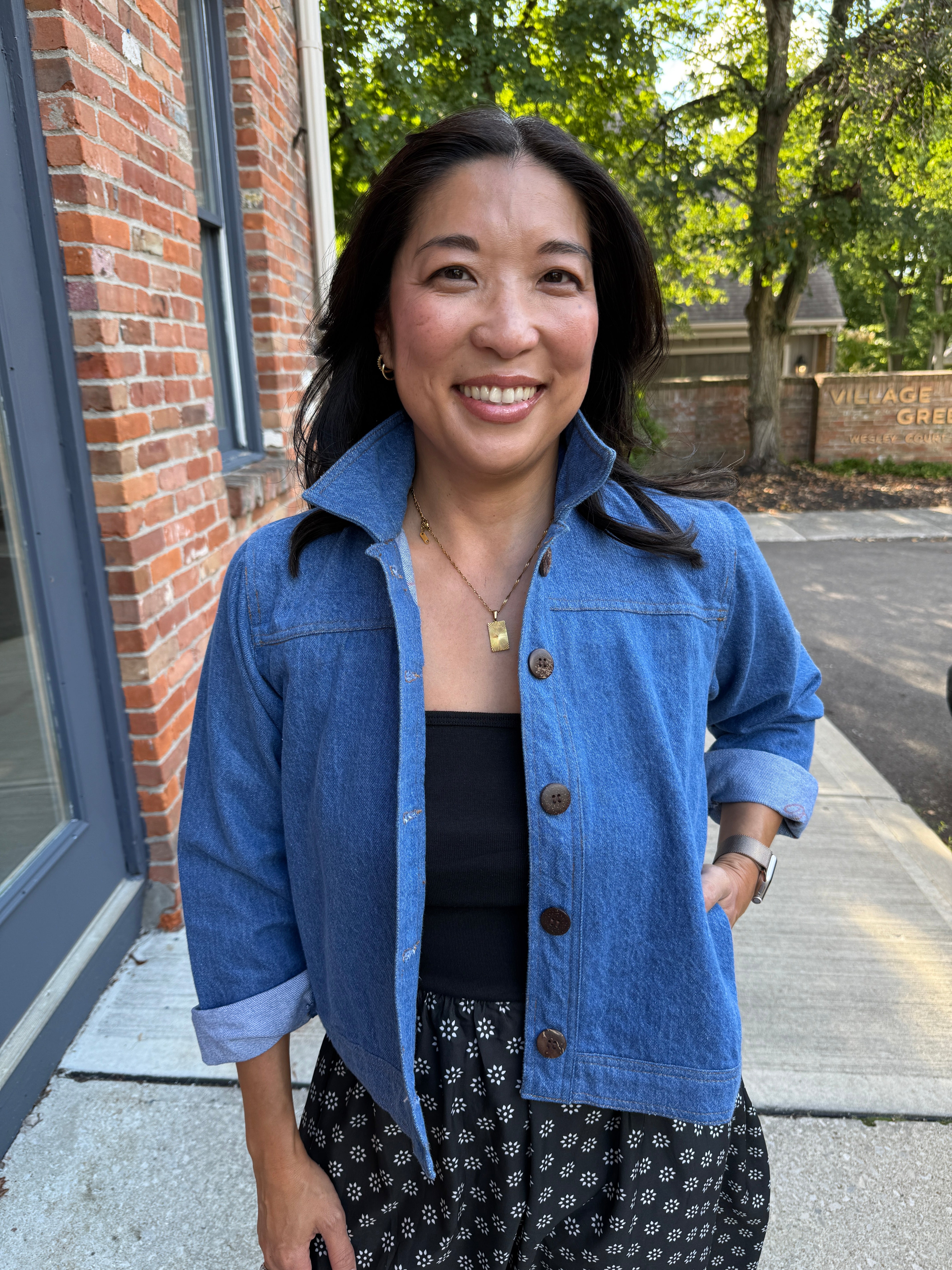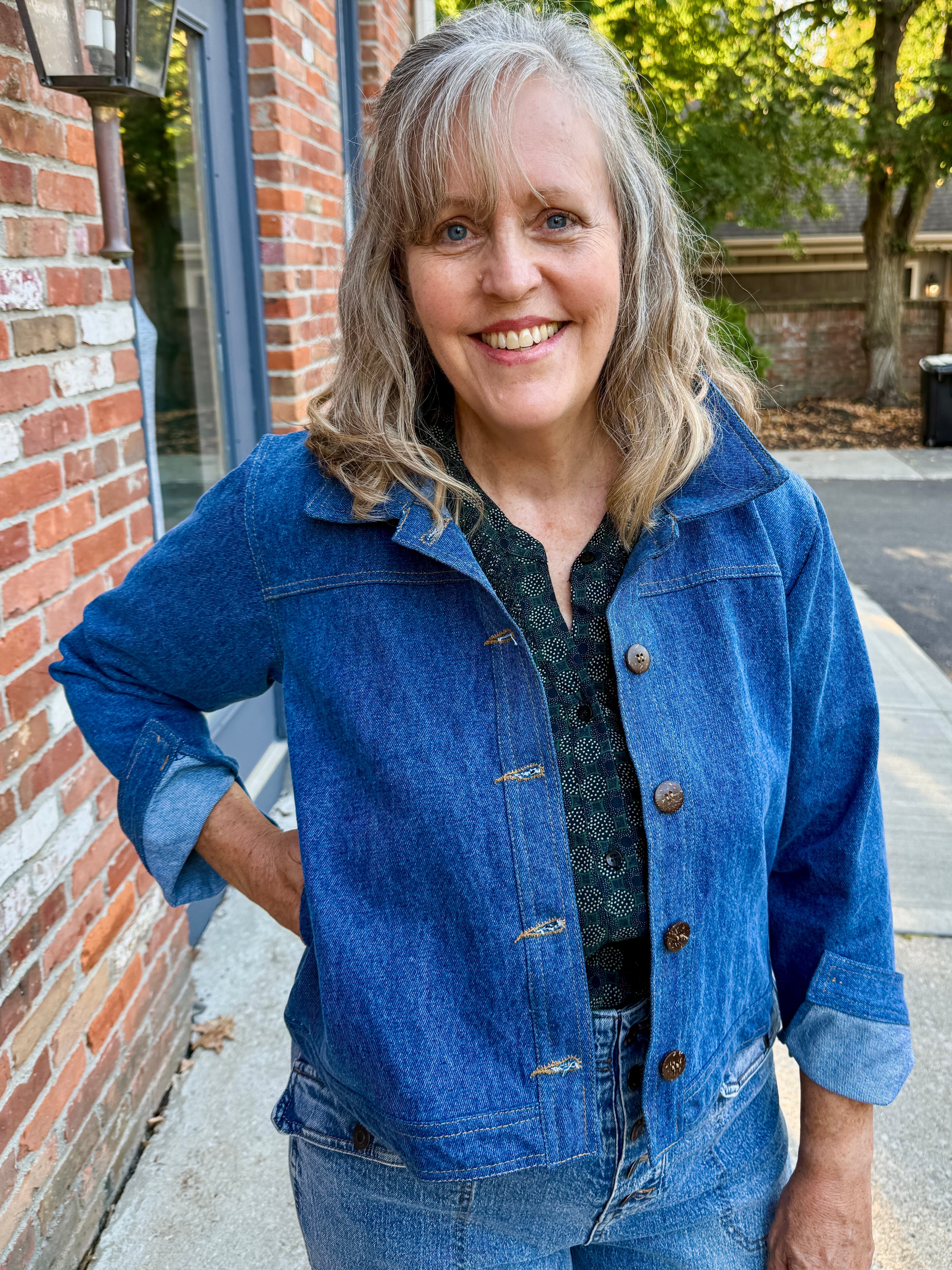 A classic short denim jacket perfect for spring and fall layering. Features retro wood buttons and timeless styling crafted from sustainable surplus denim fabric.