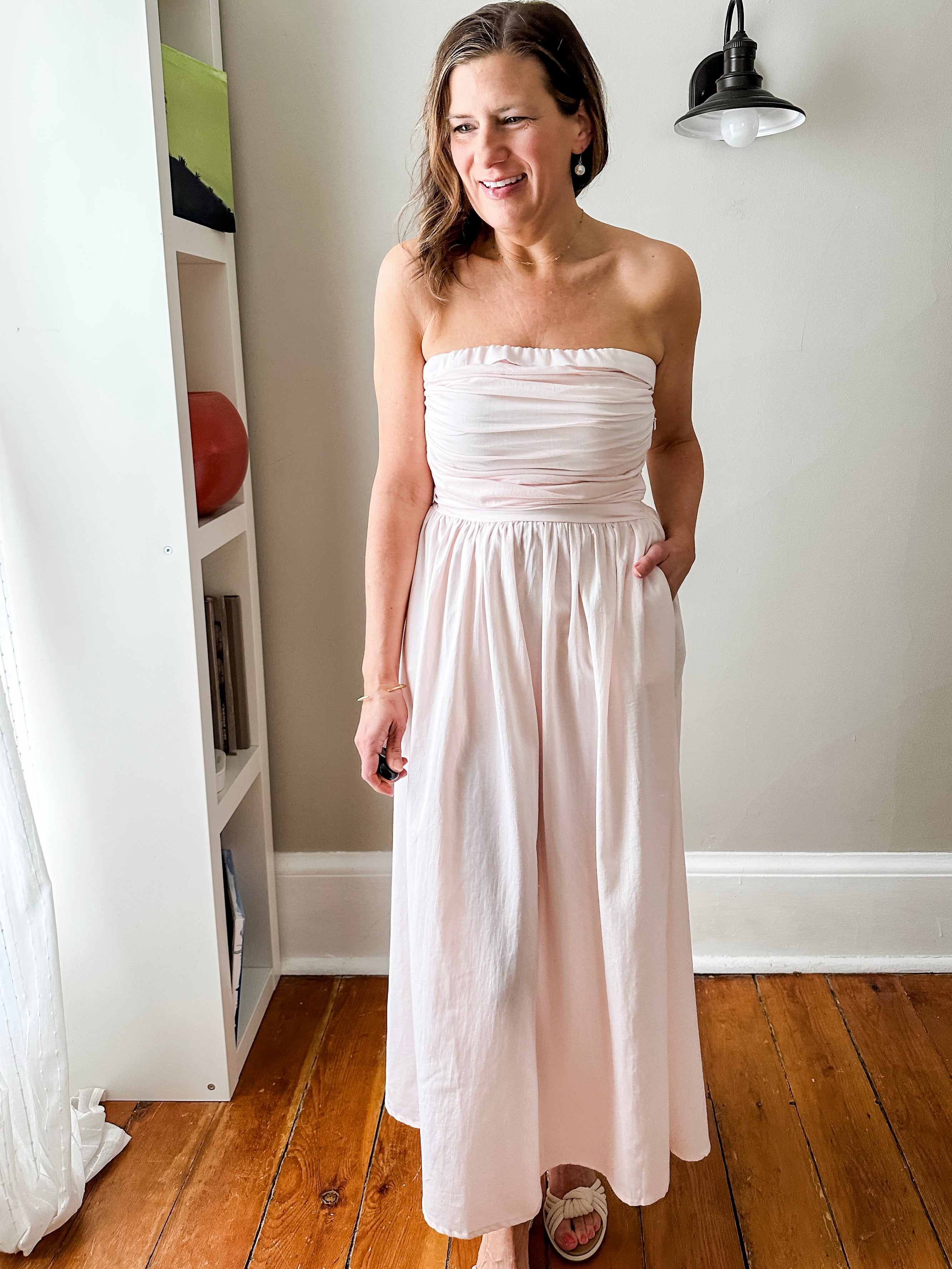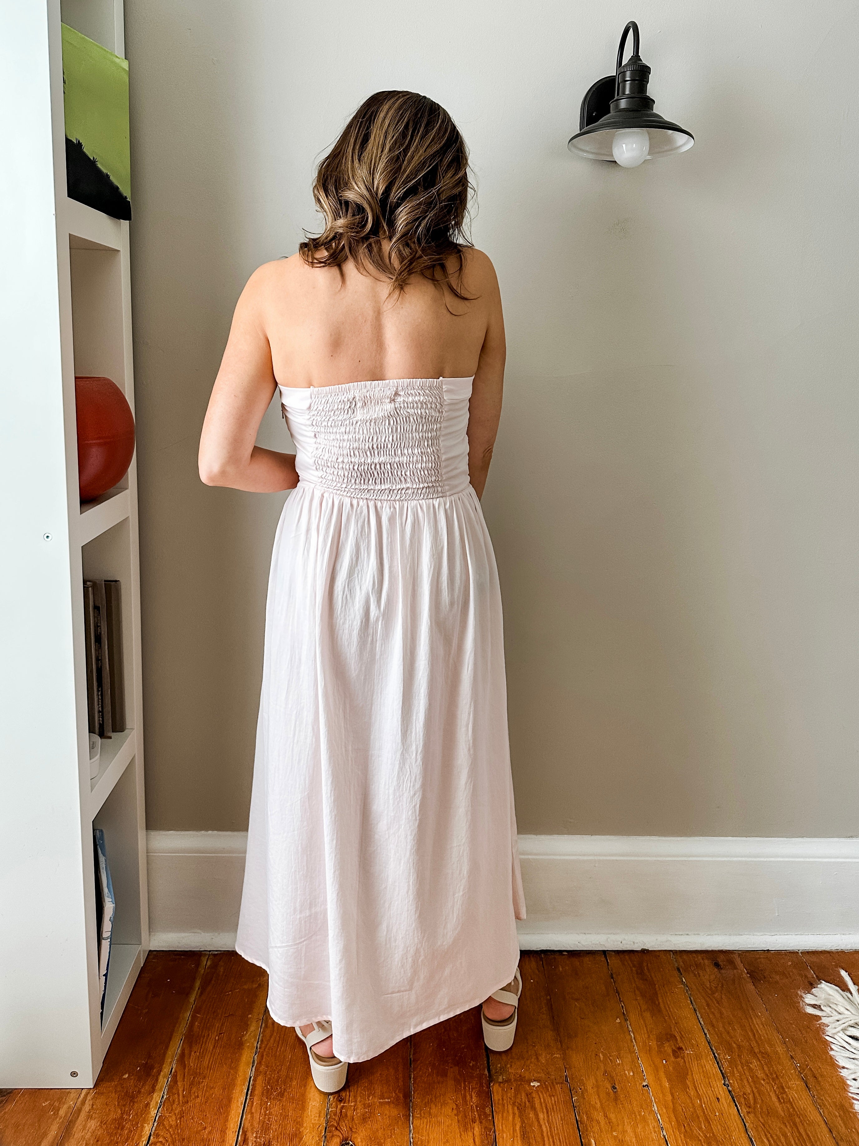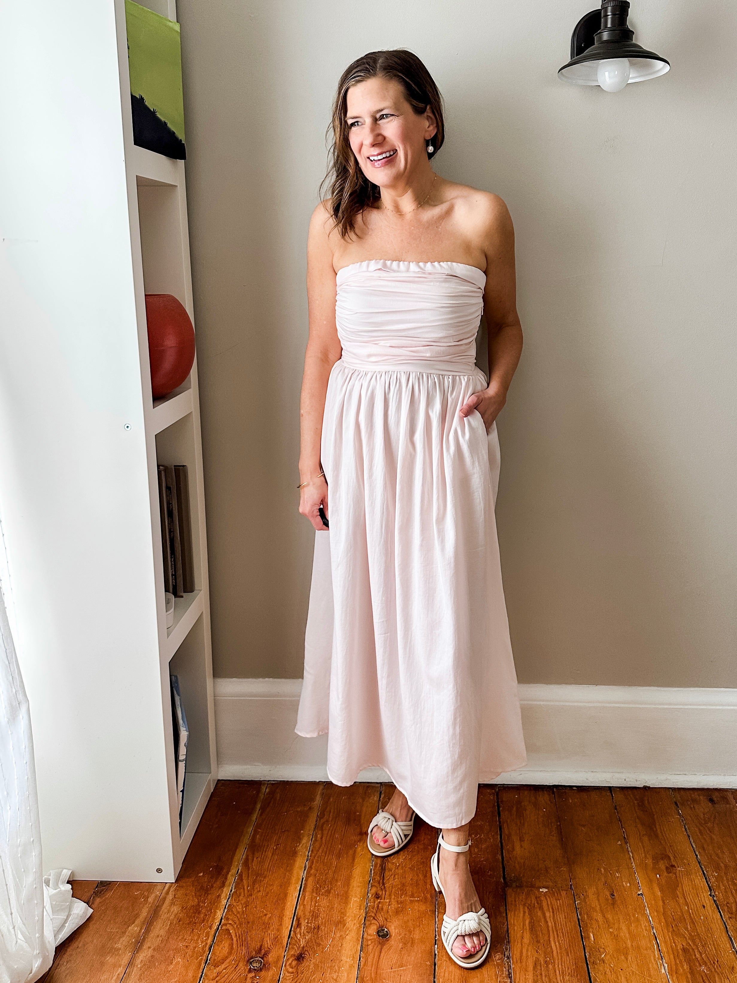 The Mia Strapless Dress effortlessly transitions from afternoon parties to weddings with its timeless silhouette and thoughtful design. From brunch to evening events, this versatile piece adapts to your lifestyle. The straight strapless neckline and gathered skirt create a flattering fit, while French seams and a hidden side zipper ensure quality that lasts.