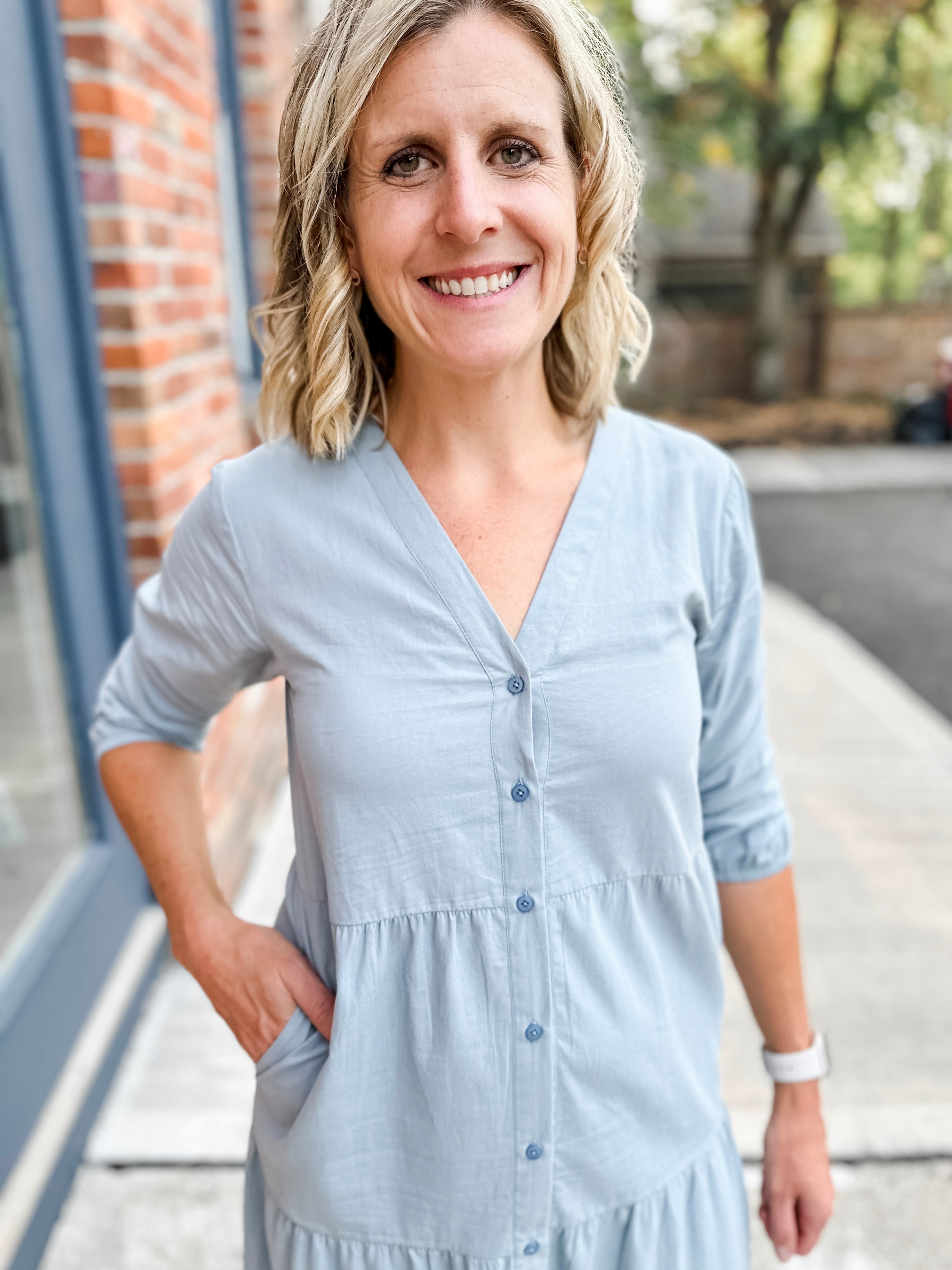 Elevate your everyday style with our Button Front Tiered Dress, a perfect blend of comfort and sophistication. This versatile piece features charming button detailing down the front and a flattering tiered silhouette that creates beautiful movement with every step.