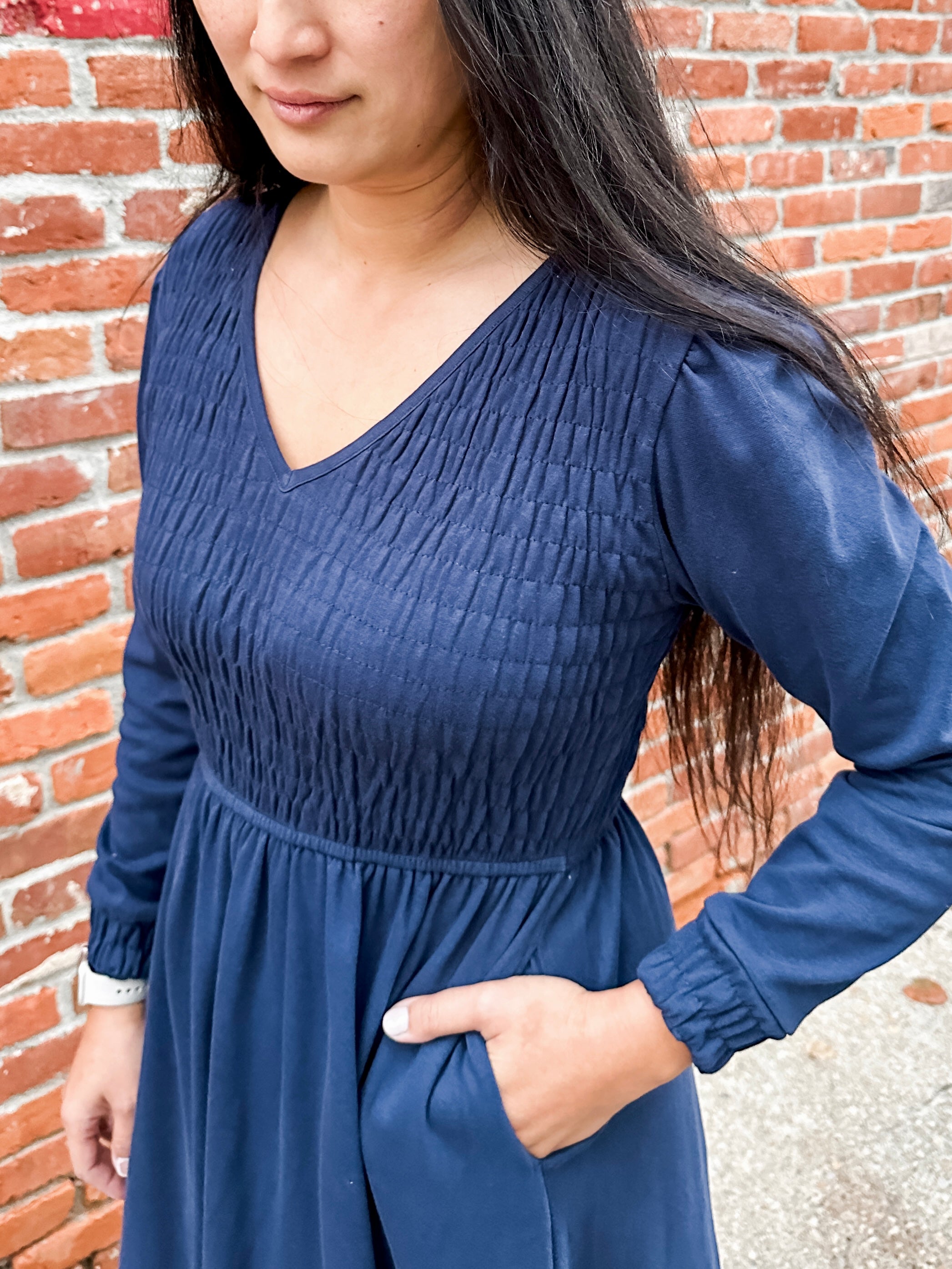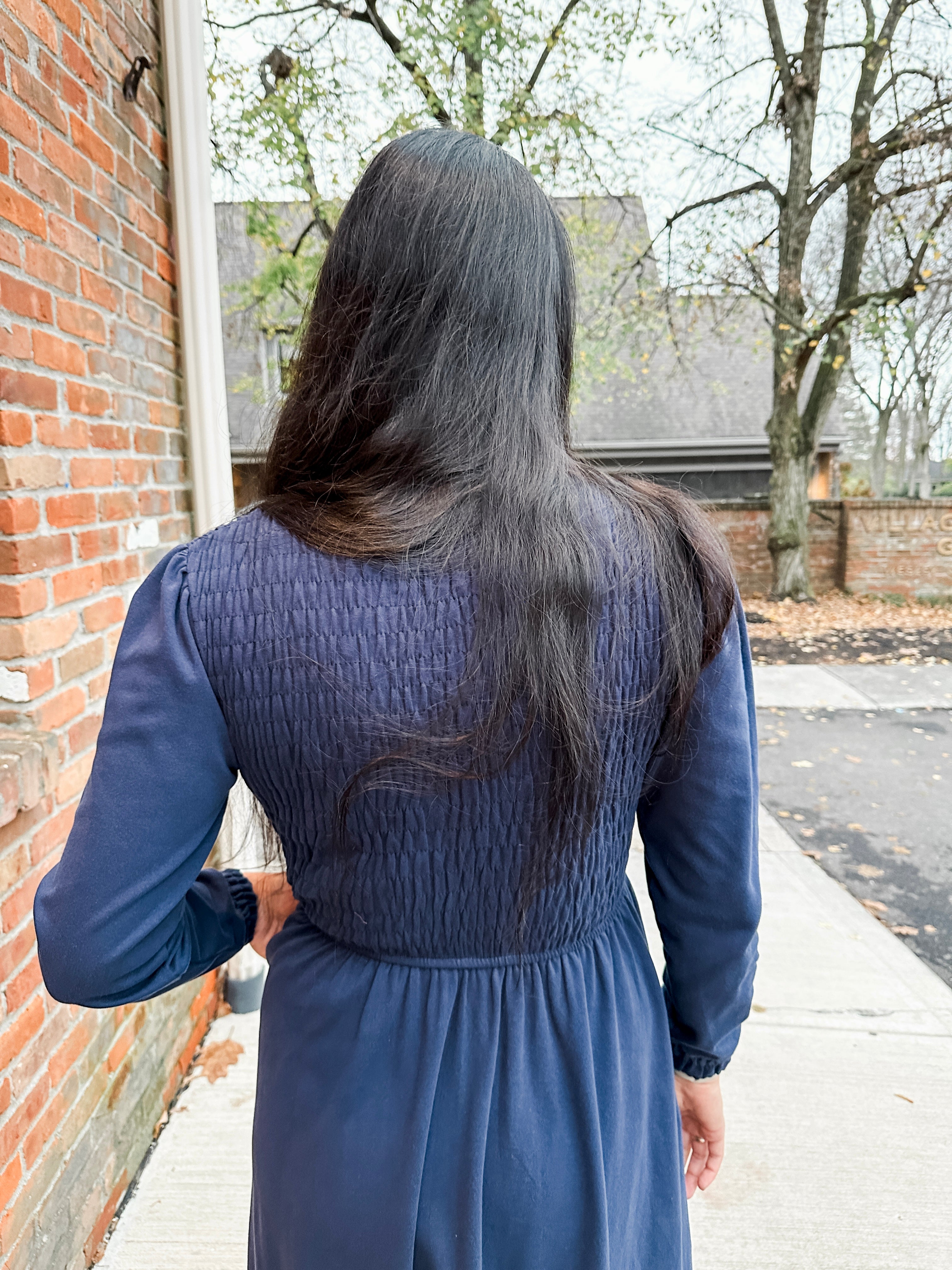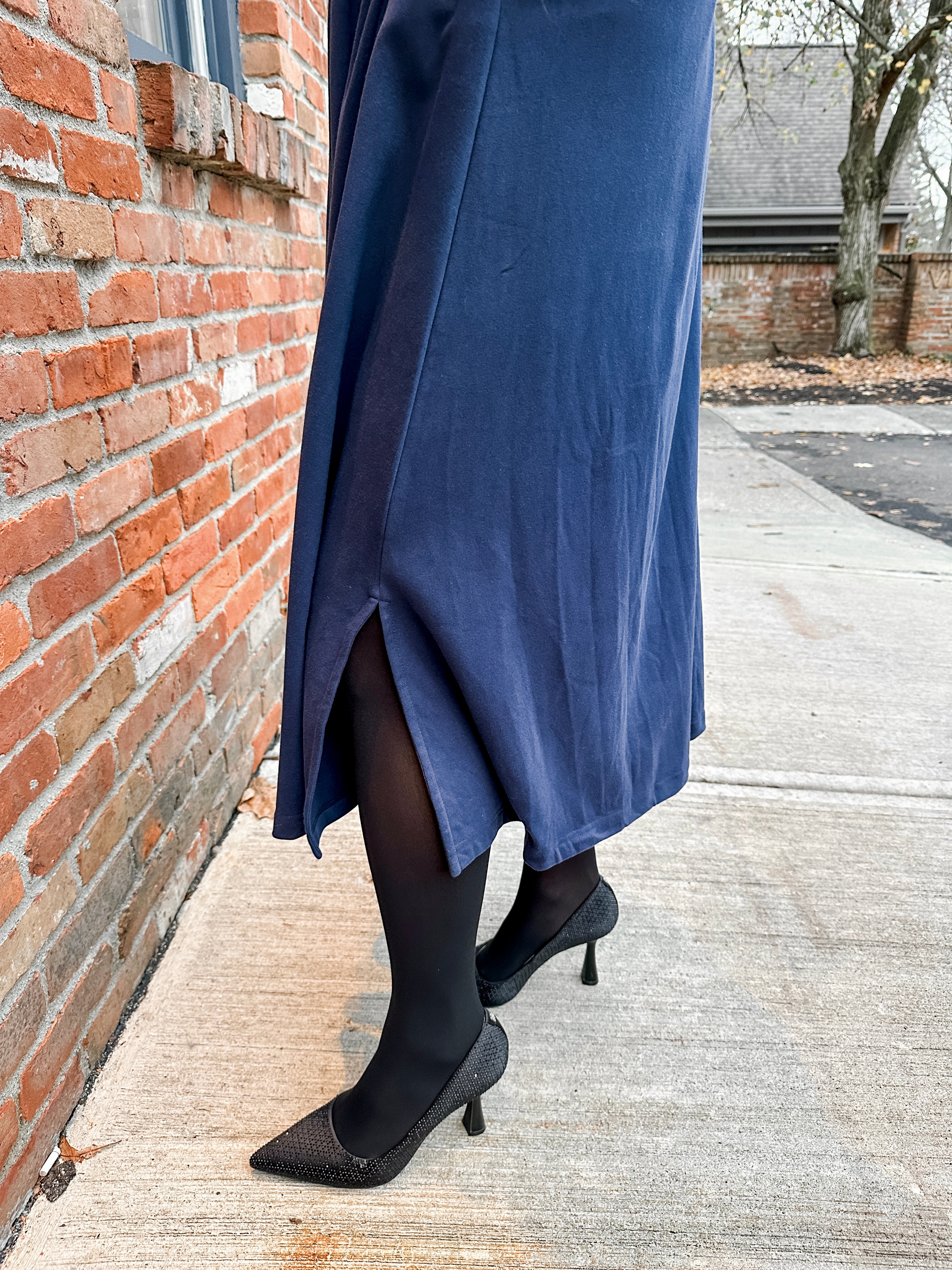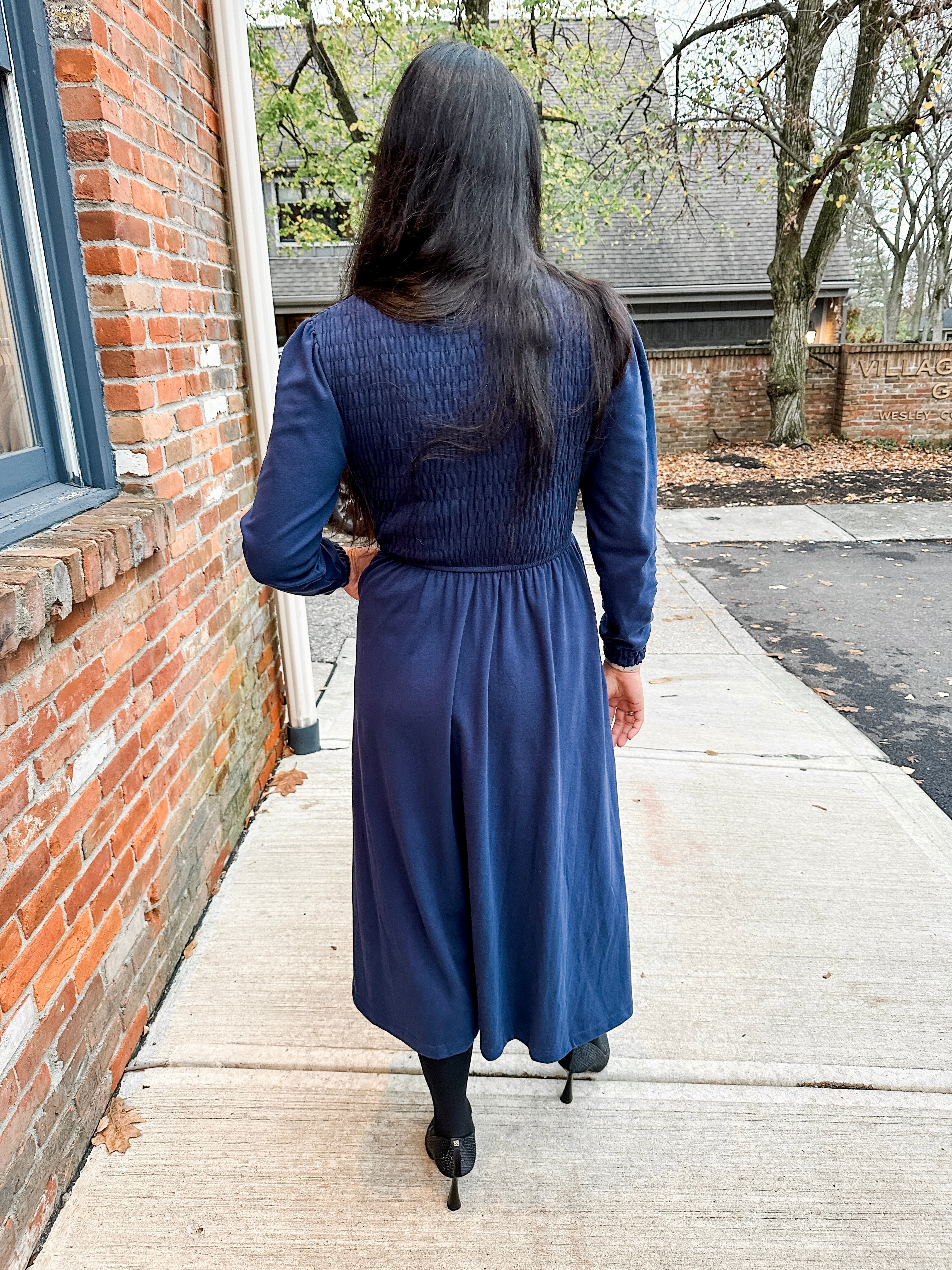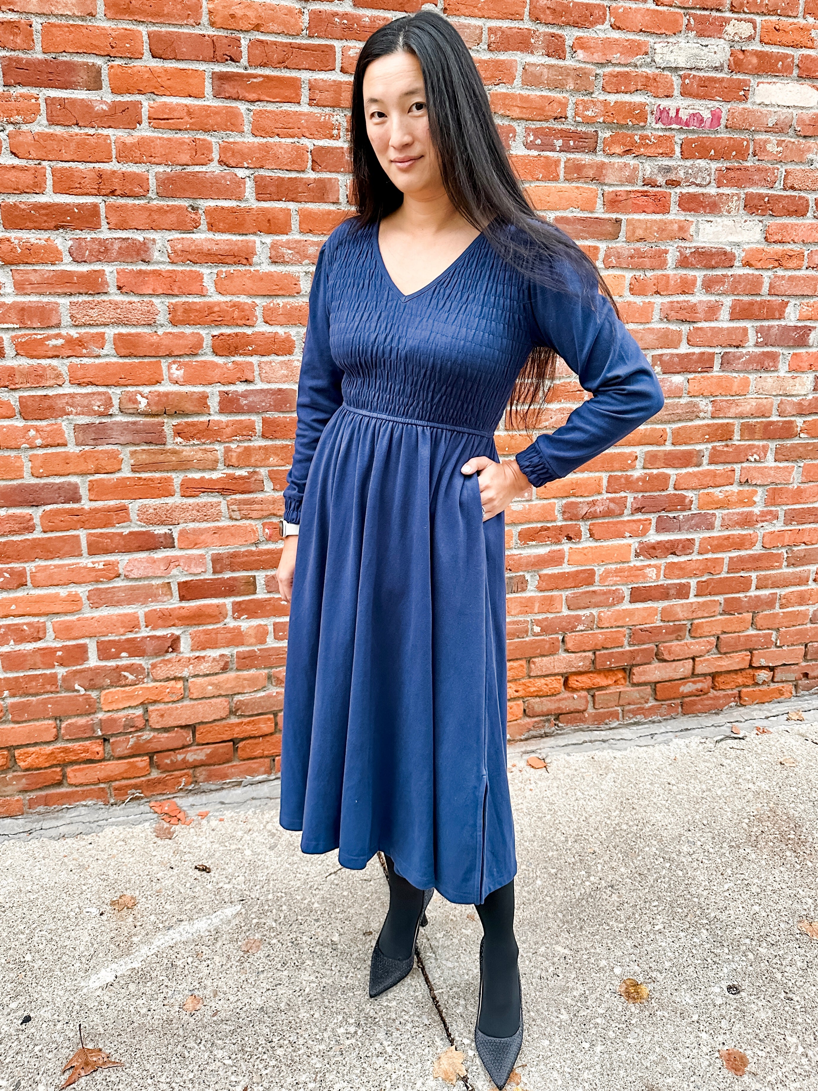 A versatile midi dress perfect for holidays and special occasions. Crafted from sustainable heavy knit cotton surplus fabric.