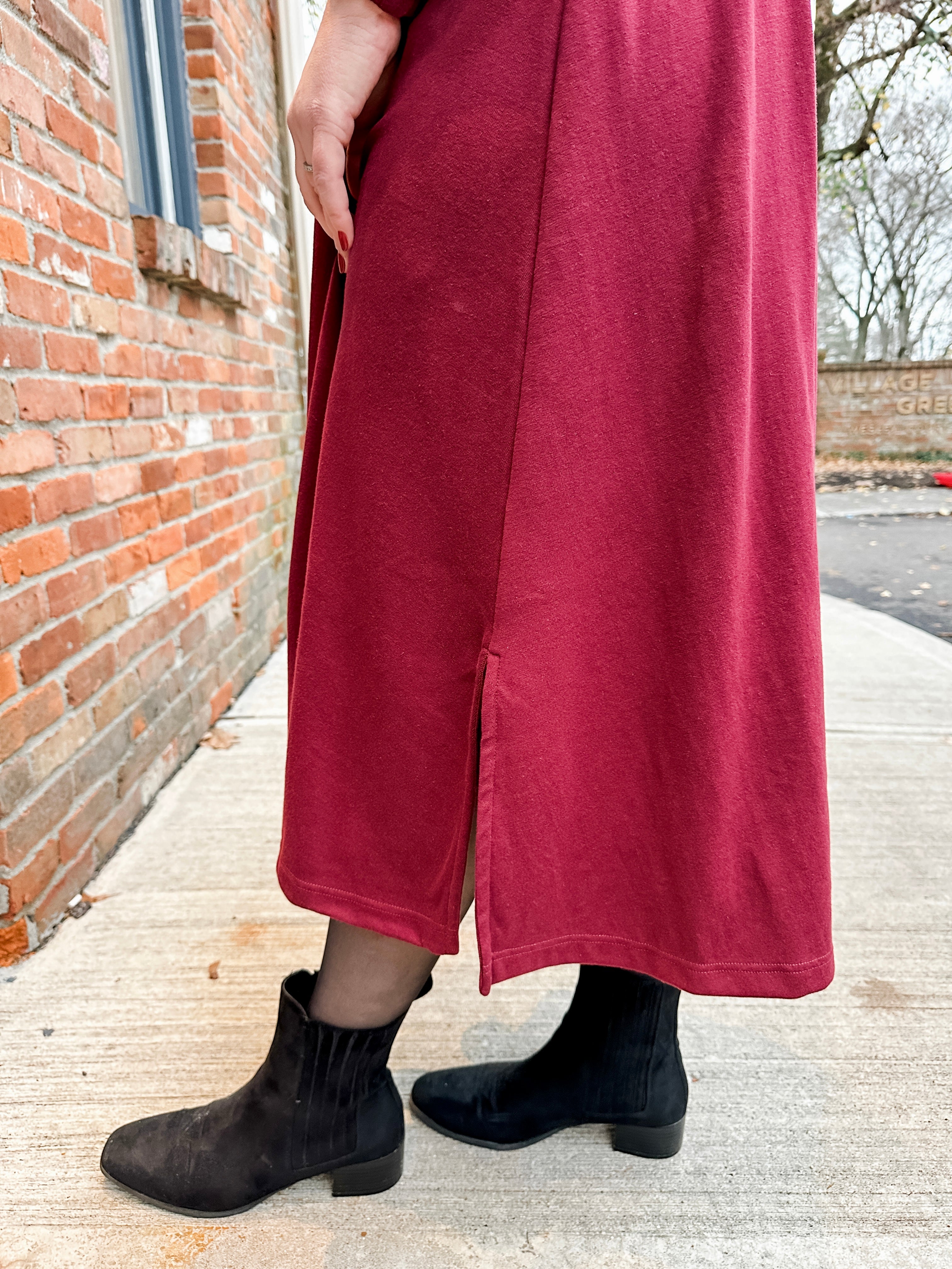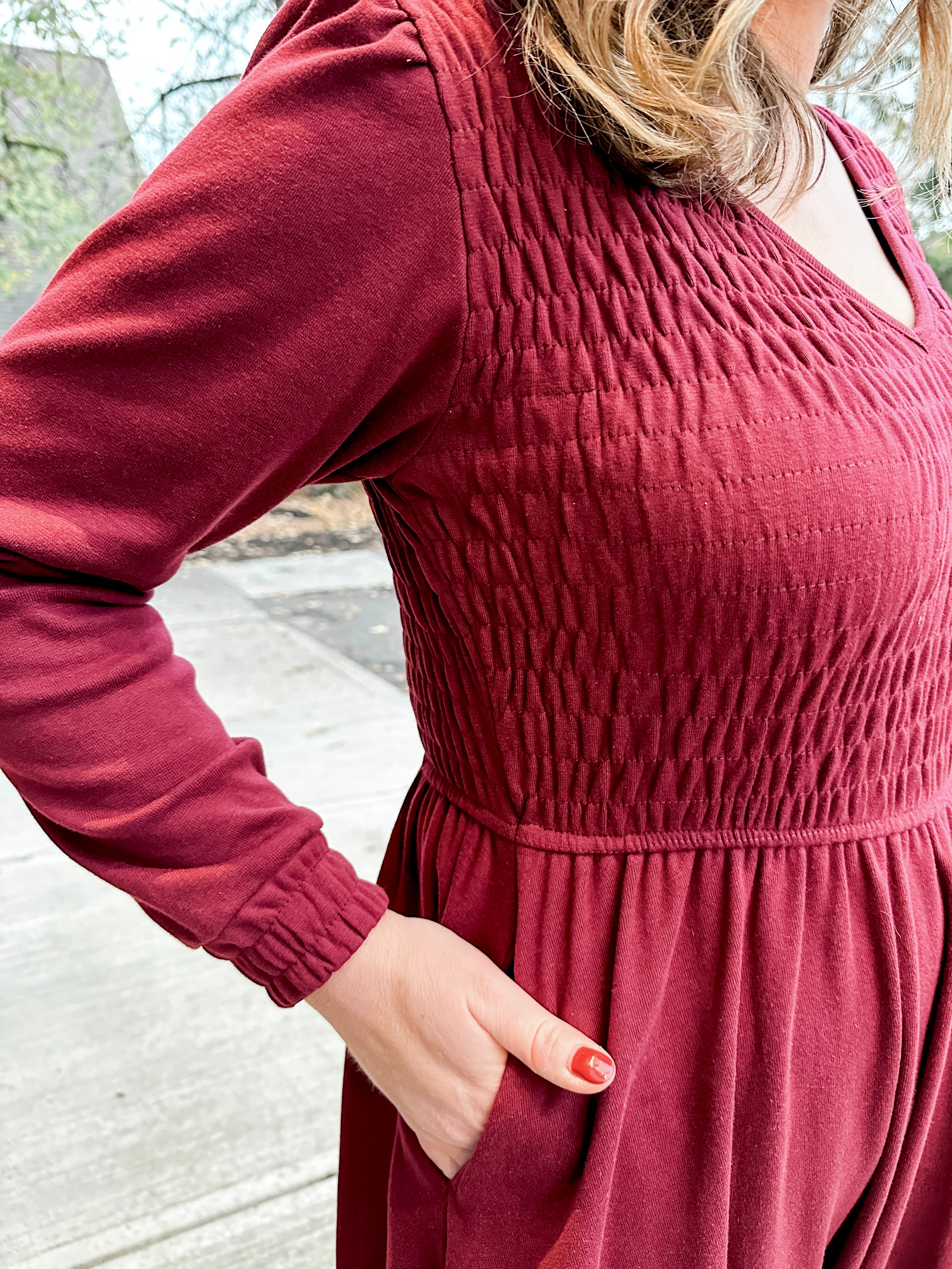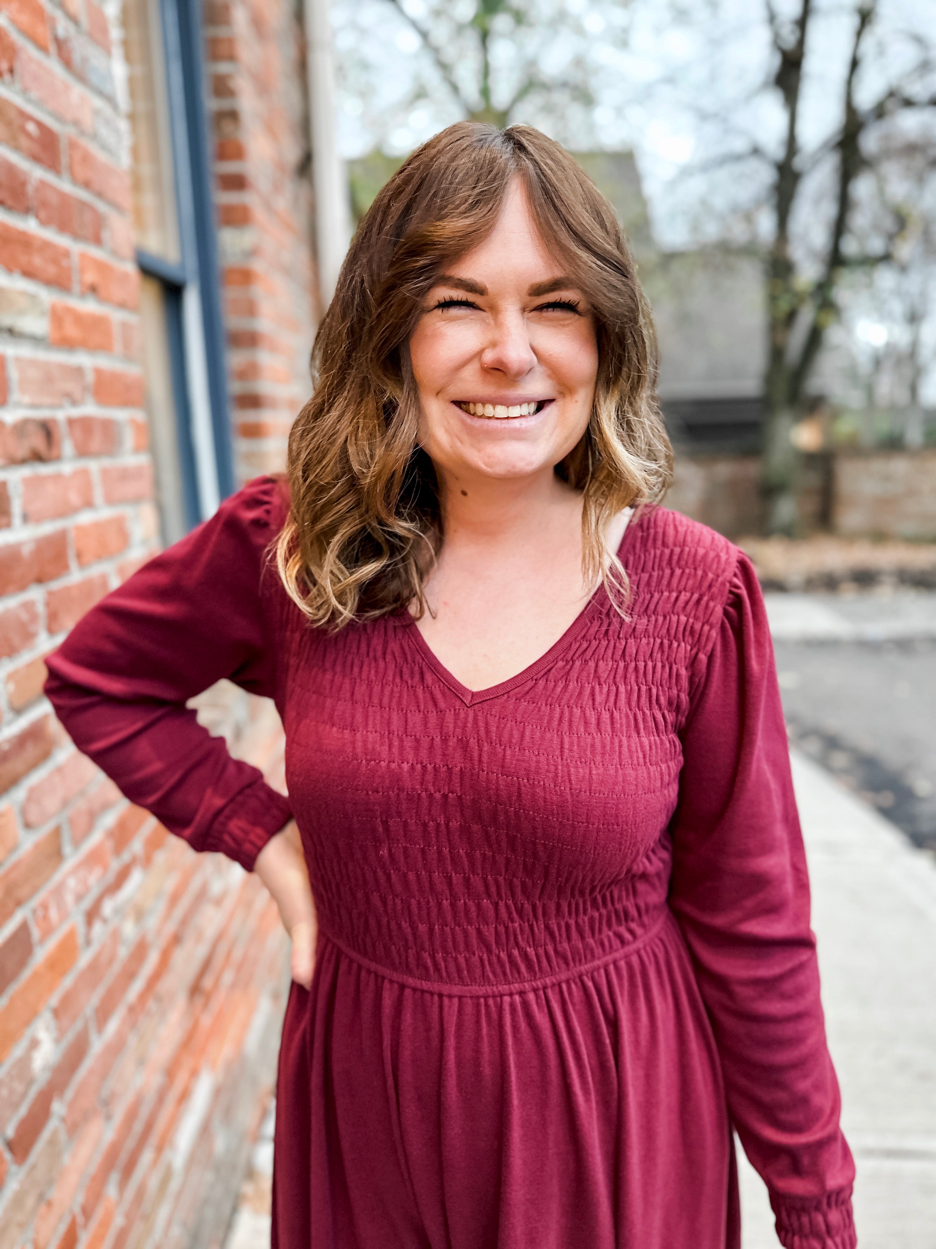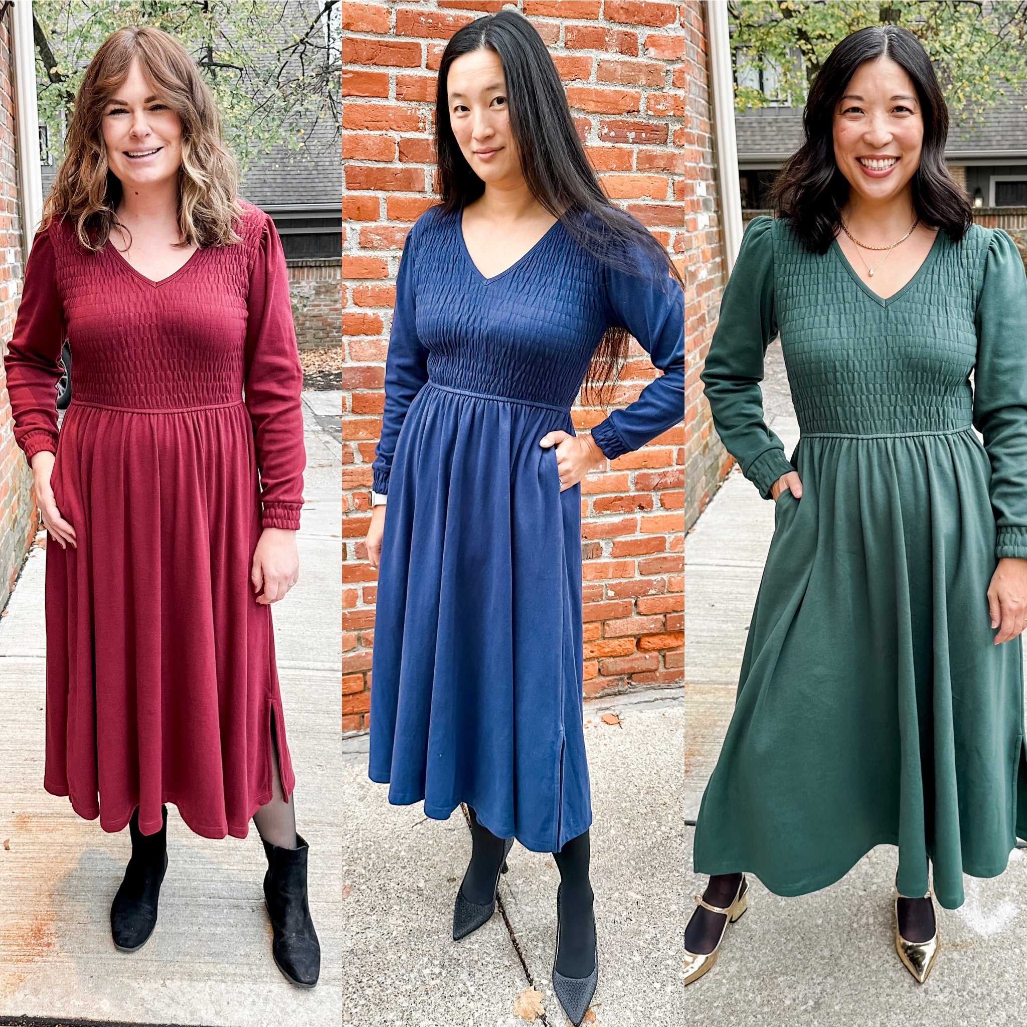 Our Joy Dress is a versatile smocked midi dress perfect for holidays and special occasions. Featuring a flattering v-neckline and mid-length silhouette, this sustainable piece is crafted from heavy knit cotton surplus fabrics.