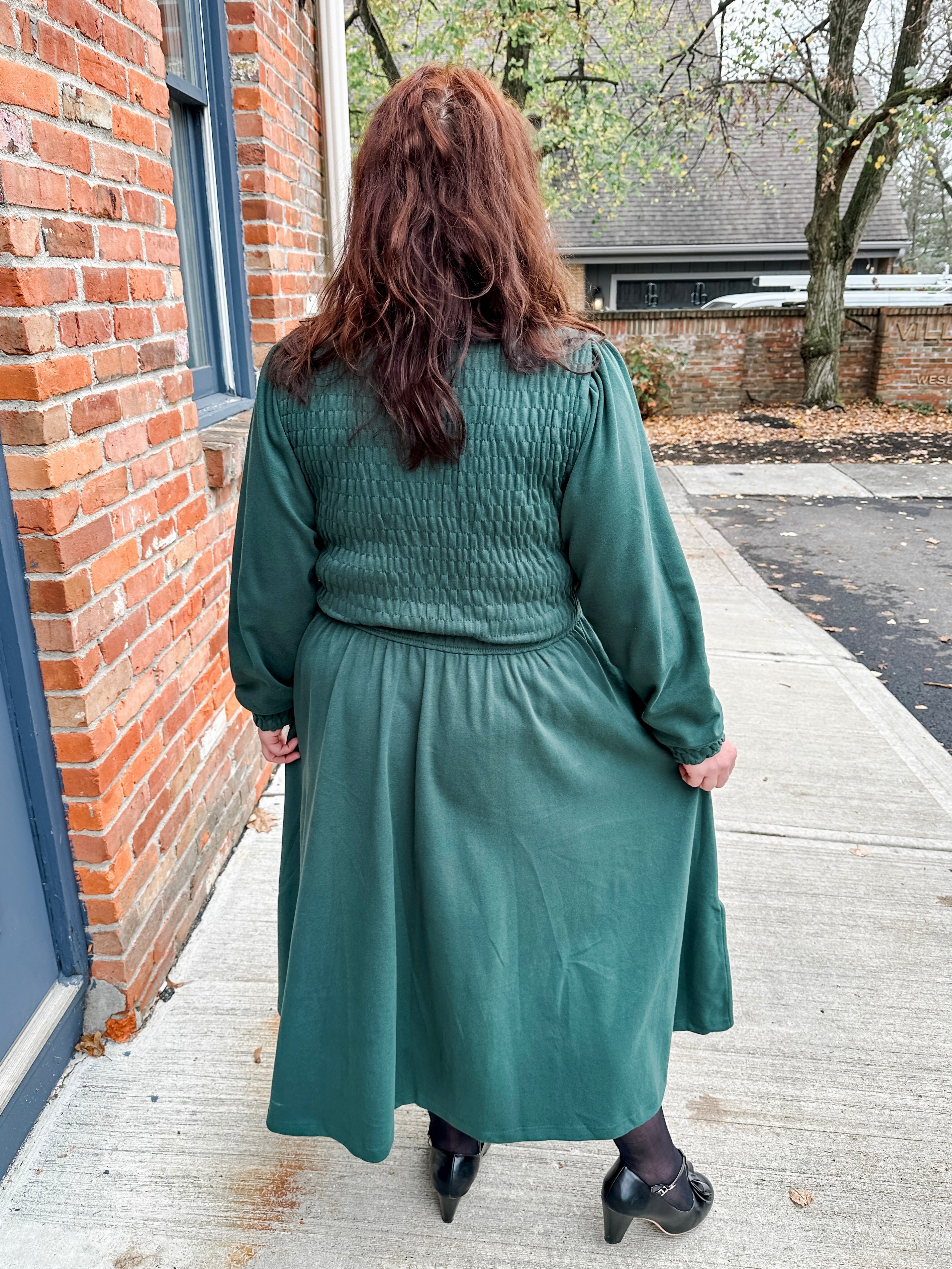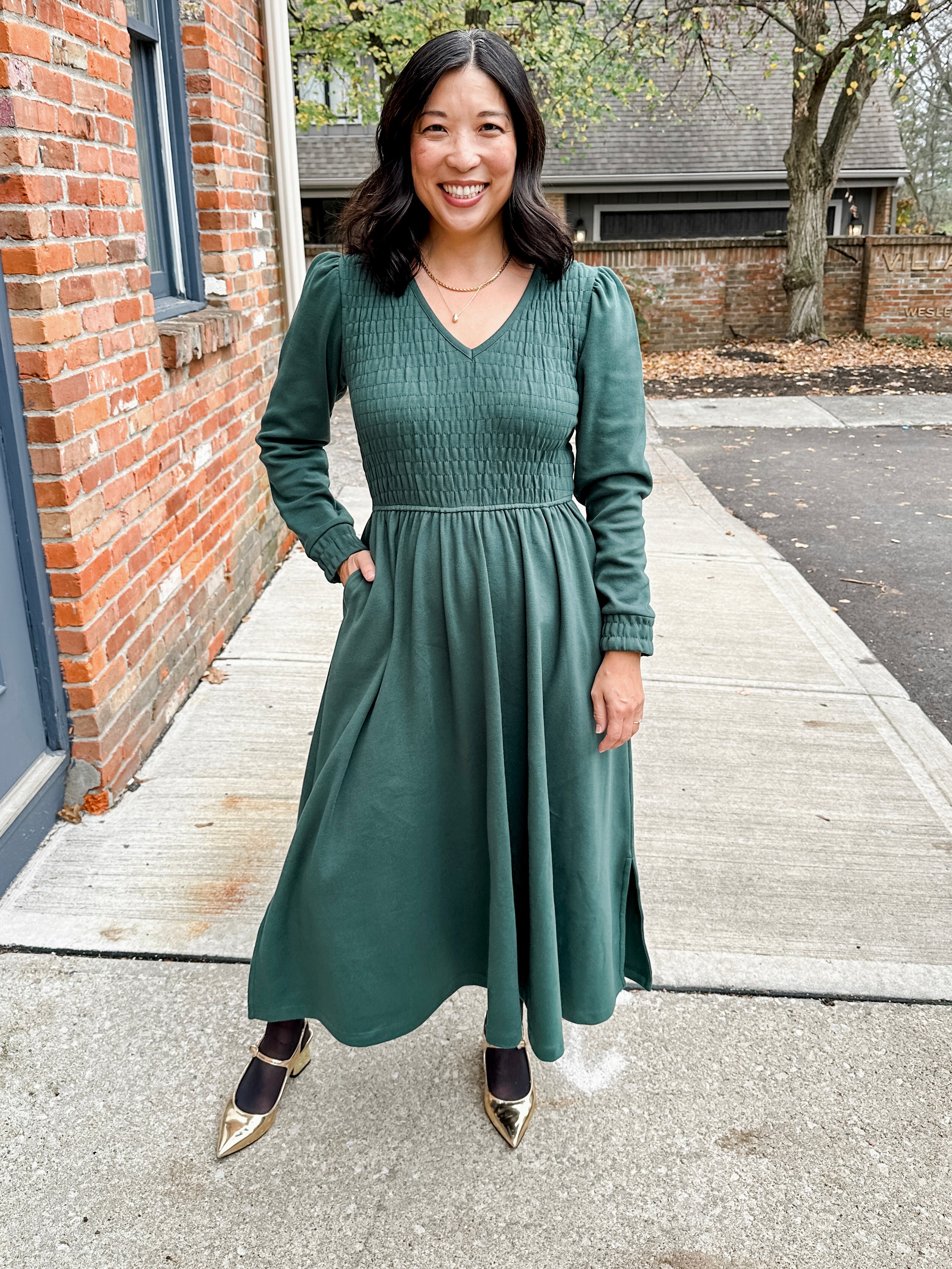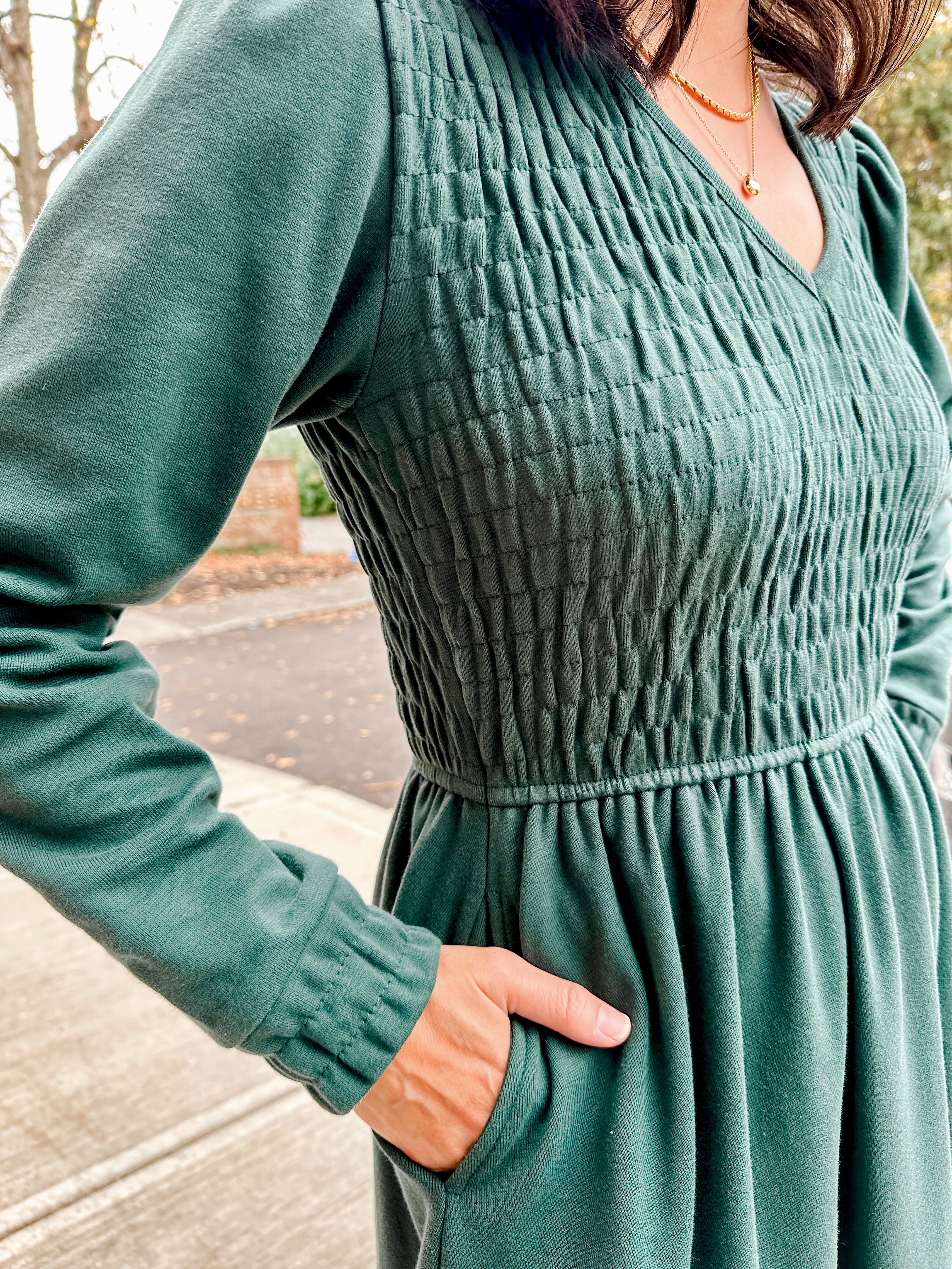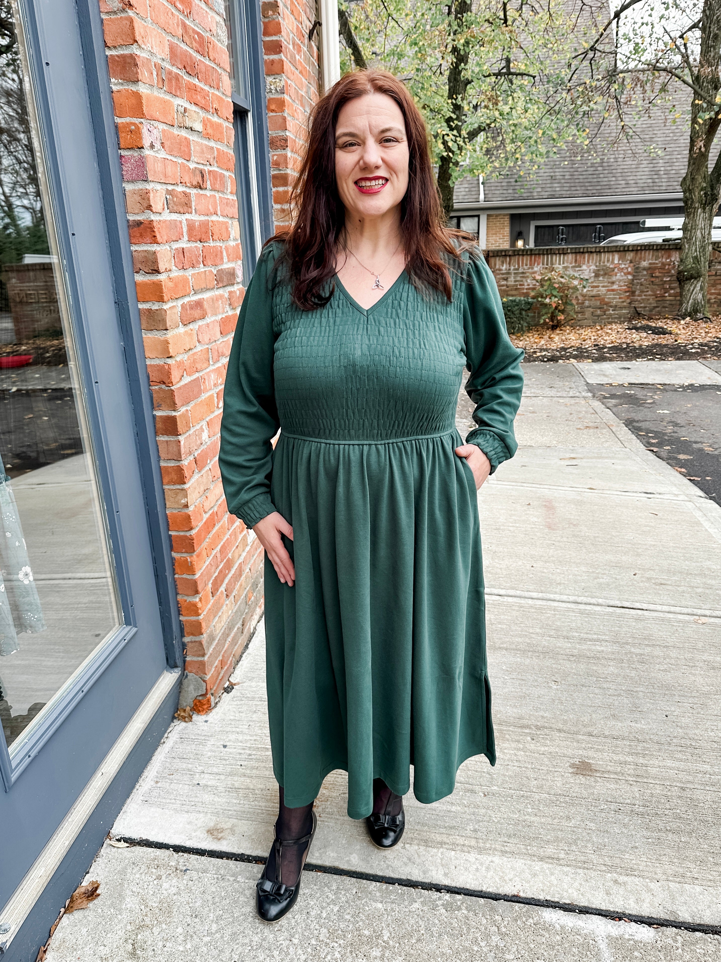 Elegant smocked midi dress crafted from sustainable heavy knit cotton surplus fabrics. Features a flattering V-neckline, long sleeves, and convenient pockets. Perfect for holidays and special occasions.
