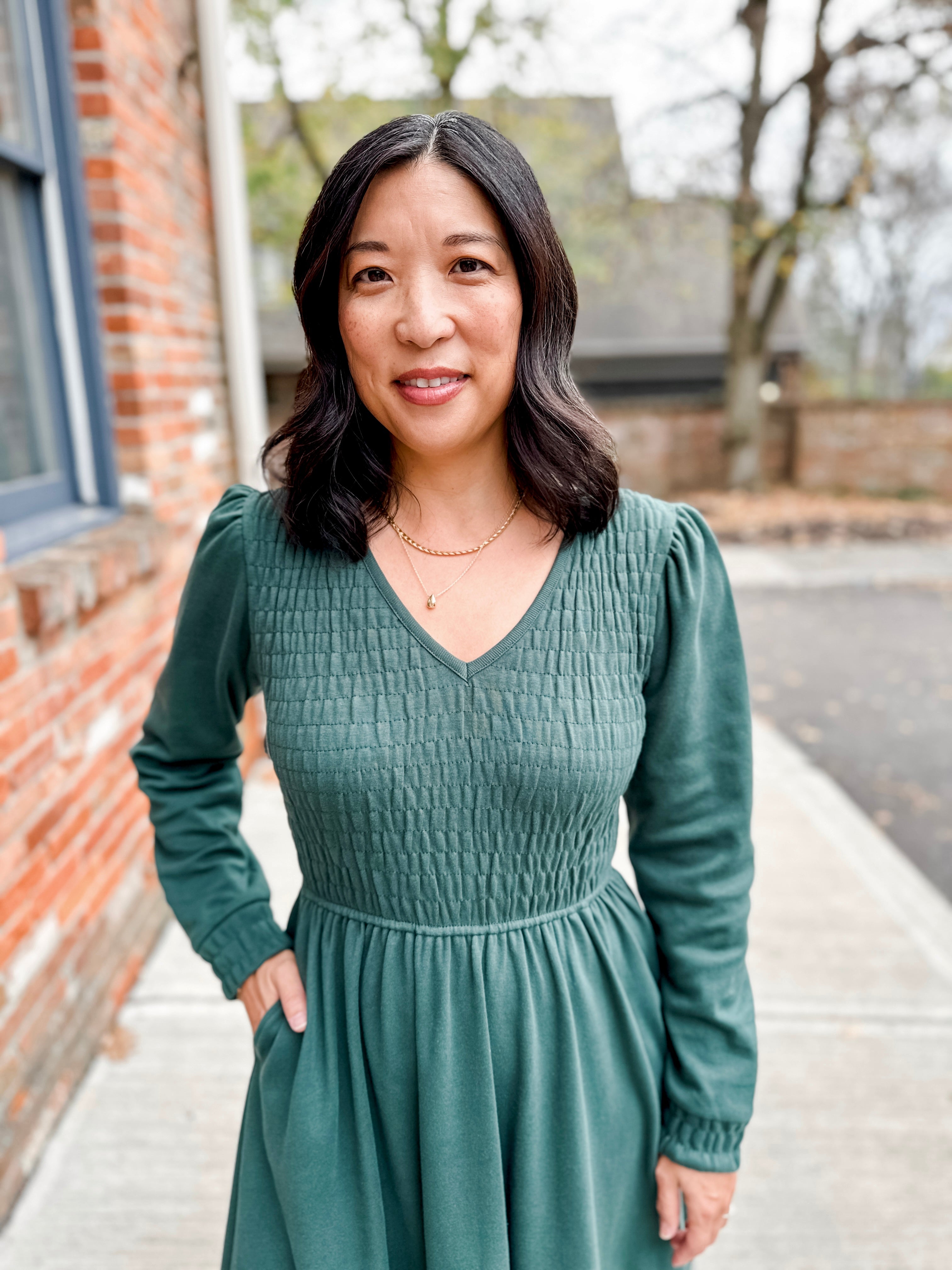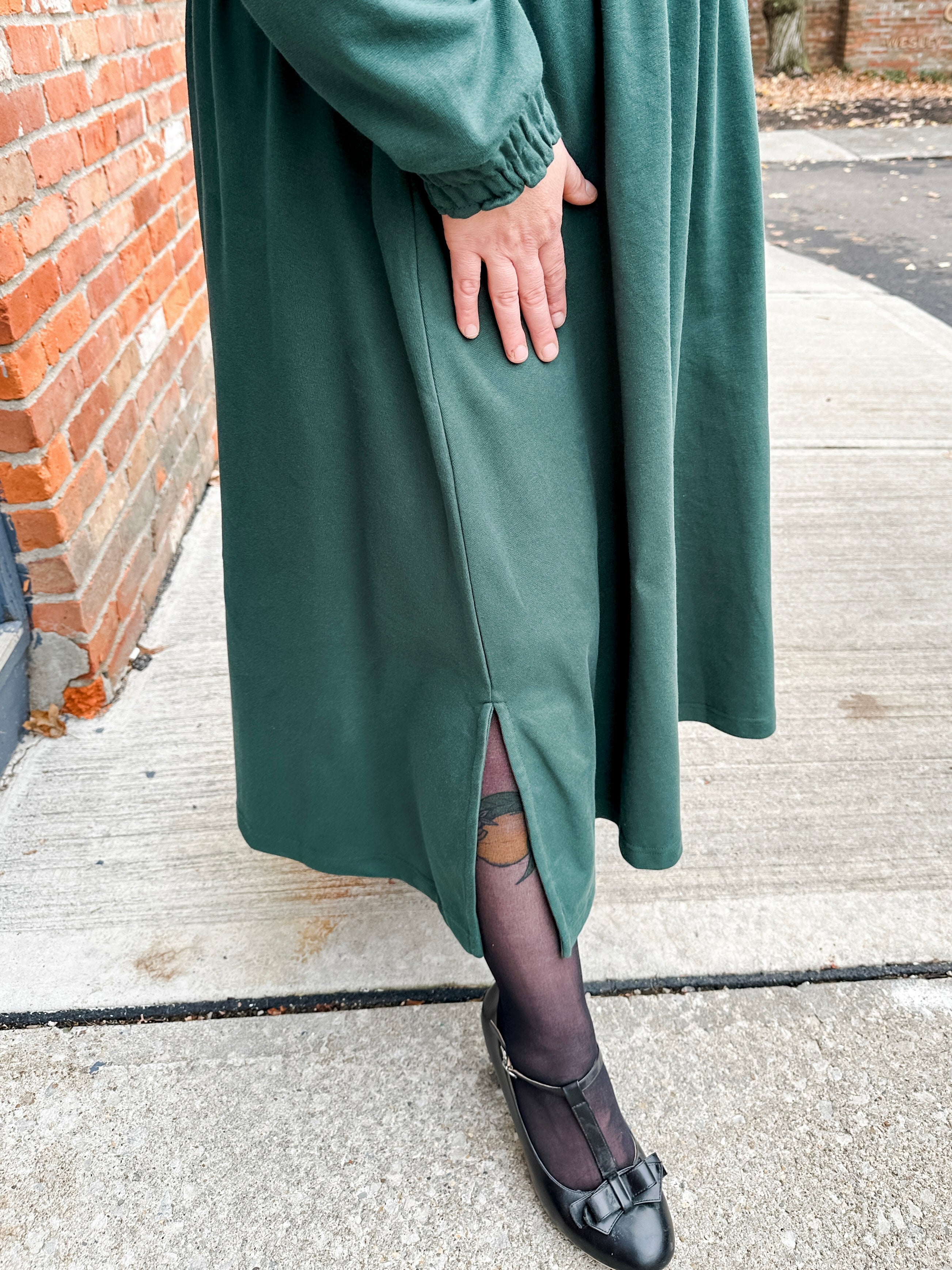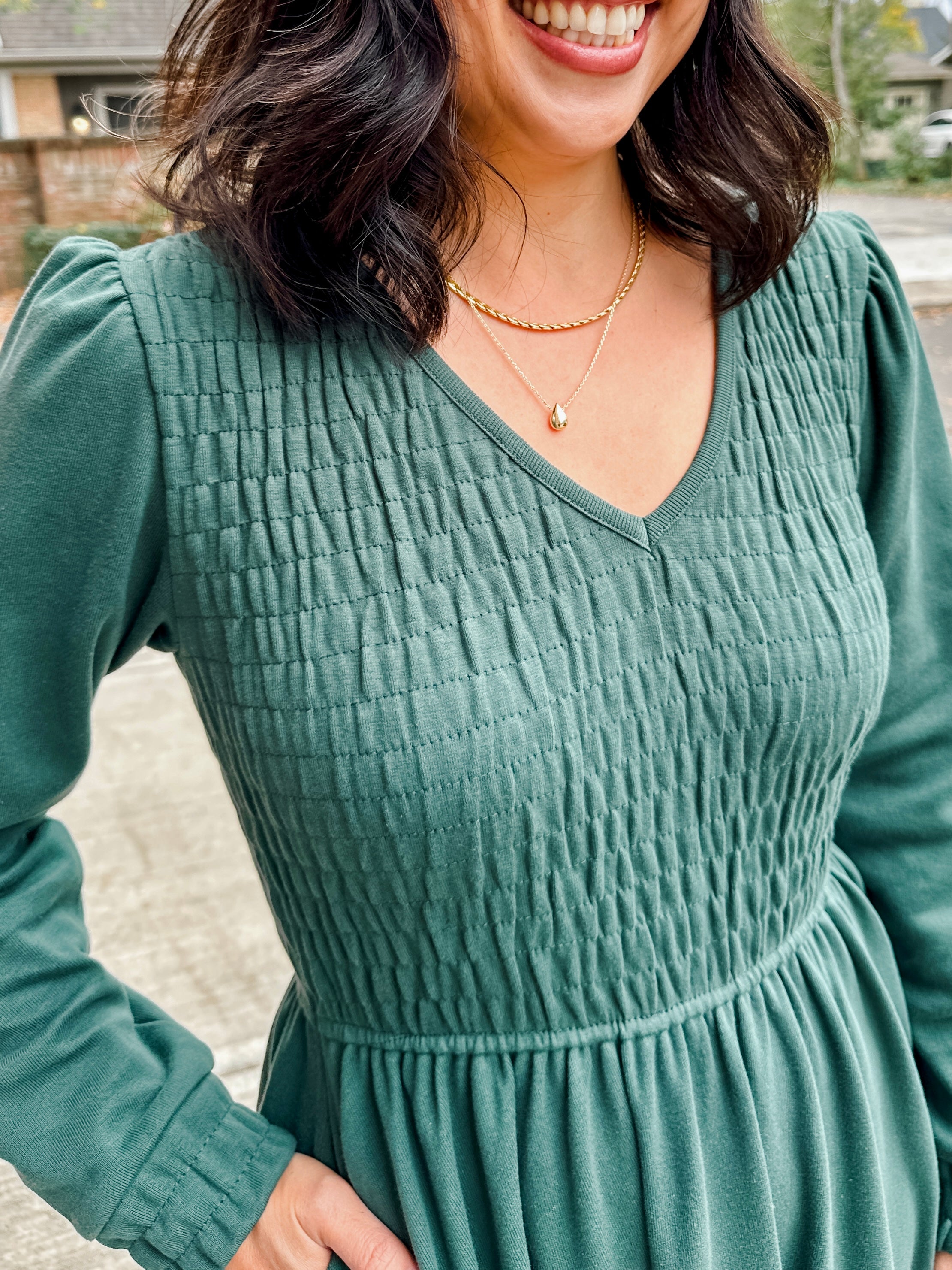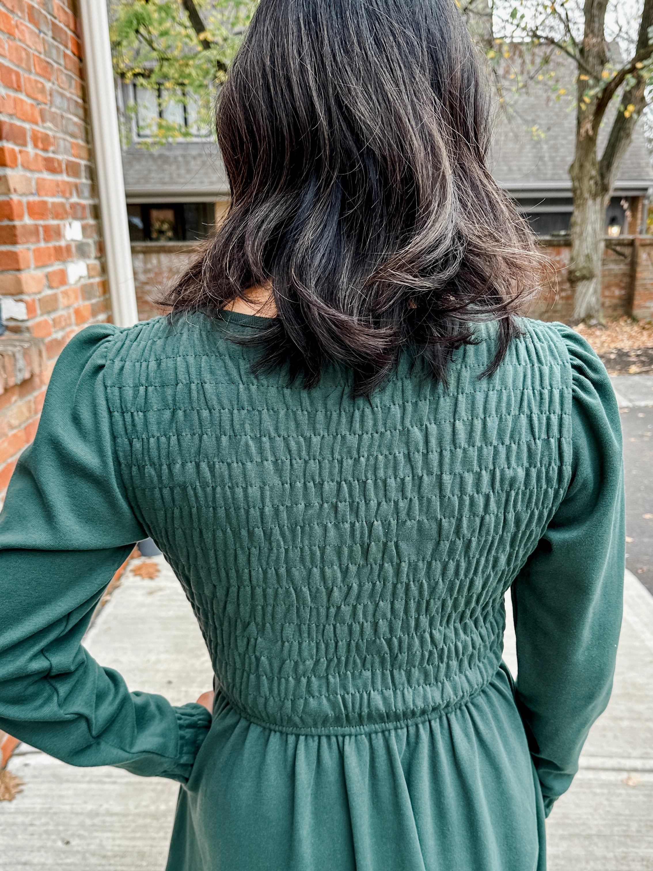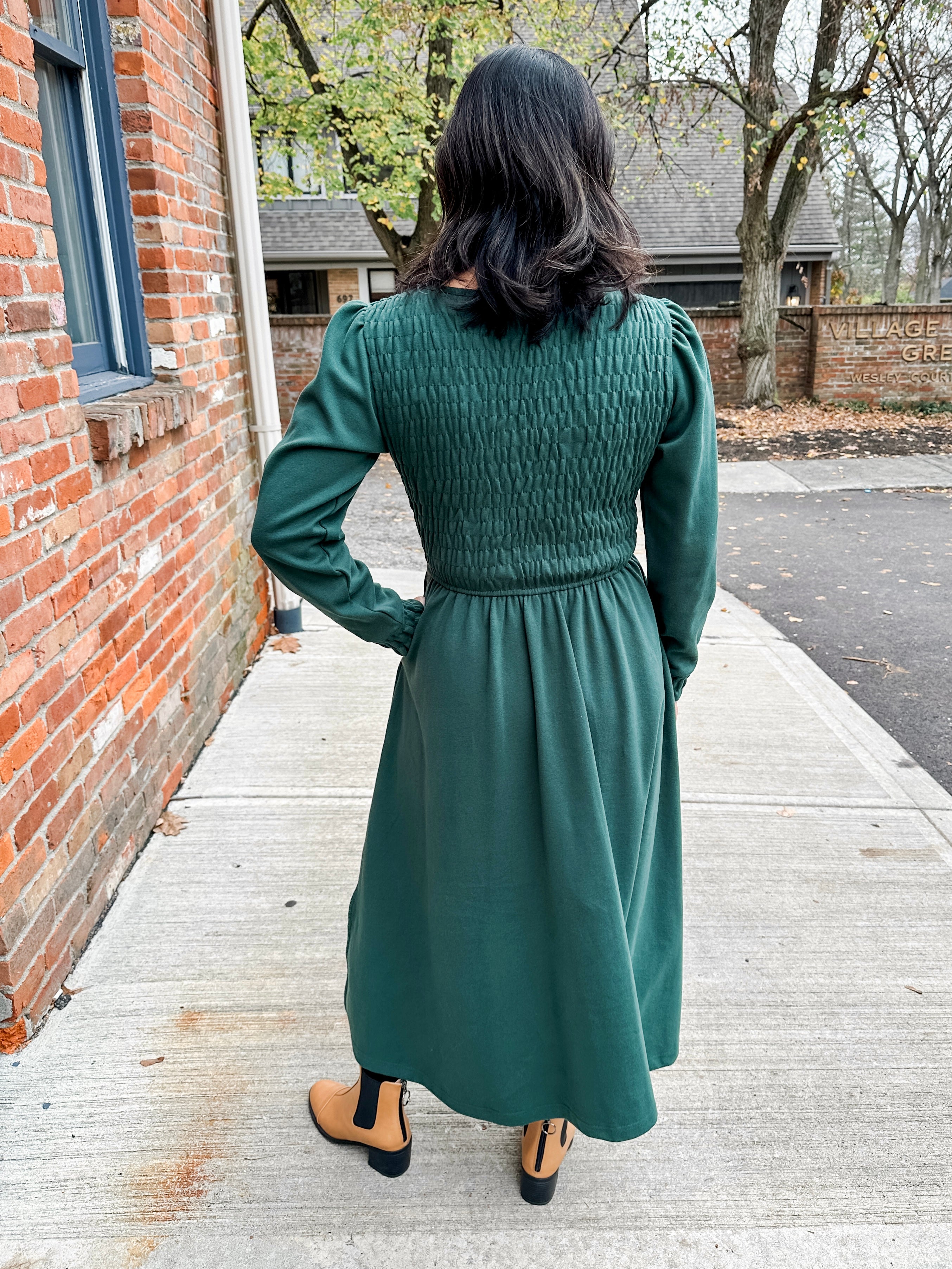 Elegant smocked midi dress crafted from sustainable heavy knit cotton surplus fabrics. Features a flattering V-neckline, long sleeves, and convenient pockets. Perfect for holidays and special occasions.
