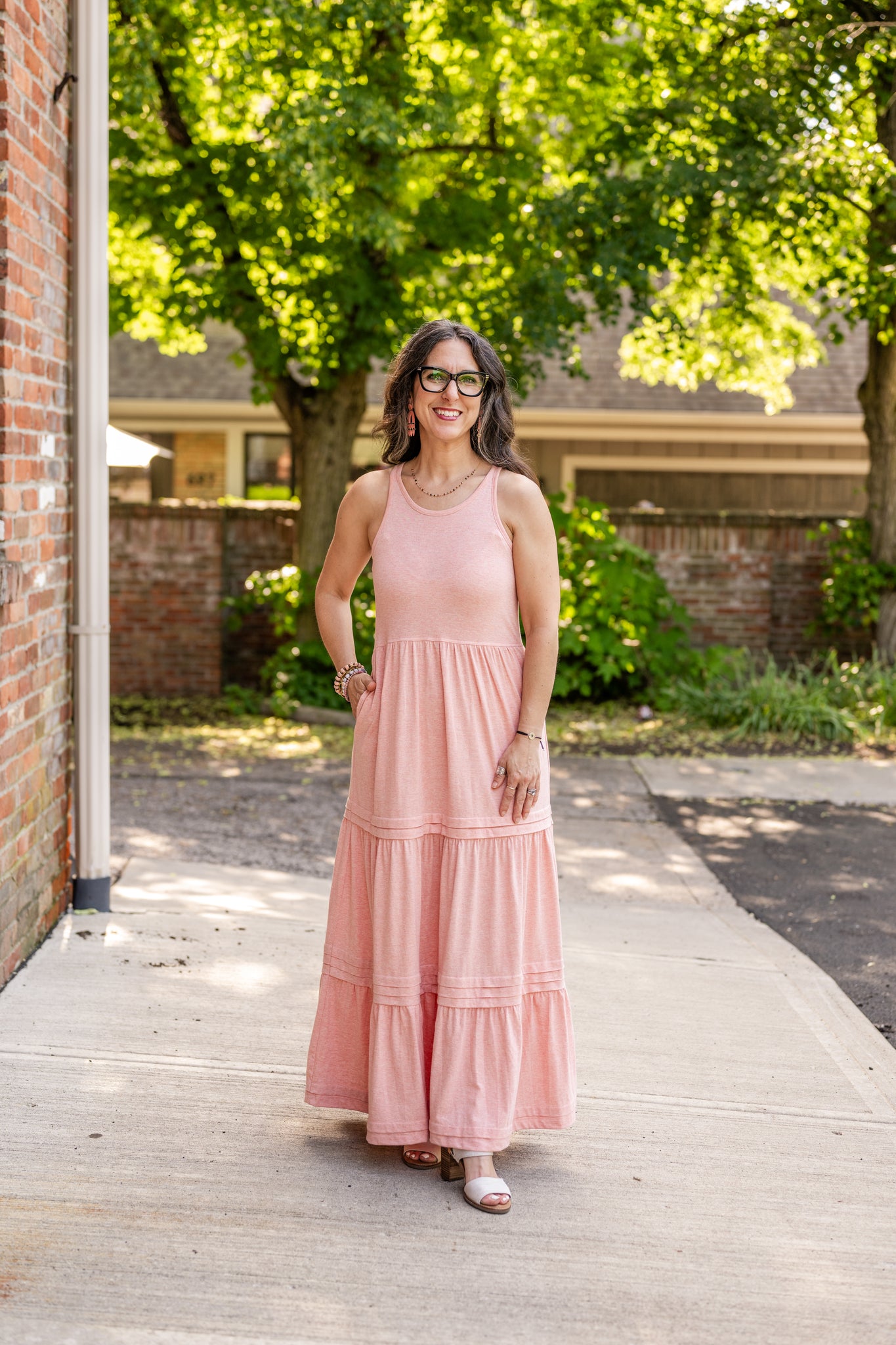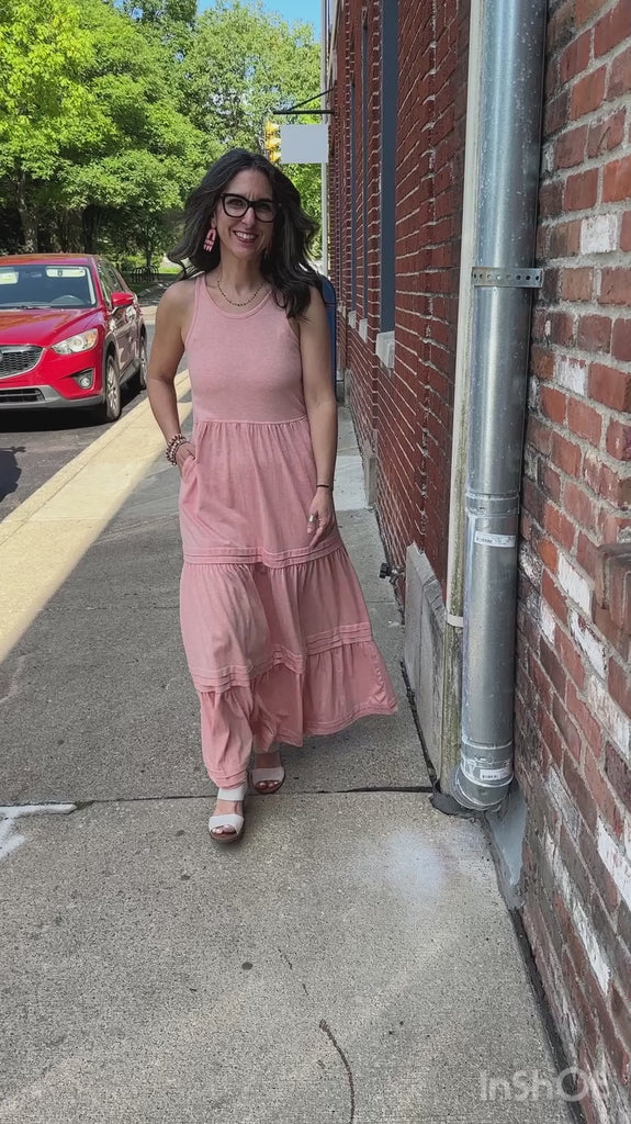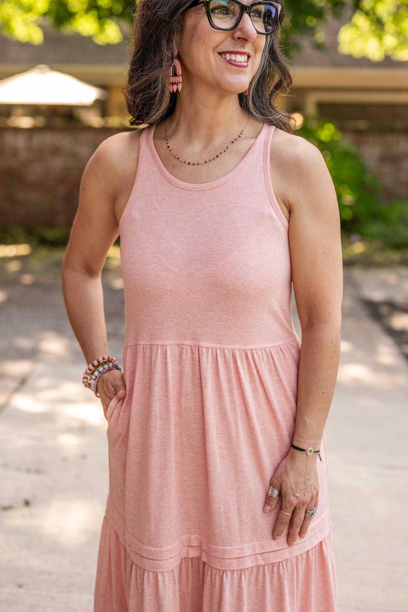 Casual and easy racer back tank dress with 3-tiered poplin style swing skirt. Features fold detail and hidden side pockets for effortless style and comfort.