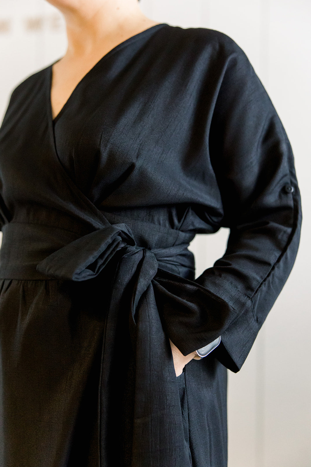 The vintage wrap-around pattern embodies elegance & luxury. Tailored from a sustainable cotton-viscose fabric blend + a surplus fabric with a hint of sheen within the stitching.