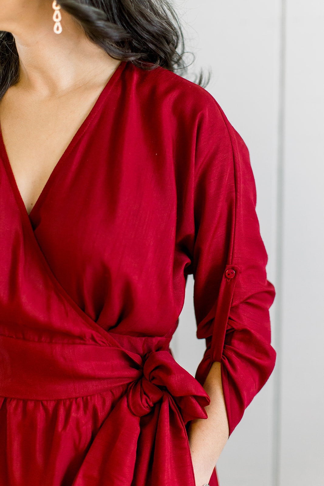 This dress brings out your curves, defines your waistline, and flatters all body shapes. Subtle pleats at the waist and button tab sleeves are semi-formal details to make your style more approachable.