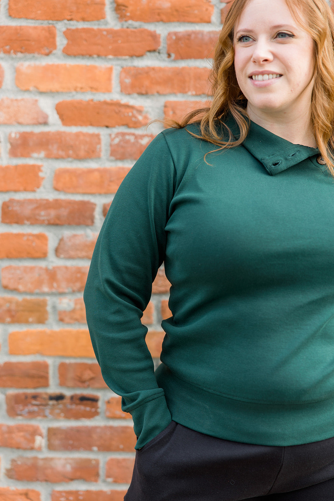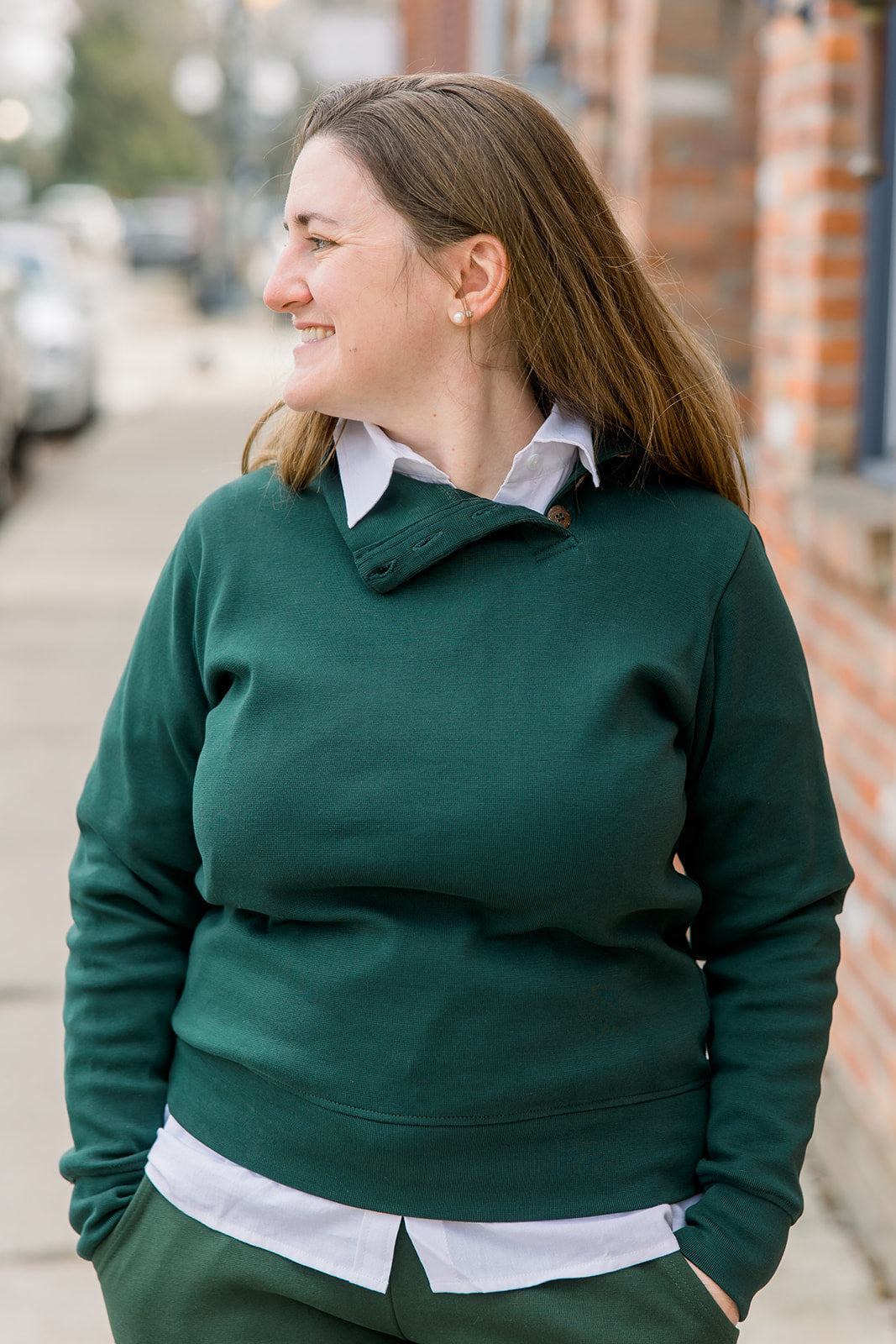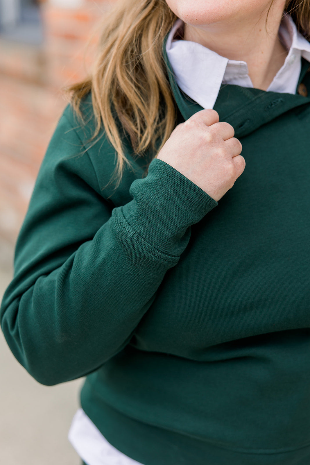 A versatile pull-over featuring a stylish mock neck with button detail. Perfect for layering or wearing on its own.