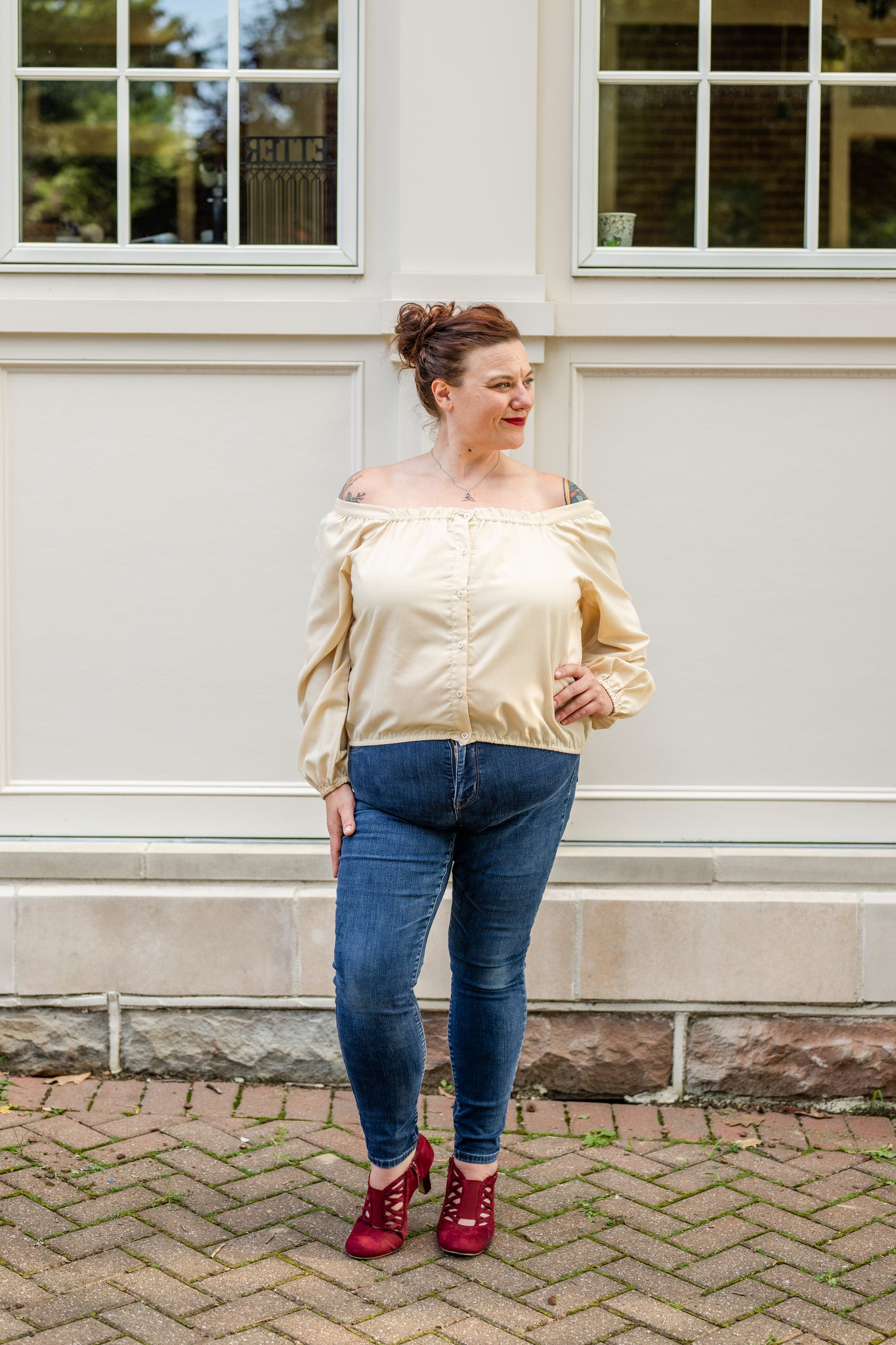 A unique blouse with a slightly "untucked" look featuring an elastic bottom hem. Feminine and functional with thoughtful details throughout.