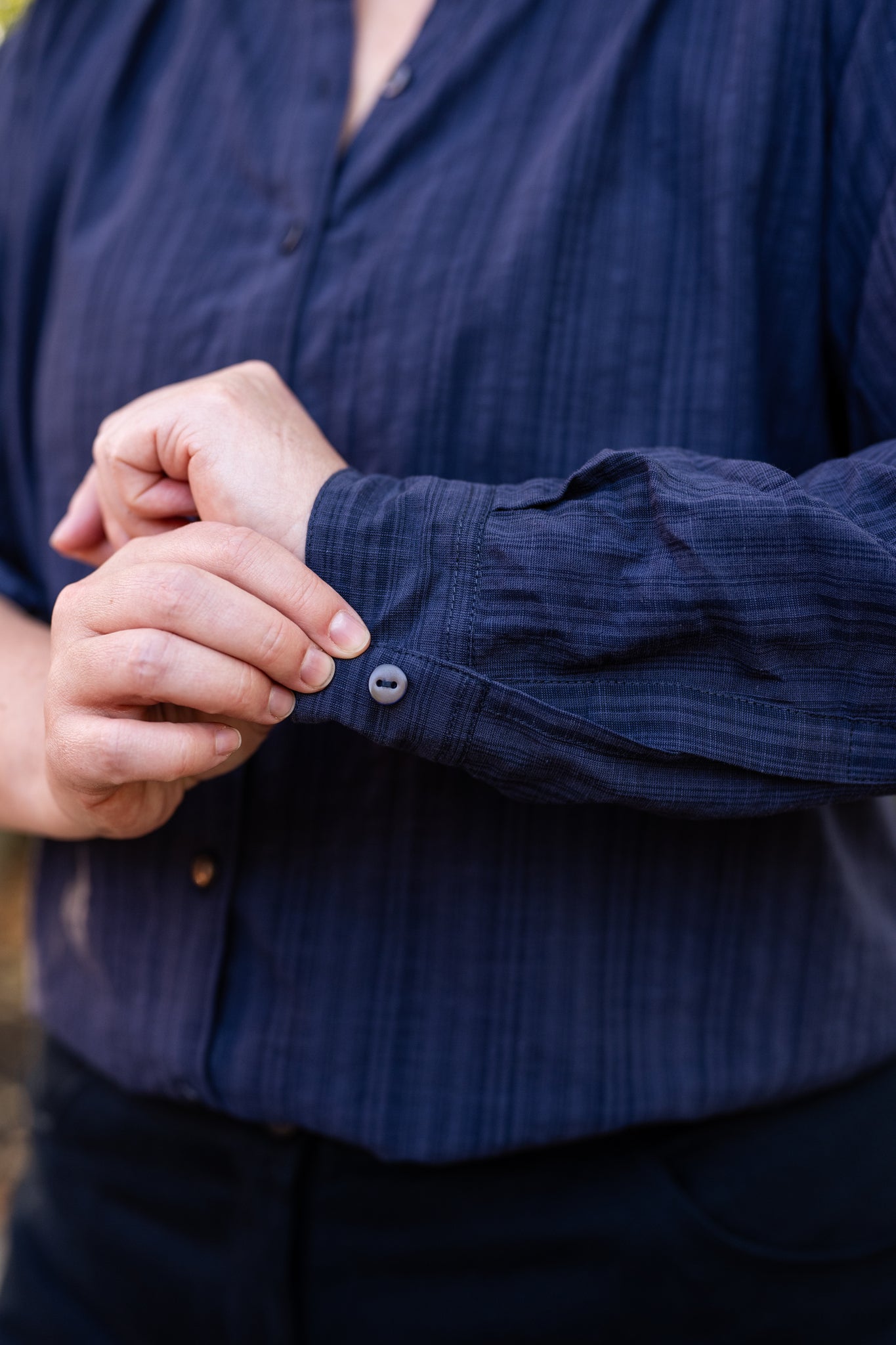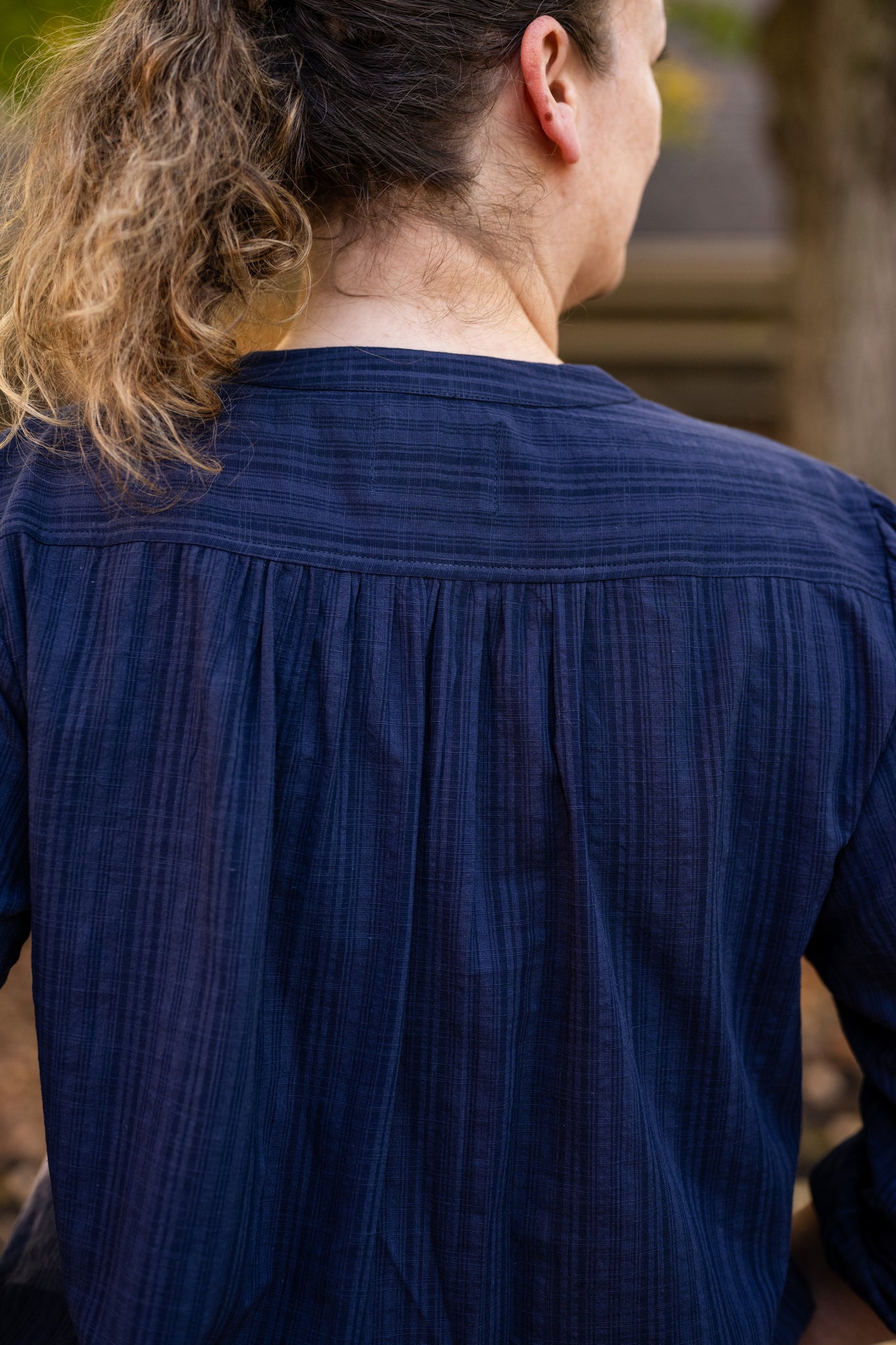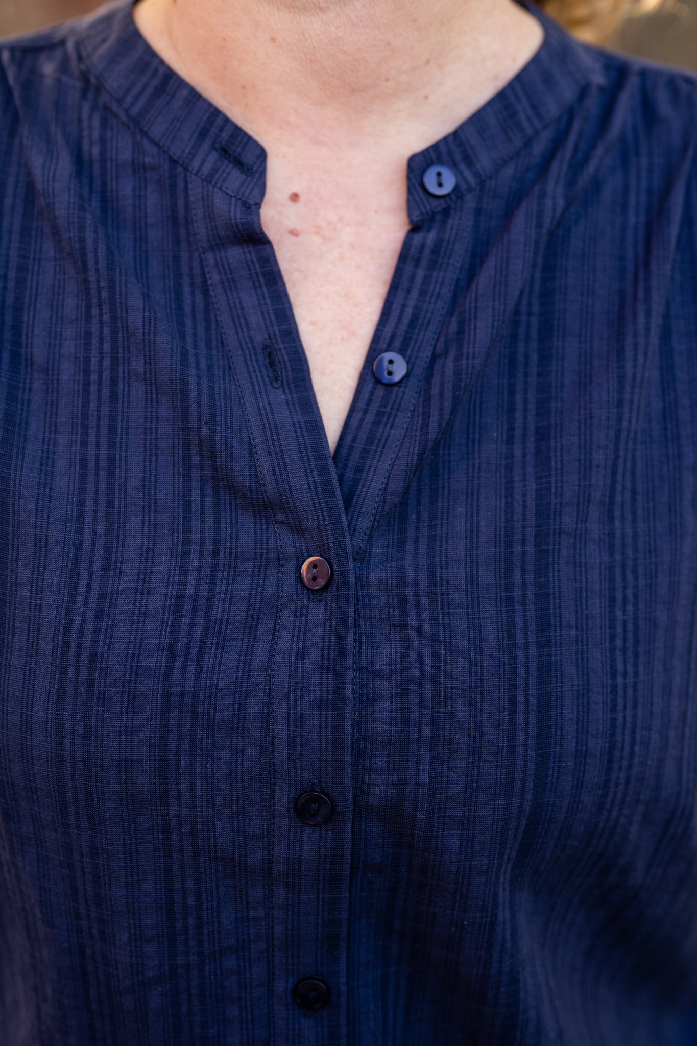 A classic collarless blouse crafted from textured stripe Irish cotton. Perfect for professional or casual wear with timeless style.