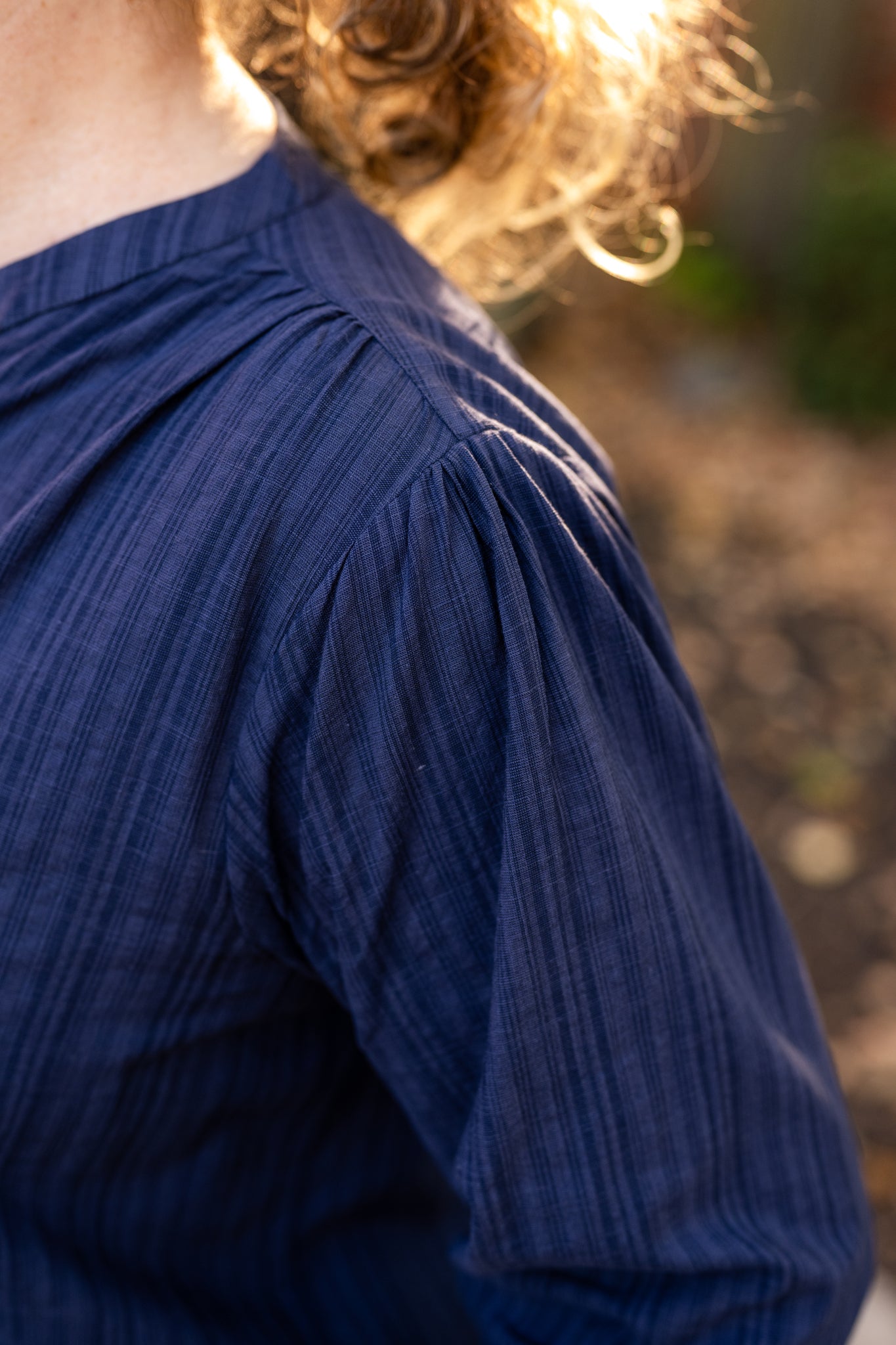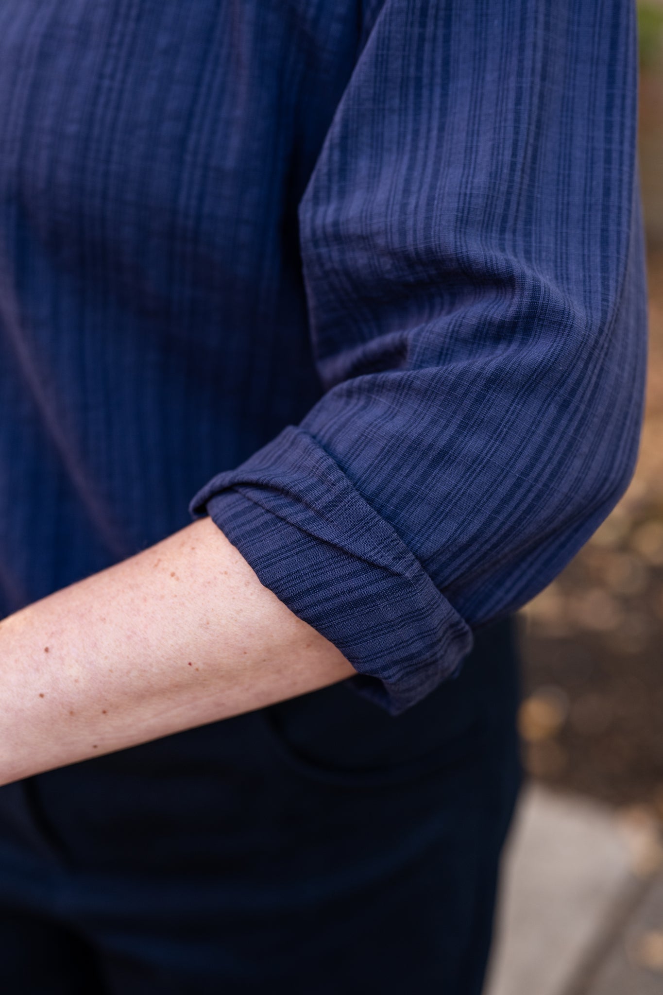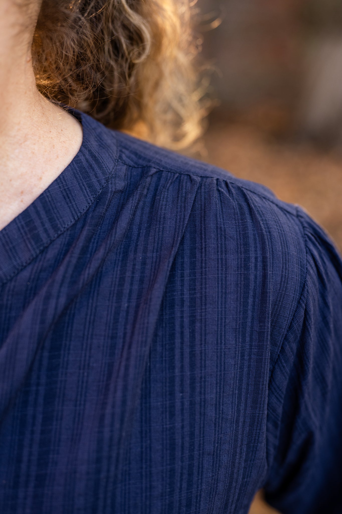 A classic collarless blouse crafted from textured stripe Irish cotton. Perfect for professional or casual wear with timeless style.
