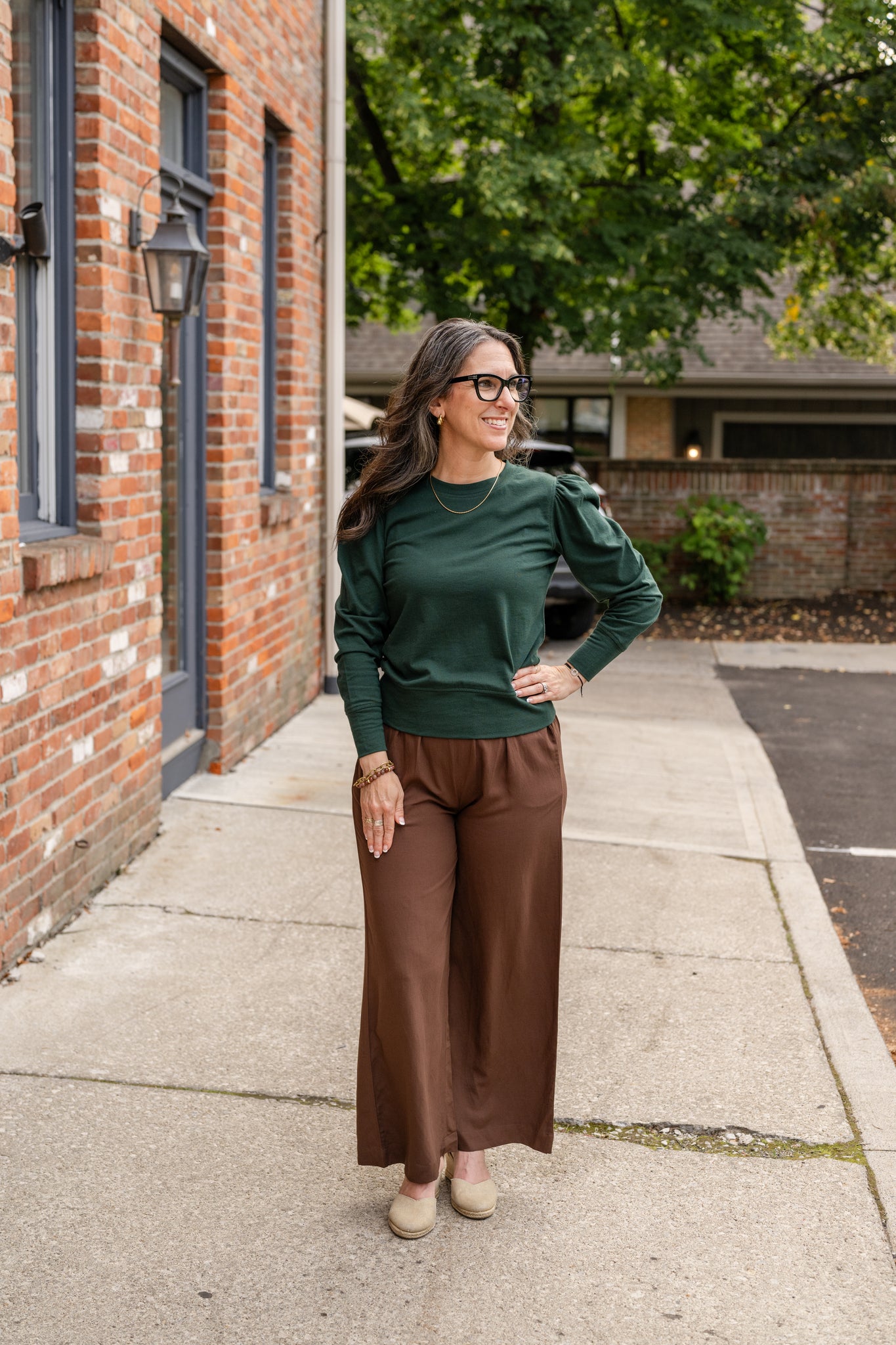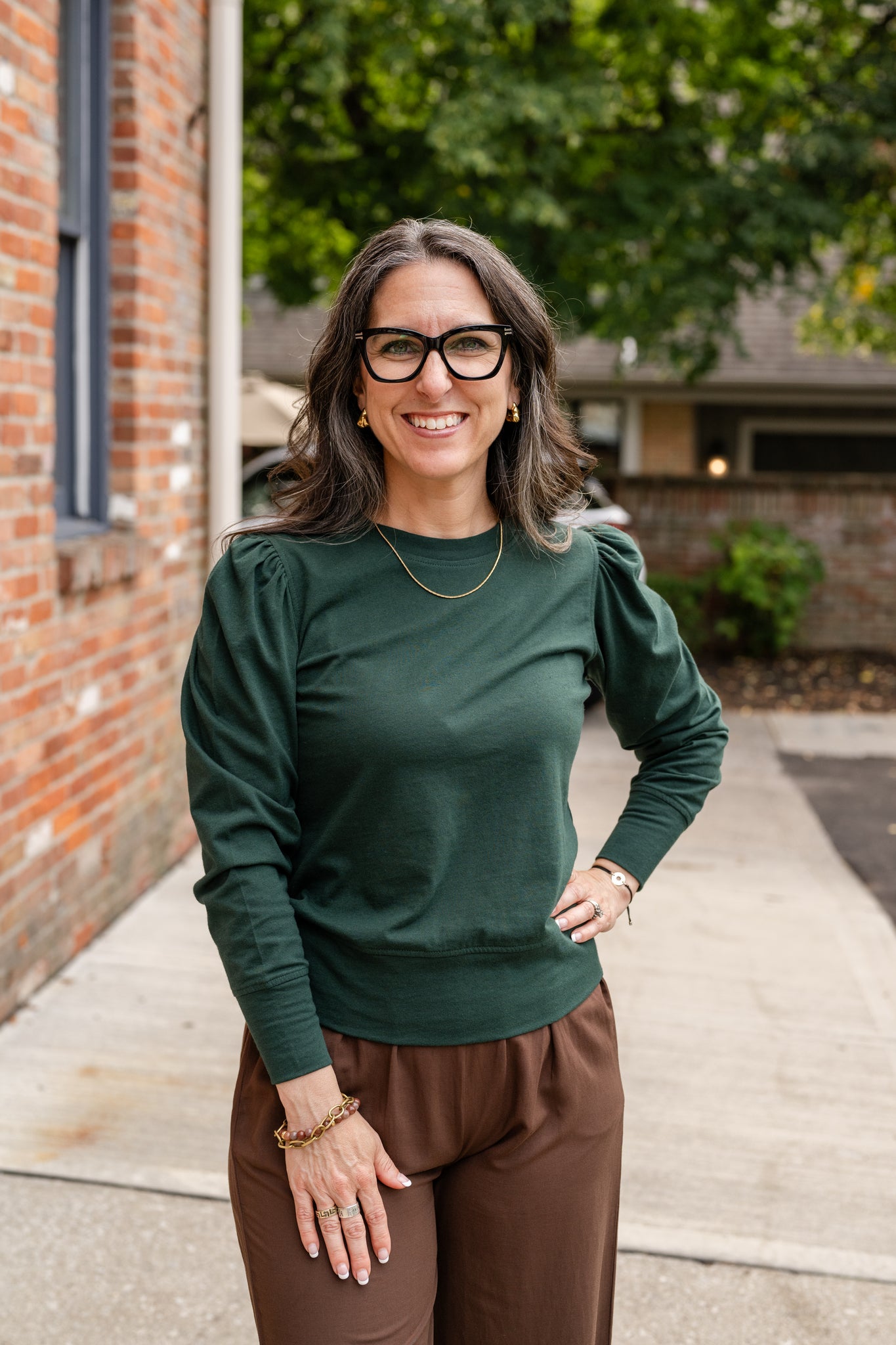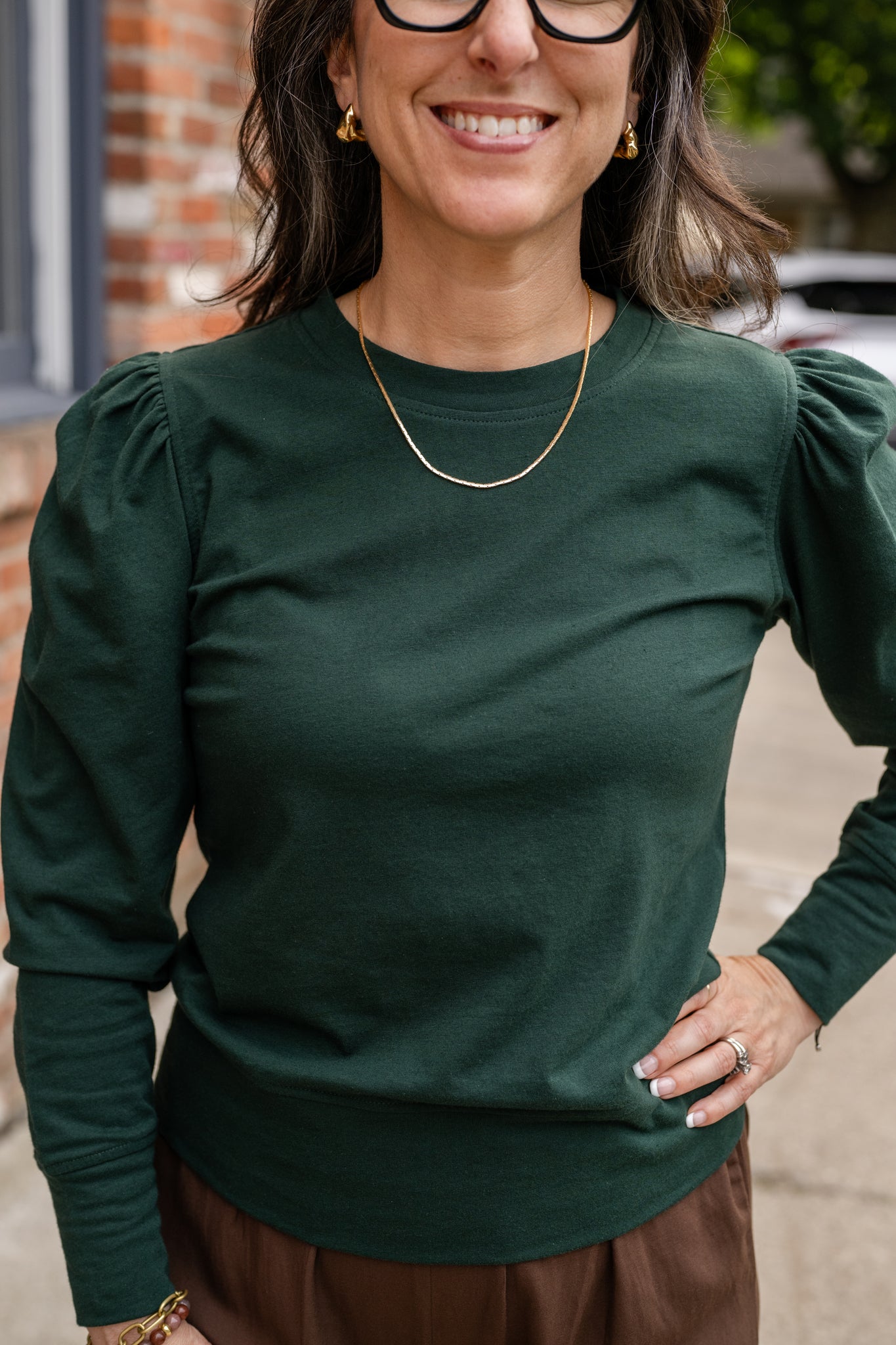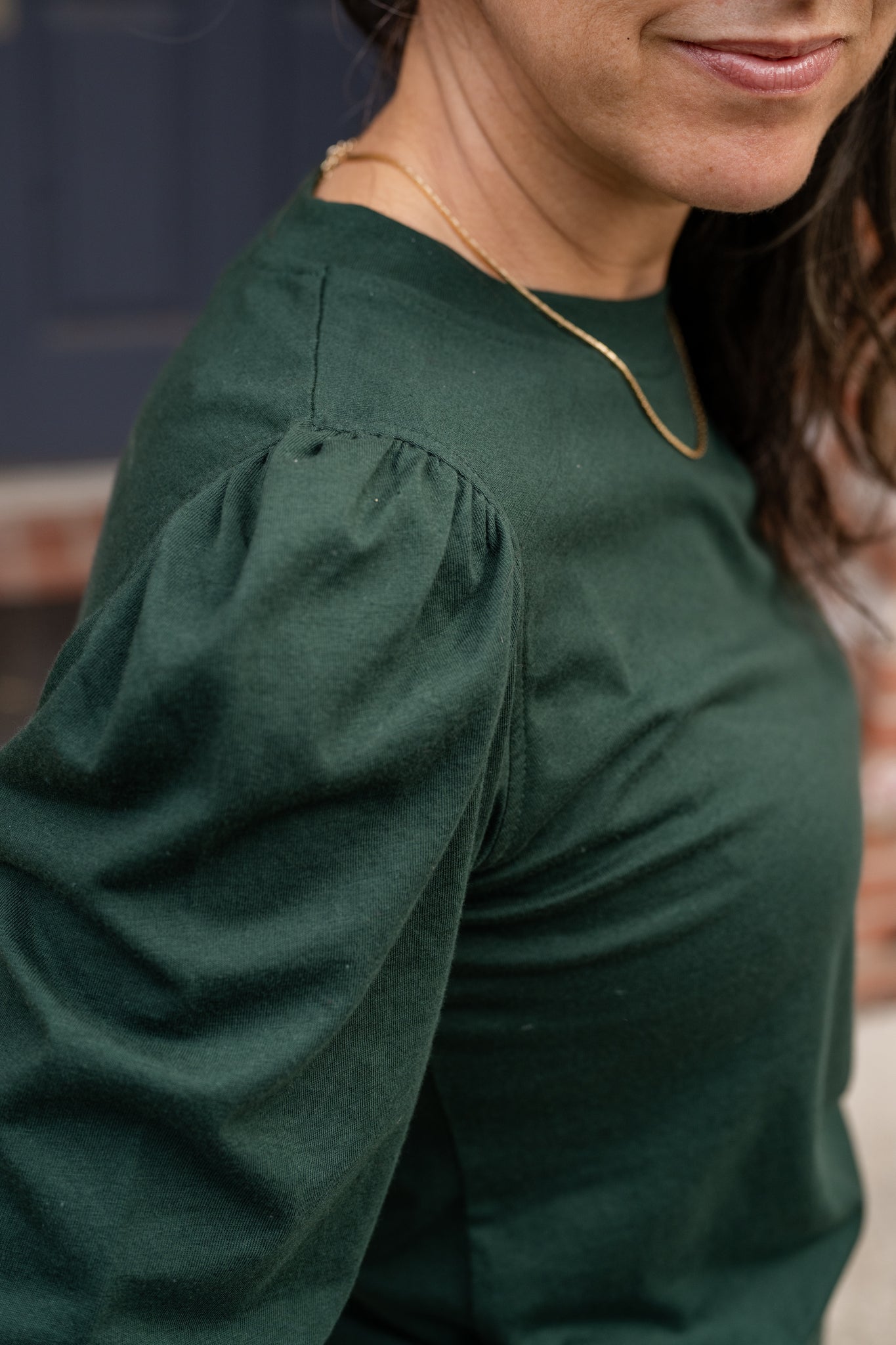 Effortlessly stylish puff sleeve pullover sweater crafted from soft, sustainable 100% cotton jersey knit.