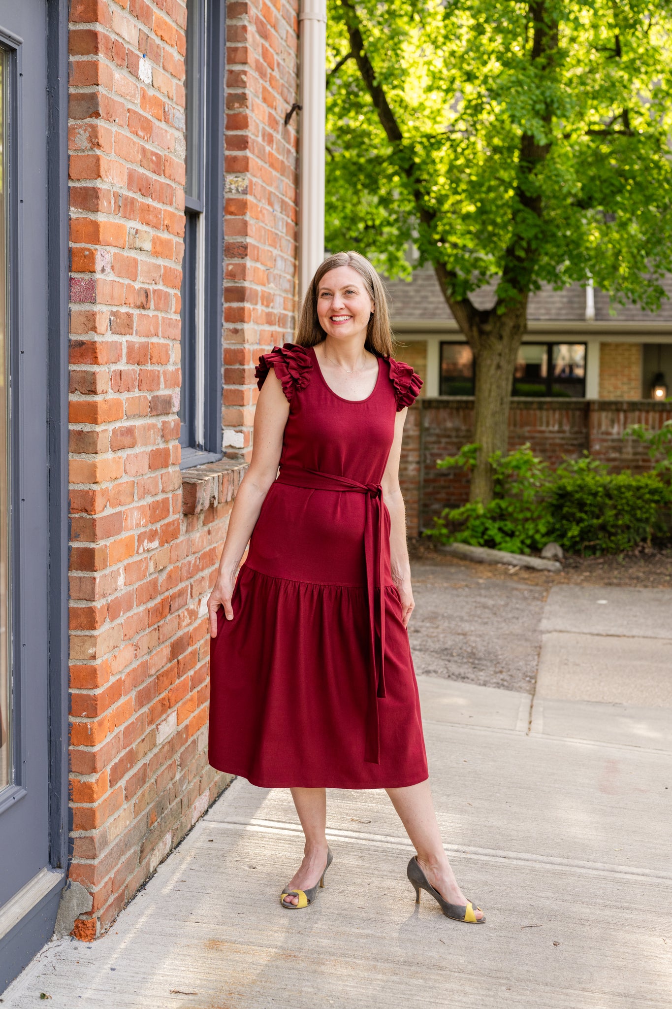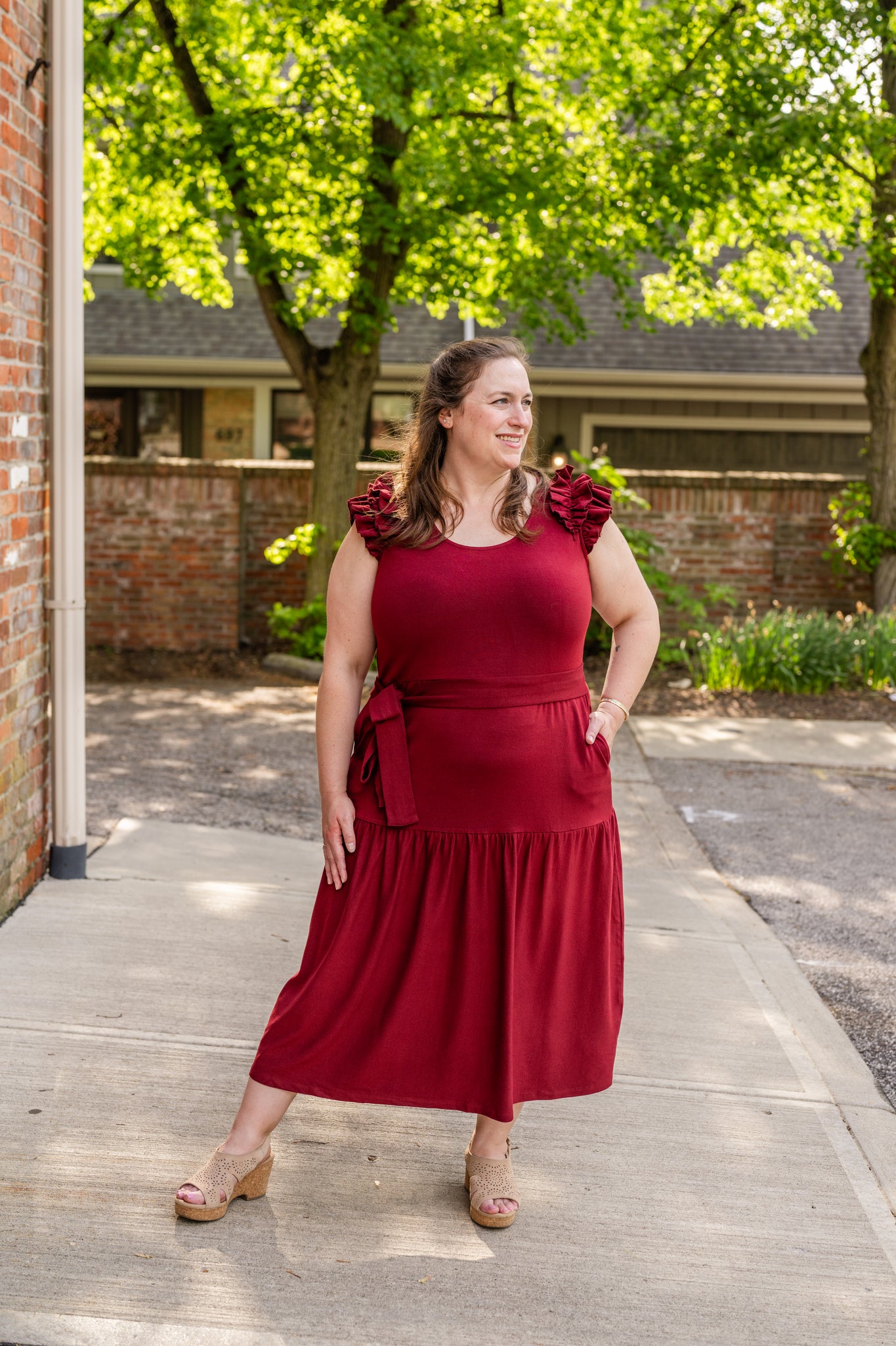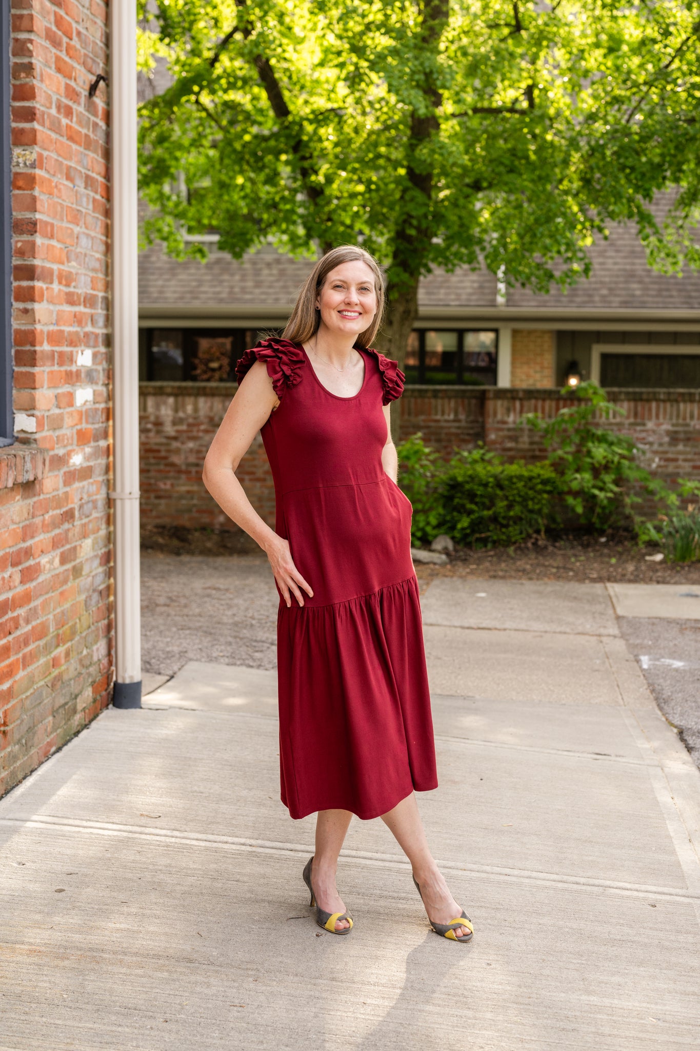A charming tiered dress featuring cascading ruffle shoulders and a flattering A-line silhouette. Made from 100% cotton jersey knit with thoughtful details throughout.