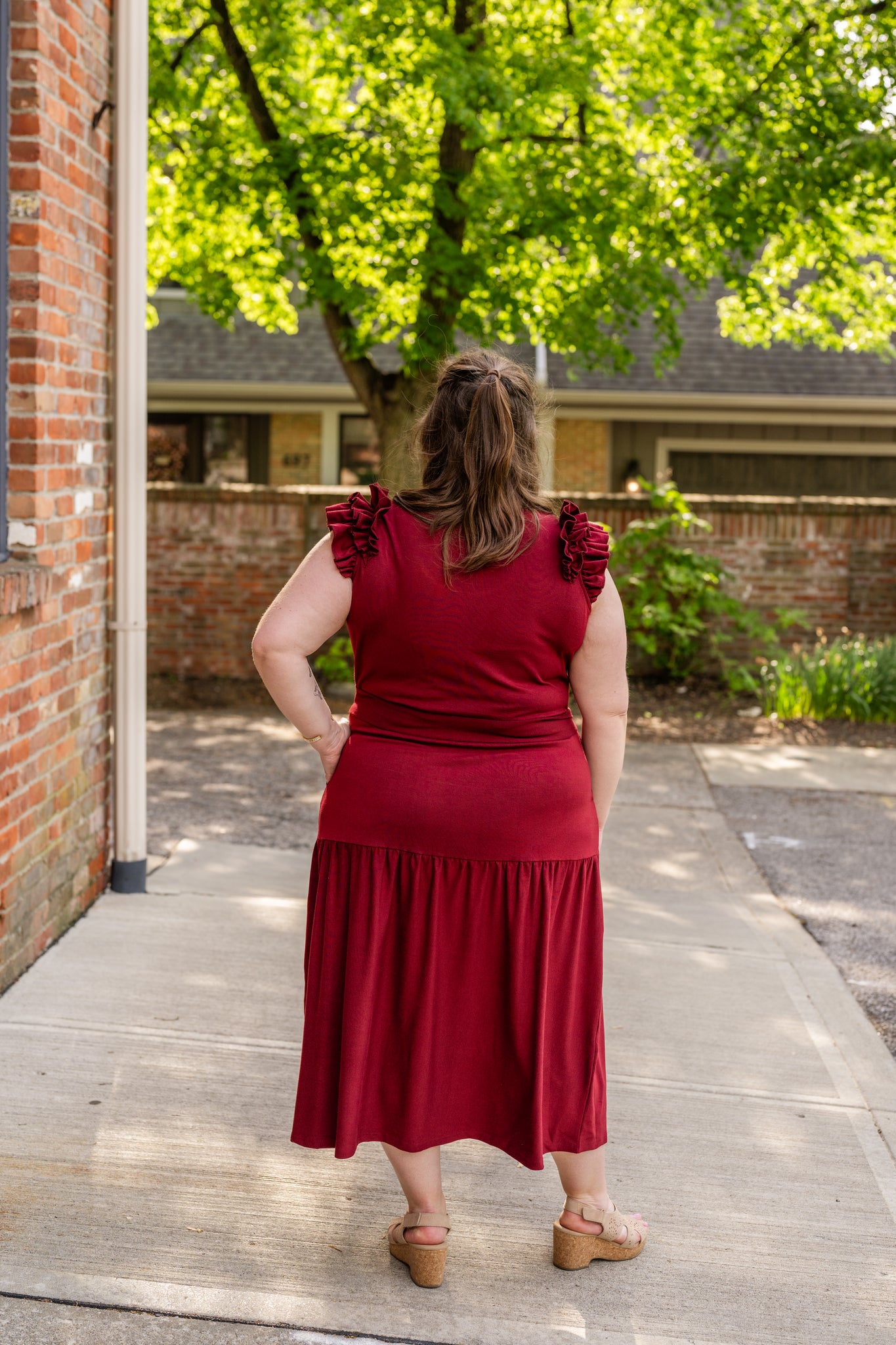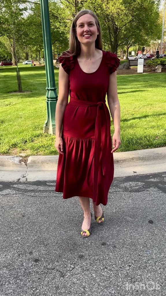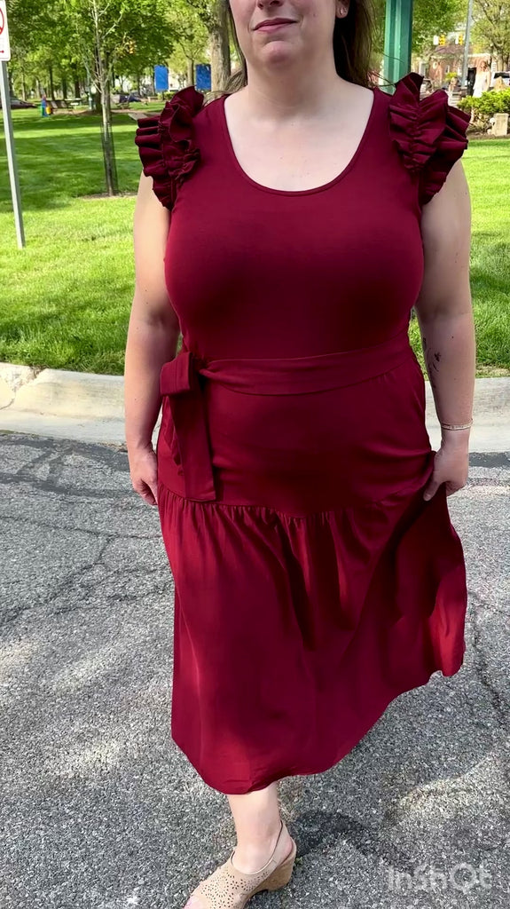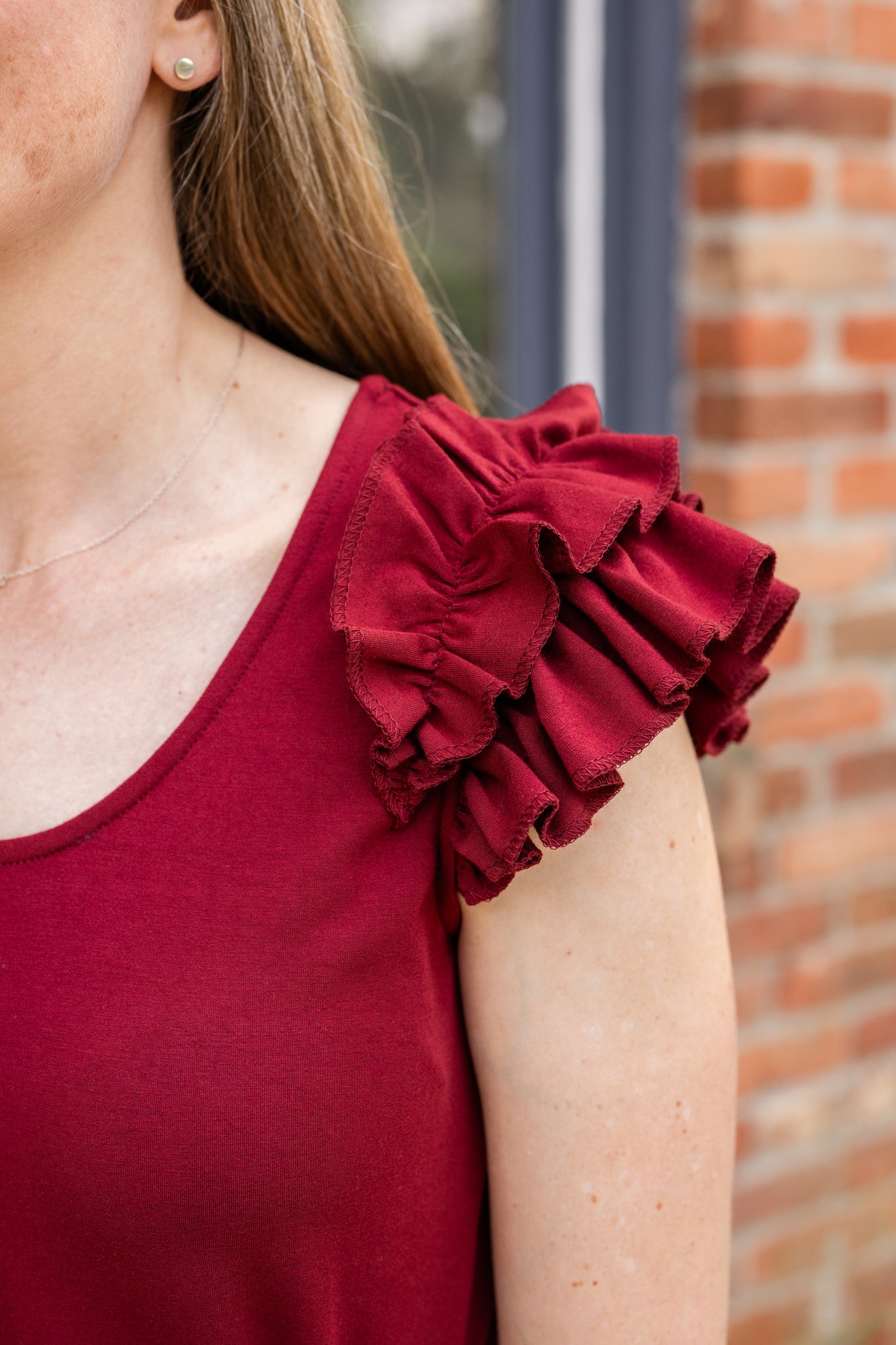 - Curved scoop neckline with cascading ruffle cap sleeves