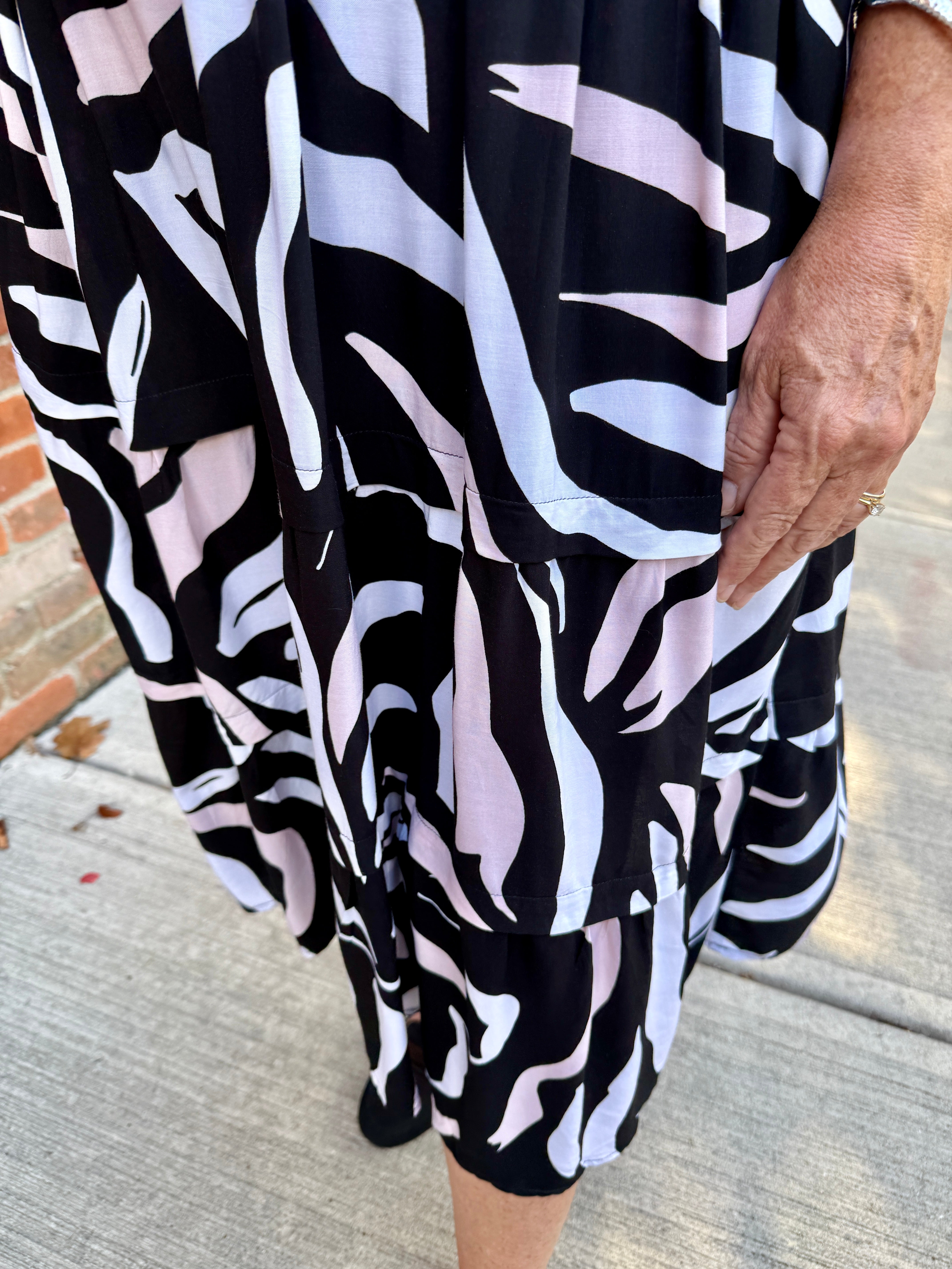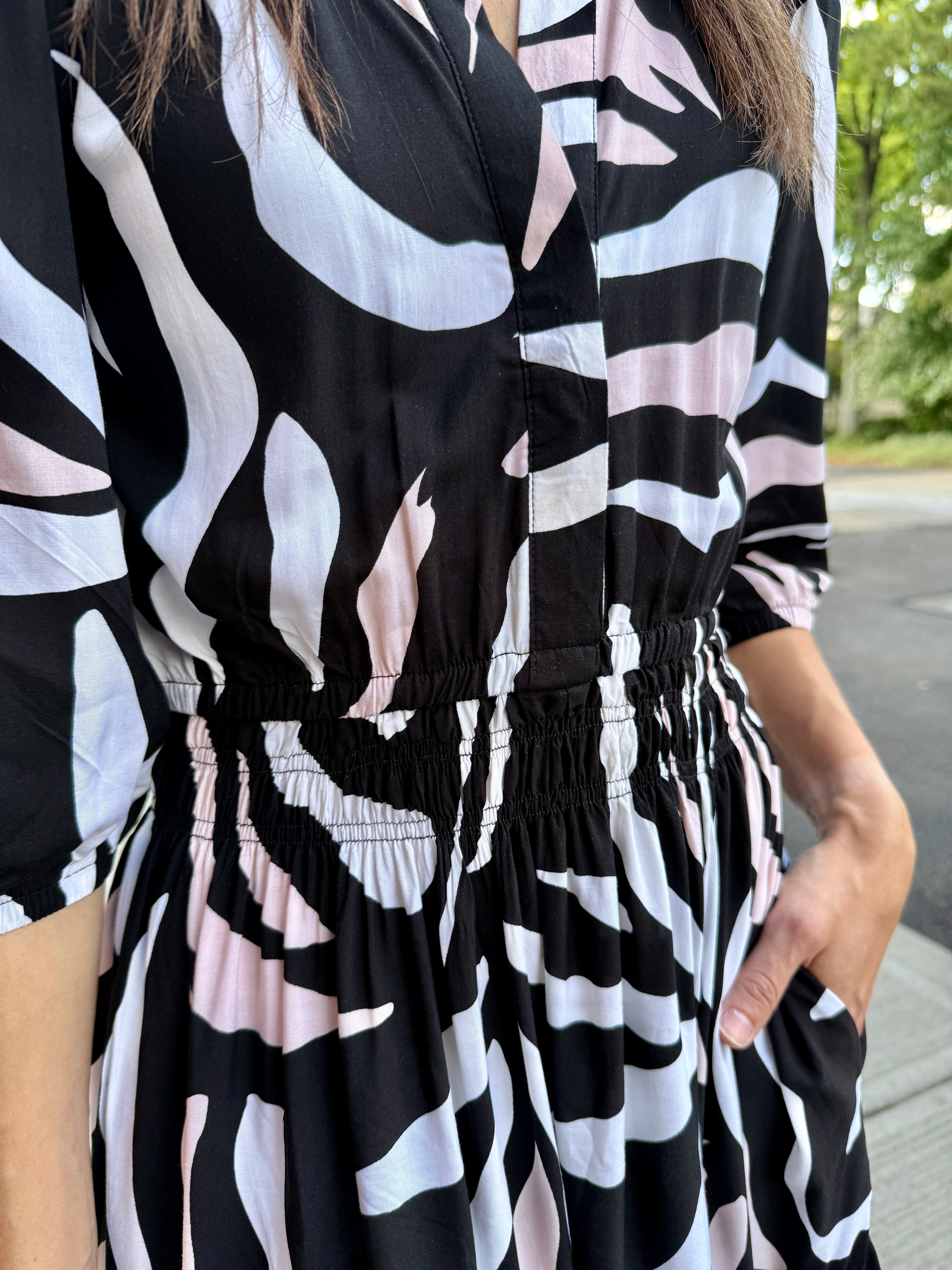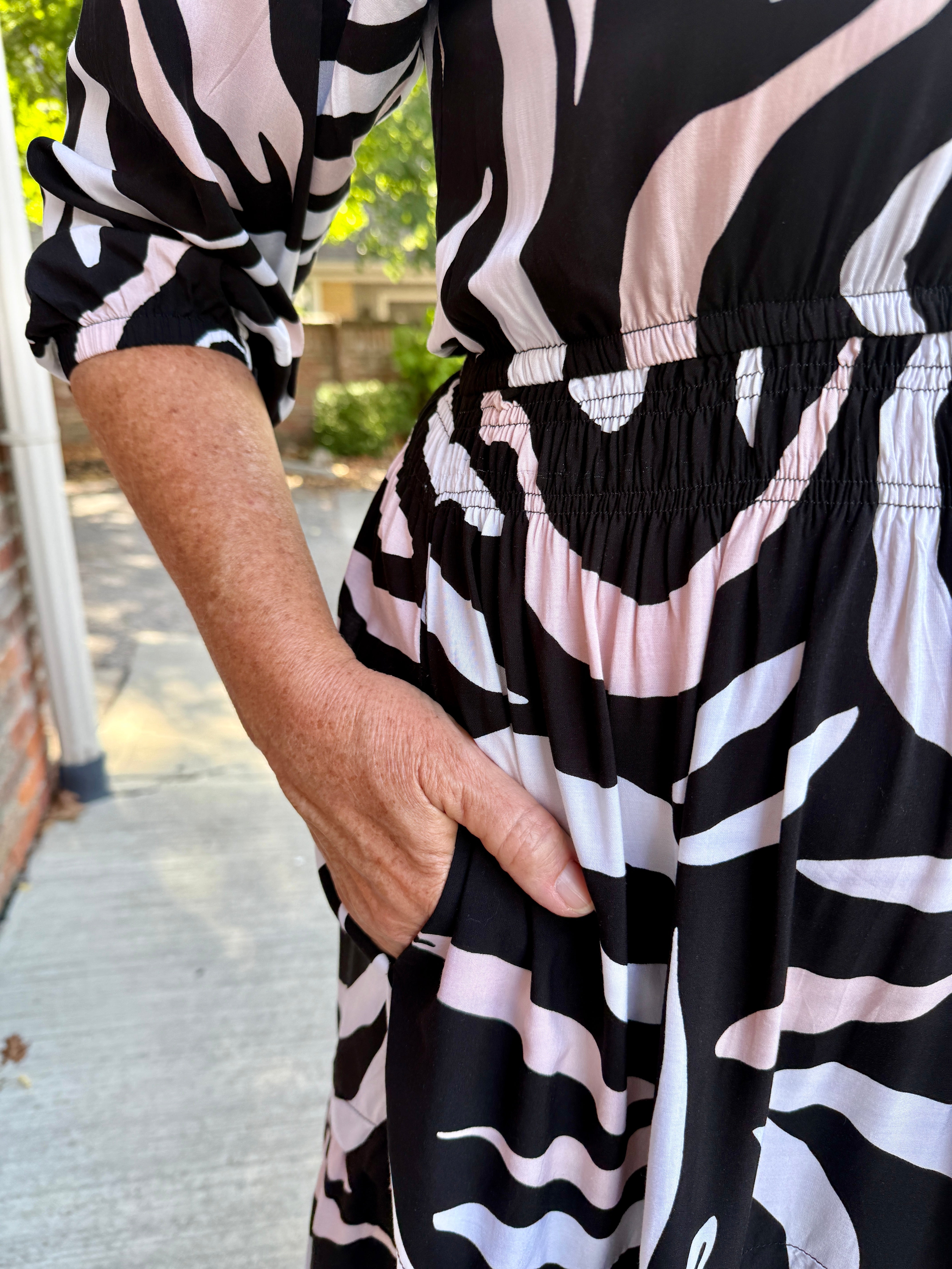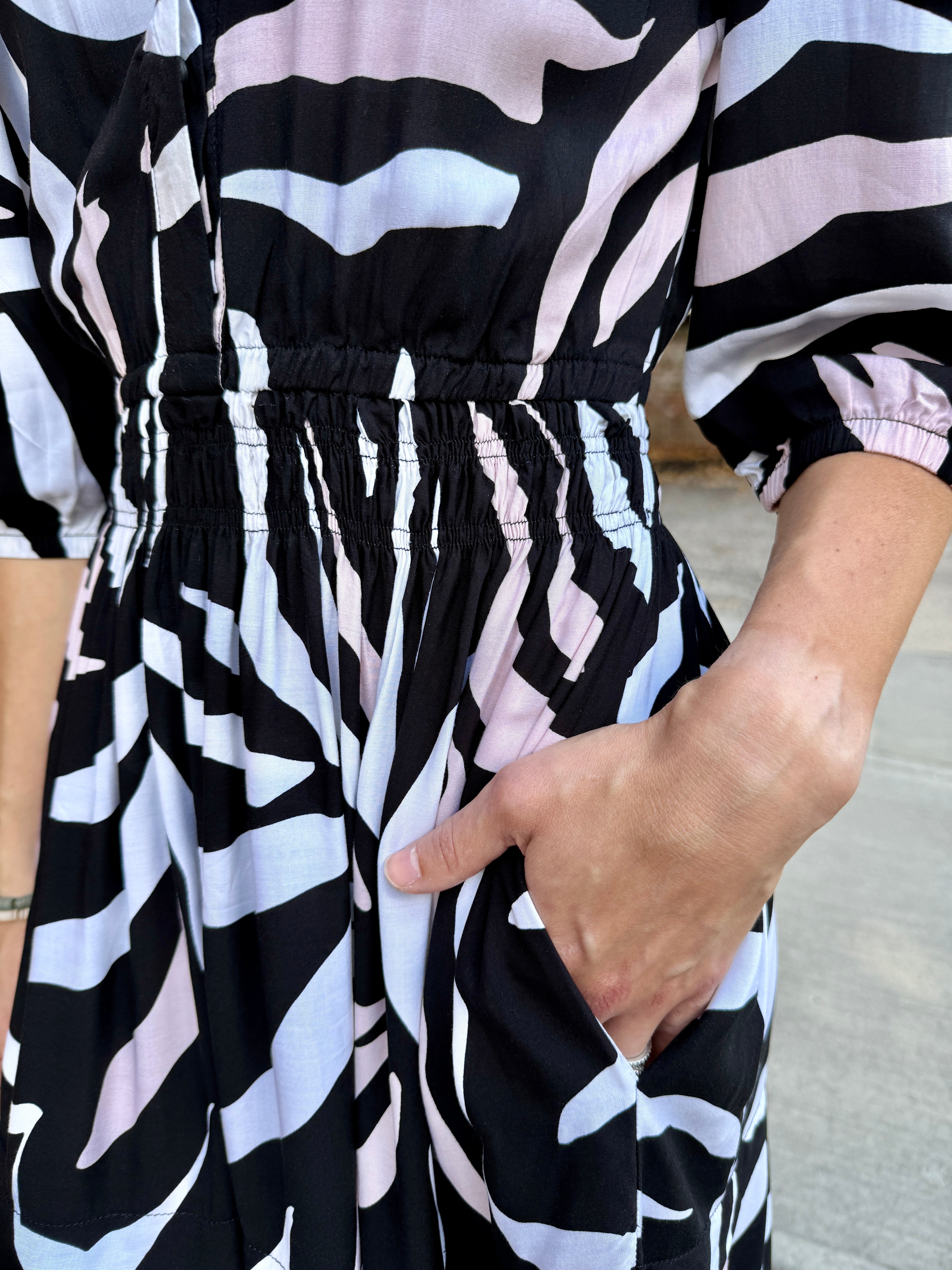 Created from surplus viscose material and features pockets, flutter sleeve, mid-high flattering elastic waist and button closure.