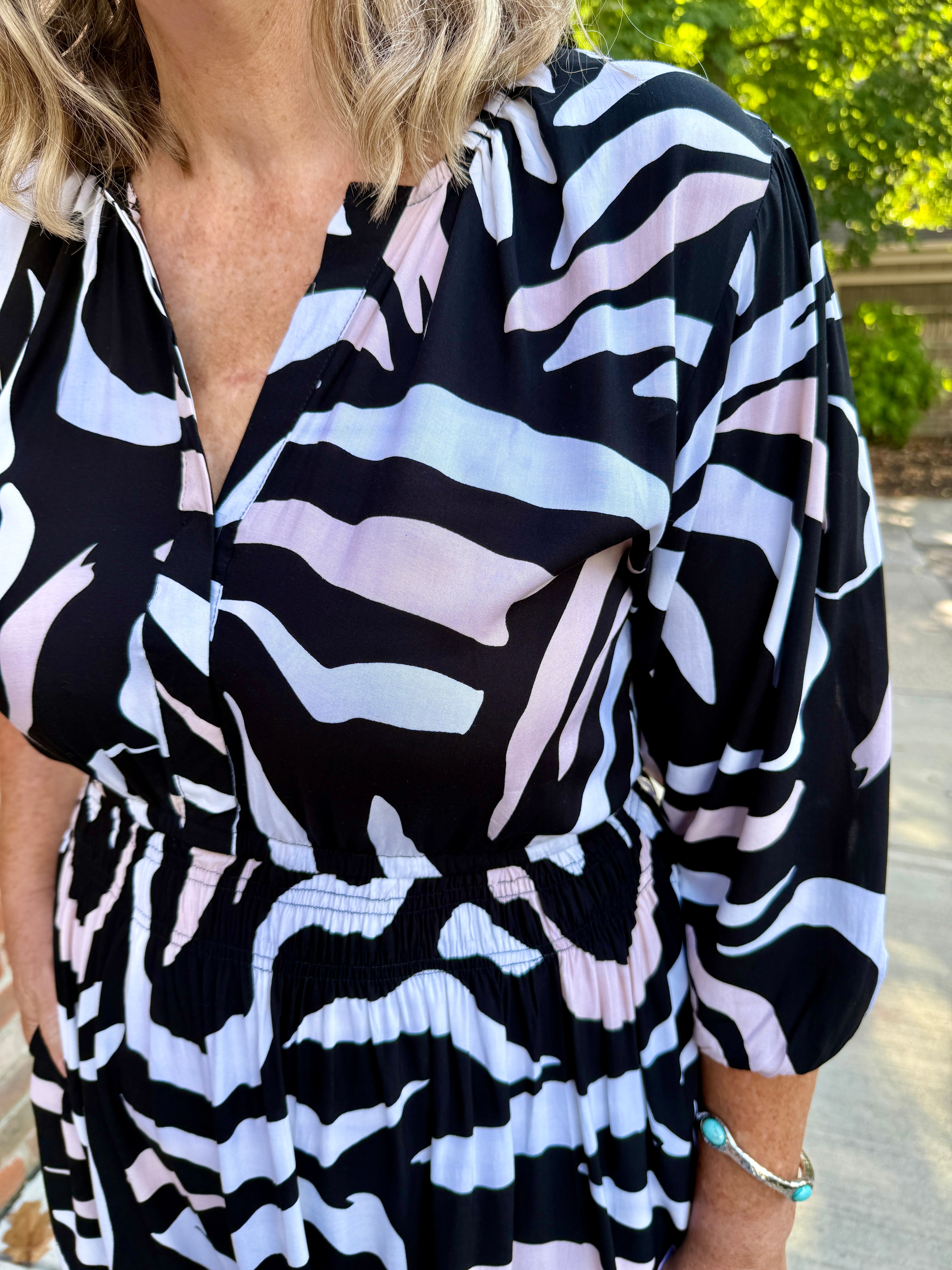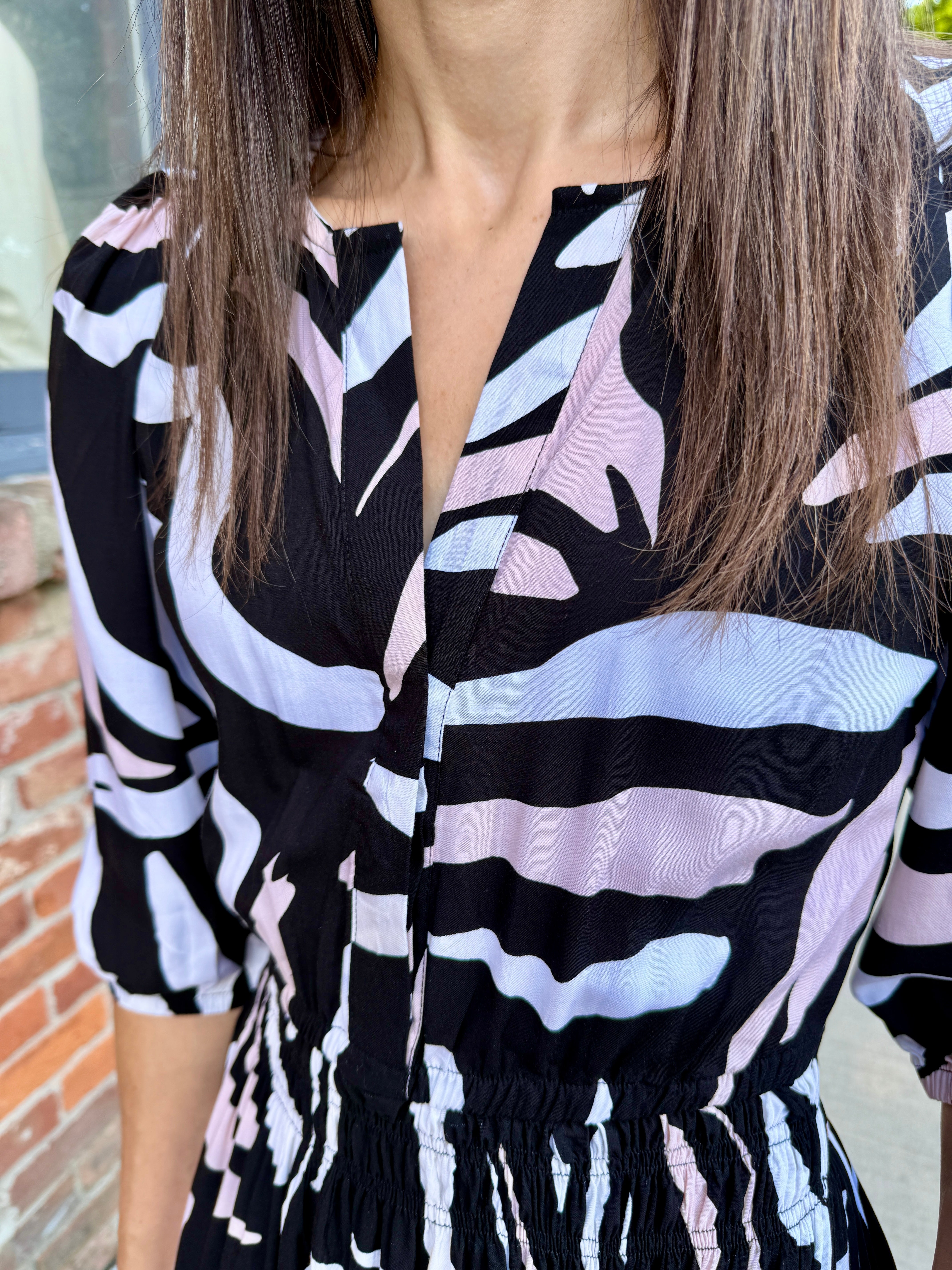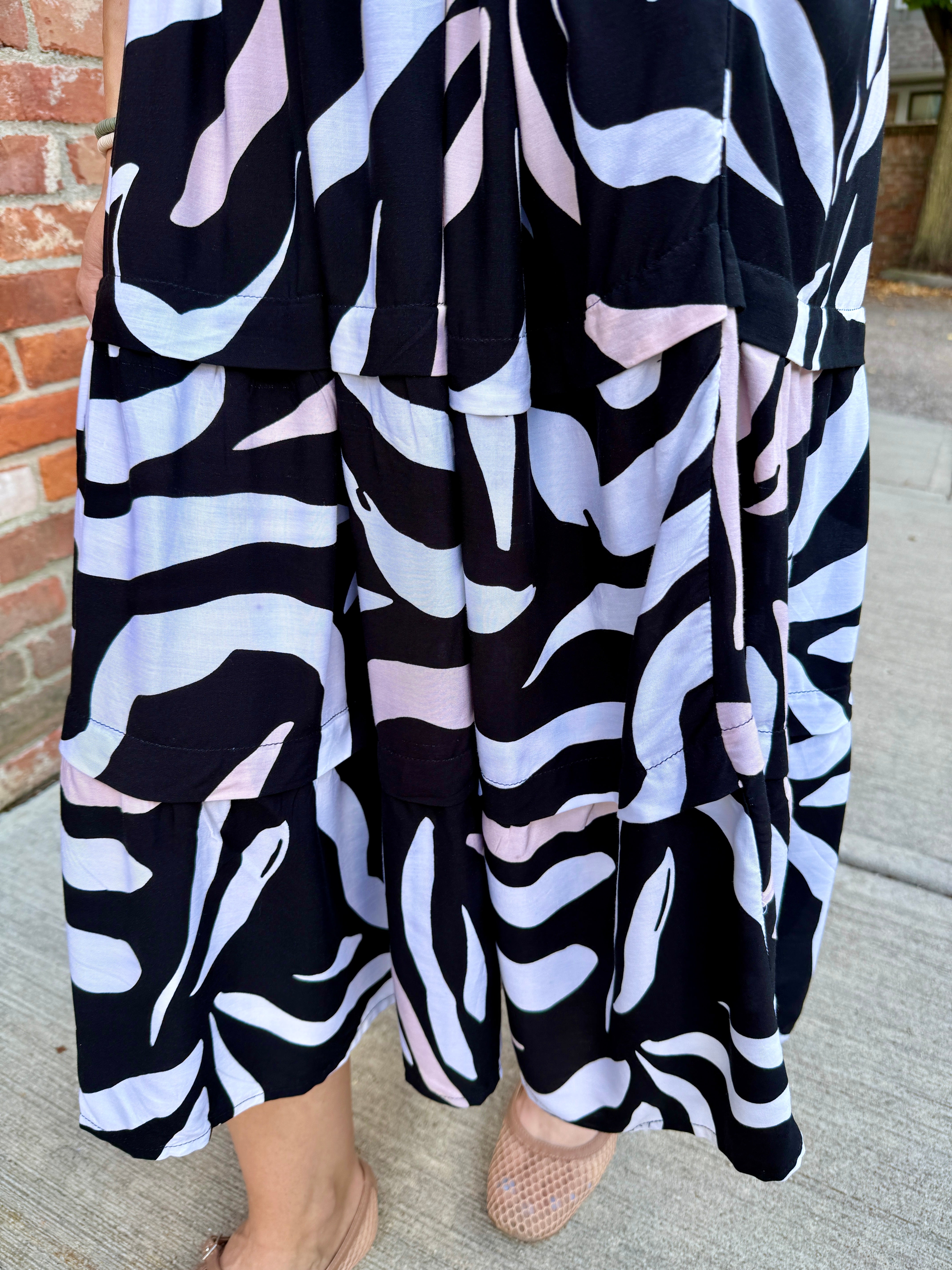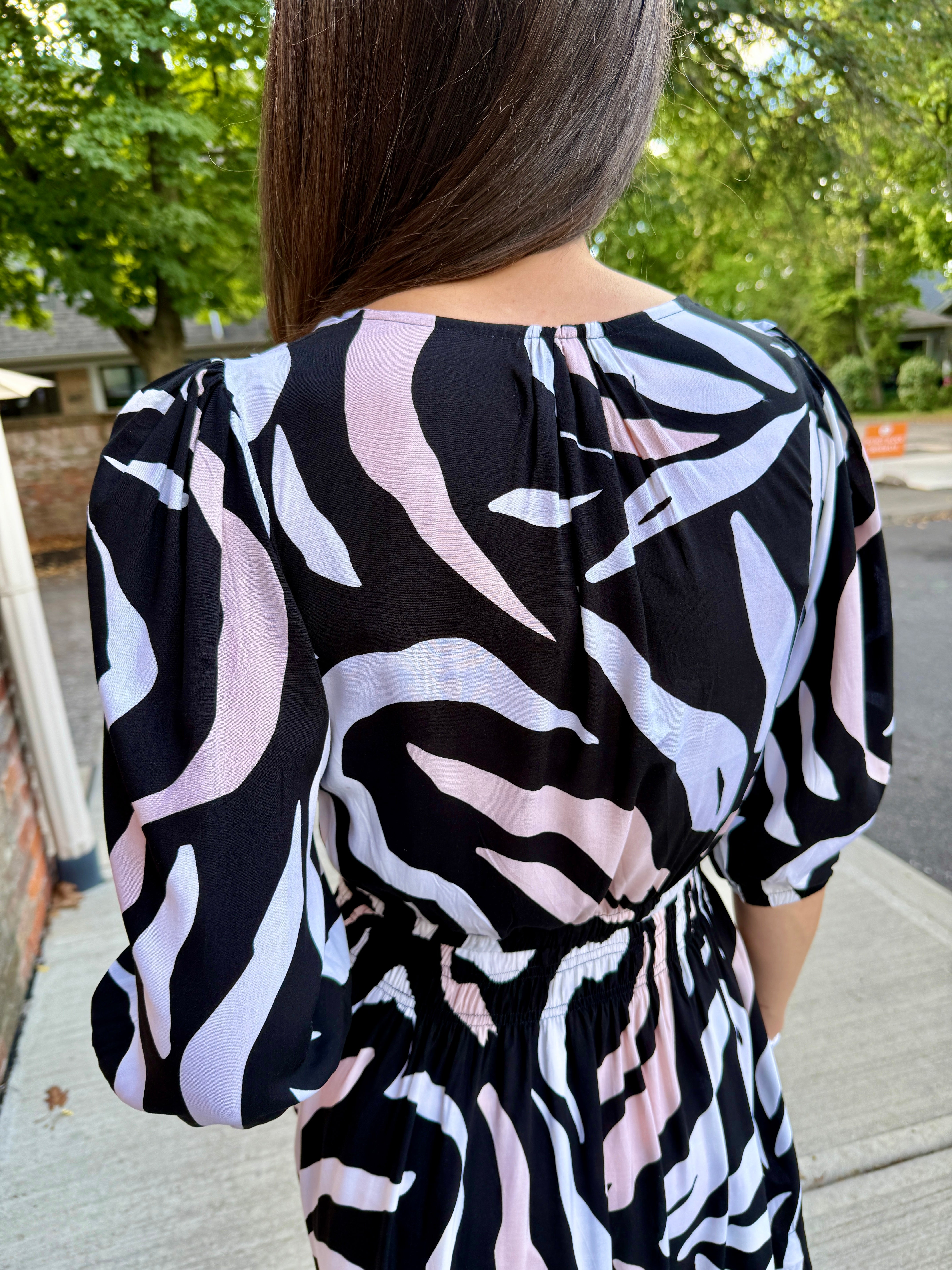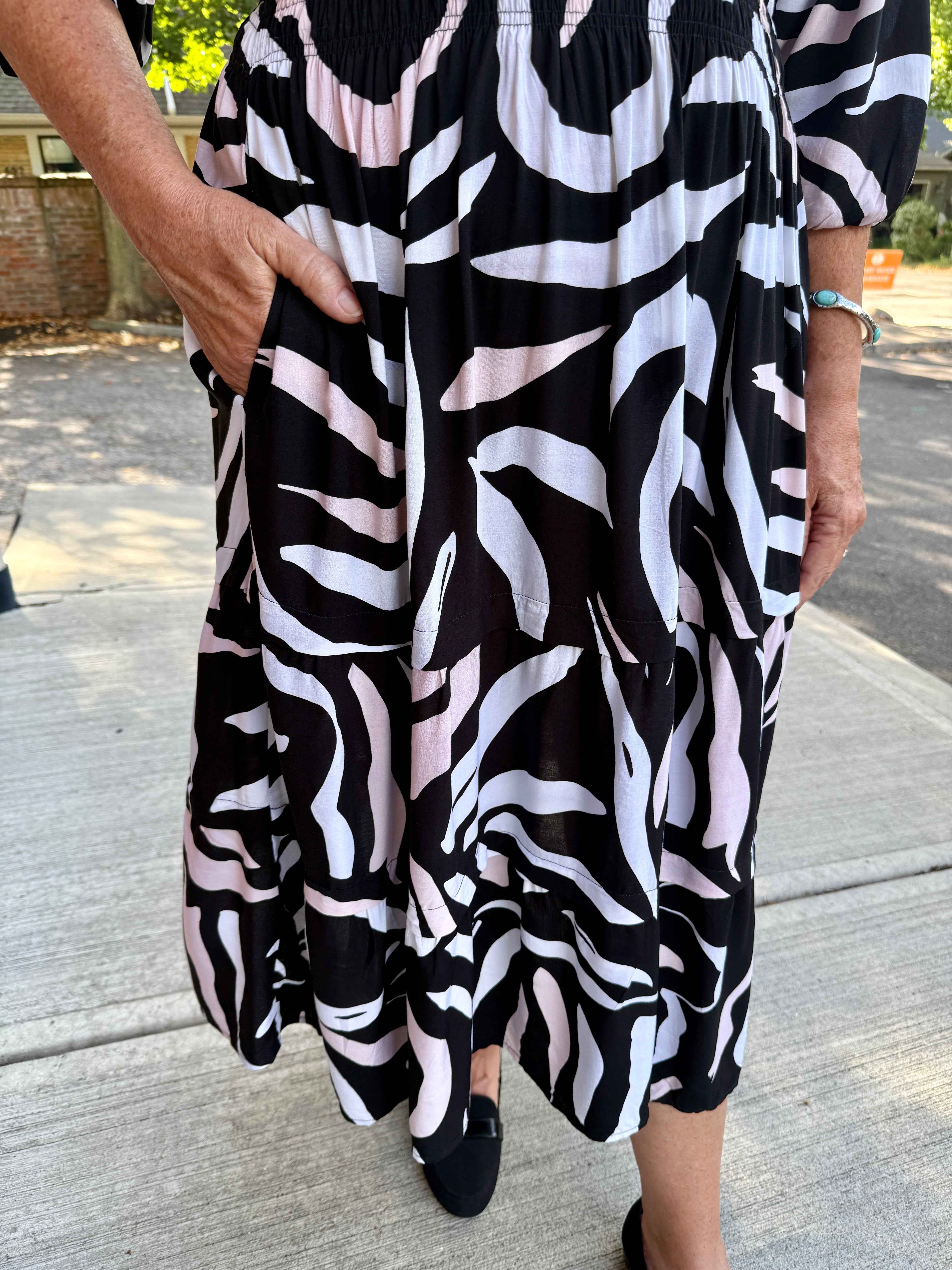 Created from surplus viscose material and features pockets, flutter sleeve, mid-high flattering elastic waist and button closure.