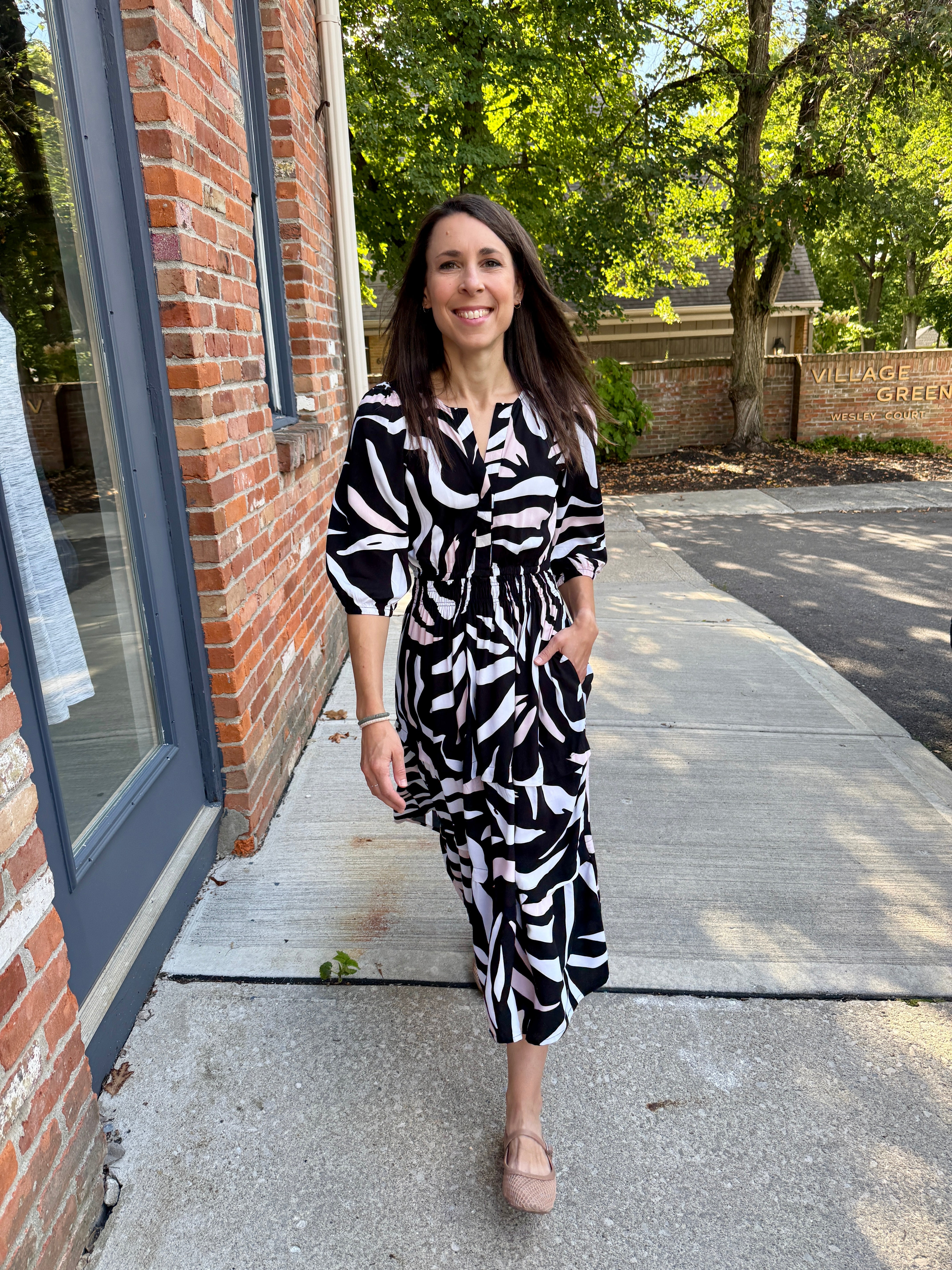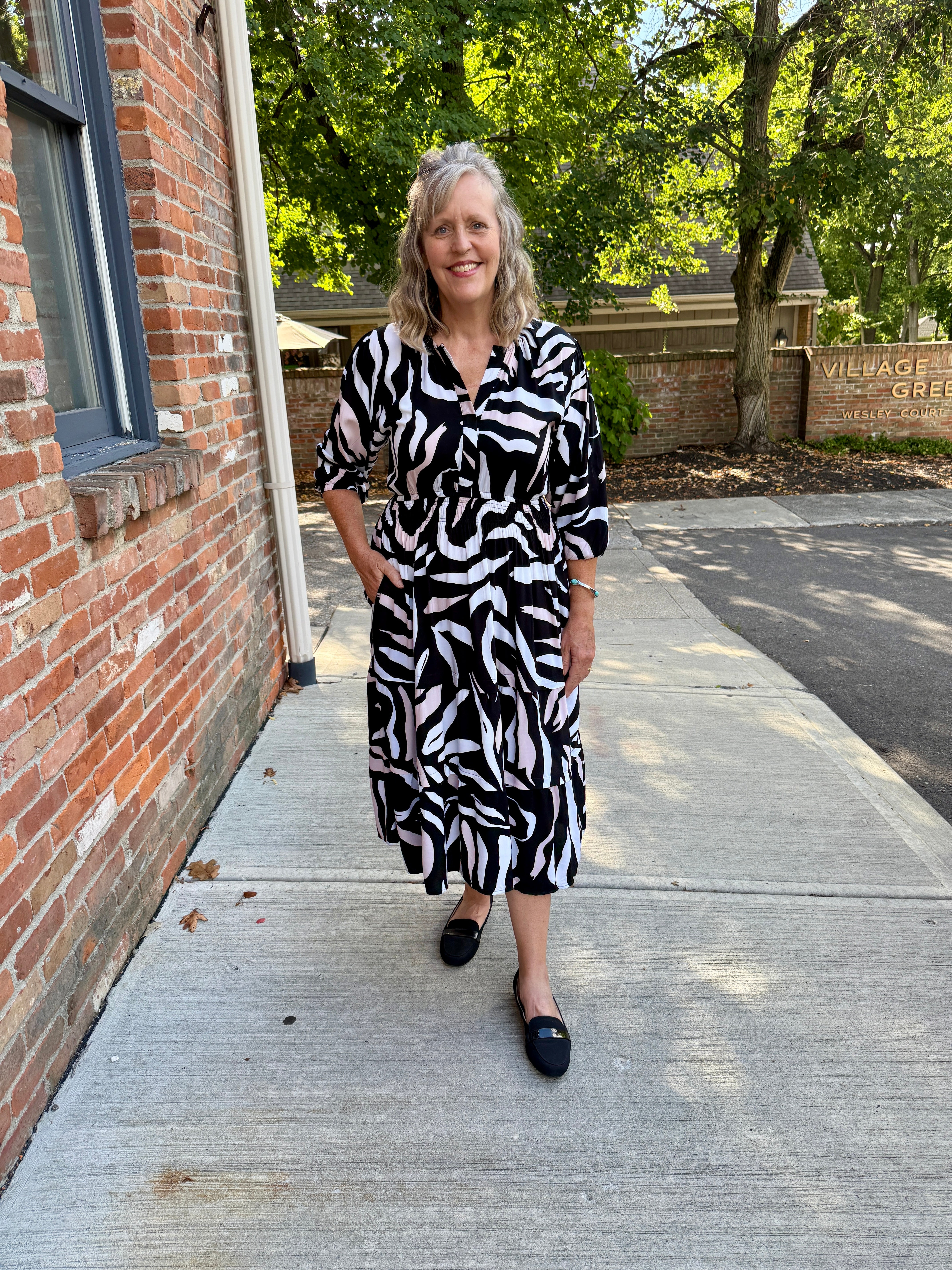 This dress is super flattering and comfortable. I'd give it a five but the pockets are pretty useless. A phone doesn't fit and anything else falls out. The pockets are way too small. Otherwise, it's lovely.