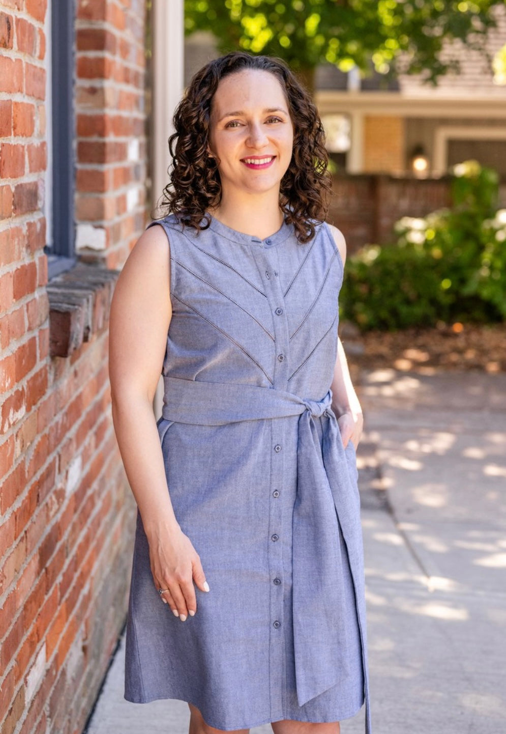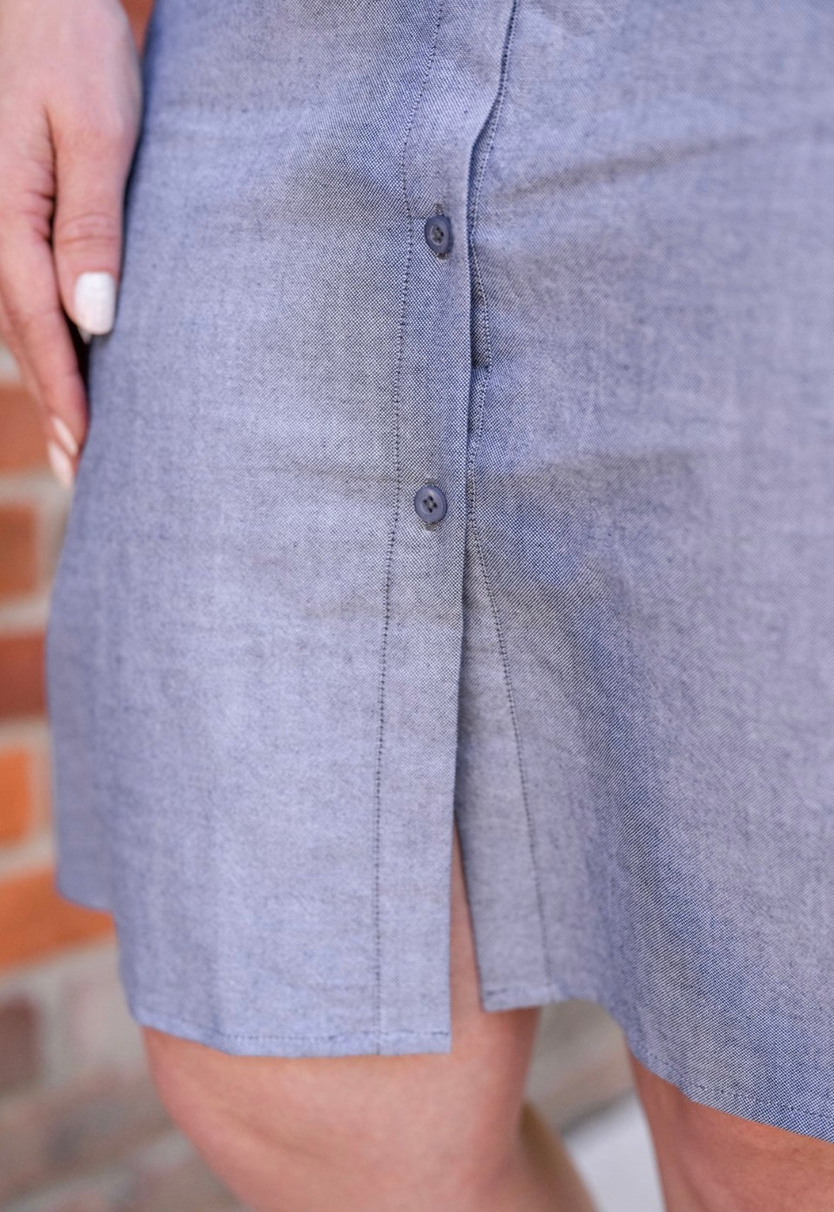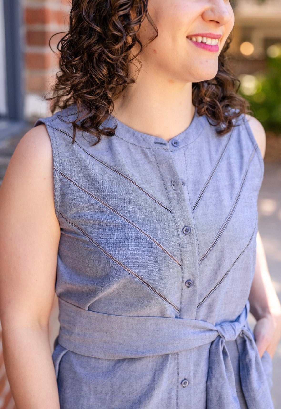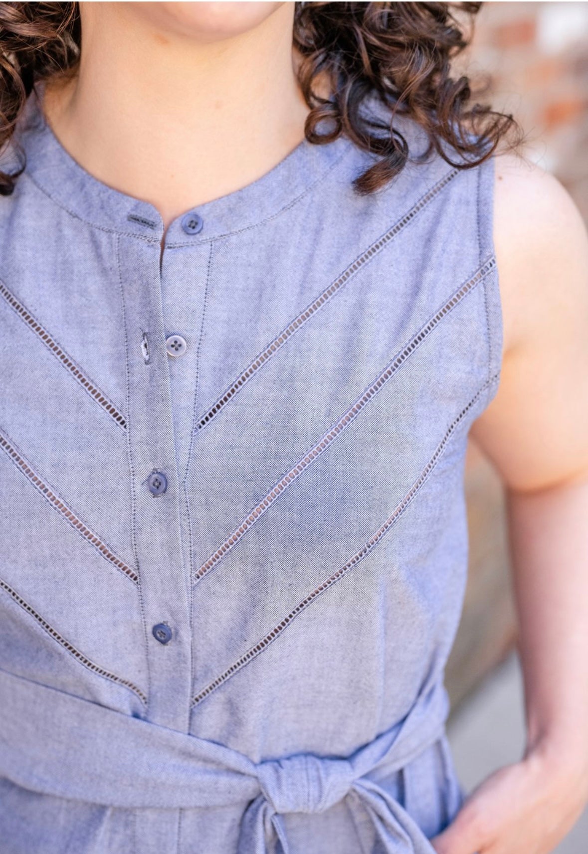 Discover effortless style with our Sleeveless Shirt Dress, crafted from 100% surplus woven cotton for sustainable fashion that doesn't compromise on quality. This dress features a flattering button-front design with unique matching lace detailing on both front and back.