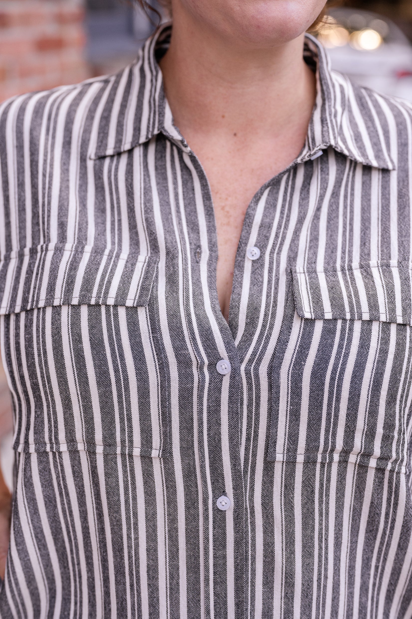 - Functional button-front design with breast-feeding accessibility