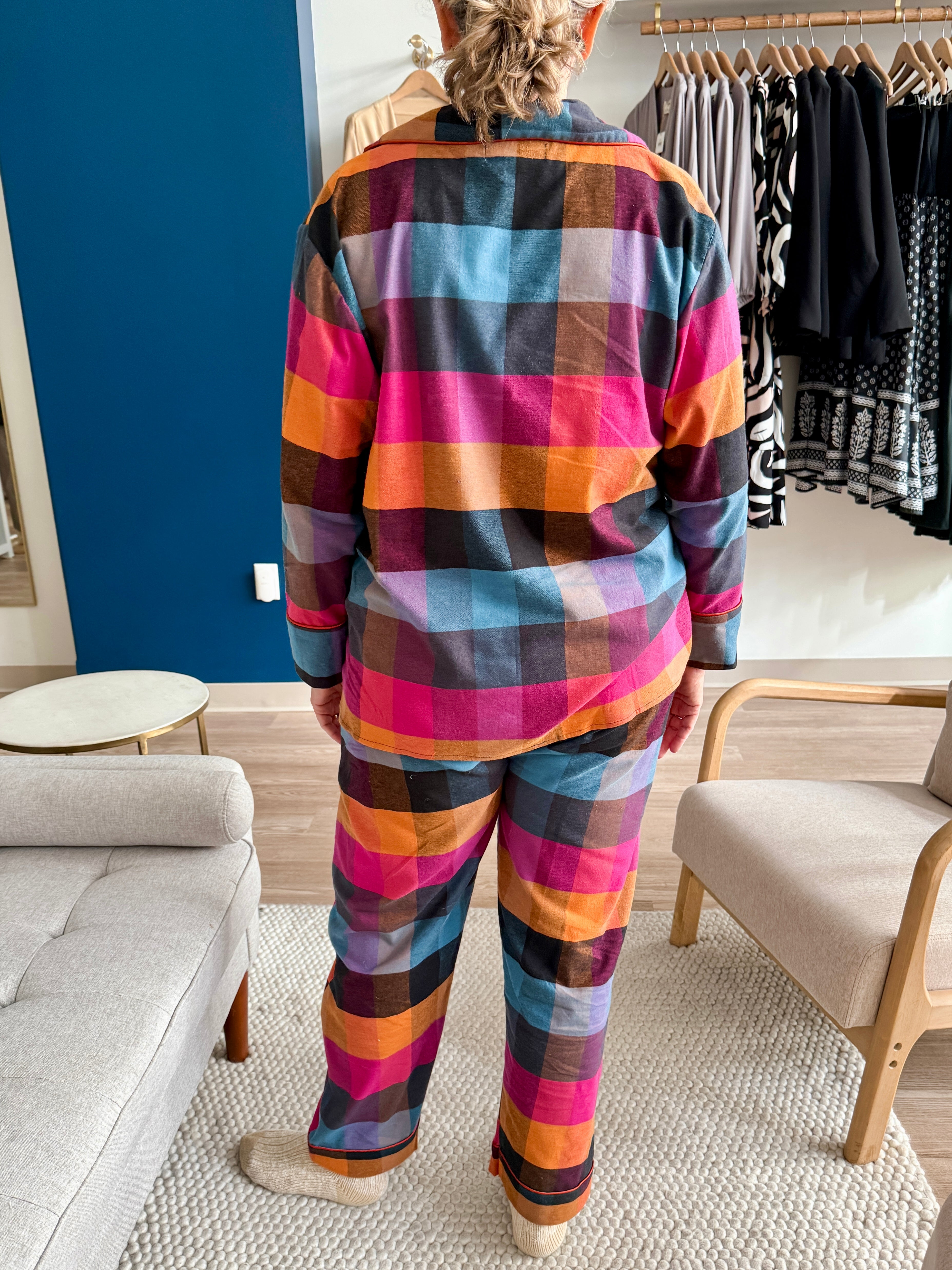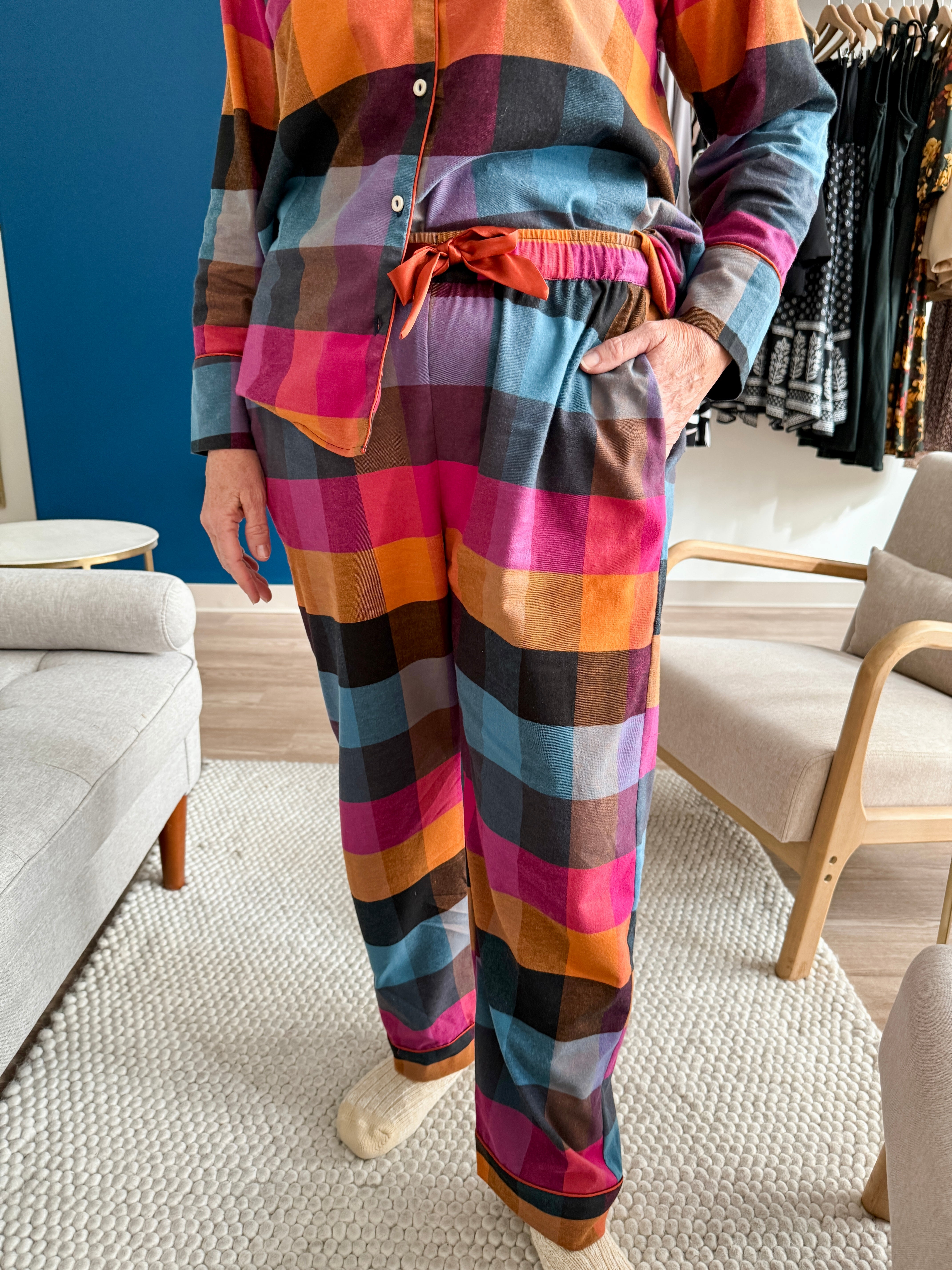 Luxurious comfort meets artisan craftsmanship. This limited-edition flannel pajama set features hand-made silk piping accents, a notched collar button-up shirt, and relaxed pants with an elastic waistband and silk drawstring.