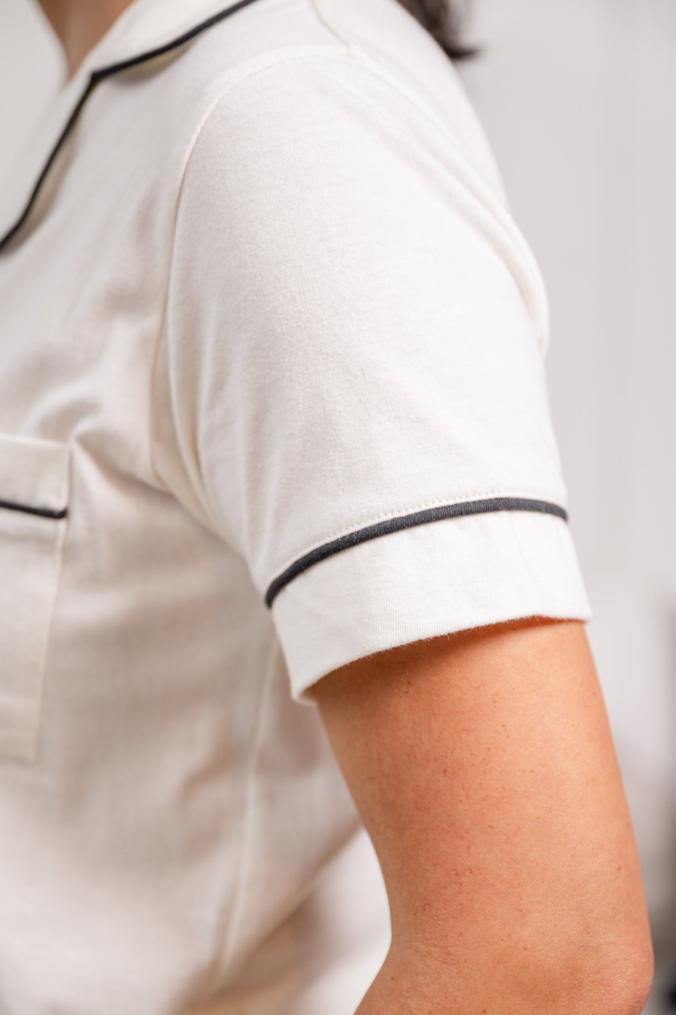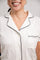 - Top: short sleeve with notch collar, piping, v-neckline, front buttons