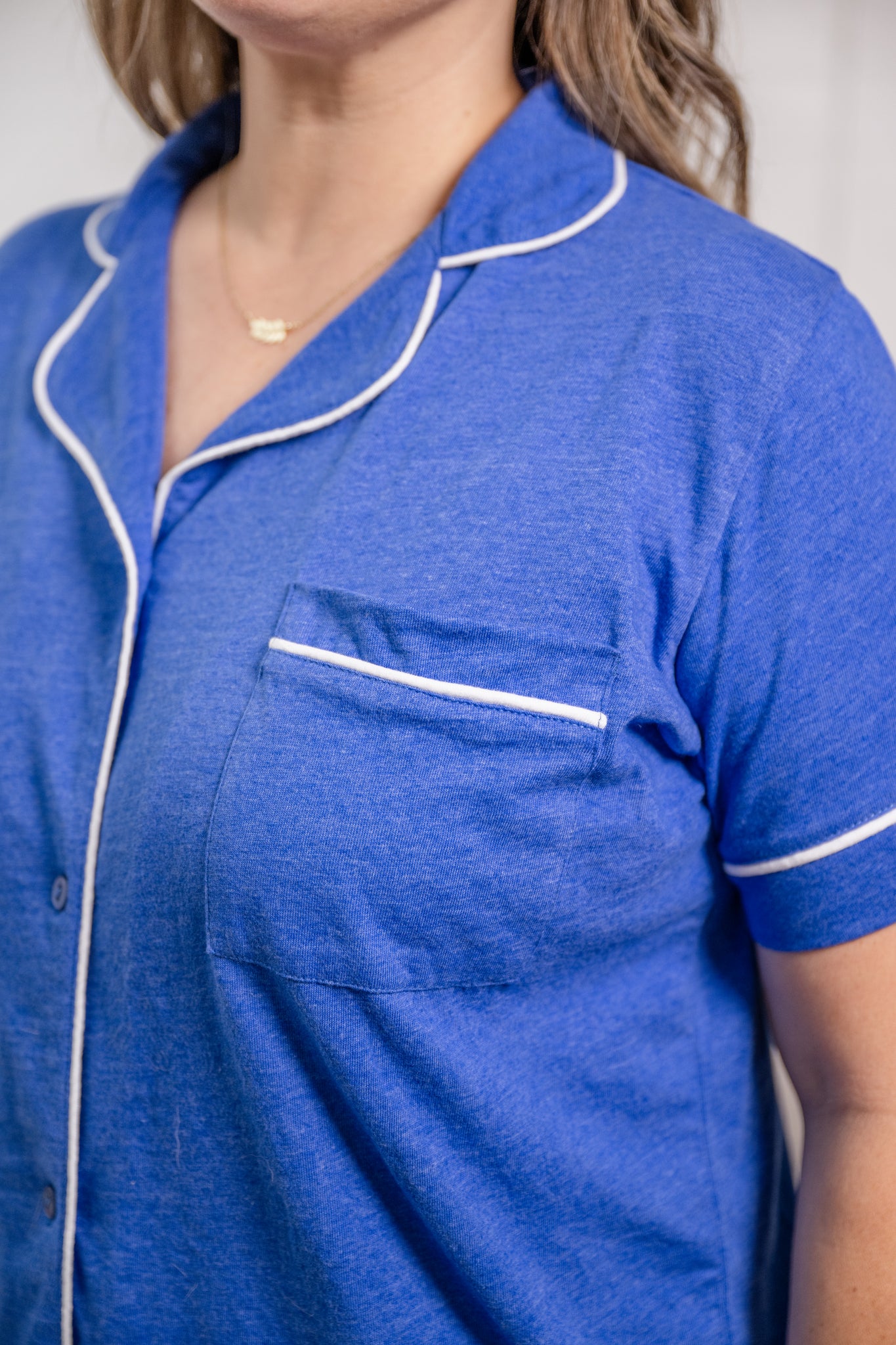 • Top: short sleeve with notch collar, piping, v-neckline, front buttons