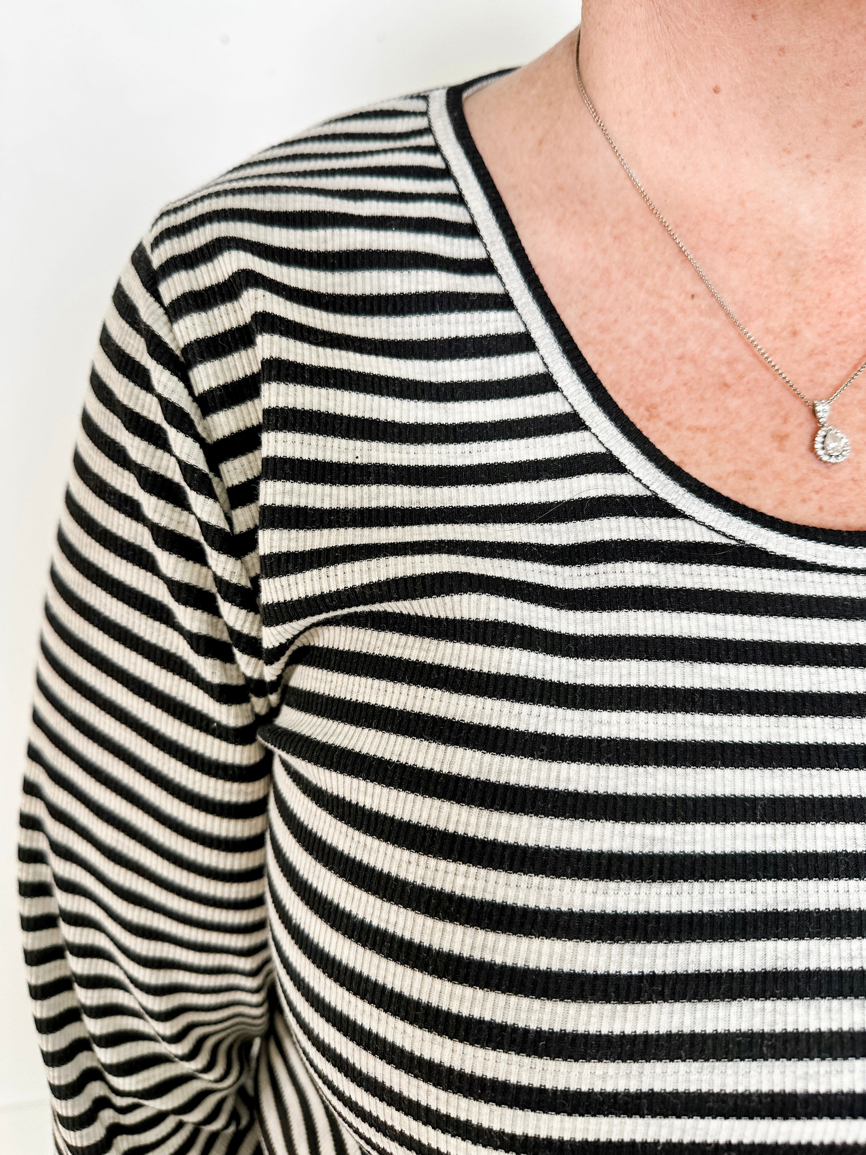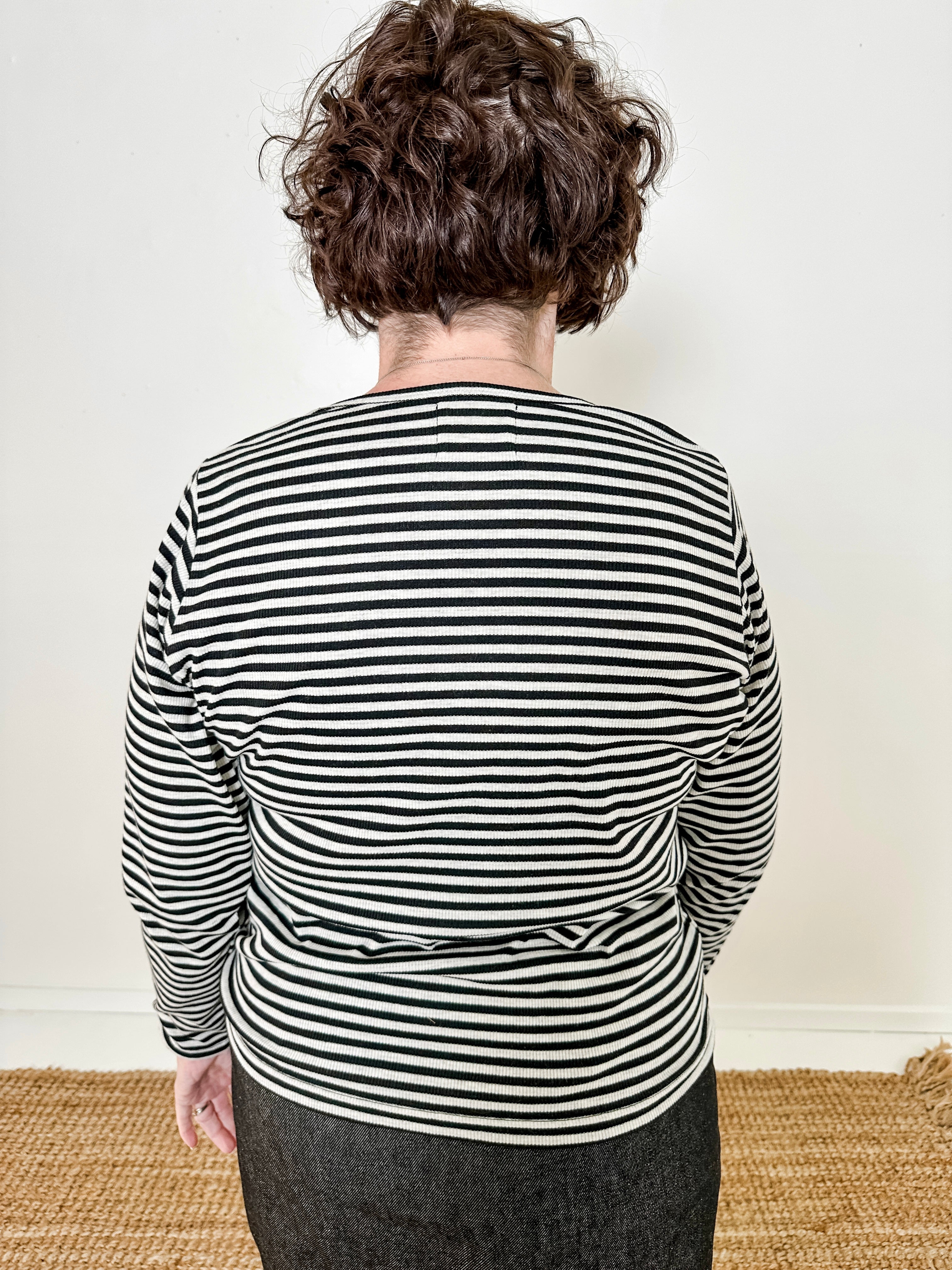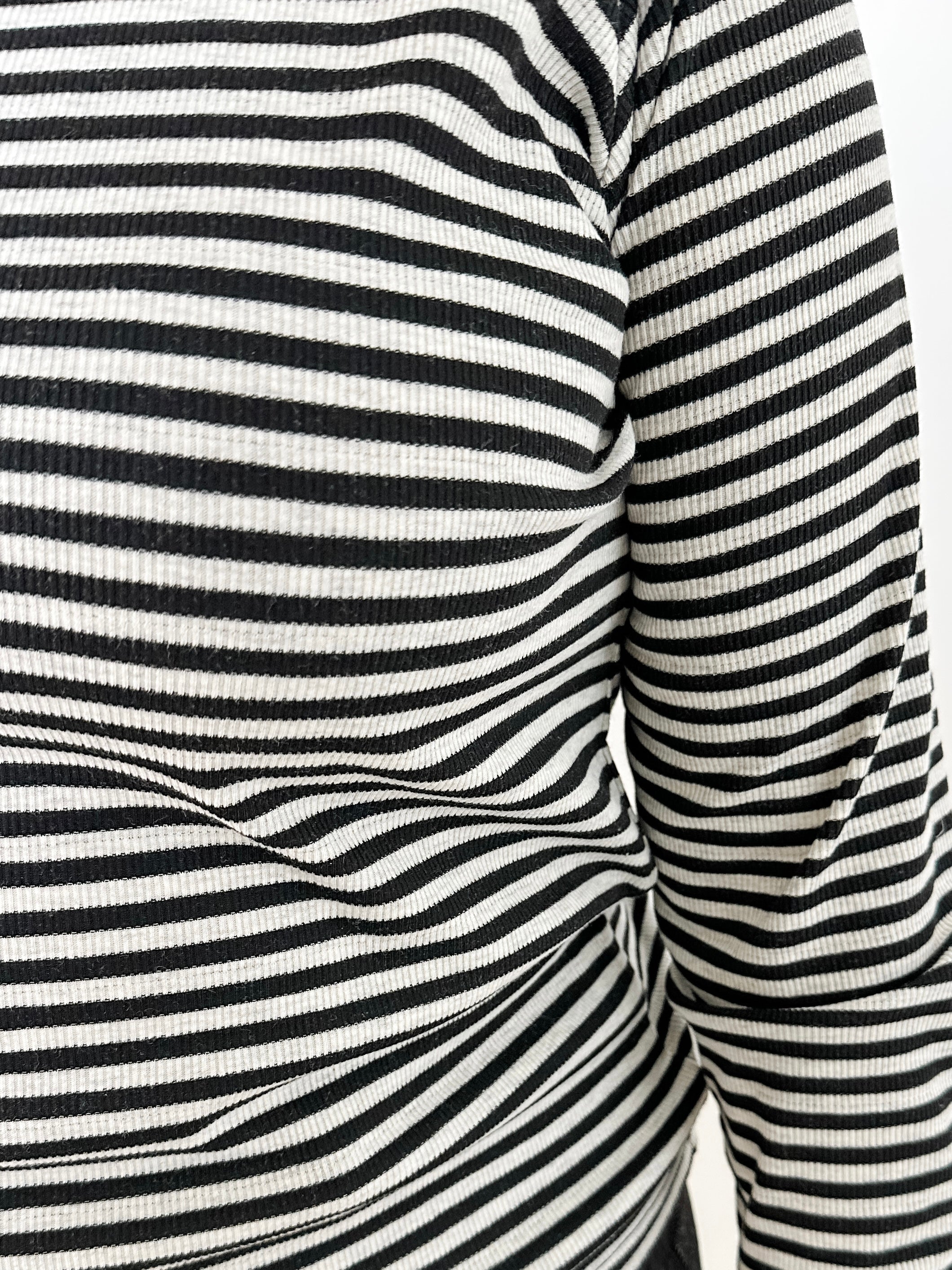 Classic long sleeve stripe knit top crafted from 100% cotton ribbed surplus fabric. Features a scooped crew neckline and straight fit for comfortable everyday wear.