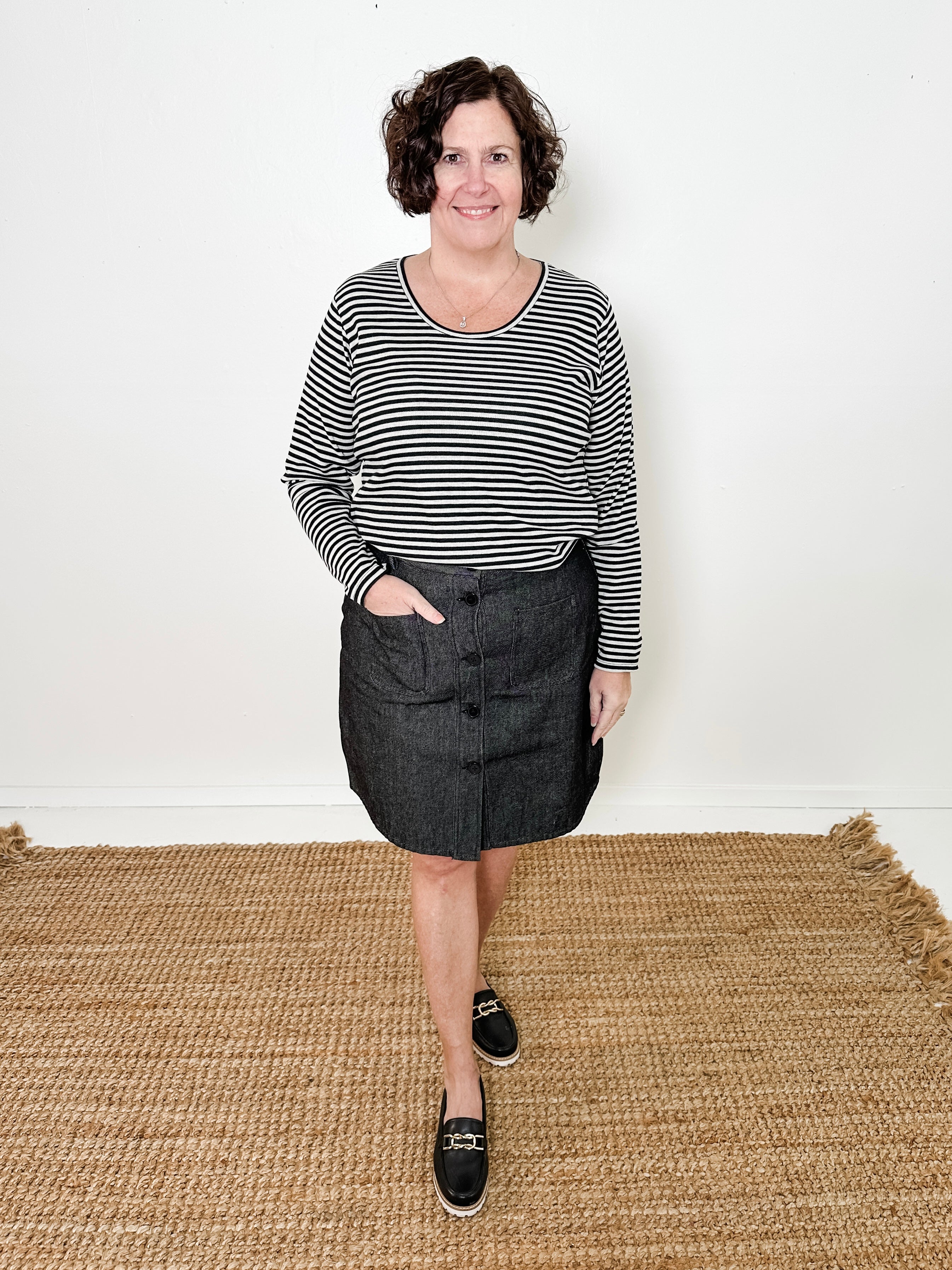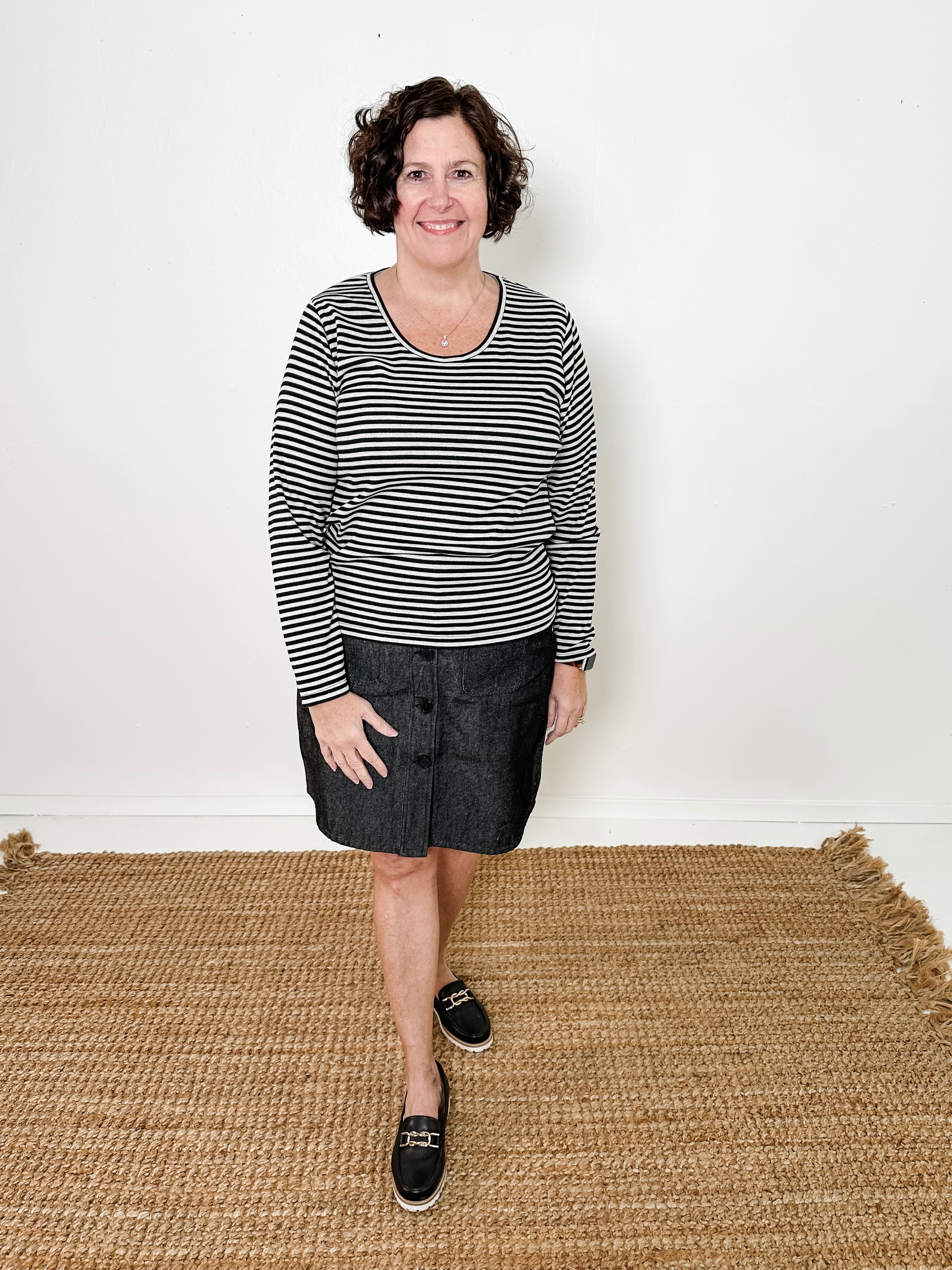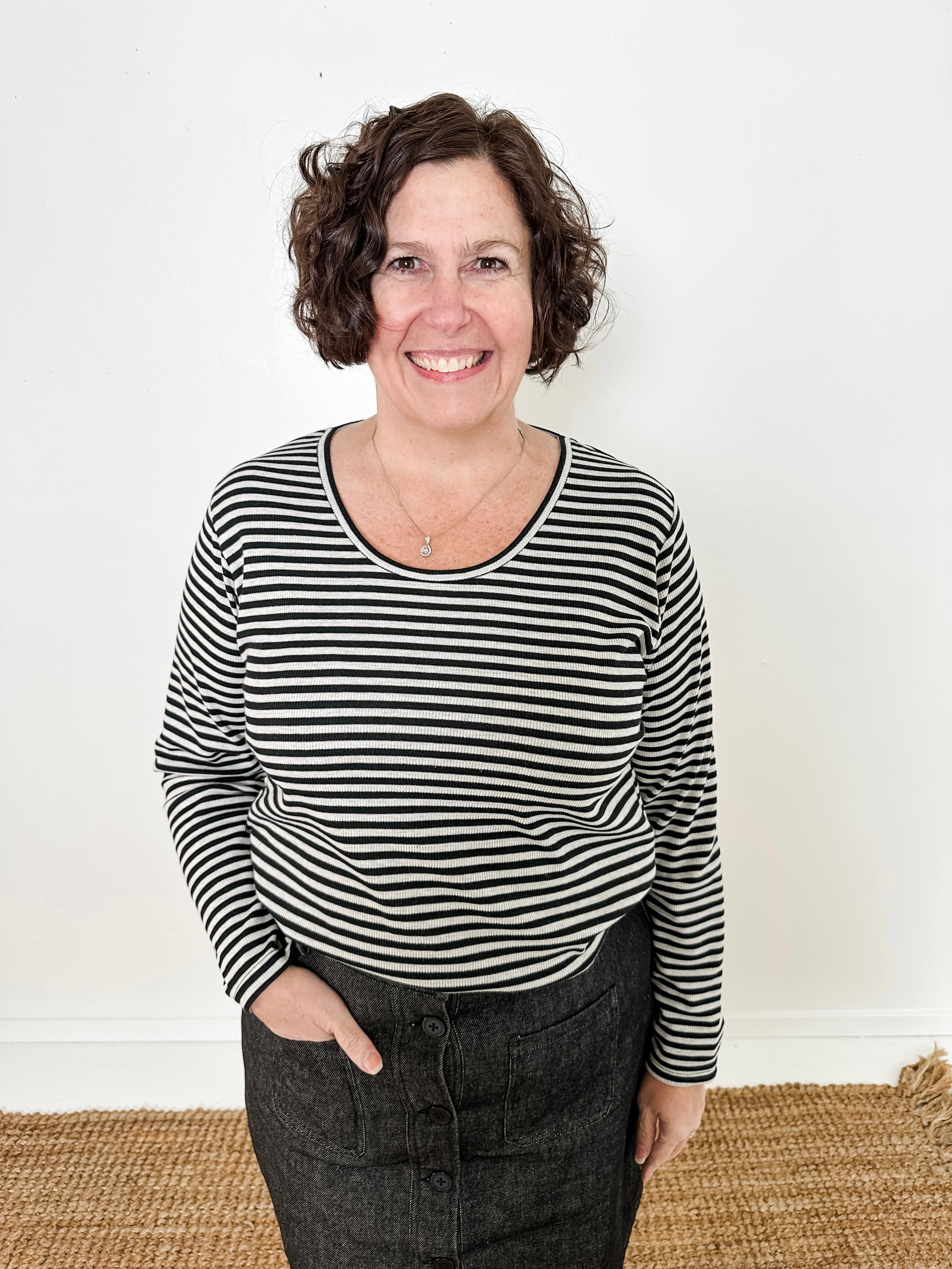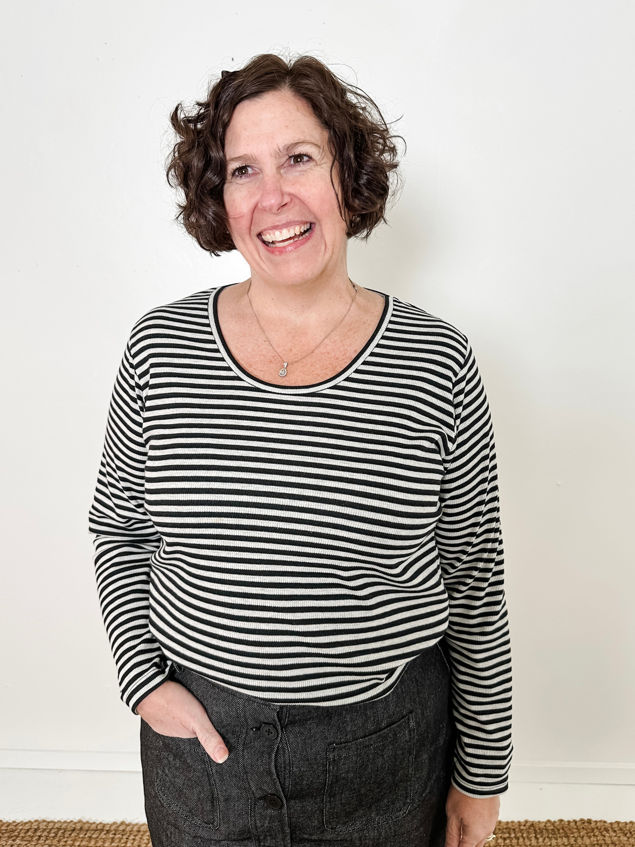 Classic long sleeve stripe knit top crafted from 100% cotton ribbed surplus fabric. Features a scooped crew neckline and straight fit for comfortable everyday wear.