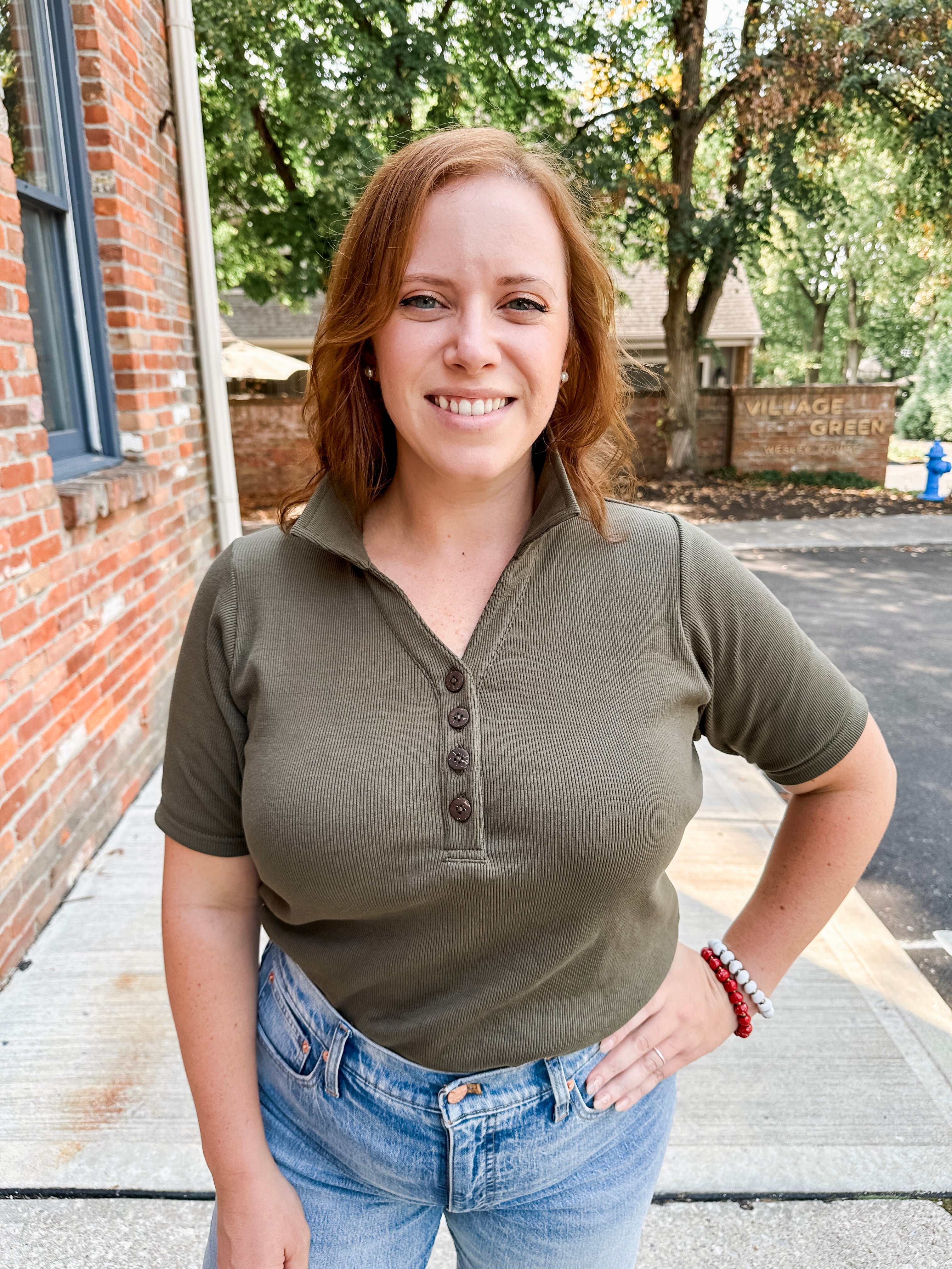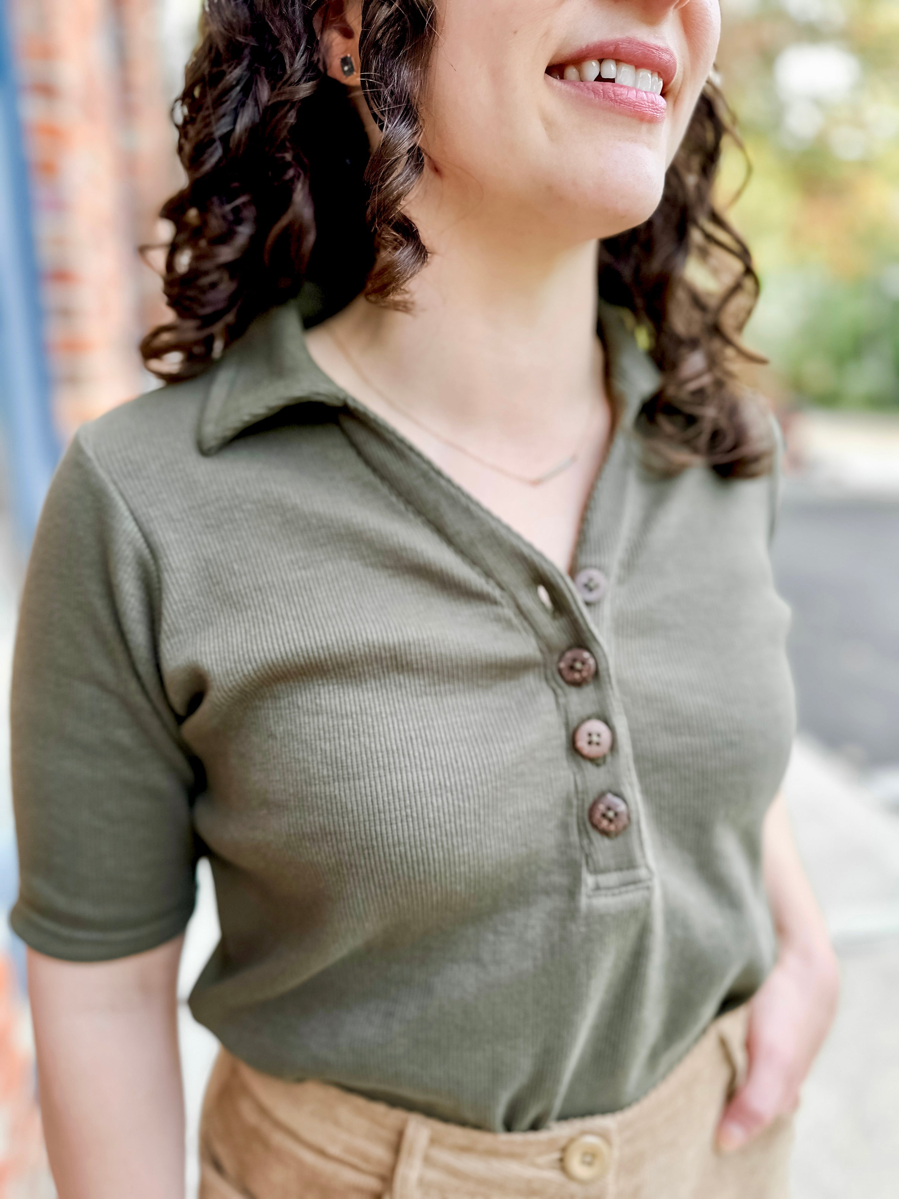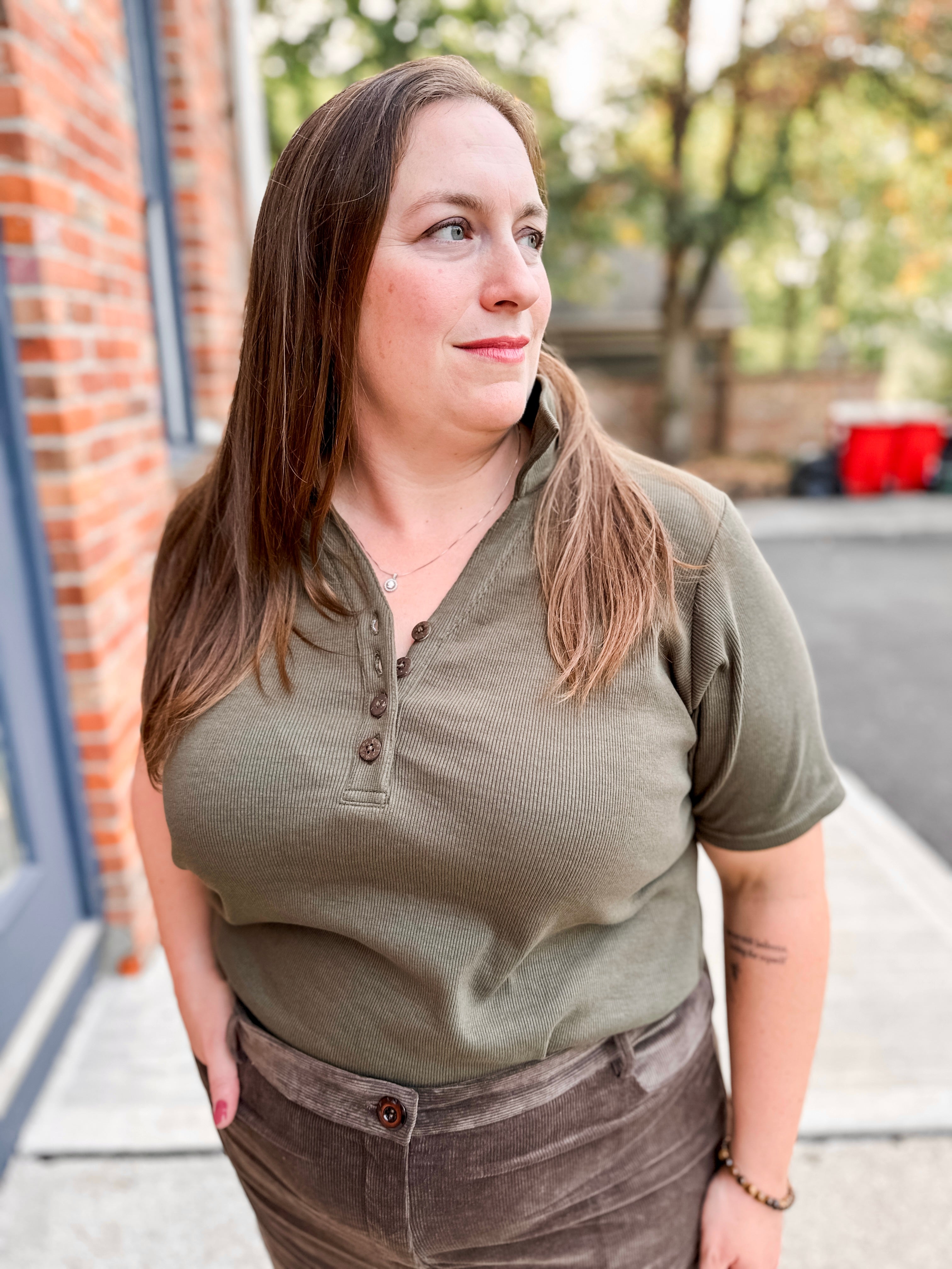 Classic ribbed henley polo top with button detail. Versatile style perfect for casual or dressed-up looks.