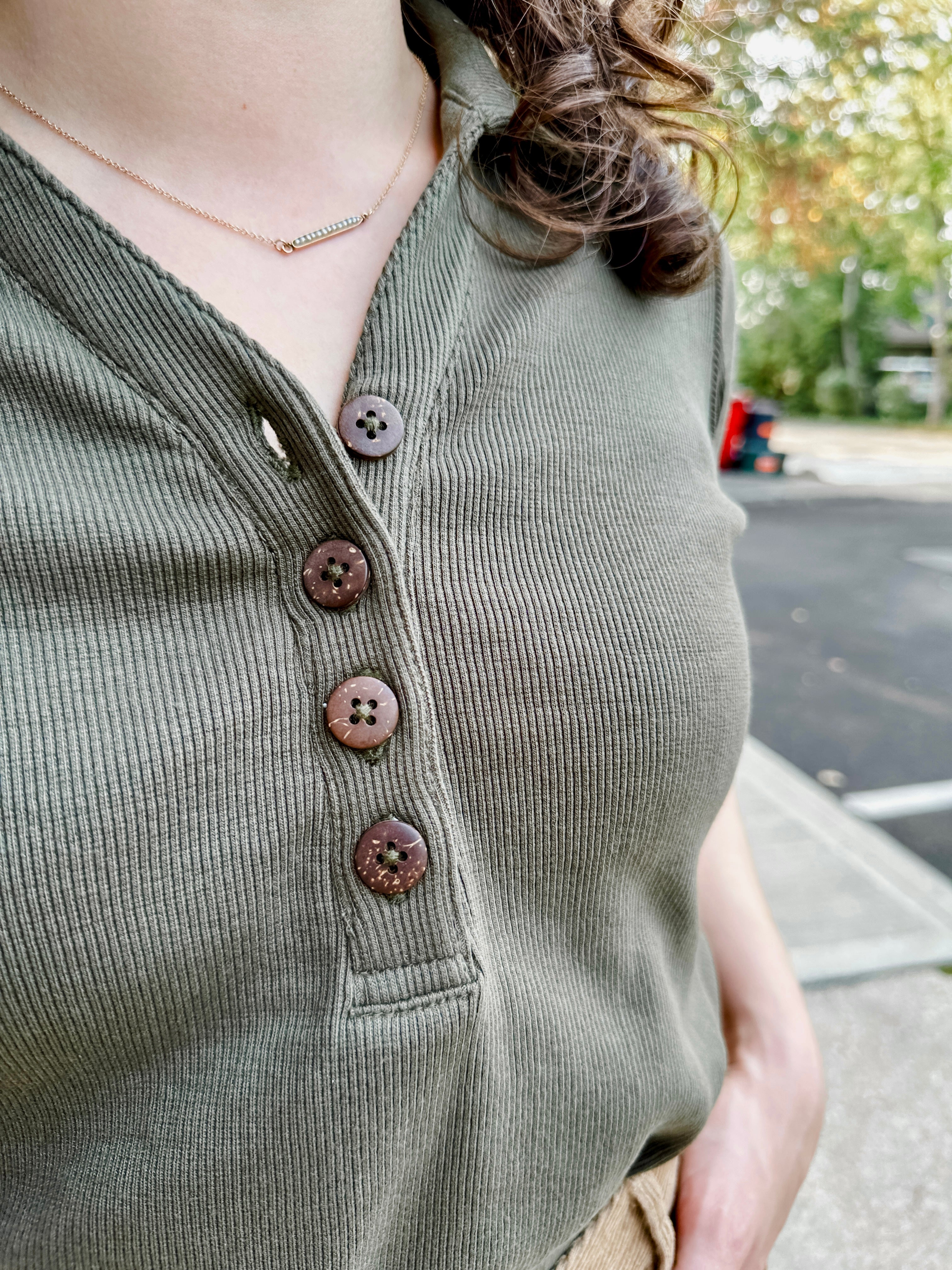- Henley-style button placket