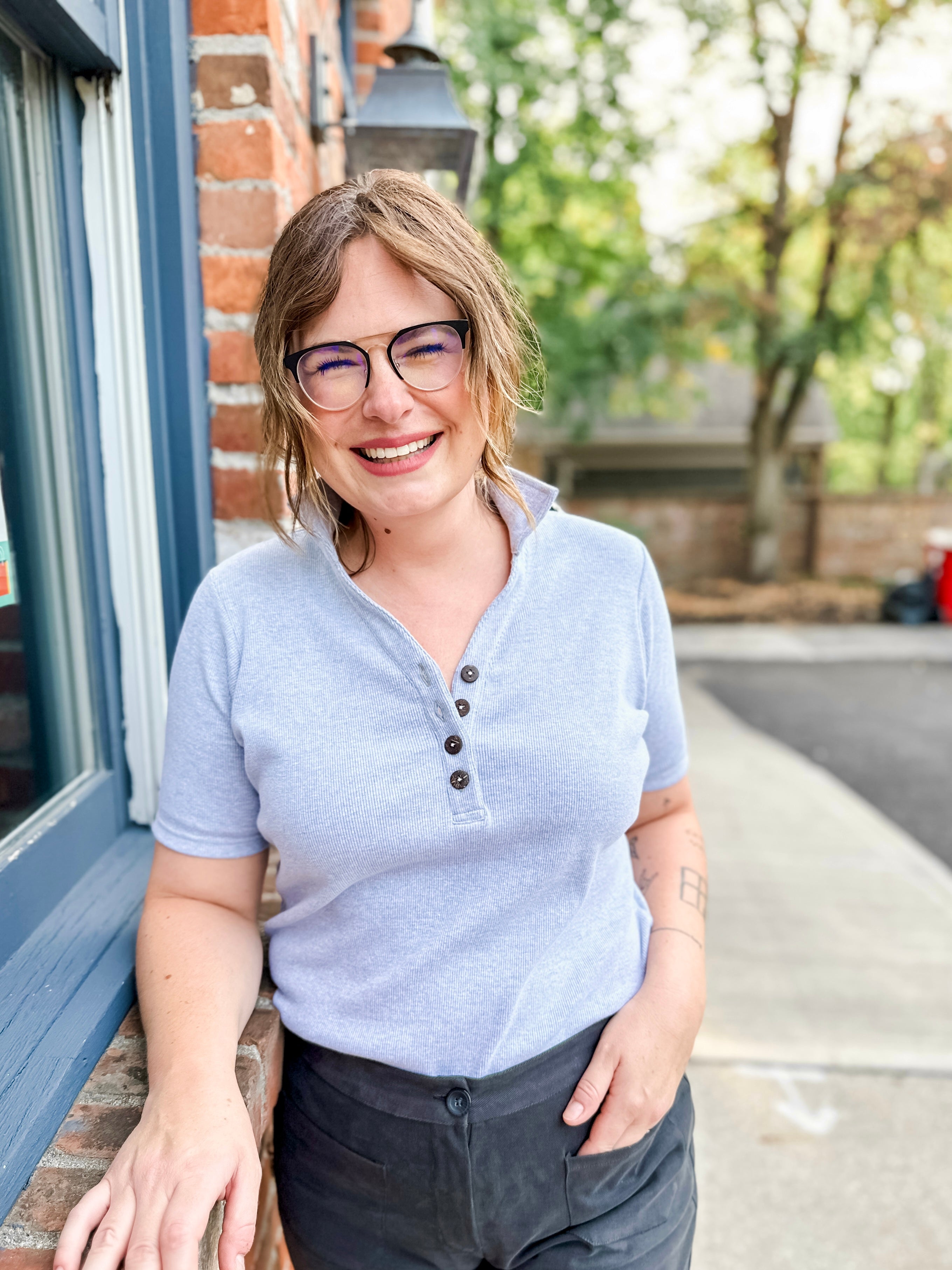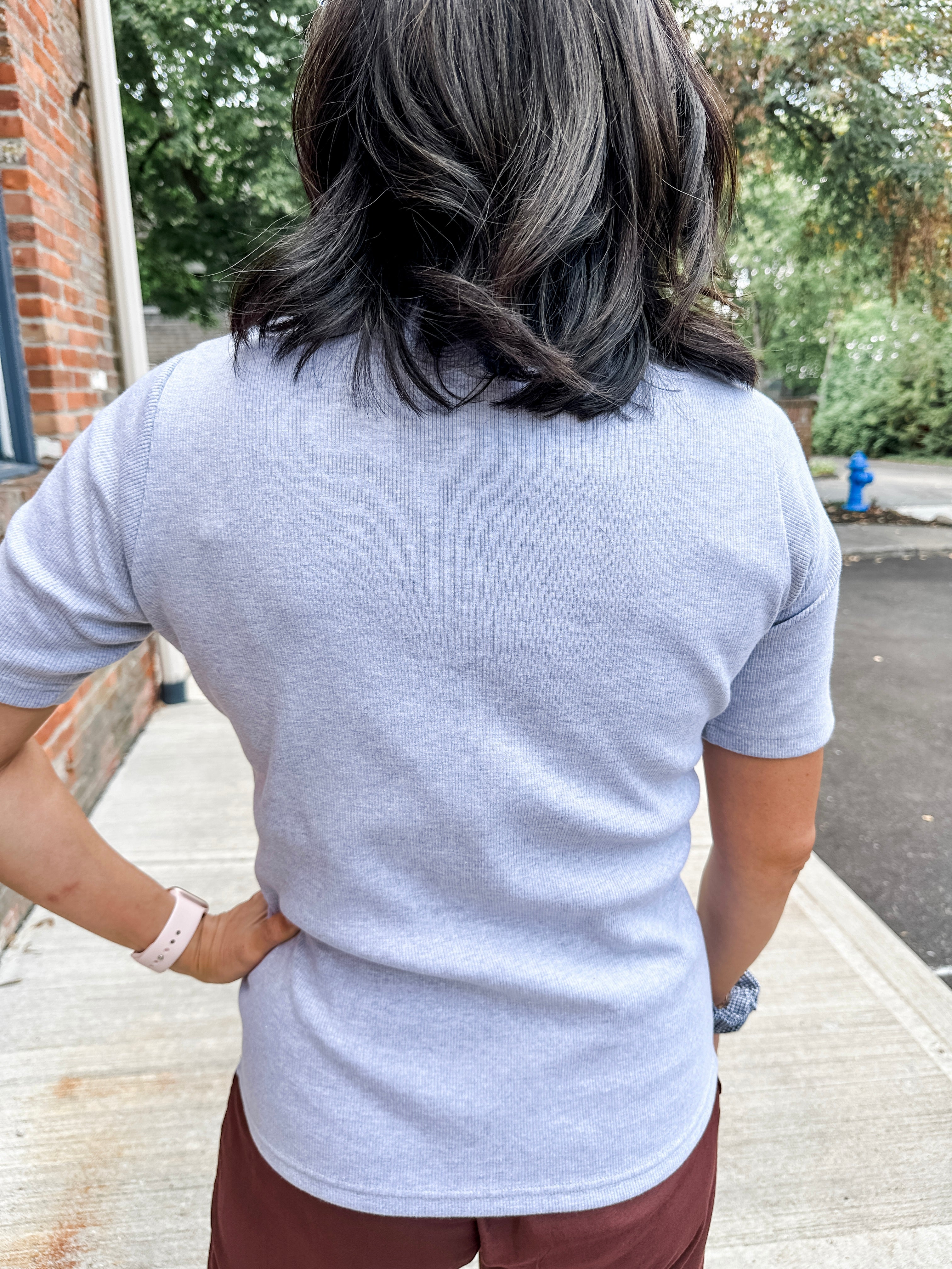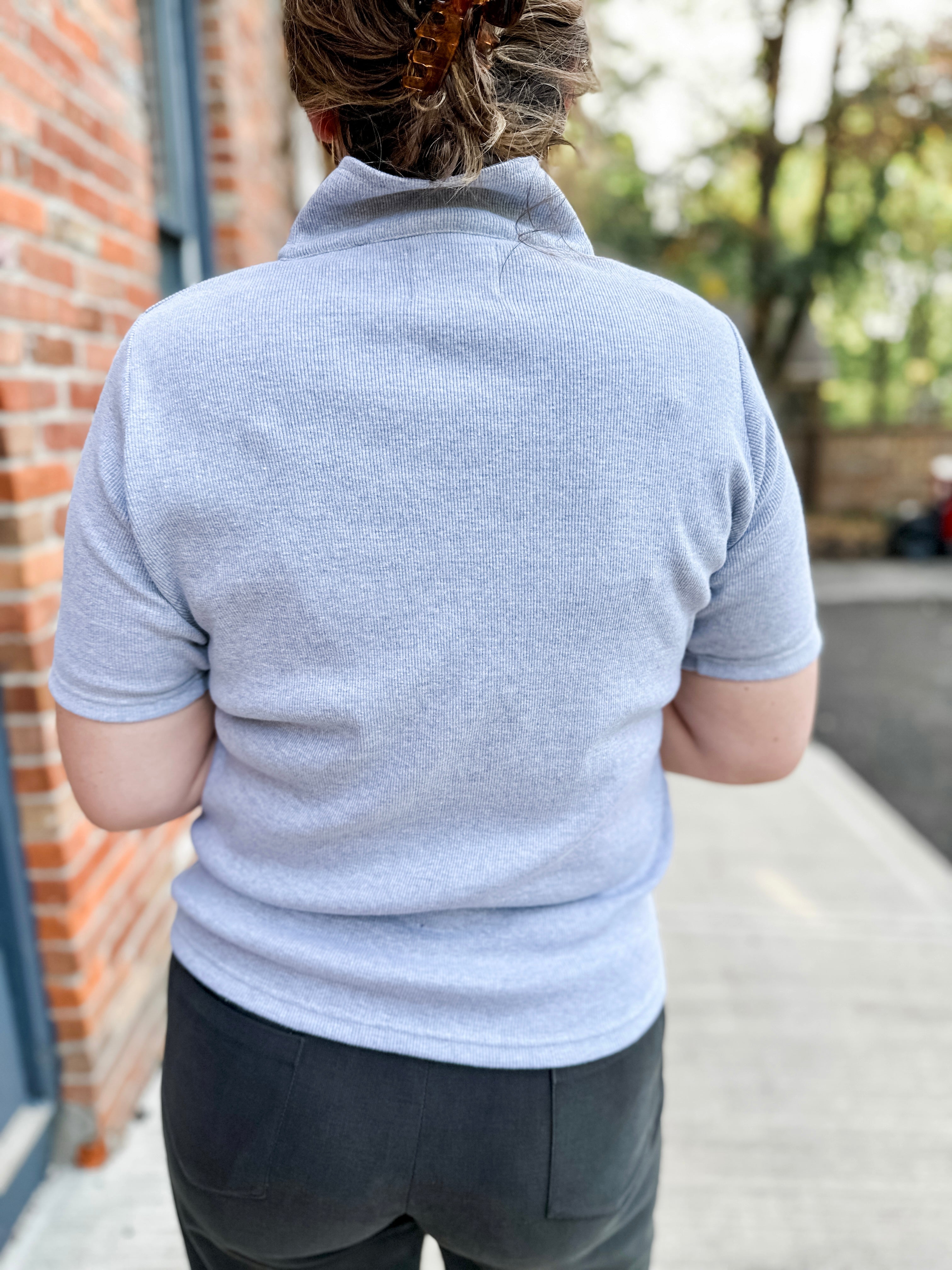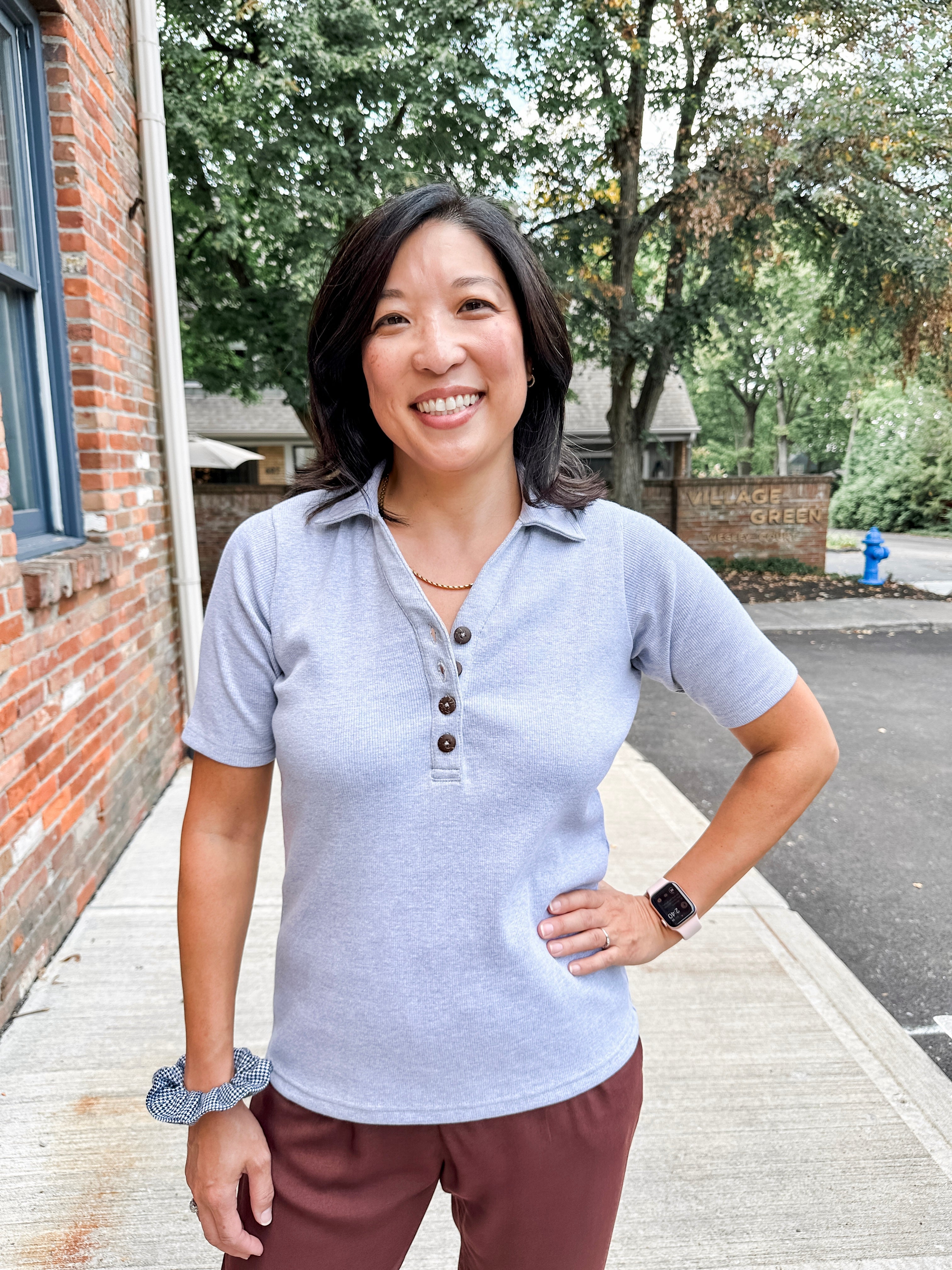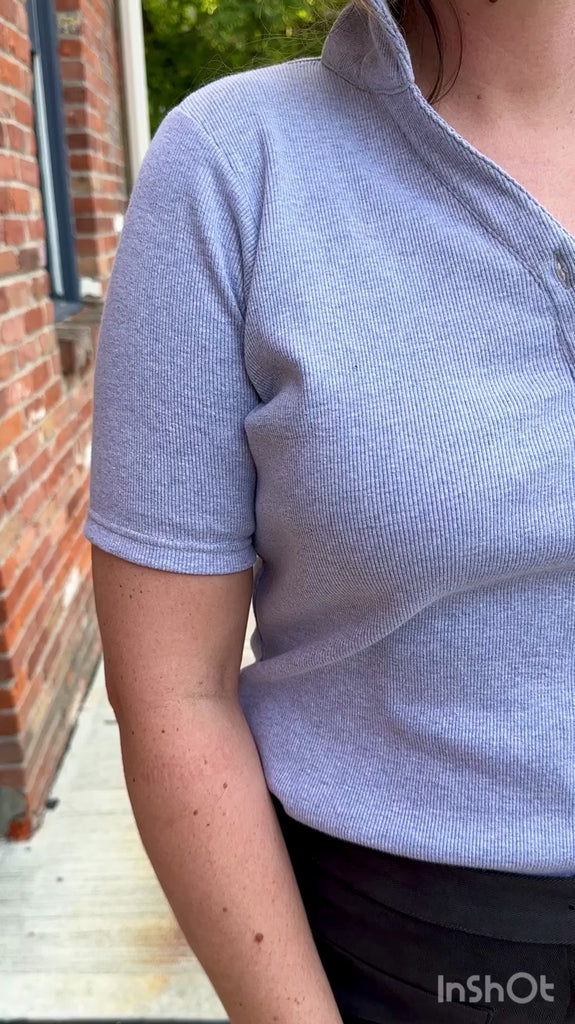 Classic ribbed henley polo top crafted from sustainable surplus cotton. Features a timeless collar and button placket for versatile everyday style.