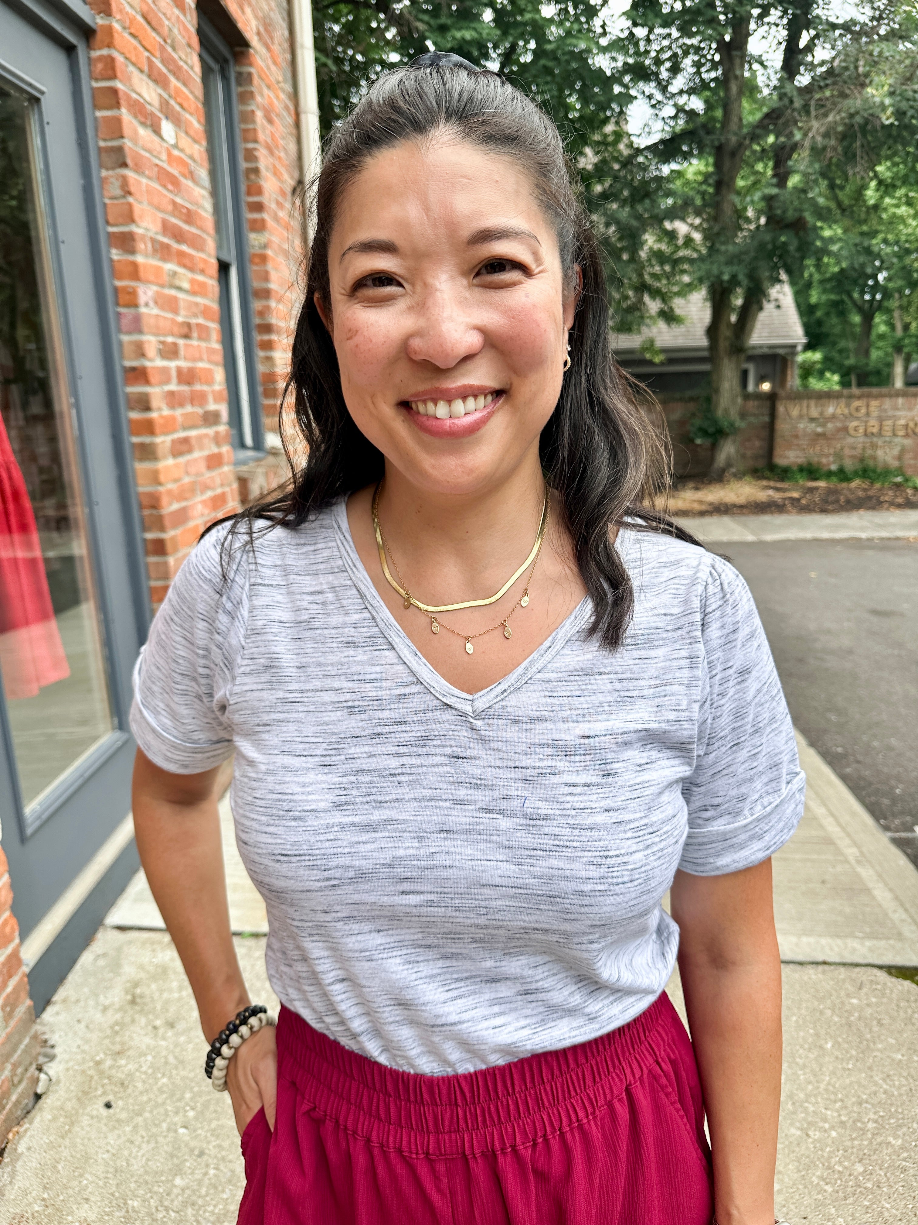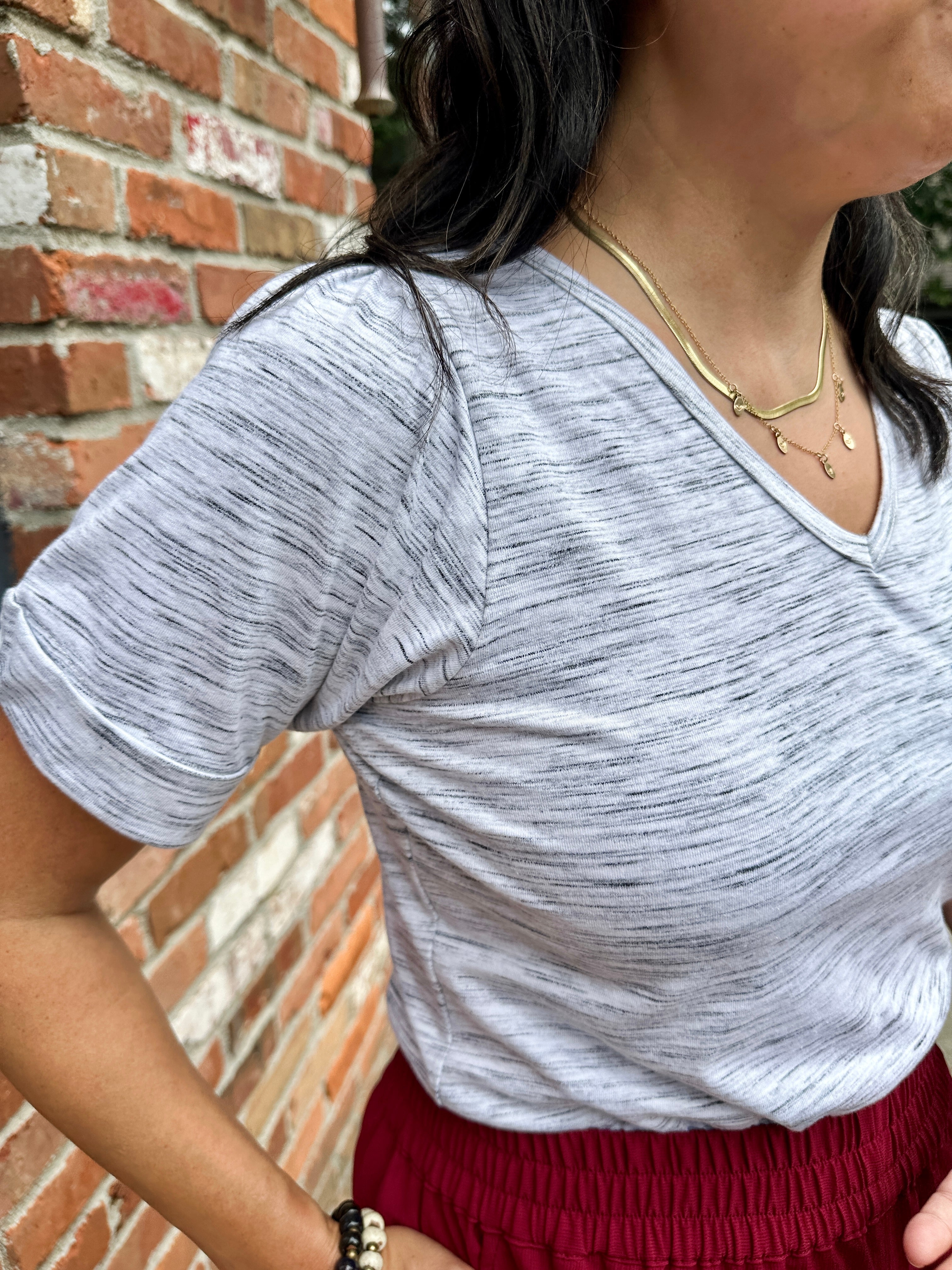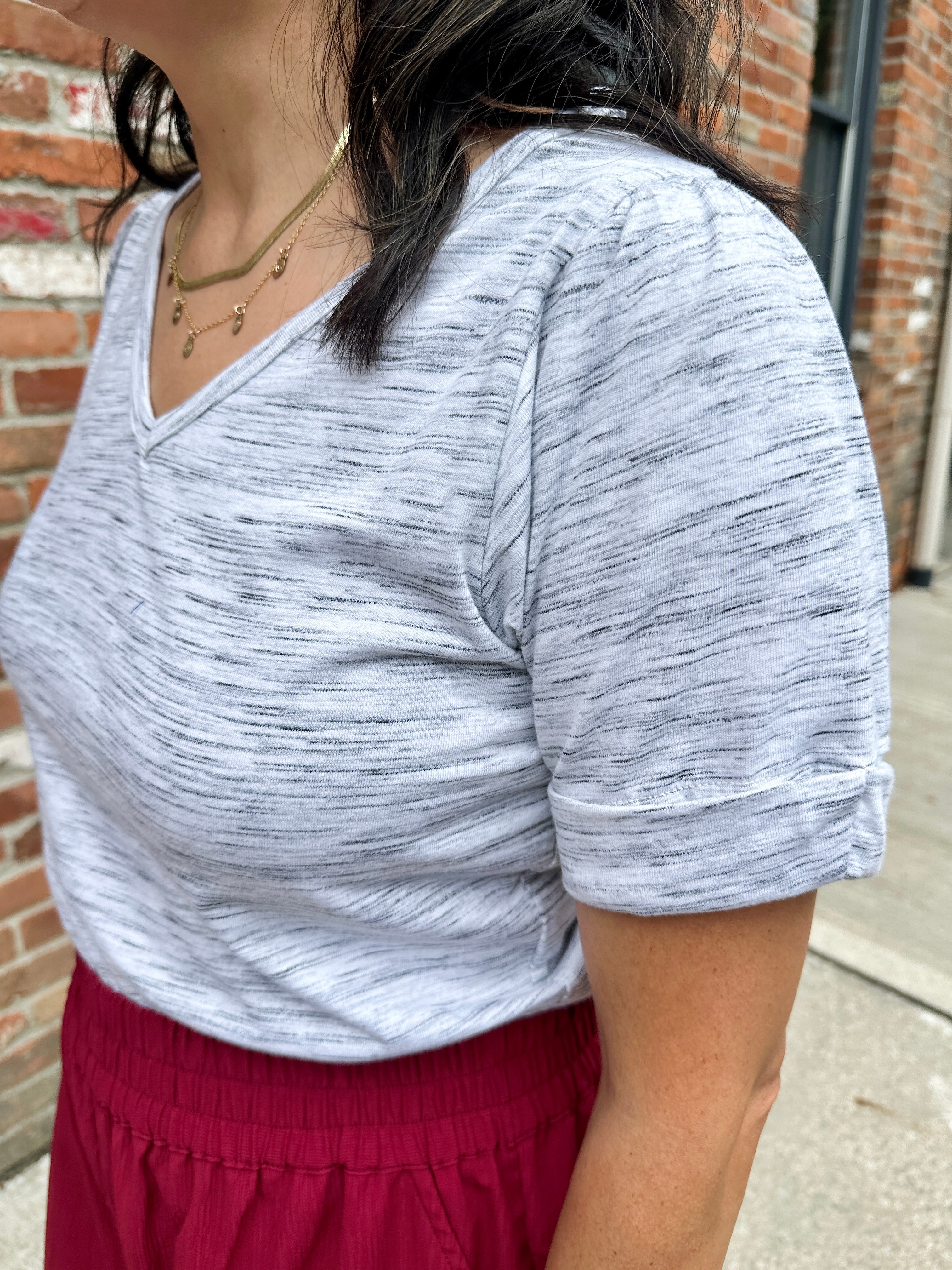 A classic v-neck tee with a modern twist. Features rolled cuffs and a flattering fit that hits at the high hip. Made from soft, lightweight 100% cotton knit with medium stretch.
