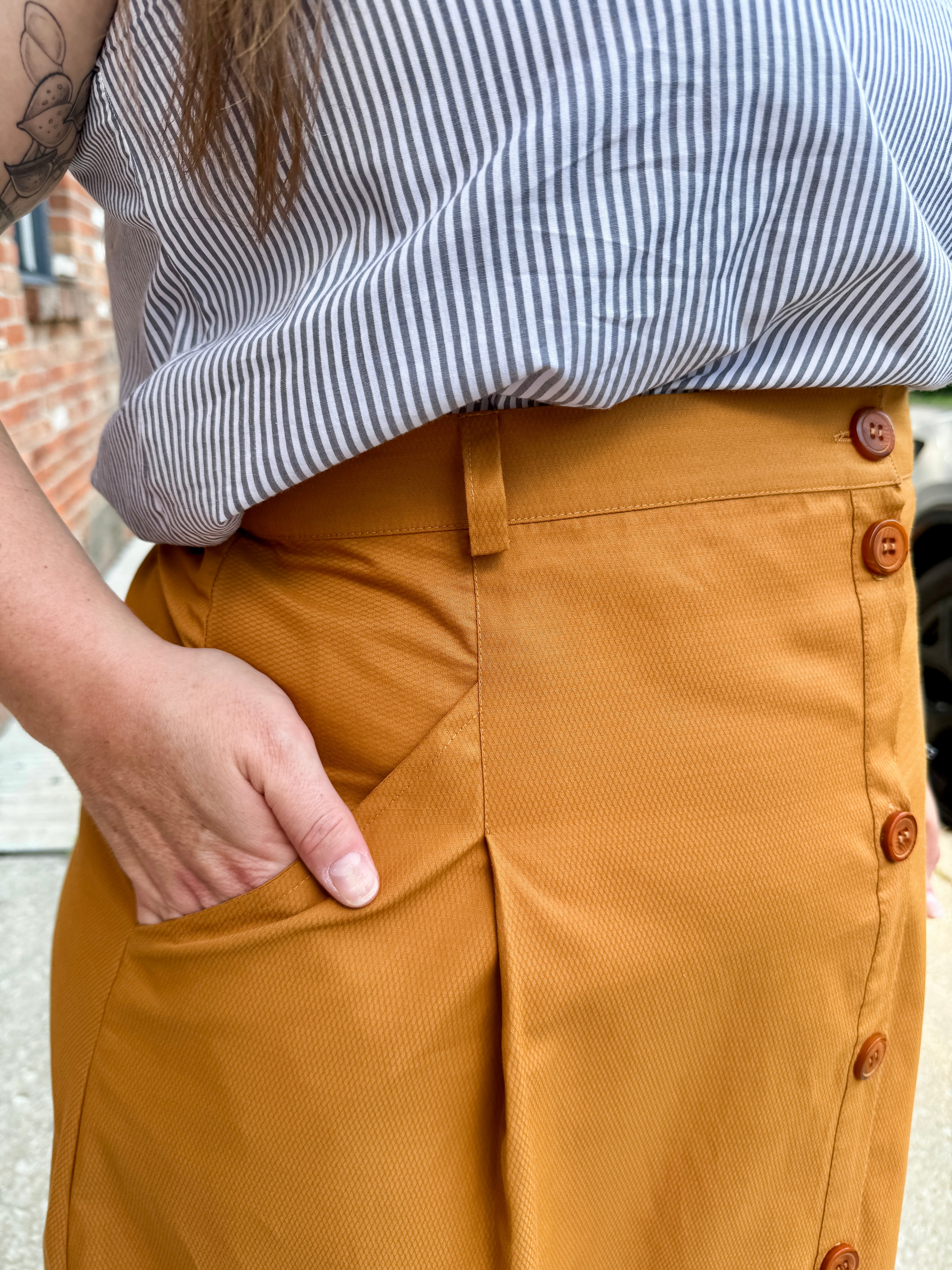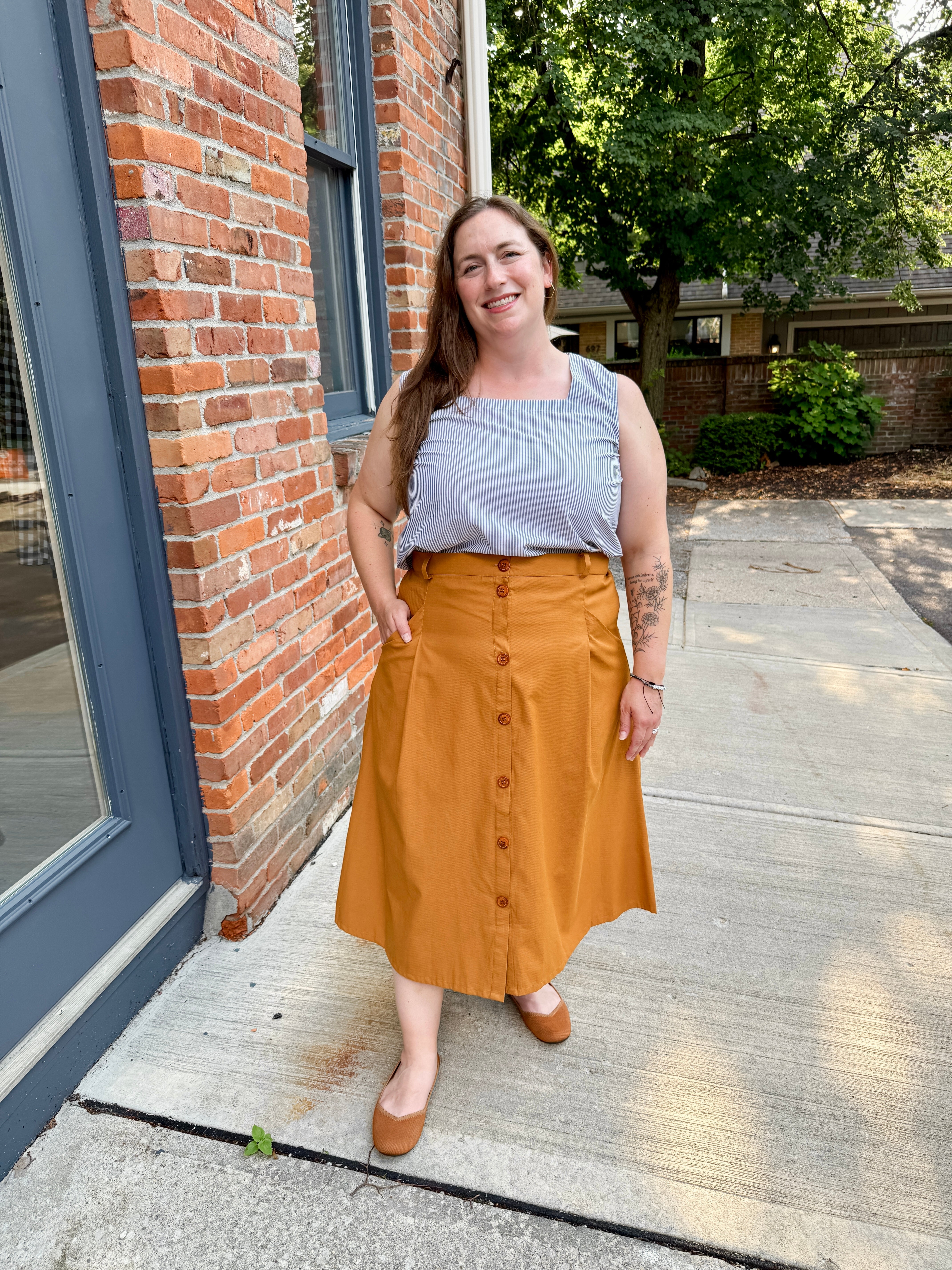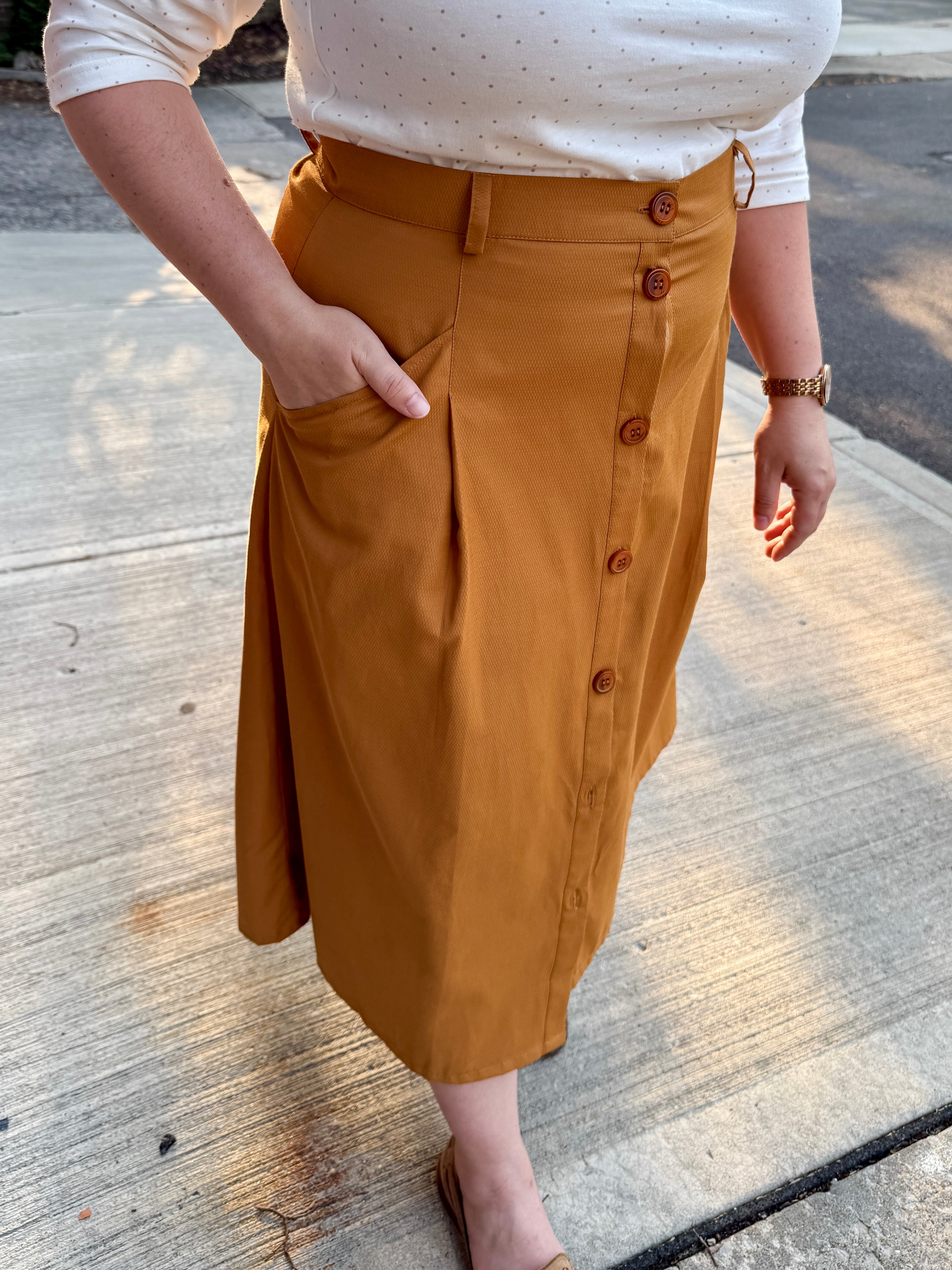 Elevate your fall wardrobe with this thoughtfully crafted A-Line Button Front Skirt. The flattering A-line silhouette features functional front buttons with a clever snap detail between the top buttons to prevent gapping — no more wardrobe malfunctions!
