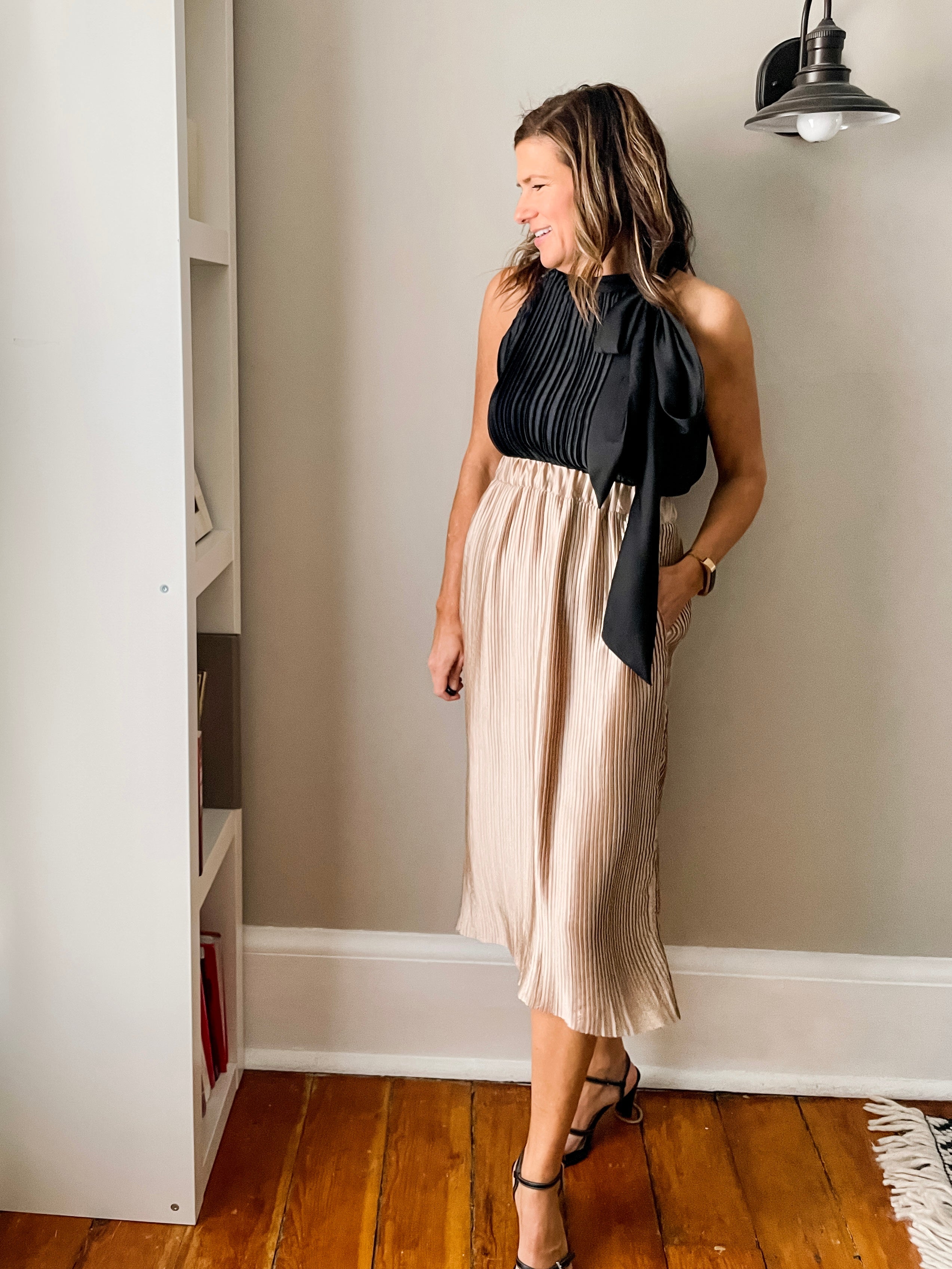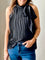 Elegant sleeveless pleated top in classic black. Features sophisticated pleating detail for a polished, professional look. Perfect for work or special occasions.