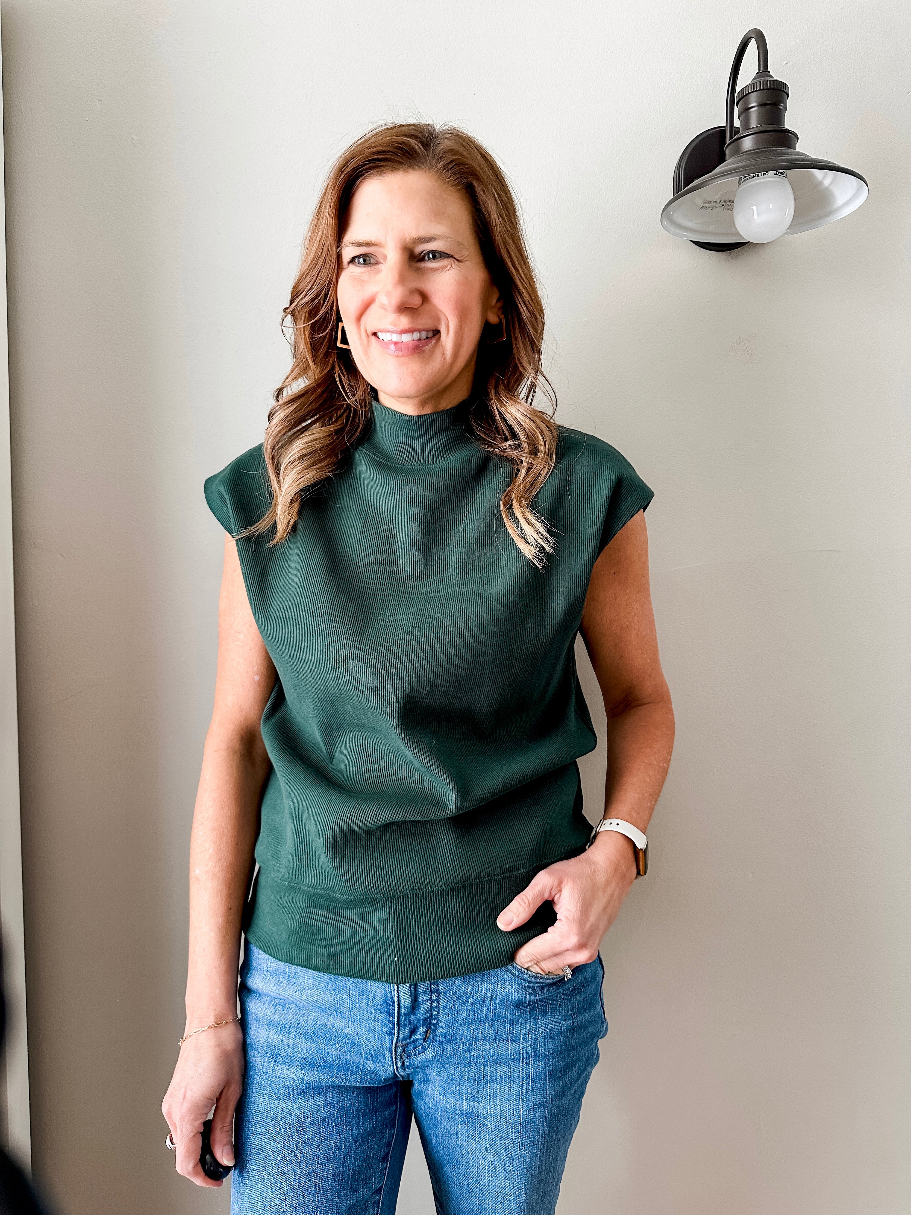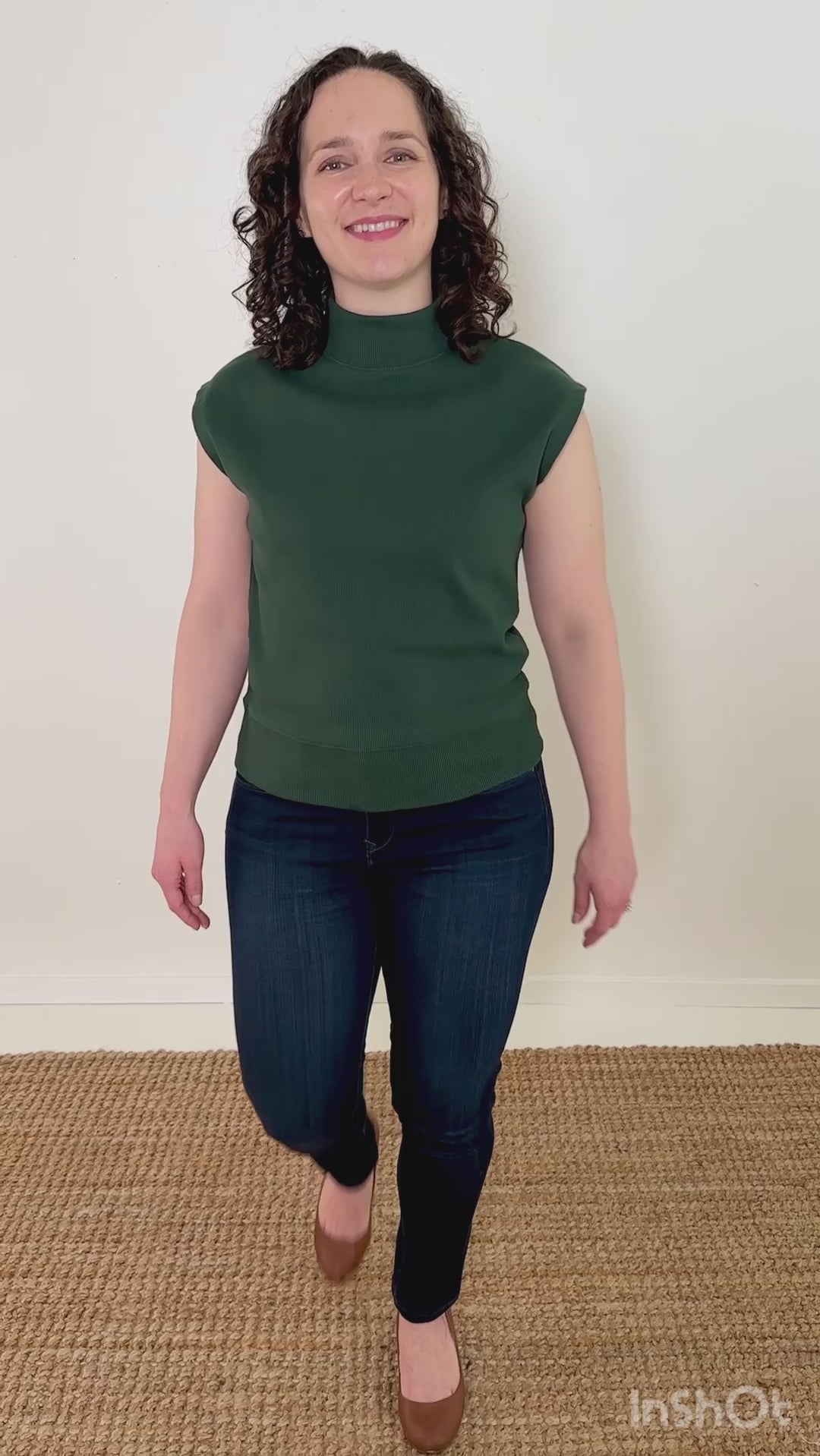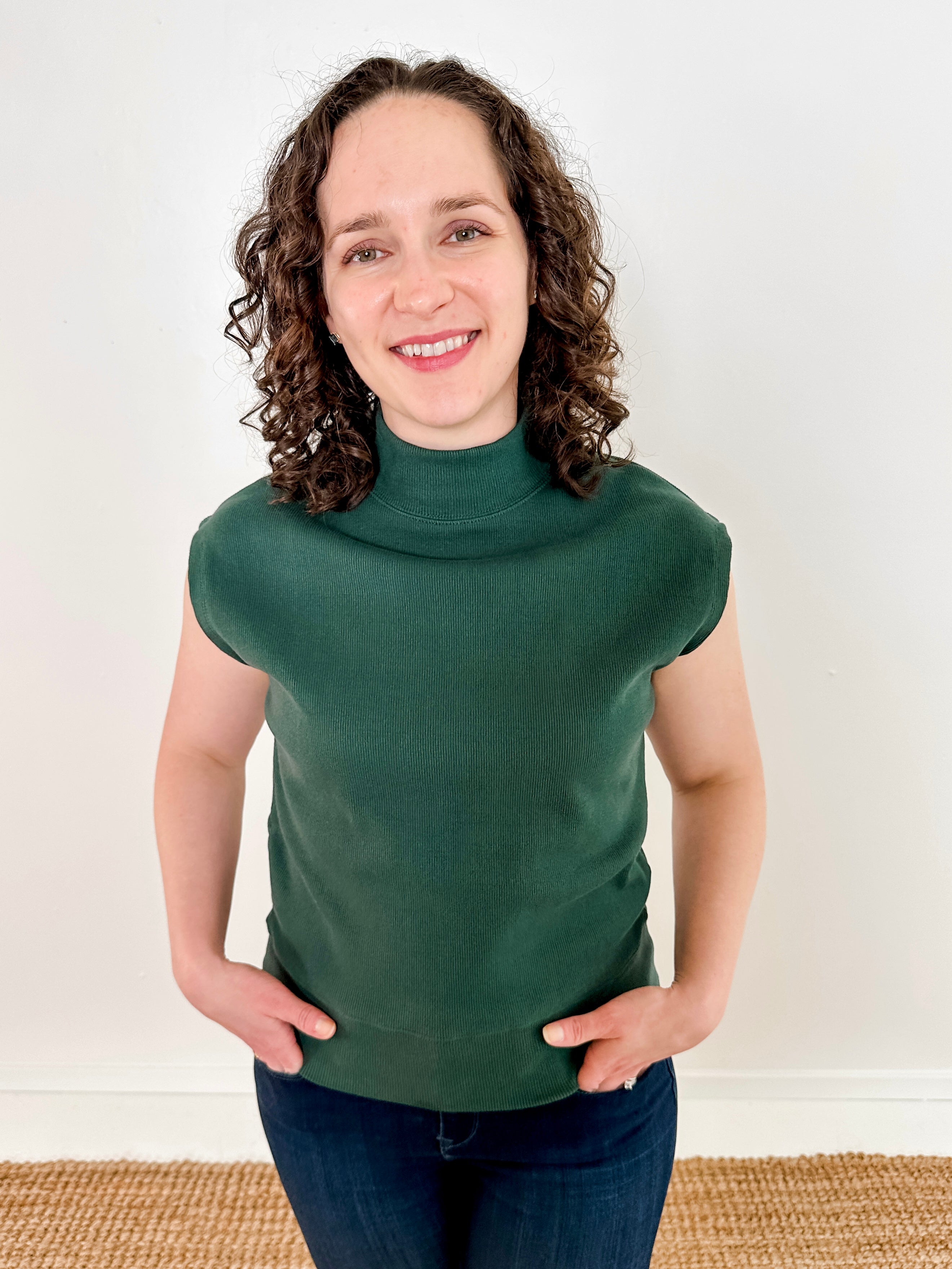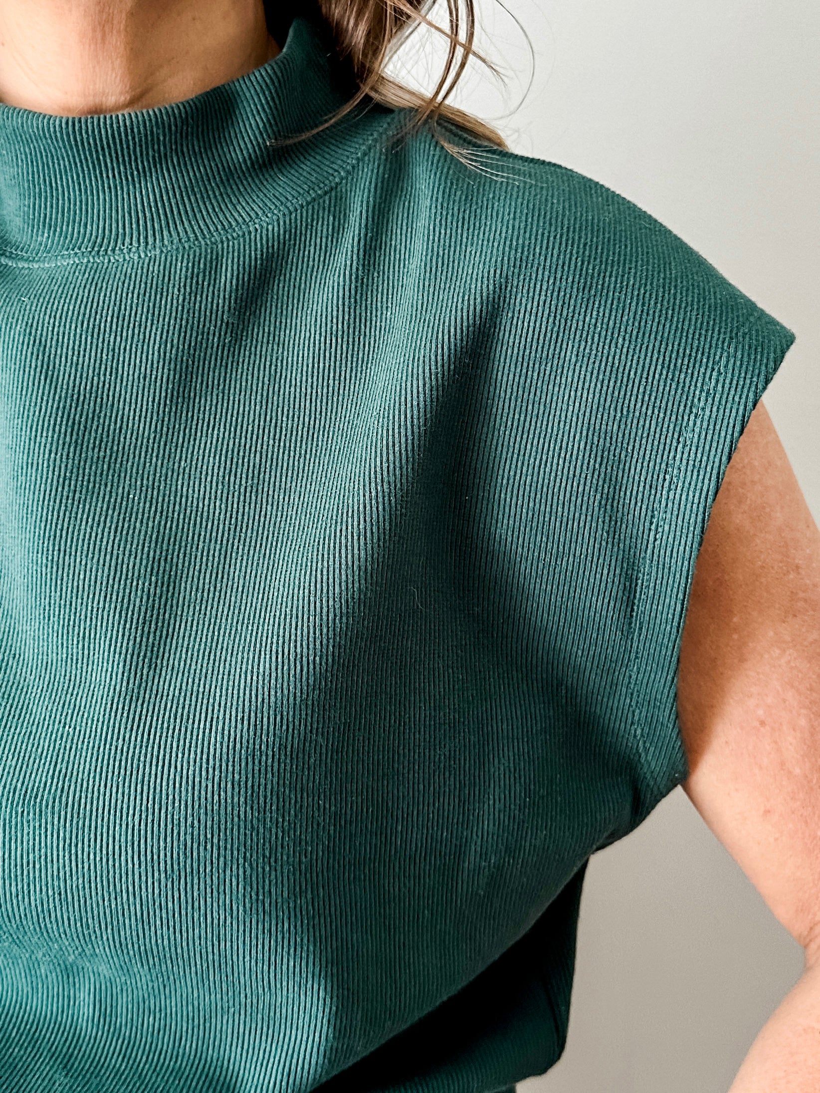 Sophisticated sleeveless mock neck top with strong shoulder detail. Perfect with dress pants or denim, this versatile piece works year-round.
