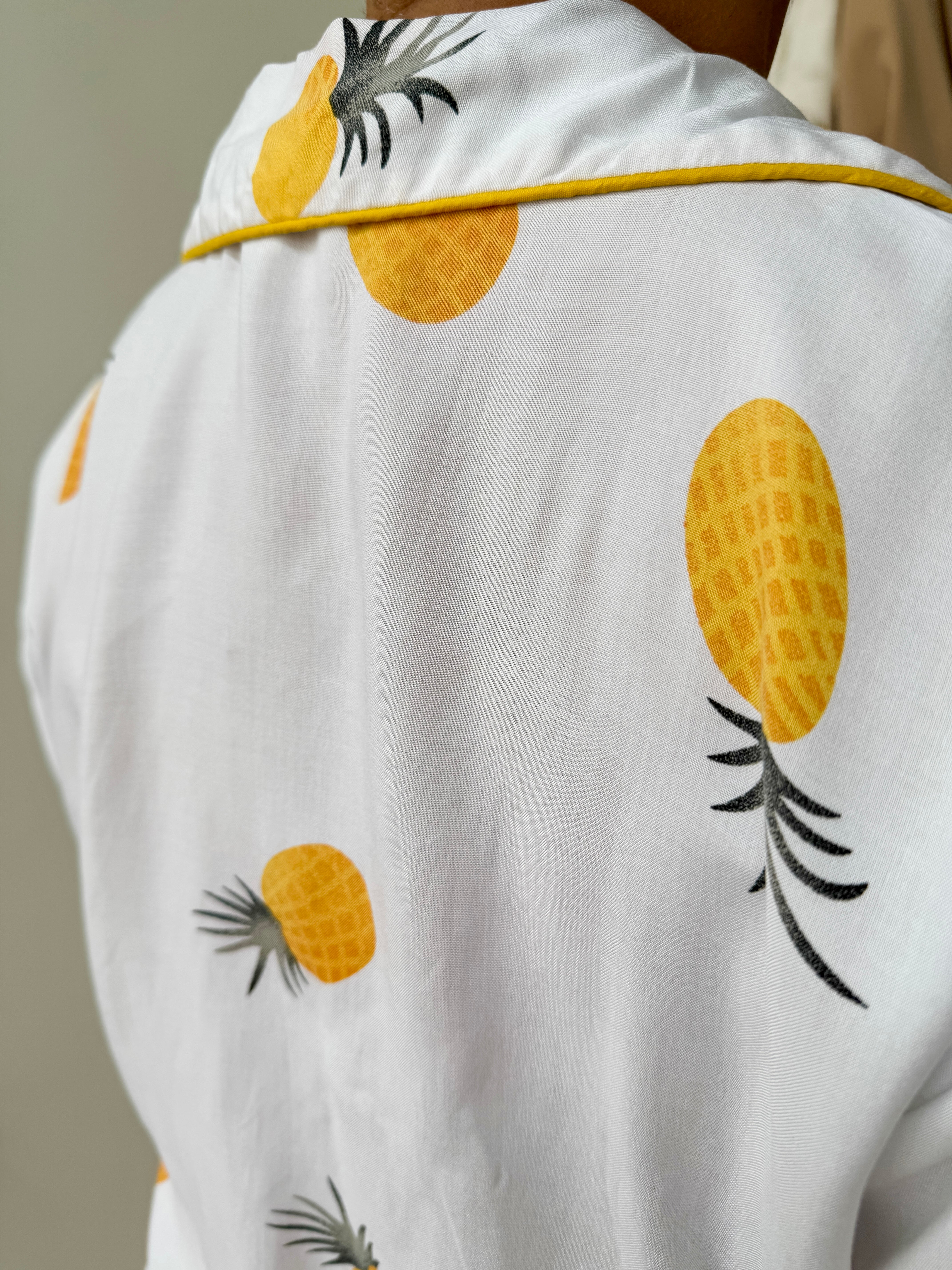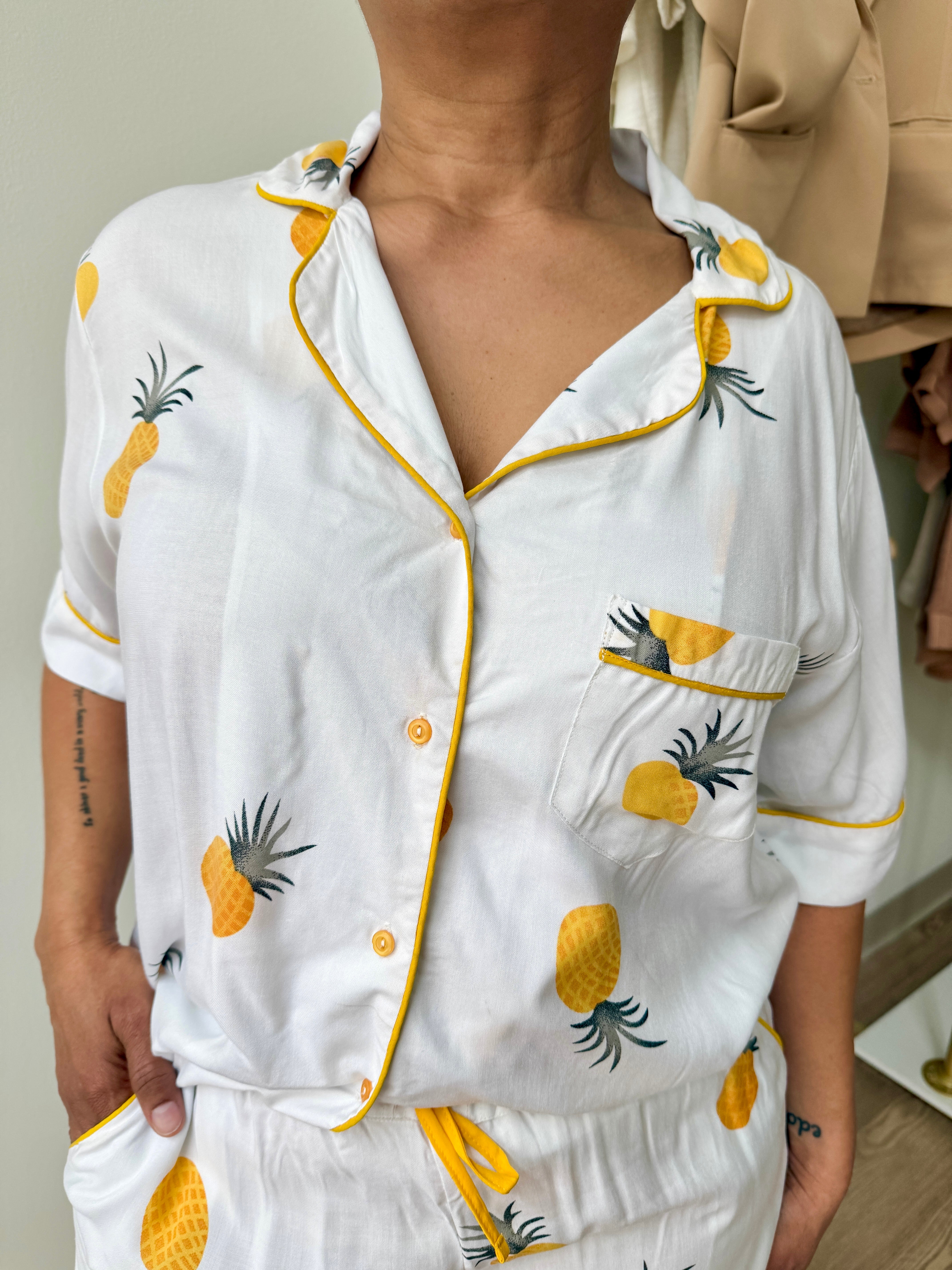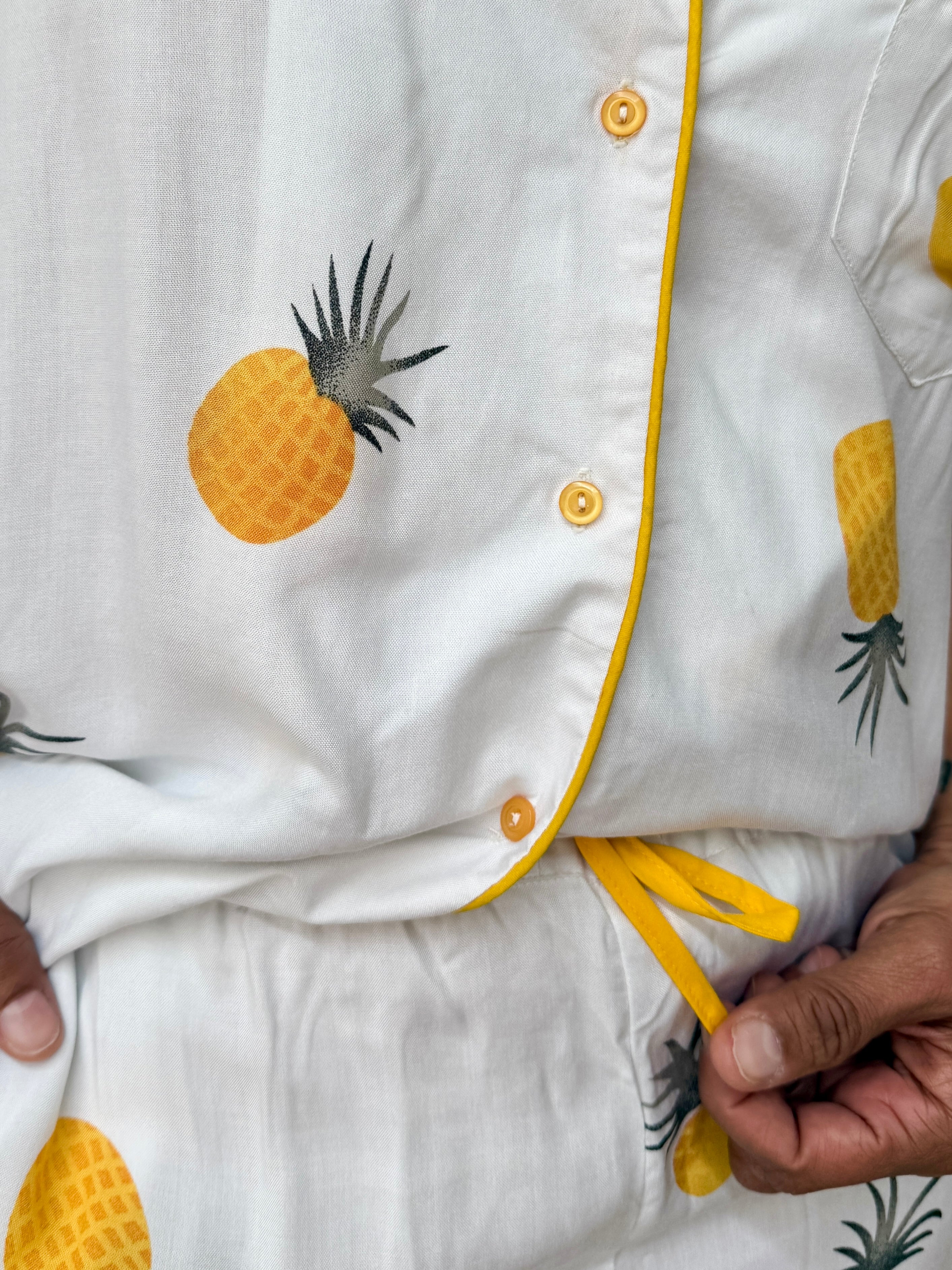 Slip into something effortless. The Pajama Shorts Set is your new favorite way to unwind — crafted from lightweight surplus viscose in a warm Pineapple hue, with hand-made silk piping along the collar, cuffs, pockets, and pant cuffs for a touch of quiet luxury.