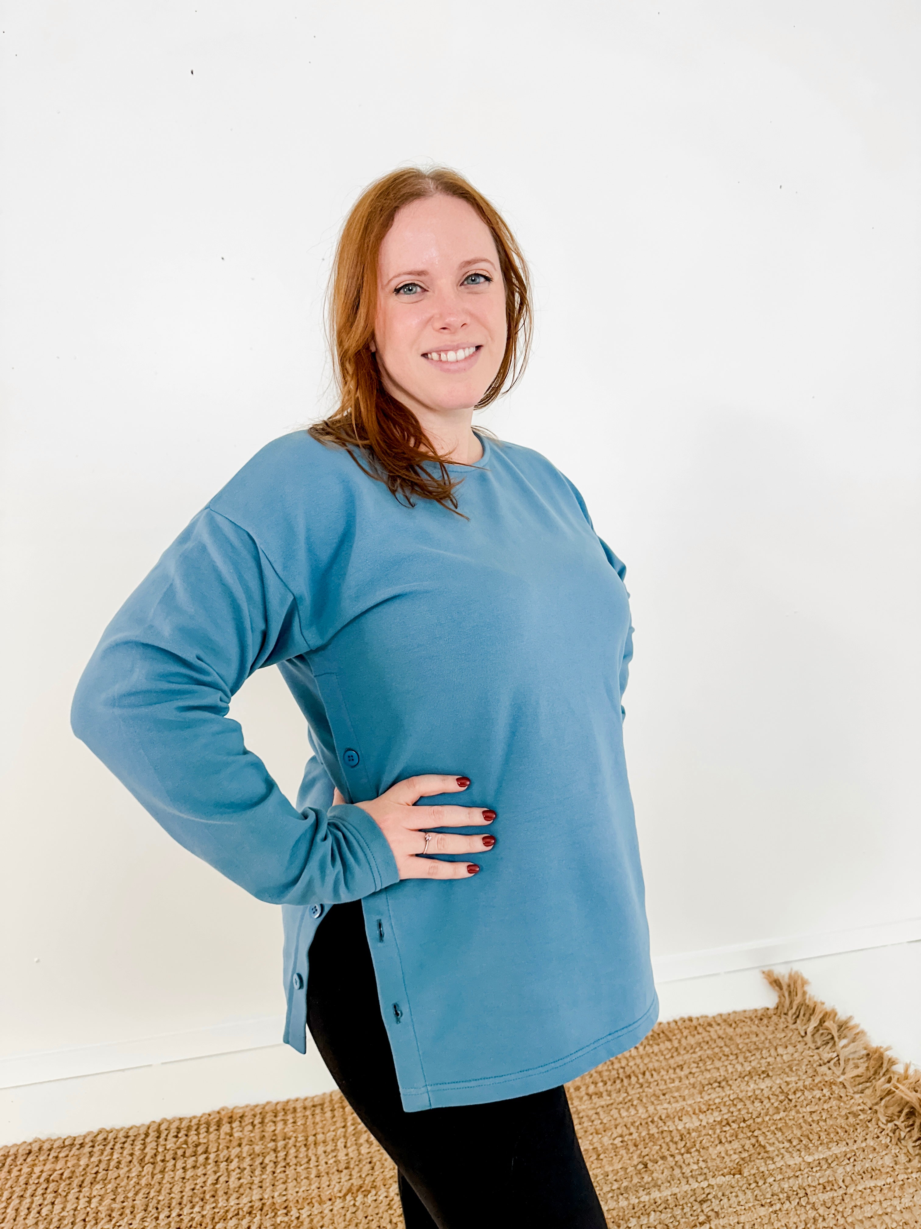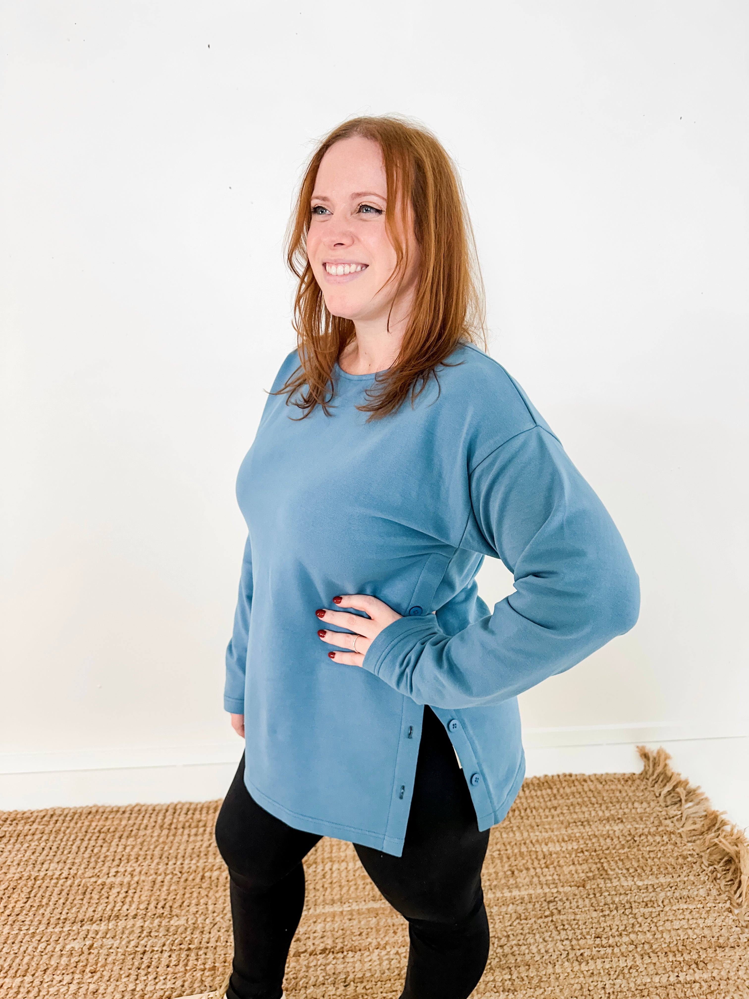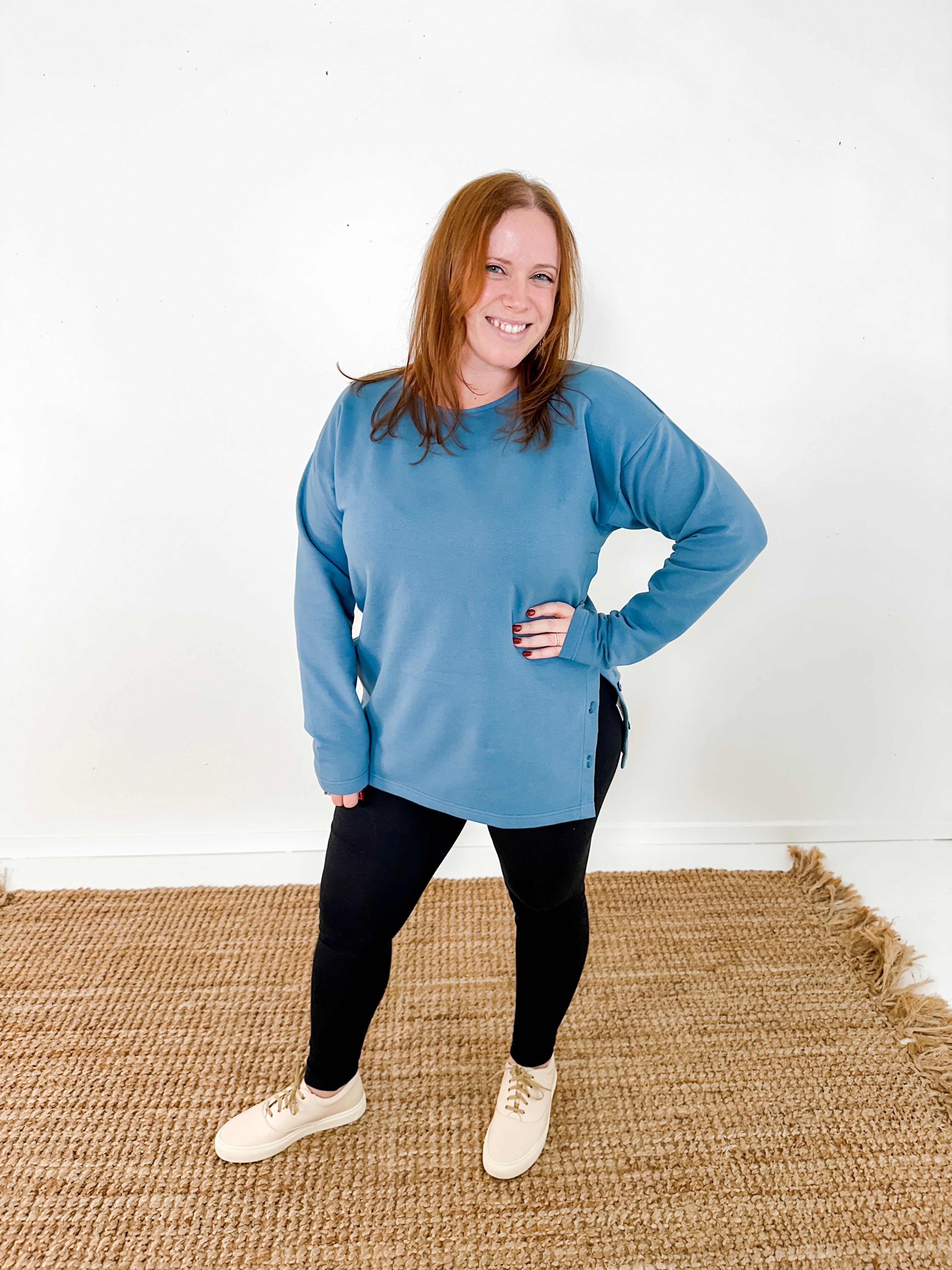 A tunic with a twist - featuring a high-low silhouette with 4 functional buttons on the side seam. Pairs perfectly with our wide stretch crop denim, knit leggings, shorts, or denim skirt.