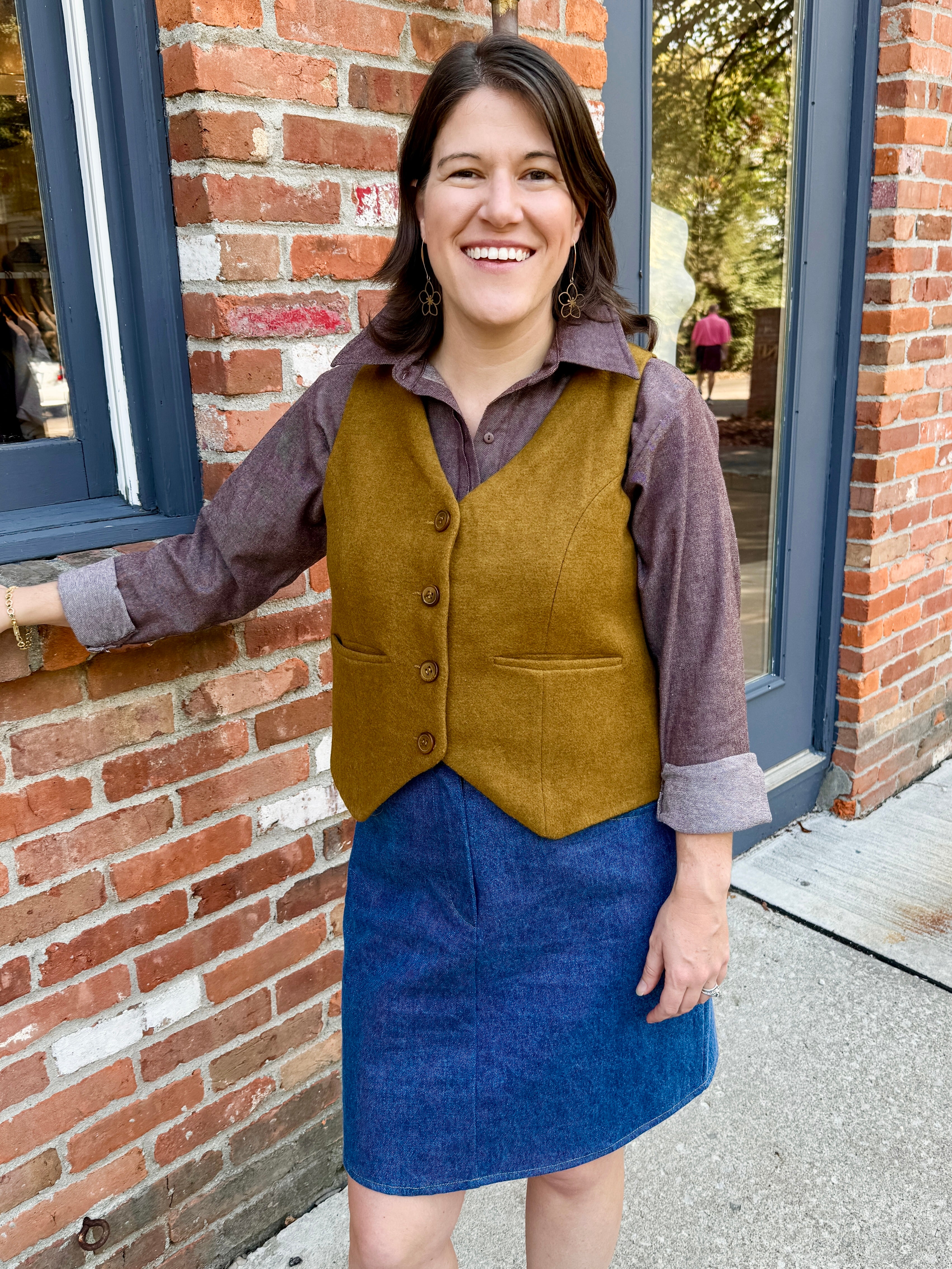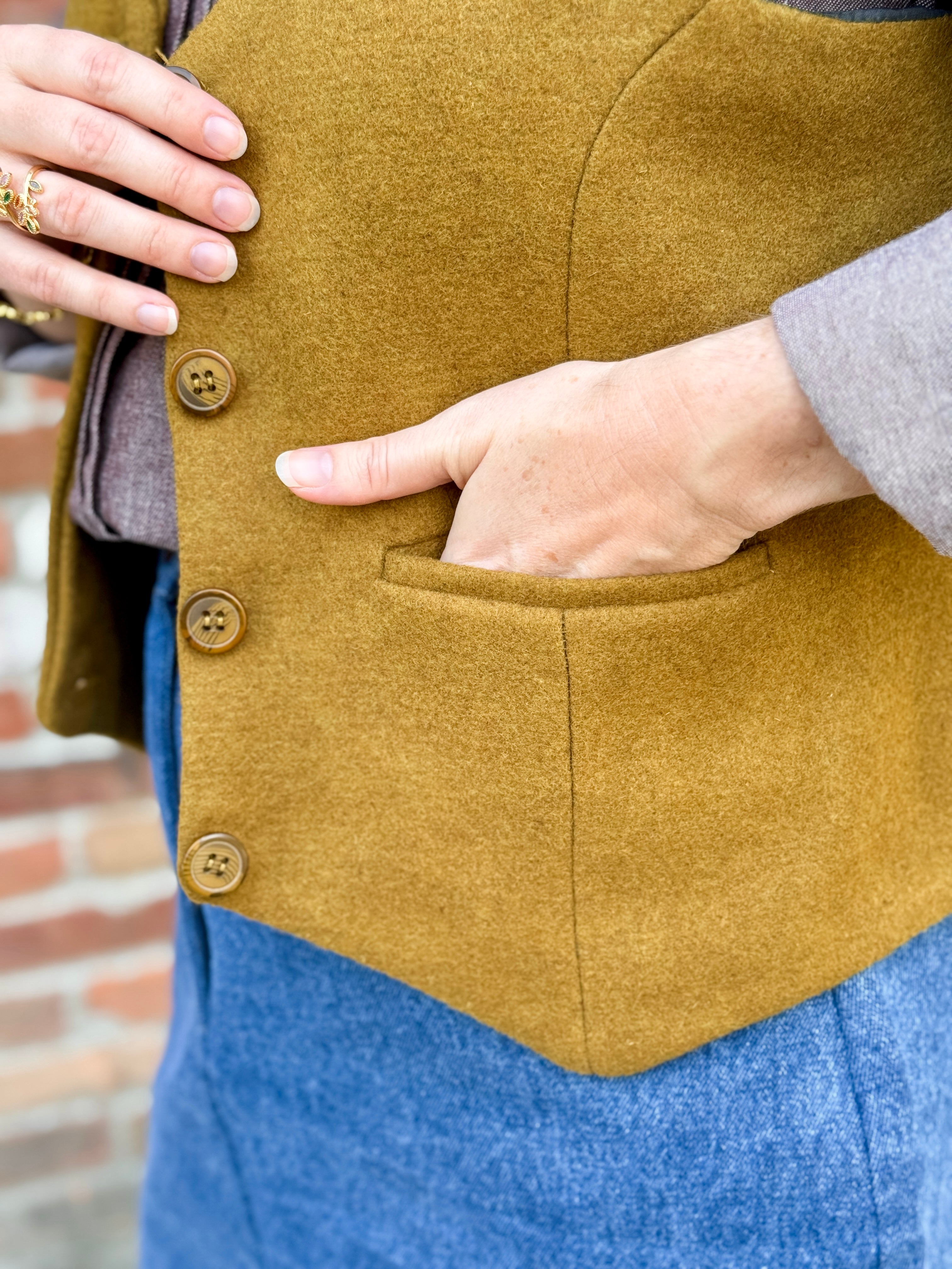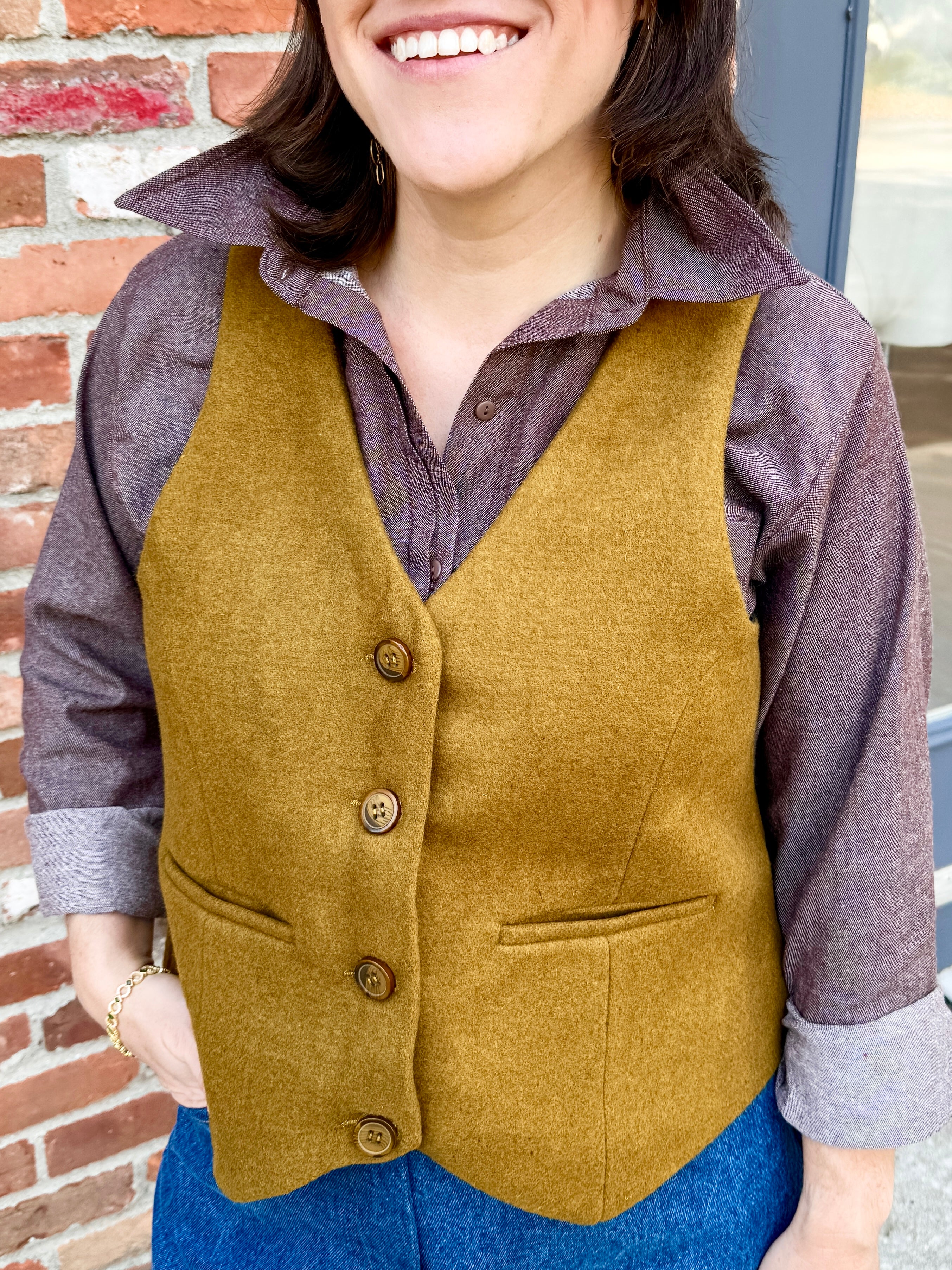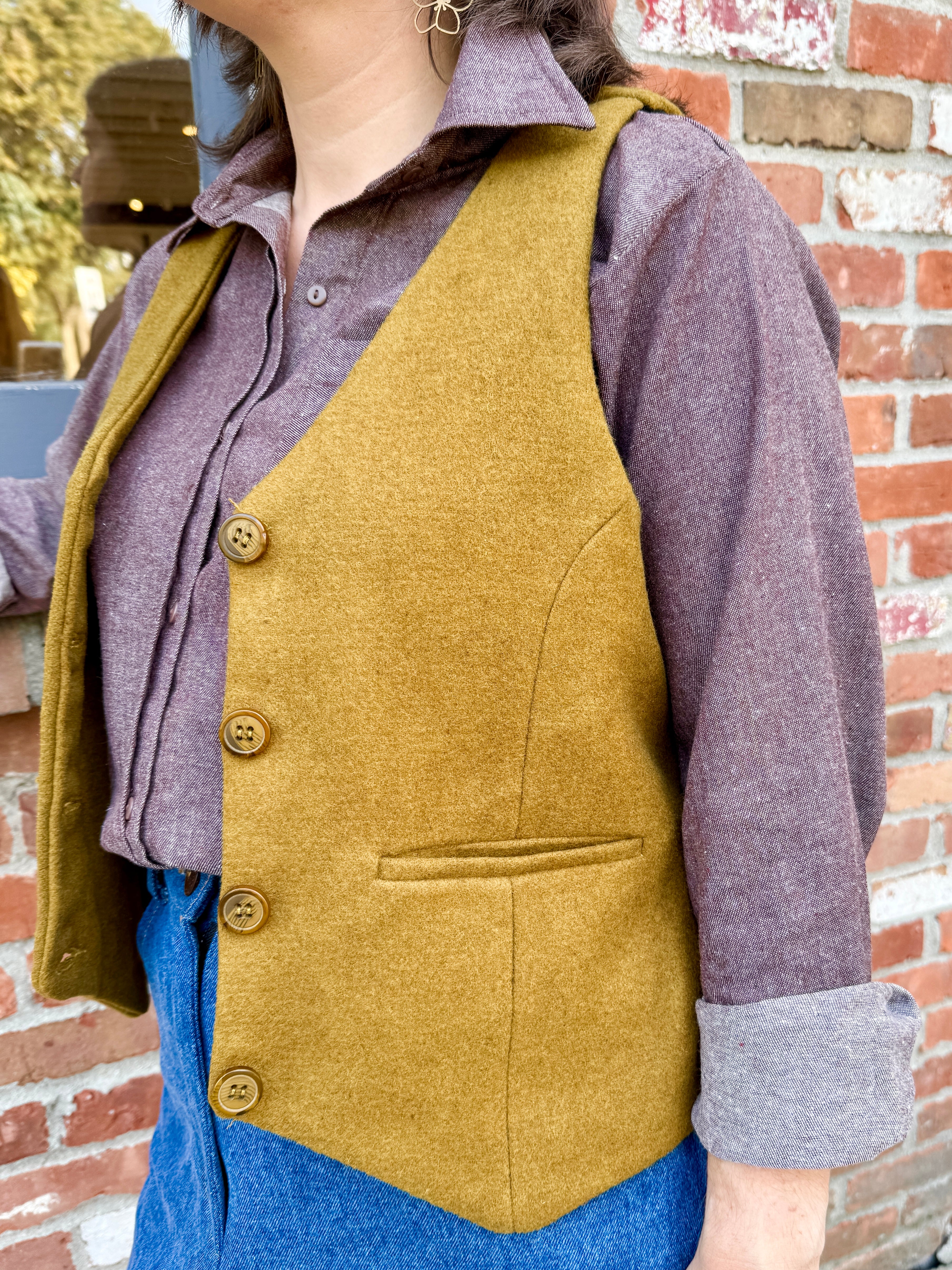 Elevate your fall and winter wardrobe with this sophisticated button-front vest, crafted from premium wool and tweed surplus fabrics. This menswear-inspired piece combines timeless style with sustainable fashion.