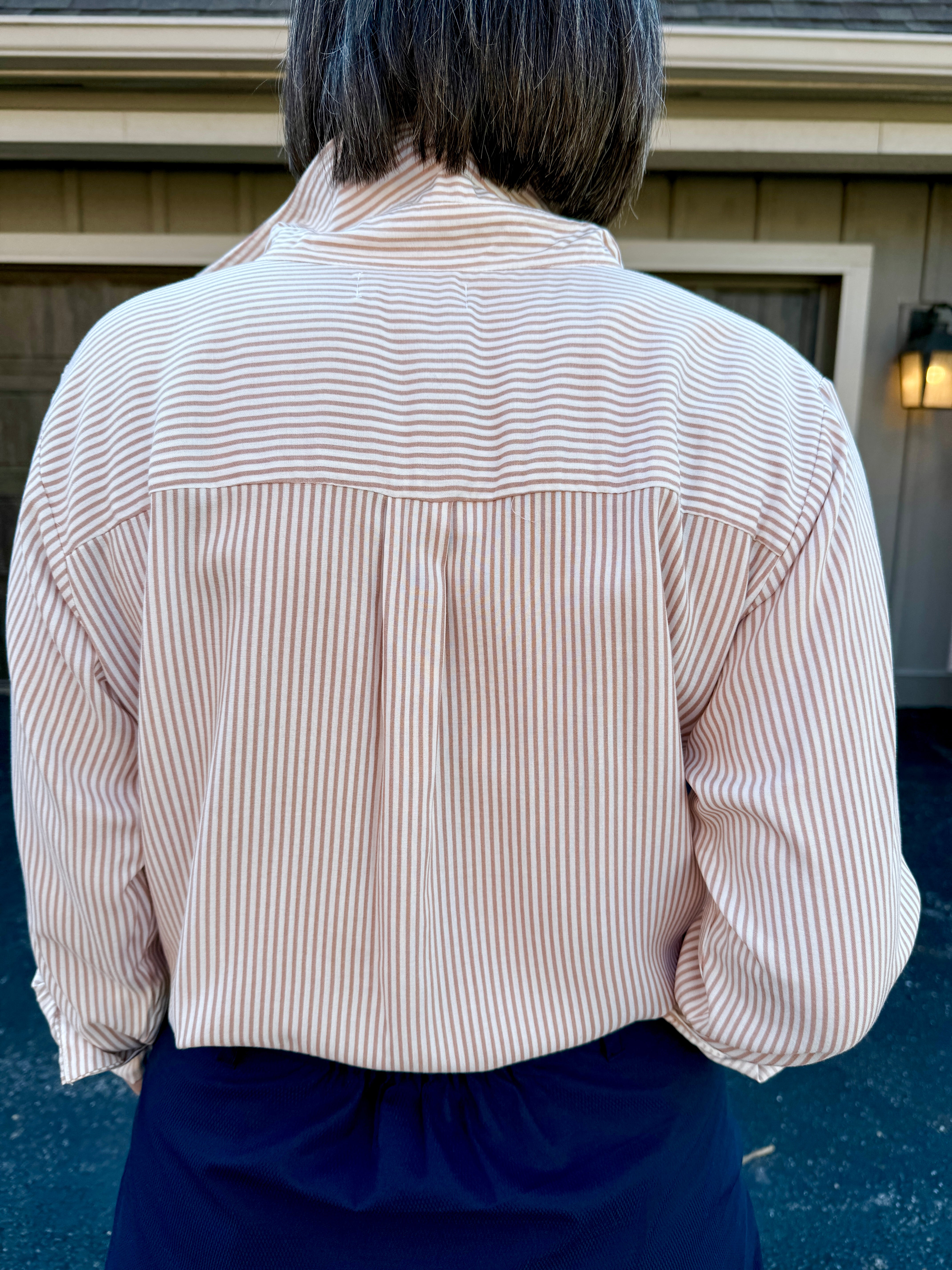 A versatile button-up blouse that's perfect for wearing alone or layering without the bulk. This classic long-sleeve shirt features a timeless stripe pattern and thoughtful details for all-day comfort.