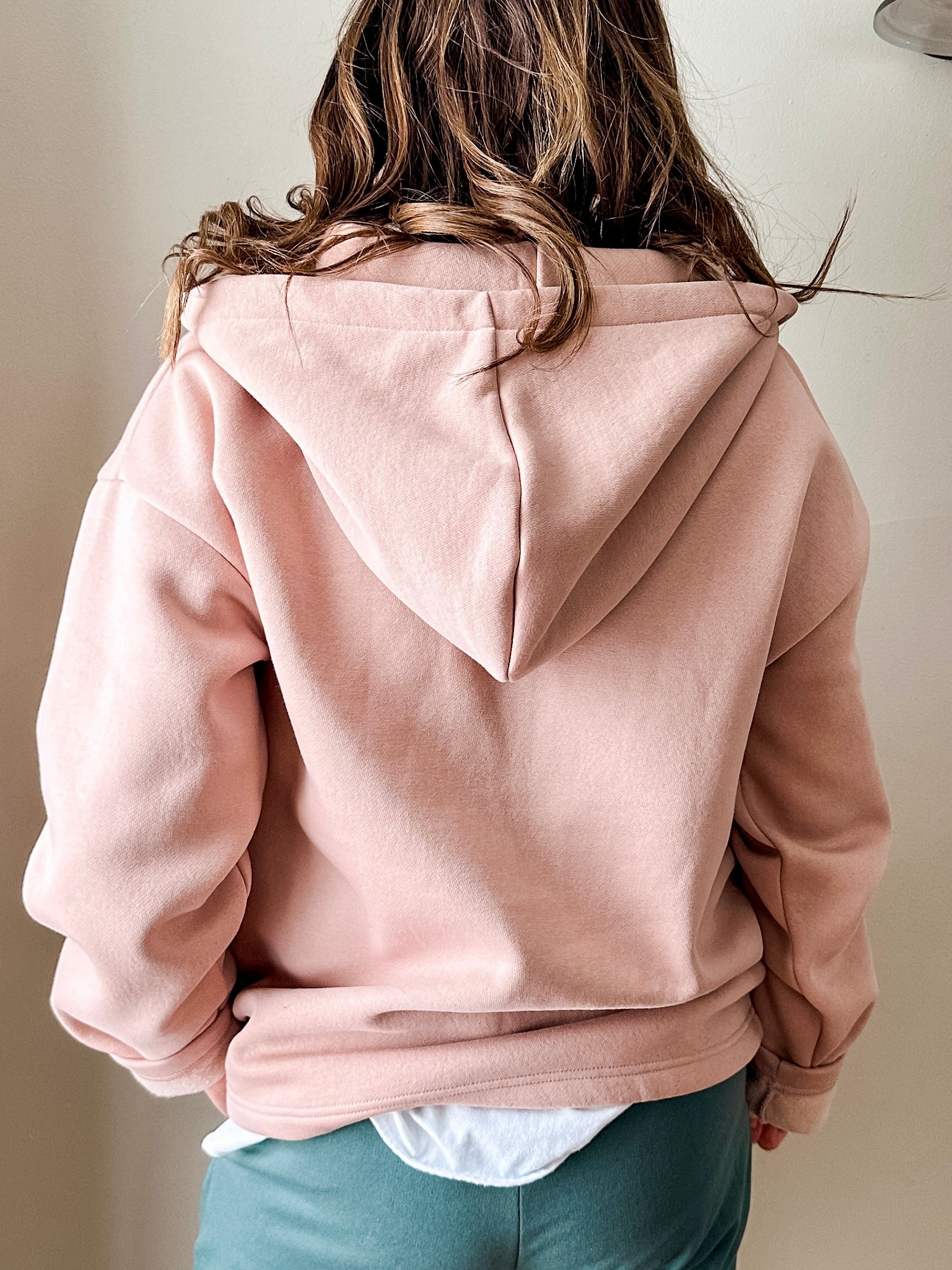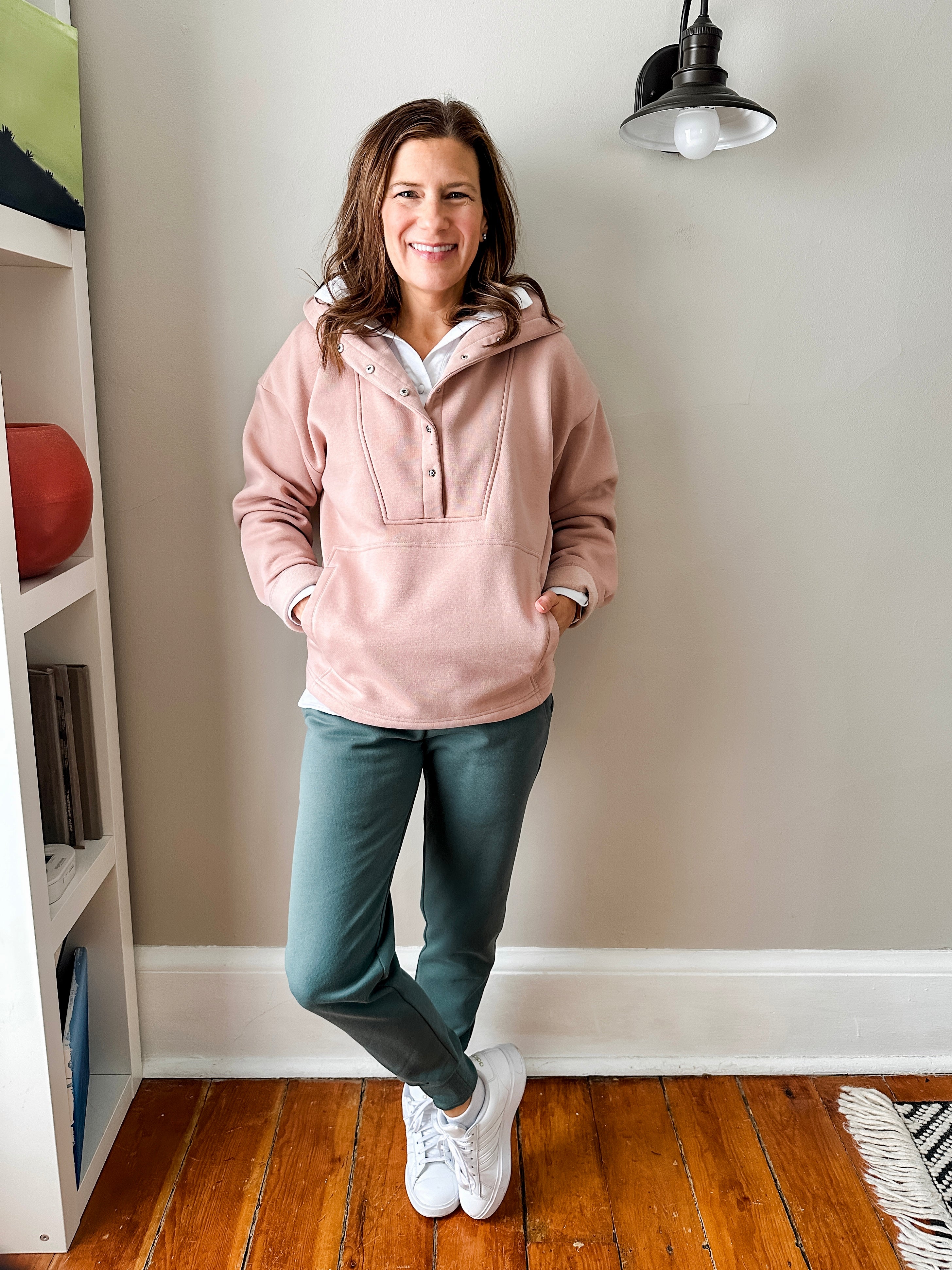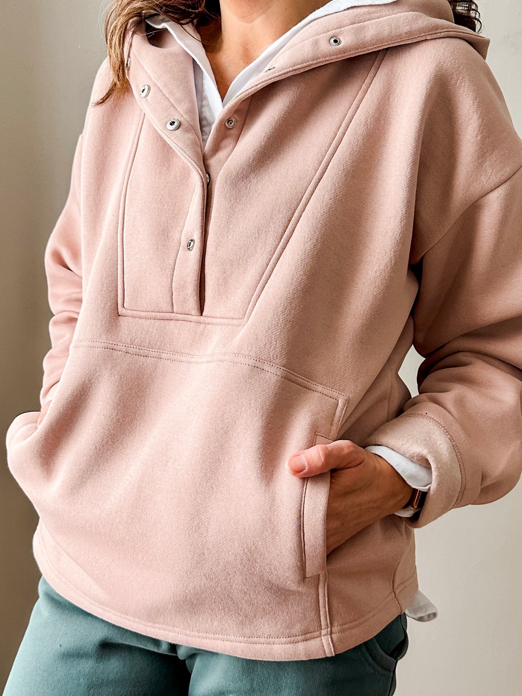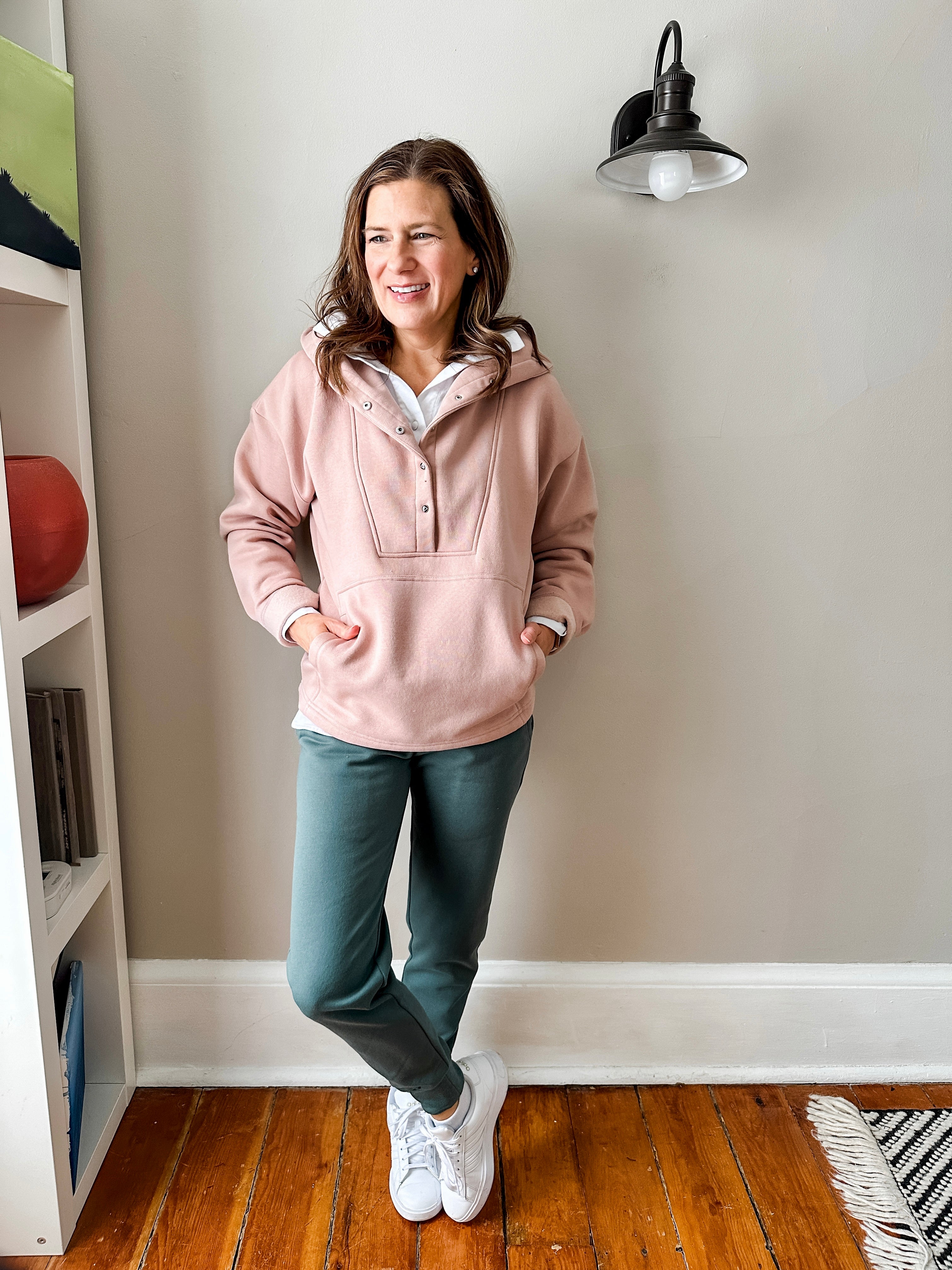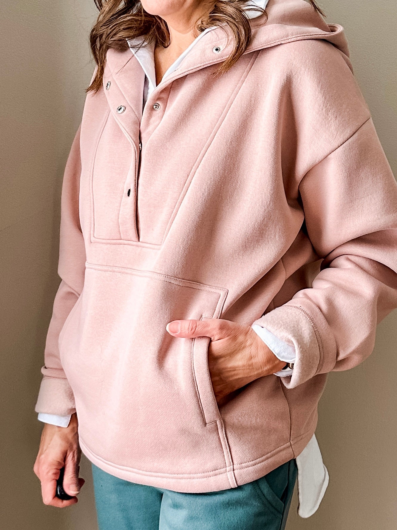 The medium-weight cotton fleece offers the perfect balance of warmth and breathability, while decorative stitching and finished hems add thoughtful details. The straight hem falls at the hip for flattering coverage.