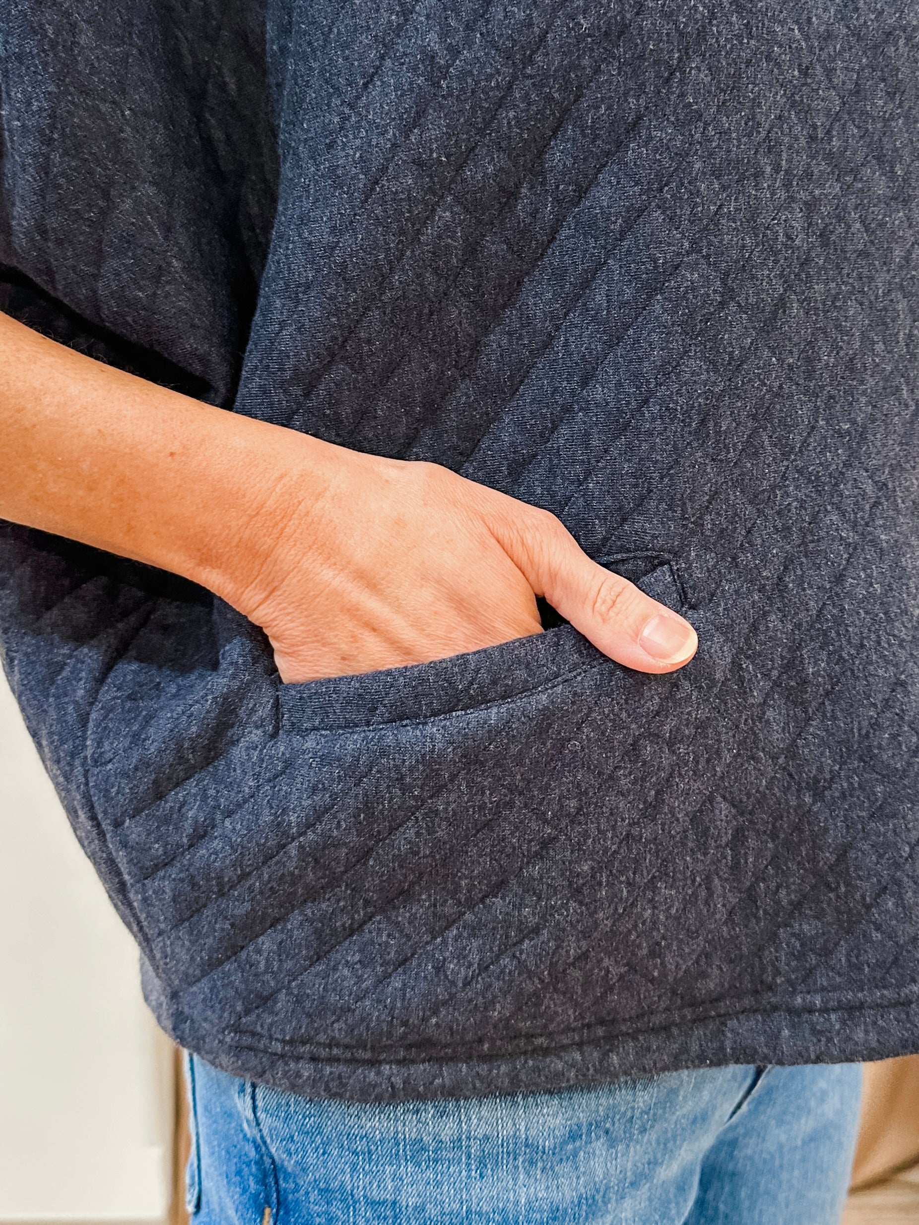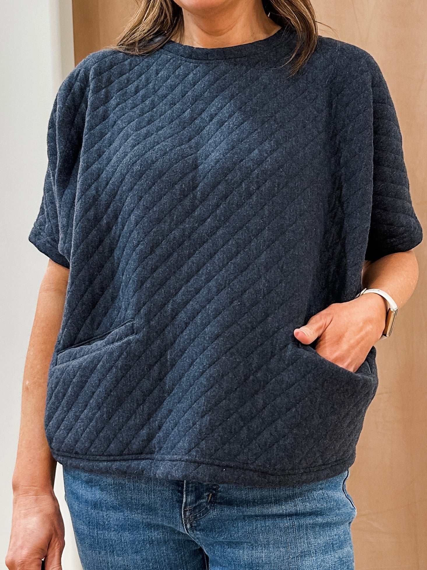 Crafted from lightweight quilted cotton surplus fabric, this loose-fit top features a drop shoulder design, short sleeves, and functional front pockets. Hits slightly below the waist for a flattering silhouette